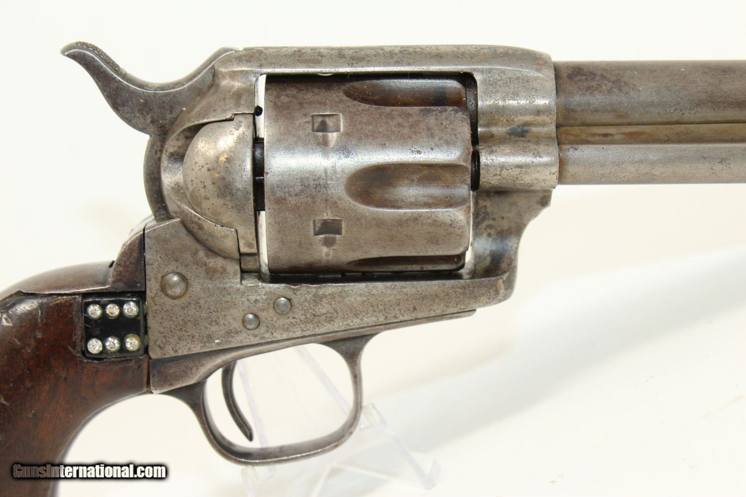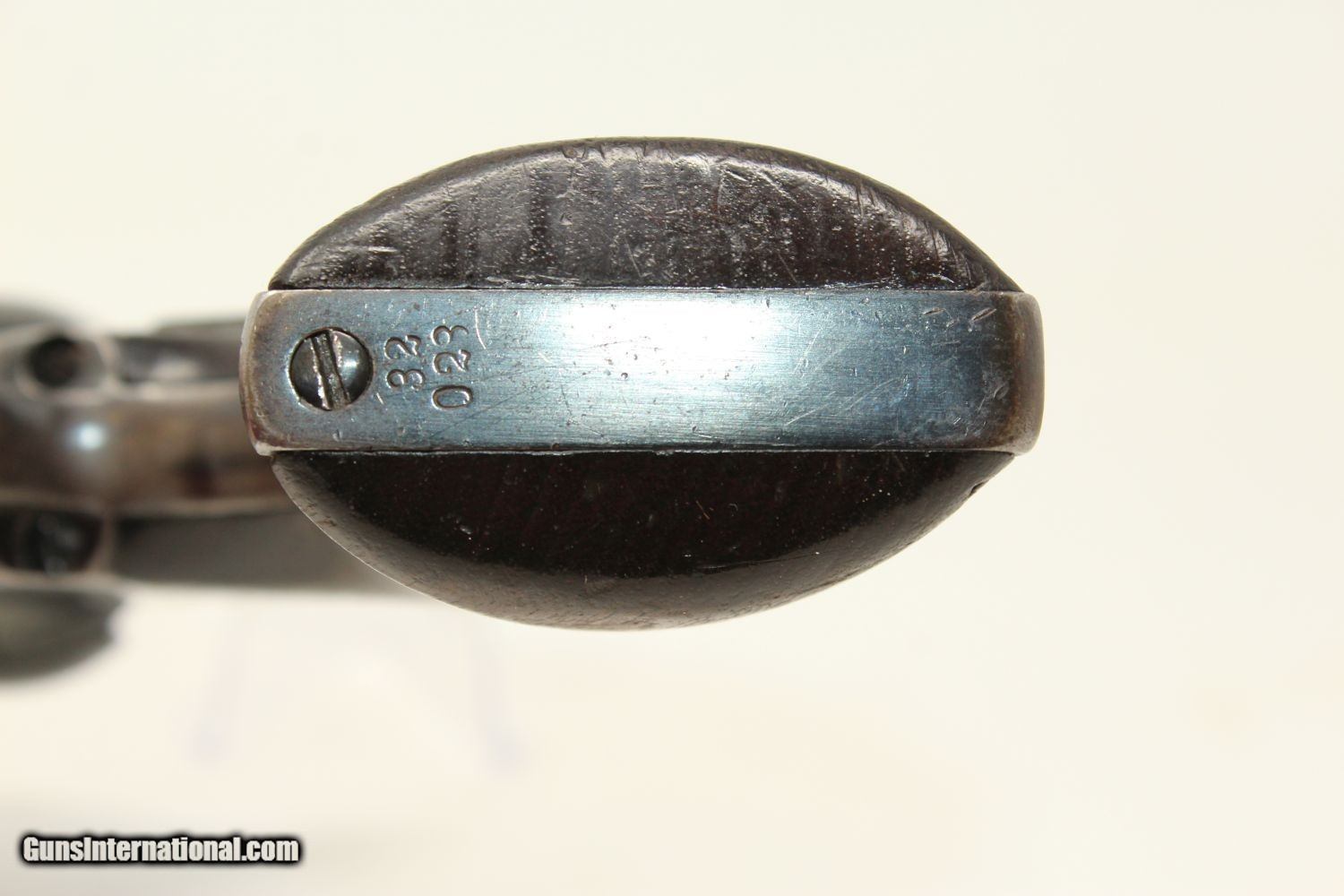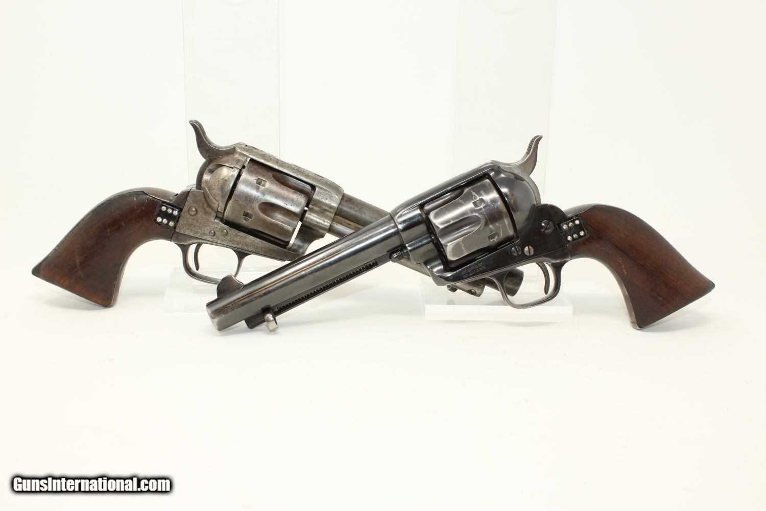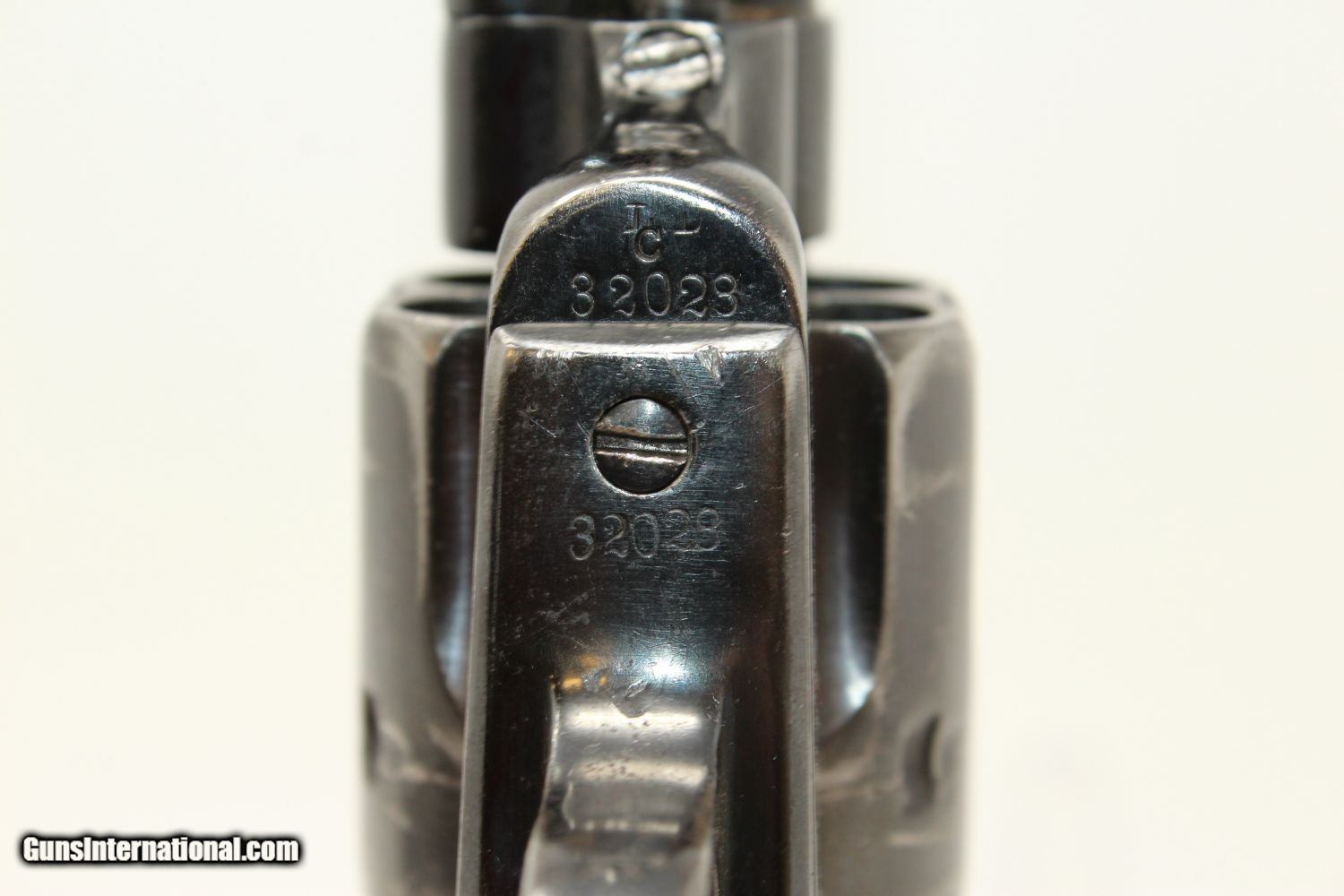 Description: BOXCAR Grip Pair of .45 COLTS in H.H. HEISER Rig! 2 Black Powder Frame Colts in Hand-Tooled Belt & Holsters Here we present a pair of antique, Black Powder Frame Single Action Army Revolvers in .45, made in Hartford, Connecticut, with the full H.H. Heiser tooled Cartridge Belt & Holsters, which were made by Hermann H. Heiser, a German immigrant to Denver, Colorado who was active in his trade under his own name from about 1874 until about 1904. He became famous worldwide for his quality leather holsters and saddlery. These classic revolvers are unique, as sometime over the years a pair of dice have been embedded into the grips, each with the 6 showing to produce what is known as “boxcars” or “midnight” in the game of craps. The holster rig is a rarity in itself and remains in good shape. There is a very old and practical repair on the right side of the belt. The gun belt is full of empty brass. The belt measures 34-3/4 inches from the bottom of the prong to the first hole, and 39 inches to the last. The overall condition of these Black Powder Frame Colts is very good. Both bores are in good condition with nice rifling. The bore of #32023 is shiny and bright. #1133’s grip is quite worn and weathered and shows a repair on the left. Strong action in all positions with the ejector rod staying smooth. Both guns in combination with the cartridge belt, this is a very neat piece of history to display or wear! This is a legitimate antique and not a reproduction. Caliber: .45 Colt Overall condition as seen in photos. Very Fast. Very Safe. FREE SHIPPING WORLDWIDE. Delivered directly to your door by express mail! Guaranteed AUTHENTIC & Includes CERTIFICATE OF AUTHENTICITY. ancestryguns $12,000 #190259 SOLD Antique: Yes |