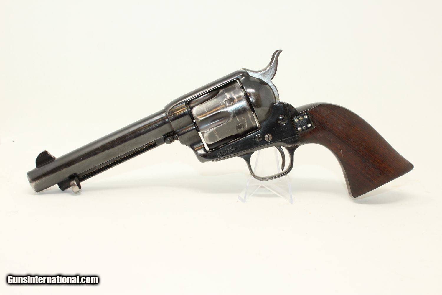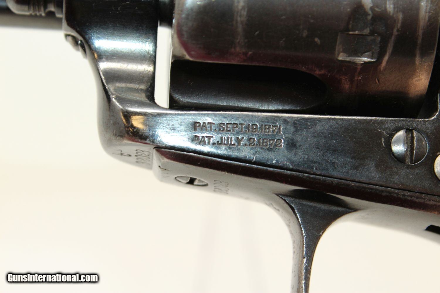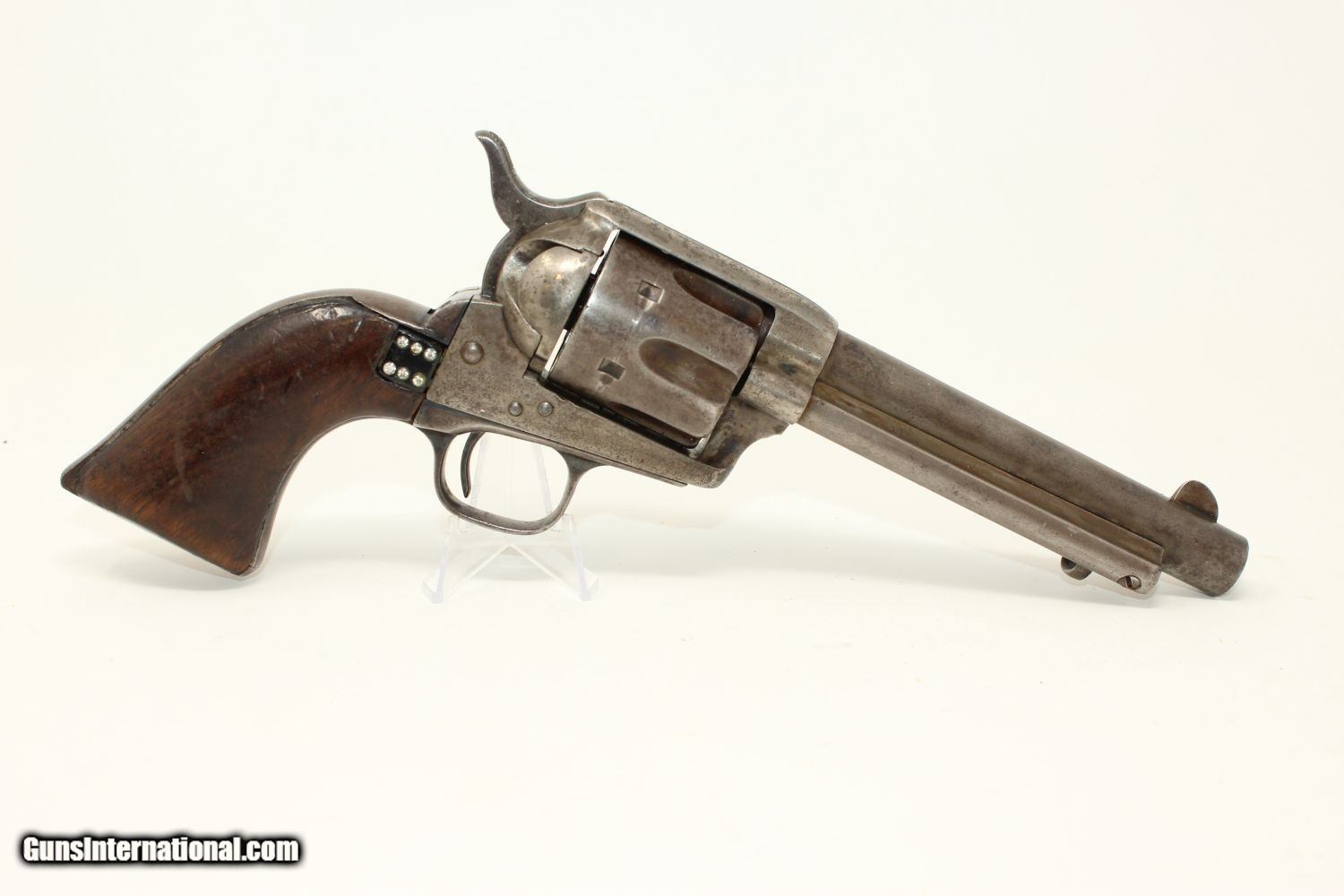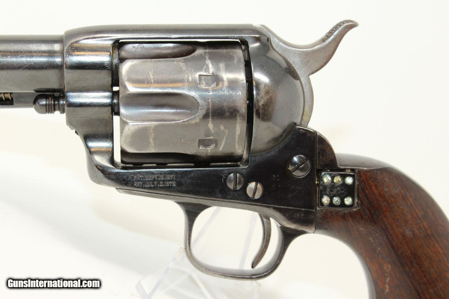 Description: BOXCAR Grip Pair of .45 COLTS in H.H. HEISER Rig! 2 Black Powder Frame Colts in Hand-Tooled Belt & Holsters Here we present a pair of antique, Black Powder Frame Single Action Army Revolvers in .45, made in Hartford, Connecticut, with the full H.H. Heiser tooled Cartridge Belt & Holsters, which were made by Hermann H. Heiser, a German immigrant to Denver, Colorado who was active in his trade under his own name from about 1874 until about 1904. He became famous worldwide for his quality leather holsters and saddlery. These classic revolvers are unique, as sometime over the years a pair of dice have been embedded into the grips, each with the 6 showing to produce what is known as “boxcars” or “midnight” in the game of craps. The holster rig is a rarity in itself and remains in good shape. There is a very old and practical repair on the right side of the belt. The gun belt is full of empty brass. The belt measures 34-3/4 inches from the bottom of the prong to the first hole, and 39 inches to the last. The overall condition of these Black Powder Frame Colts is very good. Both bores are in good condition with nice rifling. The bore of #32023 is shiny and bright. #1133’s grip is quite worn and weathered and shows a repair on the left. Strong action in all positions with the ejector rod staying smooth. Both guns in combination with the cartridge belt, this is a very neat piece of history to display or wear! This is a legitimate antique and not a reproduction. Caliber: .45 Colt Overall condition as seen in photos. Very Fast. Very Safe. FREE SHIPPING WORLDWIDE. Delivered directly to your door by express mail! Guaranteed AUTHENTIC & Includes CERTIFICATE OF AUTHENTICITY. ancestryguns $12,000 #190259 SOLD Antique: Yes |