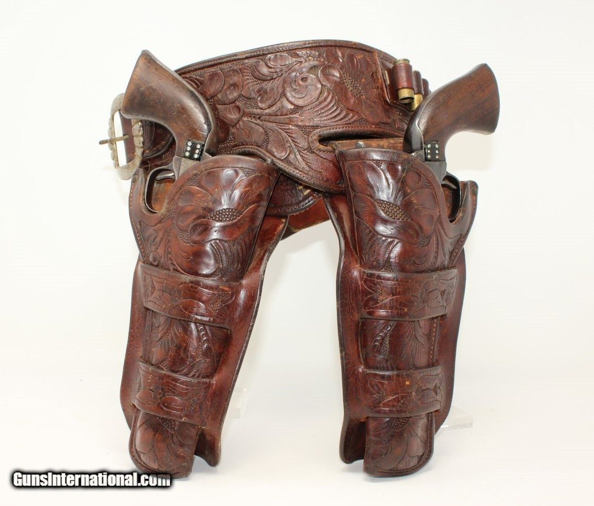 BOXCAR Grip Pair of .45 COLTS in H.H. HEISER Rig! 2 Black Powder Frame Colts in Hand-Tooled Belt & Holsters