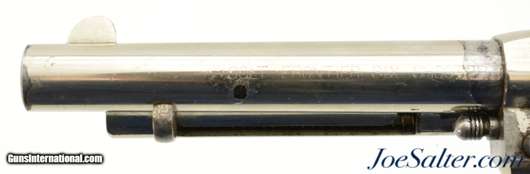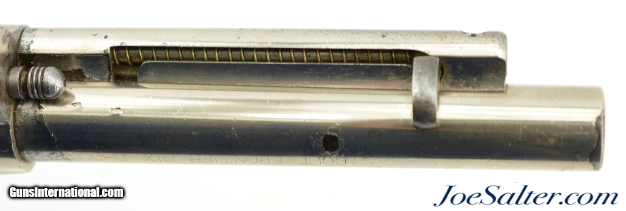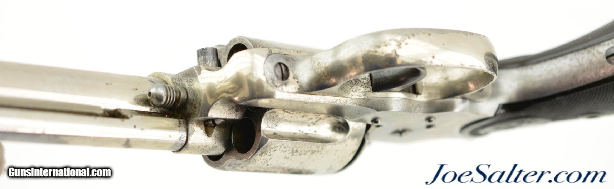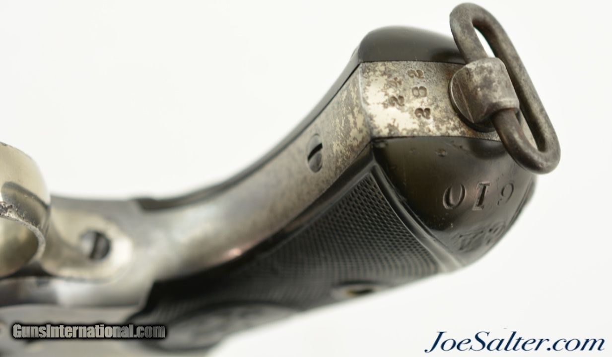 Description: Serial #24282, .44 WCF (.44-40), 5 1/2" barrel with a fine, bright bore that has some mild freckling and pinprick pitting just at the muzzle. This is an 1889-made revolver that has retained about 30-40% of the original nickel plate, with the balance flaked to a freckled pewter gray and plum-brown patina. Most of the nickel remains on the barrel, cylinder, and trigger guard, while the trigger and hammer retain a large amount of their original bright fire blue. The checkered hard rubber grips are numbered to the gun on the interior, and have mild wear and flattening of the points on either panel. Additionally, the butt of the right panel has an added rack or inventory stamp that reads, "CA / 610." This could be a unit marking, or a later private registration marking of some type. The mechanical lock-up is still tight, and the action functions flawlessly in both single and double-action. This is a handsome British-proofed ‘78 Frontier Six-Shooter, and is in very good-near fine condition overall. Antique SOLD Antique: Yes |