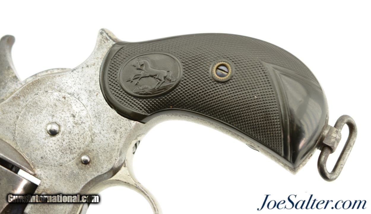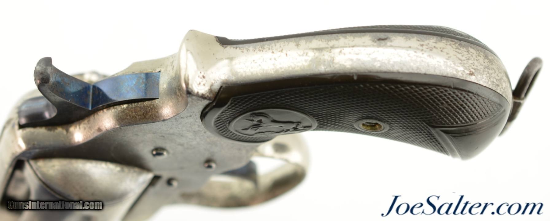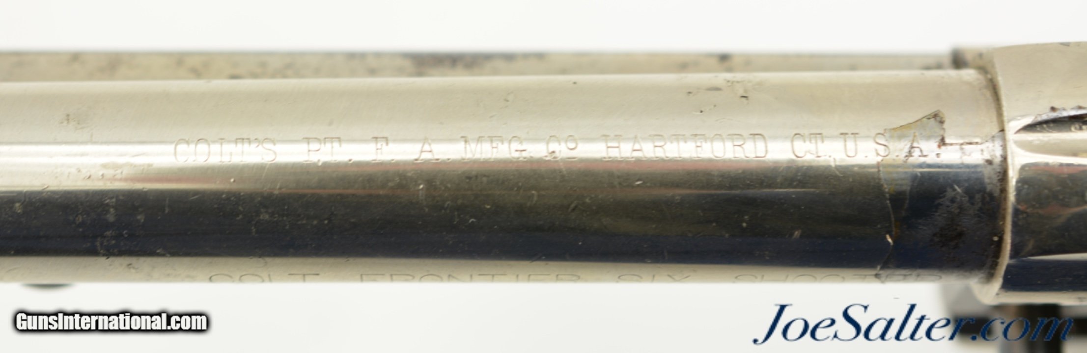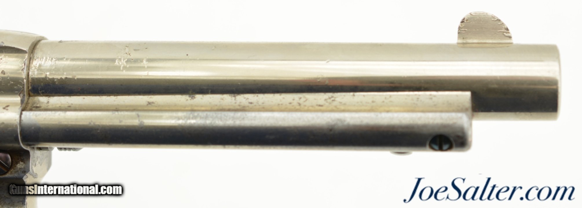 Description: Serial #24282, .44 WCF (.44-40), 5 1/2" barrel with a fine, bright bore that has some mild freckling and pinprick pitting just at the muzzle. This is an 1889-made revolver that has retained about 30-40% of the original nickel plate, with the balance flaked to a freckled pewter gray and plum-brown patina. Most of the nickel remains on the barrel, cylinder, and trigger guard, while the trigger and hammer retain a large amount of their original bright fire blue. The checkered hard rubber grips are numbered to the gun on the interior, and have mild wear and flattening of the points on either panel. Additionally, the butt of the right panel has an added rack or inventory stamp that reads, "CA / 610." This could be a unit marking, or a later private registration marking of some type. The mechanical lock-up is still tight, and the action functions flawlessly in both single and double-action. This is a handsome British-proofed ‘78 Frontier Six-Shooter, and is in very good-near fine condition overall. Antique SOLD Antique: Yes |