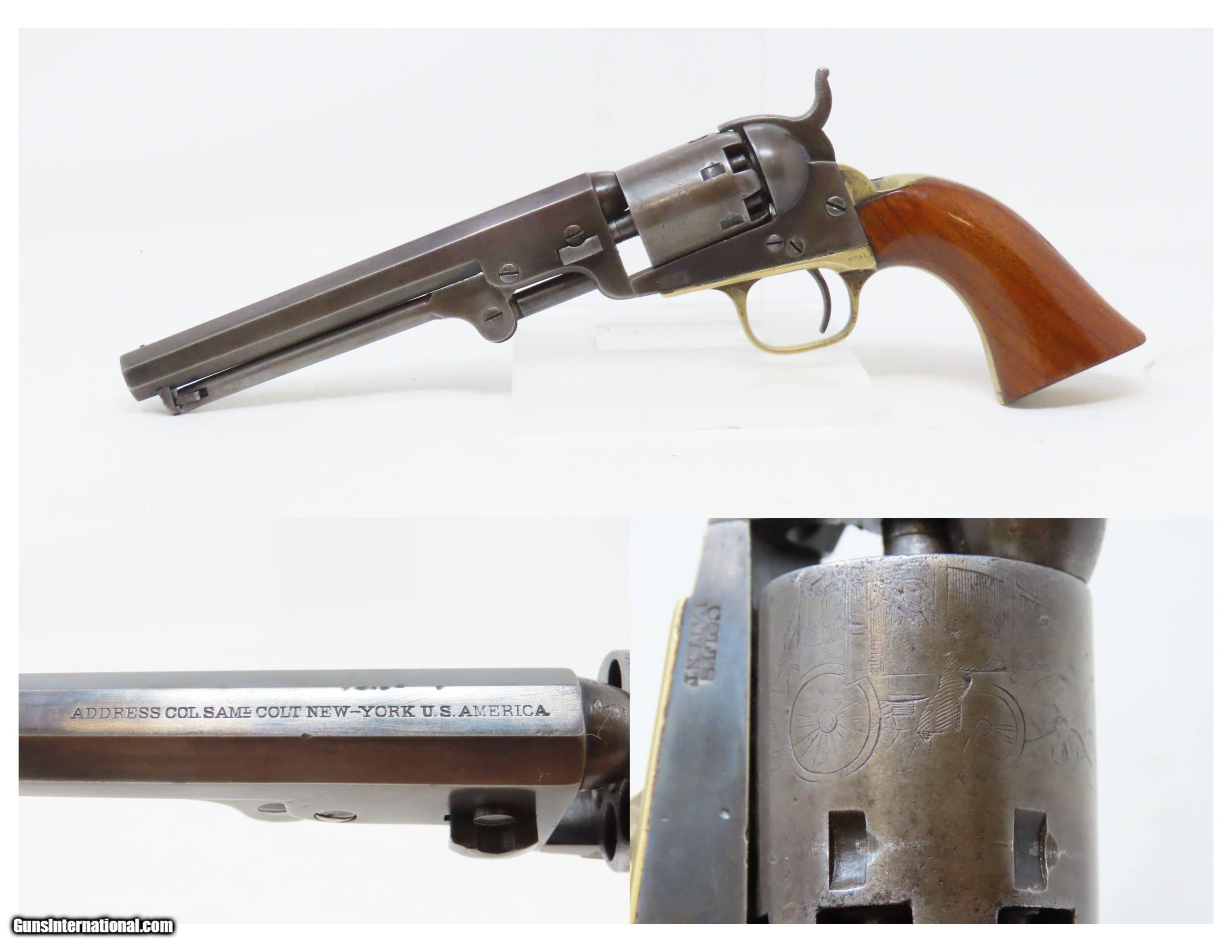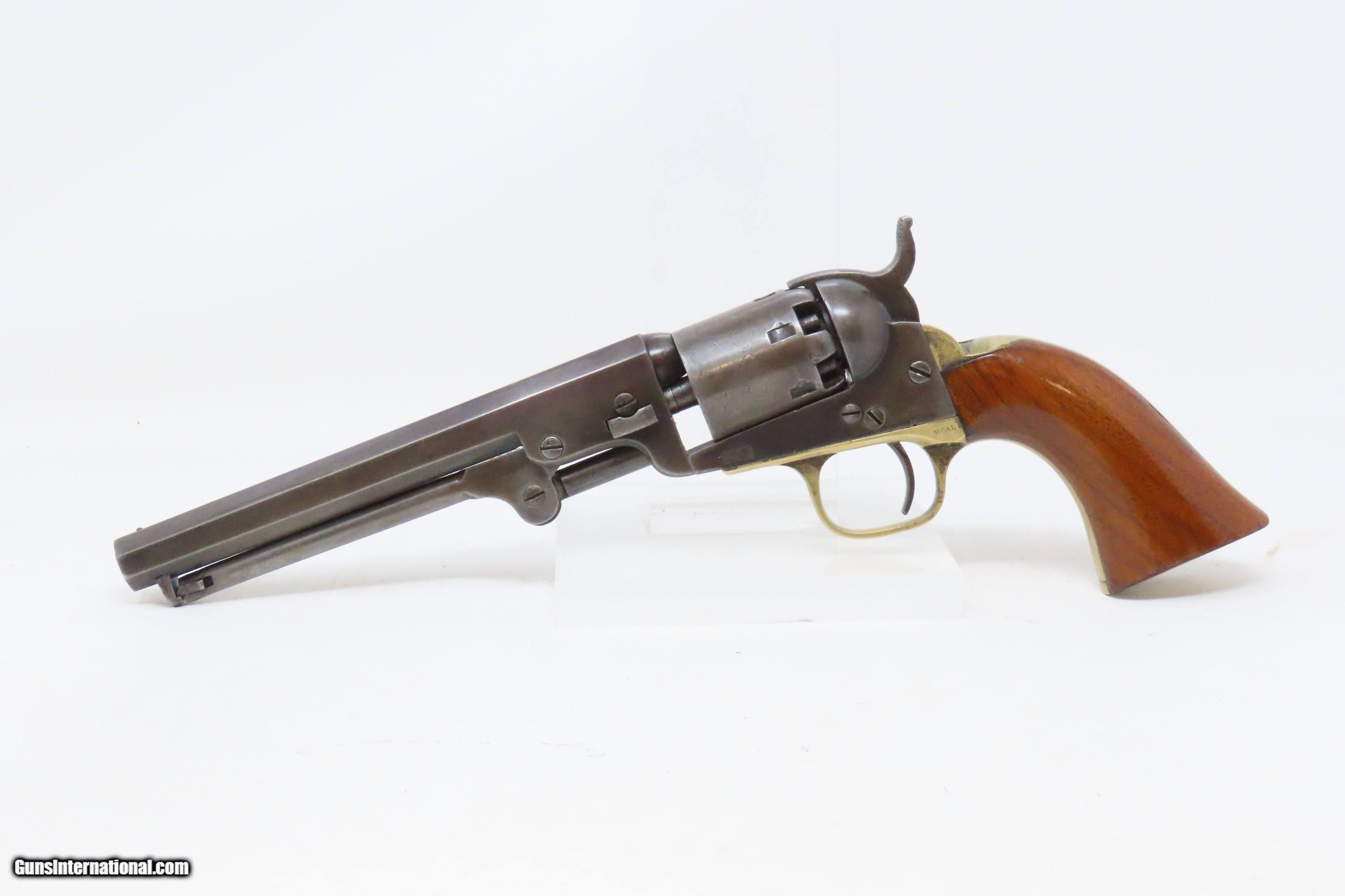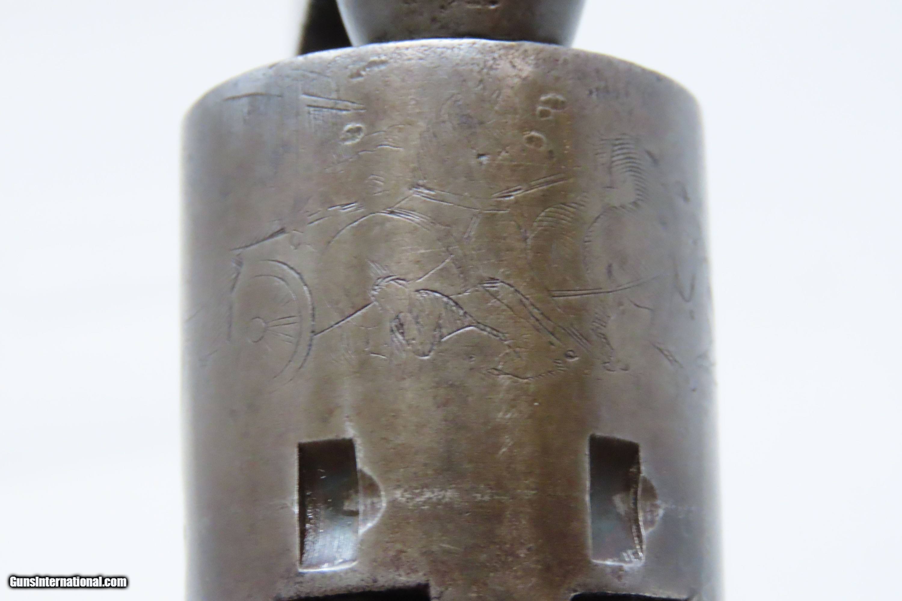 Description: c1864 COLT POCKET Revolver M1849.31 Percussion CIVIL WAR FRONTIER Antique WILD WEST SIX-SHOOTER Made In 1864 Here we present an antique percussion Colt Model 1849 Pocket Revolver, made during the American Civil War in 1864 in Hartford, Connecticut. The Model 1849 Pocket, the replacement for the Baby Dragoon, was the most widely produced of any Colt percussion pistol. Nearly 340,000 were manufactured during its 23-year production run that ended in 1873. Over 280,000 of these were produced by Colt’s factory at Hartford by the end of the Civil War in 1865. These were very popular and saw a lot of use on the battlefield, on the home front and in the West. These were some of the smallest, handiest pocket revolvers of the time. One of the most aesthetically pleasing aspects of this pistol is its cylinder scene. Cylinder scenes during this period were common, especially for Colt, not only for their visual appeal, but because it made a revolver more difficult to forge. The scene on the 1849 Pocket is that of a stagecoach robbery. The focal point is the stagecoach drawn by four horses. A woman in a dress is seen framed in the doorway of the side of the coach. The driver is standing alongside wielding his pistol against multiple assailants as the horses rear and struggle against their harnesses. Several of the bandits lay dying on the ground, one tries to control the horses, two are running away and one is in the process of falling dead after being shot. Not a bad way to show interested buyers what a pistol like this would be good for. It did a fine job as a self-defense handgun for the average citizen in 19th Century America. Though not a primary military arm during the American Civil War, these handguns were commonly privately purchased by soldiers for use on the battlefield. Whether legend or fact, it is interesting to note something commonly read about pocket revolvers of the day, that while they could be used for self-defense against the enemy, many soldiers kept them on their person to defend themselves against an unwanted amputation in the primitive field hospitals that were notorious, even in their day. The overall condition is good. The stagecoach robbery cylinder scene is still visible. Gray patina throughout. The action is excellent. The bore is patinated with strong rifling. Numbers match on the barrel, frame, trigger guard, grip frame, cylinder, wedge and arbor. Own the original! This is a legitimate antique and not a reproduction. Barrel is 6 inches. Caliber: .31 Percussion Overall condition as seen in photos. Very Fast. Very Safe. FREE SHIPPING WORLDWIDE. Delivered directly to your door by express mail! Guaranteed AUTHENTIC & Includes CERTIFICATE OF AUTHENTICITY. ancestryguns $2200 #233136 SOLD Antique: Yes |