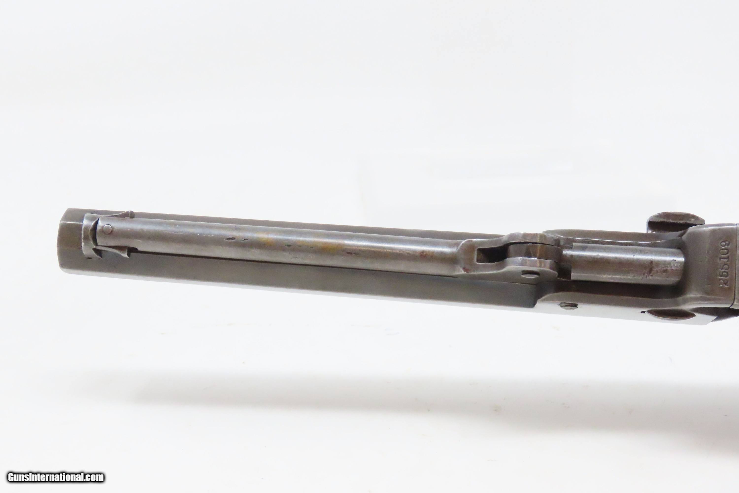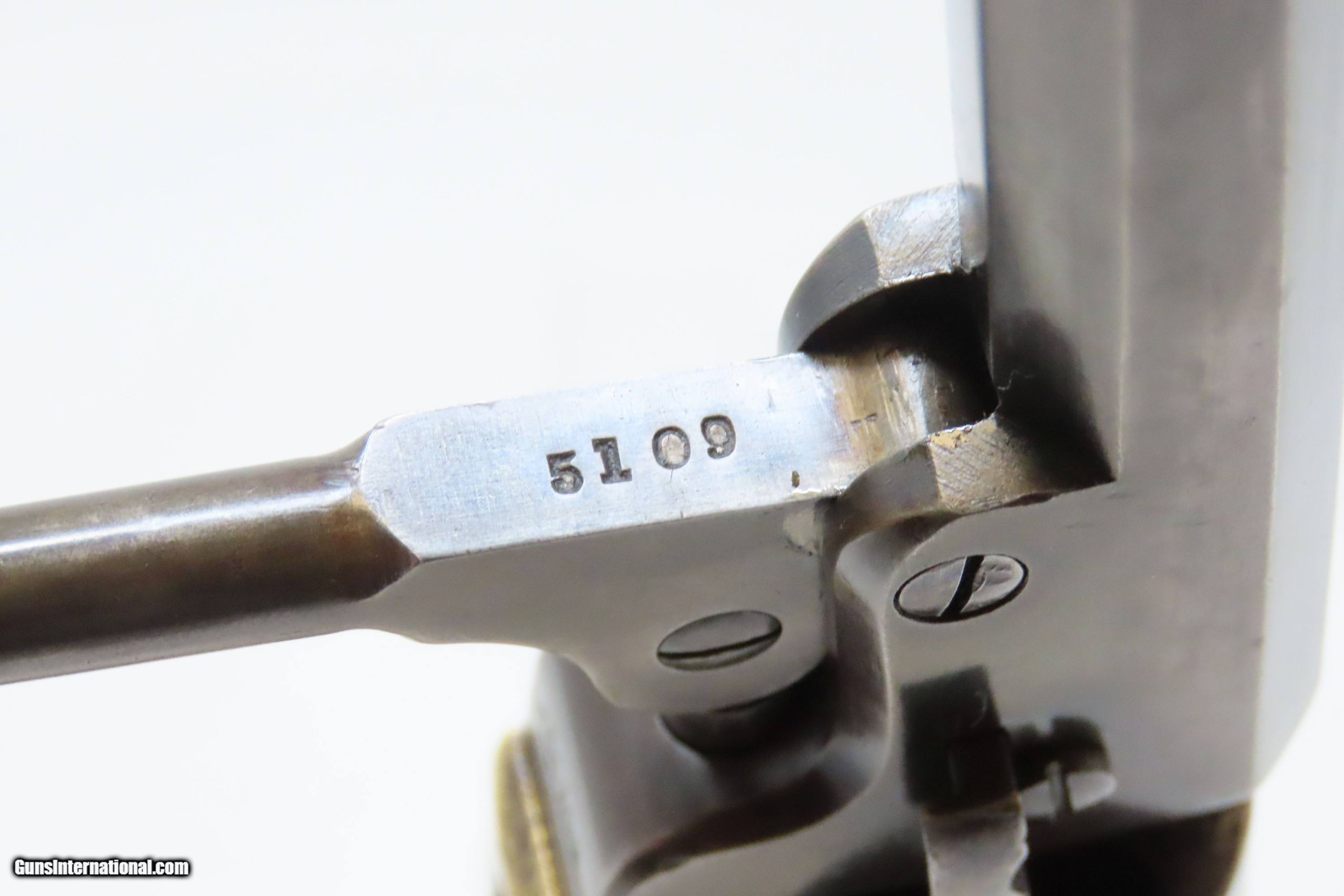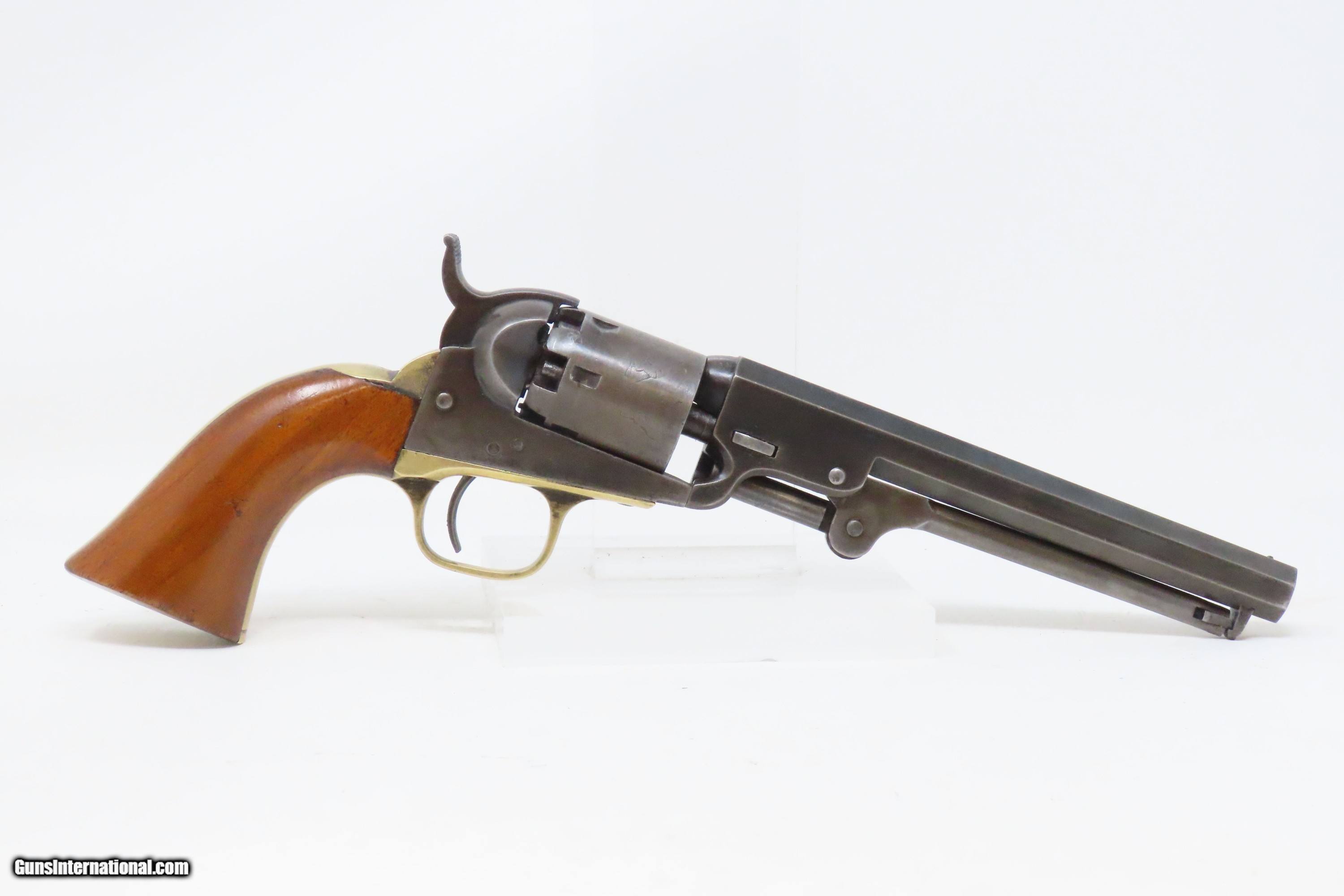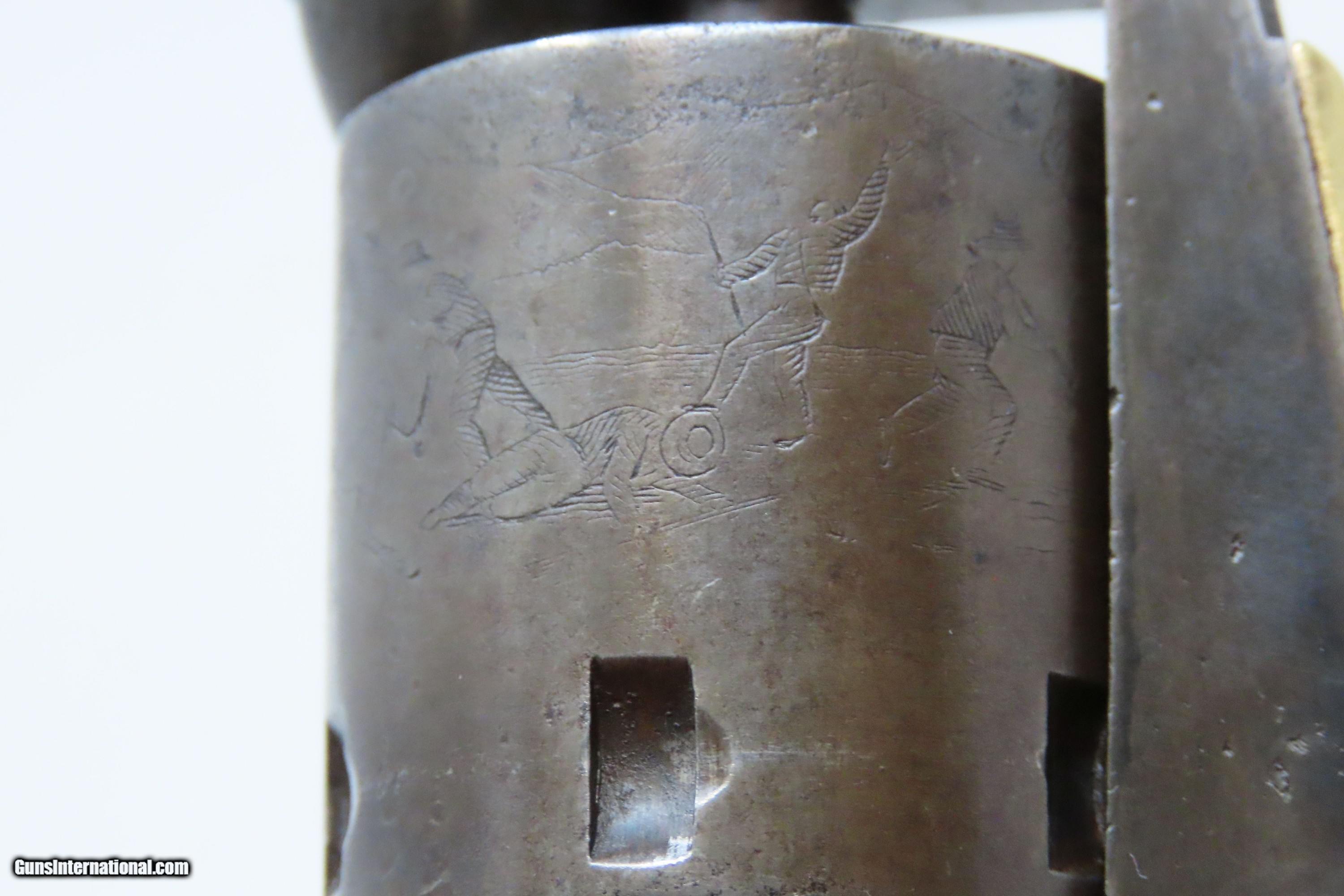 Description: c1864 COLT POCKET Revolver M1849.31 Percussion CIVIL WAR FRONTIER Antique WILD WEST SIX-SHOOTER Made In 1864 Here we present an antique percussion Colt Model 1849 Pocket Revolver, made during the American Civil War in 1864 in Hartford, Connecticut. The Model 1849 Pocket, the replacement for the Baby Dragoon, was the most widely produced of any Colt percussion pistol. Nearly 340,000 were manufactured during its 23-year production run that ended in 1873. Over 280,000 of these were produced by Colt’s factory at Hartford by the end of the Civil War in 1865. These were very popular and saw a lot of use on the battlefield, on the home front and in the West. These were some of the smallest, handiest pocket revolvers of the time. One of the most aesthetically pleasing aspects of this pistol is its cylinder scene. Cylinder scenes during this period were common, especially for Colt, not only for their visual appeal, but because it made a revolver more difficult to forge. The scene on the 1849 Pocket is that of a stagecoach robbery. The focal point is the stagecoach drawn by four horses. A woman in a dress is seen framed in the doorway of the side of the coach. The driver is standing alongside wielding his pistol against multiple assailants as the horses rear and struggle against their harnesses. Several of the bandits lay dying on the ground, one tries to control the horses, two are running away and one is in the process of falling dead after being shot. Not a bad way to show interested buyers what a pistol like this would be good for. It did a fine job as a self-defense handgun for the average citizen in 19th Century America. Though not a primary military arm during the American Civil War, these handguns were commonly privately purchased by soldiers for use on the battlefield. Whether legend or fact, it is interesting to note something commonly read about pocket revolvers of the day, that while they could be used for self-defense against the enemy, many soldiers kept them on their person to defend themselves against an unwanted amputation in the primitive field hospitals that were notorious, even in their day. The overall condition is good. The stagecoach robbery cylinder scene is still visible. Gray patina throughout. The action is excellent. The bore is patinated with strong rifling. Numbers match on the barrel, frame, trigger guard, grip frame, cylinder, wedge and arbor. Own the original! This is a legitimate antique and not a reproduction. Barrel is 6 inches. Caliber: .31 Percussion Overall condition as seen in photos. Very Fast. Very Safe. FREE SHIPPING WORLDWIDE. Delivered directly to your door by express mail! Guaranteed AUTHENTIC & Includes CERTIFICATE OF AUTHENTICITY. ancestryguns $2200 #233136 SOLD Antique: Yes |