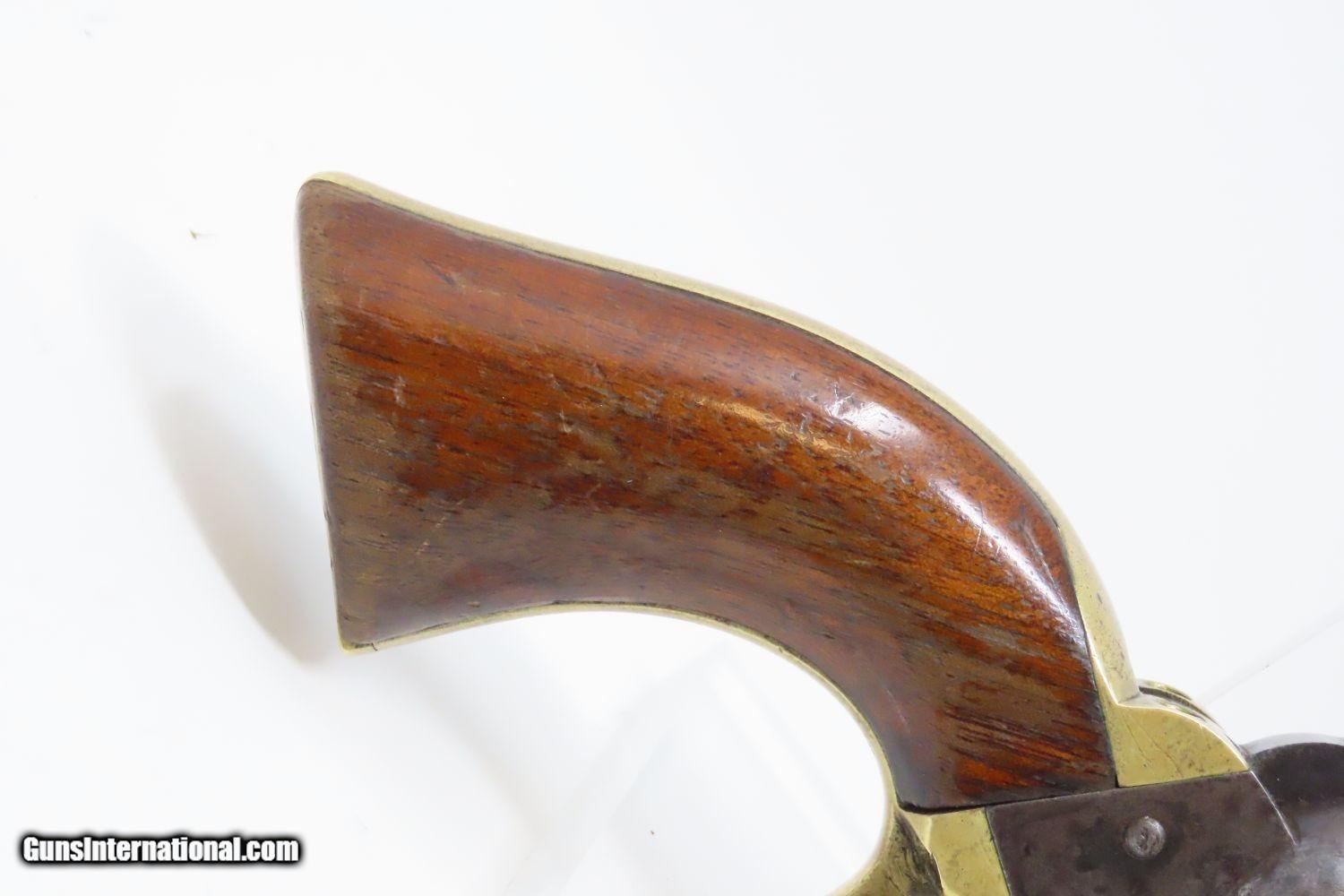Description: CIVIL WAR Antique COLT Model 1849 POCKET .31 Caliber PERCUSSION Revolver Handy WILD WEST SIX-SHOOTER Made In 1861 Here we present an antique percussion Colt Model 1849 Pocket Revolver, made during the American Civil War in 1861 in Hartford, Connecticut. The Model 1849 Pocket, the replacement for the Baby Dragoon, was the most widely produced of any Colt percussion pistol. Nearly 340,000 were manufactured during its 23-year production run that ended in 1873. Over 280,000 of these were produced by Colt’s factory at Hartford by the end of the Civil War in 1865. These were very popular and saw a lot of use on the battlefield, on the home front and in the West. These were some of the smallest, handiest pocket revolvers of the time. One of the most aesthetically pleasing aspects of this pistol is its cylinder scene. Cylinder scenes during this period were common, especially for Colt, not only for their visual appeal, but because it made a revolver more difficult to forge. The scene on the 1849 Pocket is that of a stagecoach robbery. The focal point is the stagecoach drawn by four horses. A woman in a dress is seen framed in the doorway of the side of the coach. The driver is standing alongside wielding his pistol against multiple assailants as the horses rear and struggle against their harnesses. Several of the bandits lay dying on the ground, one tries to control the horses, two are running away and one is in the process of falling dead after being shot. Not a bad way to show interested buyers what a pistol like this would be good for. It did a fine job as a self-defense handgun for the average citizen in 19th Century America. The overall condition is very good. Both grips are firmly seated and remain in good shape with expected wear. The action is strong and tight all the way around. The bore is good overall. Number match. A great example of one of Samuel Colt’s most prolific revolvers from the percussion era! Own the original! This is a legitimate antique and not a reproduction. Barrel is 4 inches. Caliber: .31 percussion Overall condition as seen in photos. Very Fast. Very Safe. FREE SHIPPING WORLDWIDE. Delivered directly to your door by express mail! Guaranteed AUTHENTIC & Includes CERTIFICATE OF AUTHENTICITY. ancestryguns $1615 #210322 SOLD Antique: Yes |