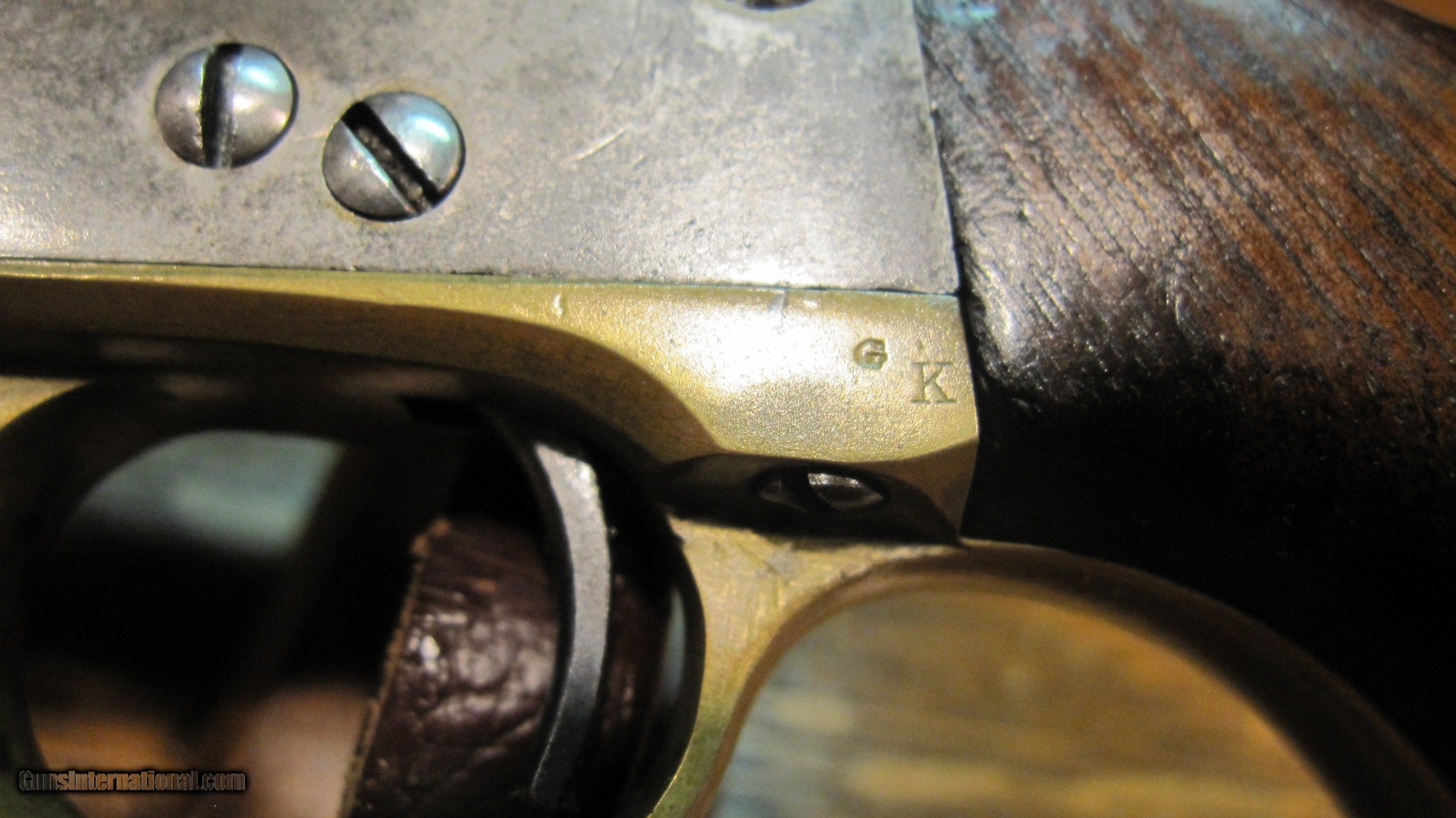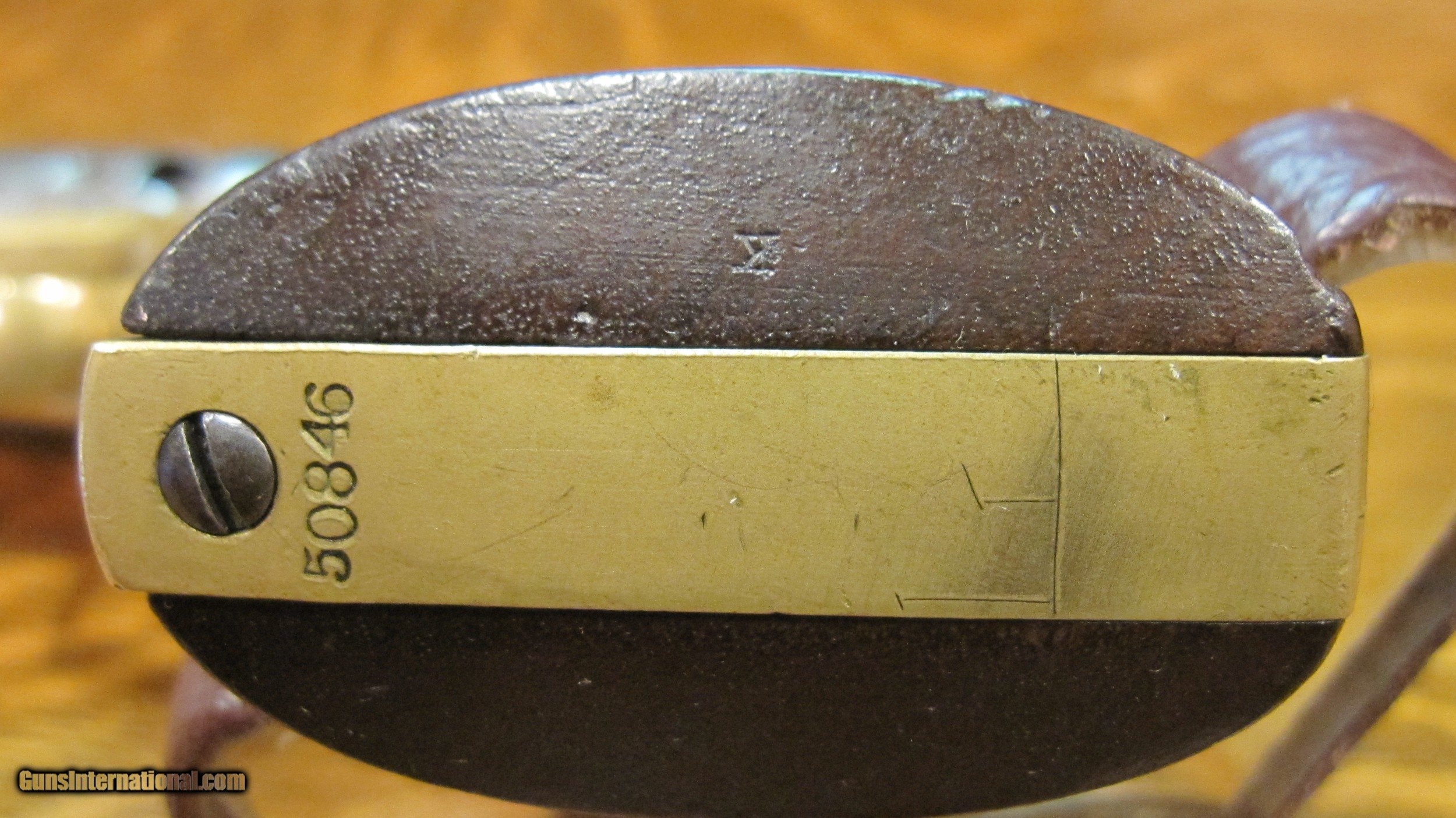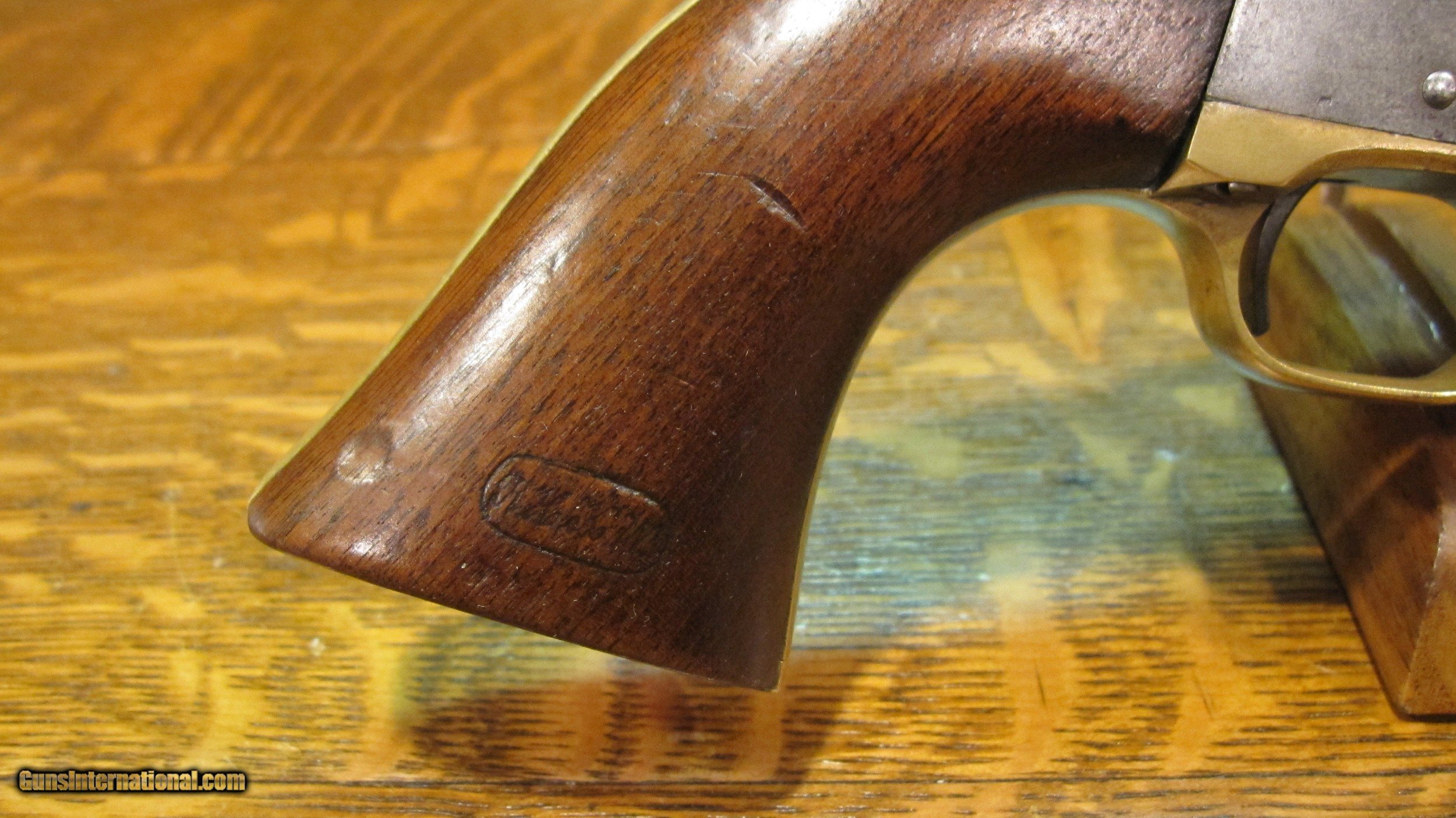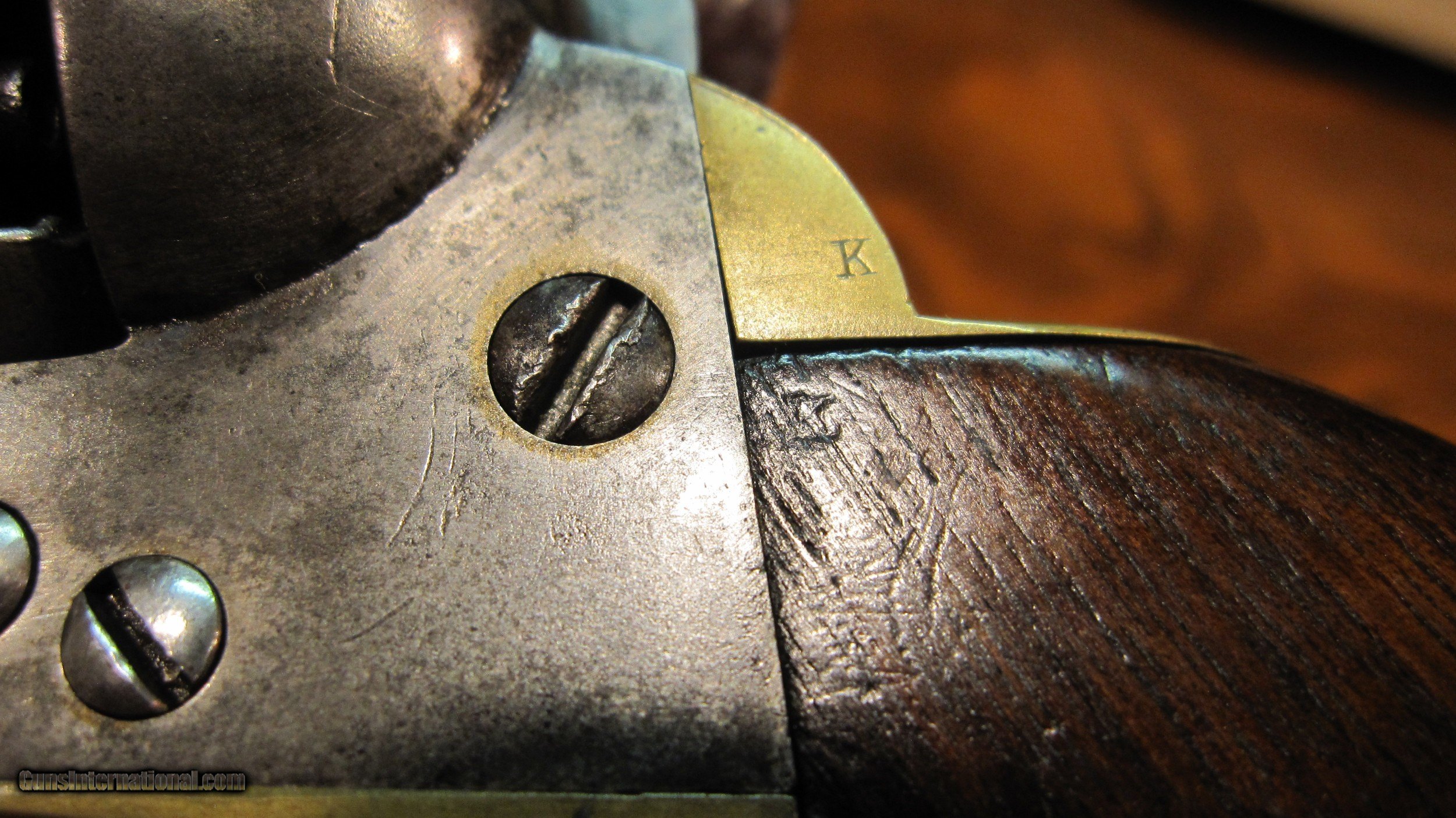 Description: Colt 1851 Martial Revolver. Circa 1856. 36 cal. Nice sharp revolver. Just traces of original blue. Sub-inspected "K" in six different places. Right grip is inspected by Robert Henry Kirkwood Whitley. Left grip is inspected A.D.King. Action is crisp and tight. Bore is shiney with just a small amount of pitting. Great early Martial Colt. Please call 973-214-3407 with questions or more pics. SOLD Antique: Yes |