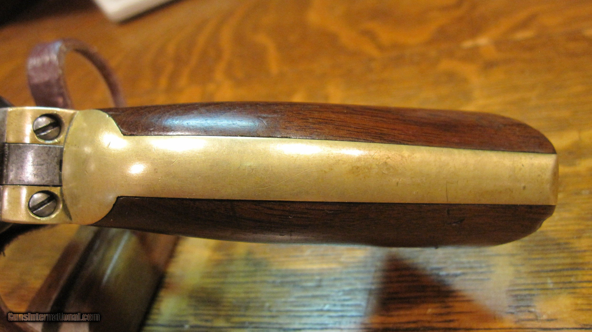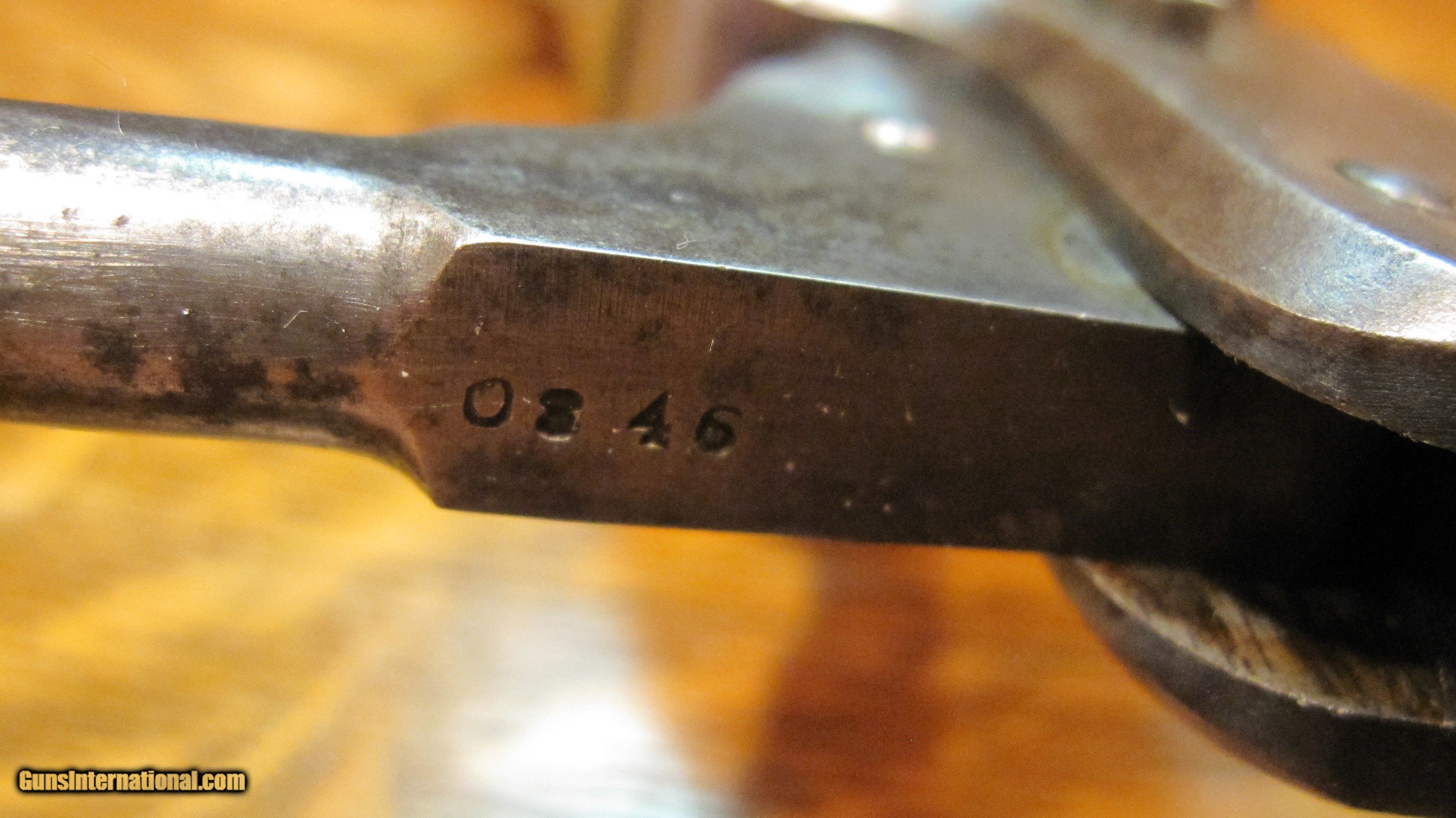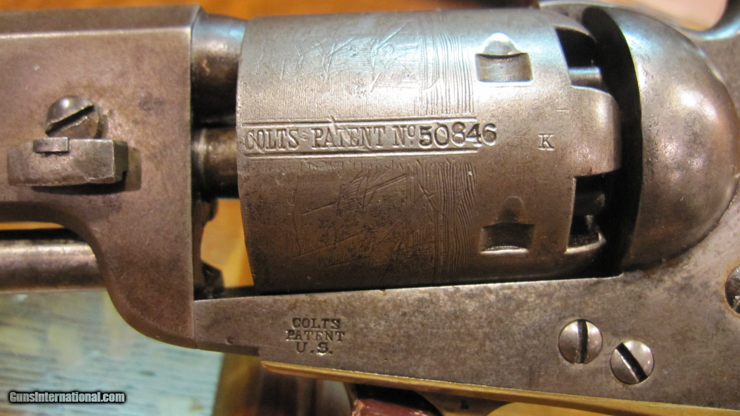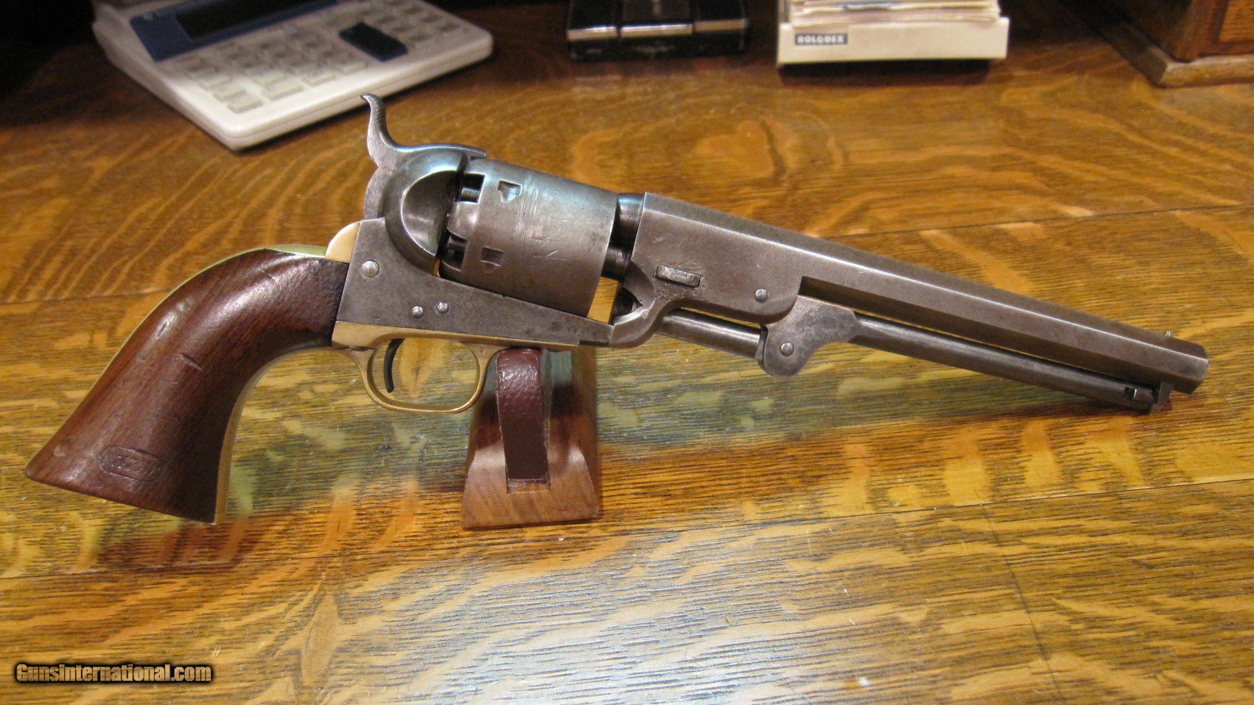 Description: Colt 1851 Martial Revolver. Circa 1856. 36 cal. Nice sharp revolver. Just traces of original blue. Sub-inspected "K" in six different places. Right grip is inspected by Robert Henry Kirkwood Whitley. Left grip is inspected A.D.King. Action is crisp and tight. Bore is shiney with just a small amount of pitting. Great early Martial Colt. Please call 973-214-3407 with questions or more pics. SOLD Antique: Yes |