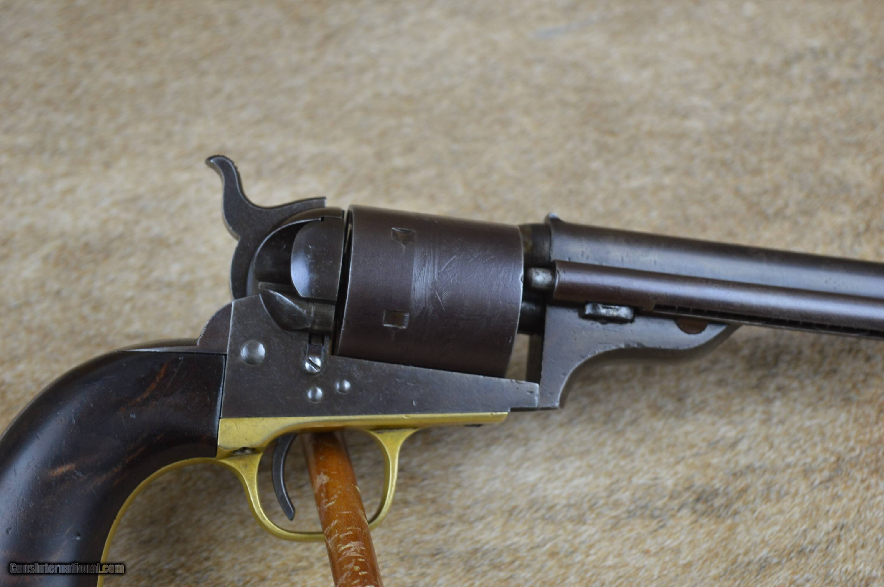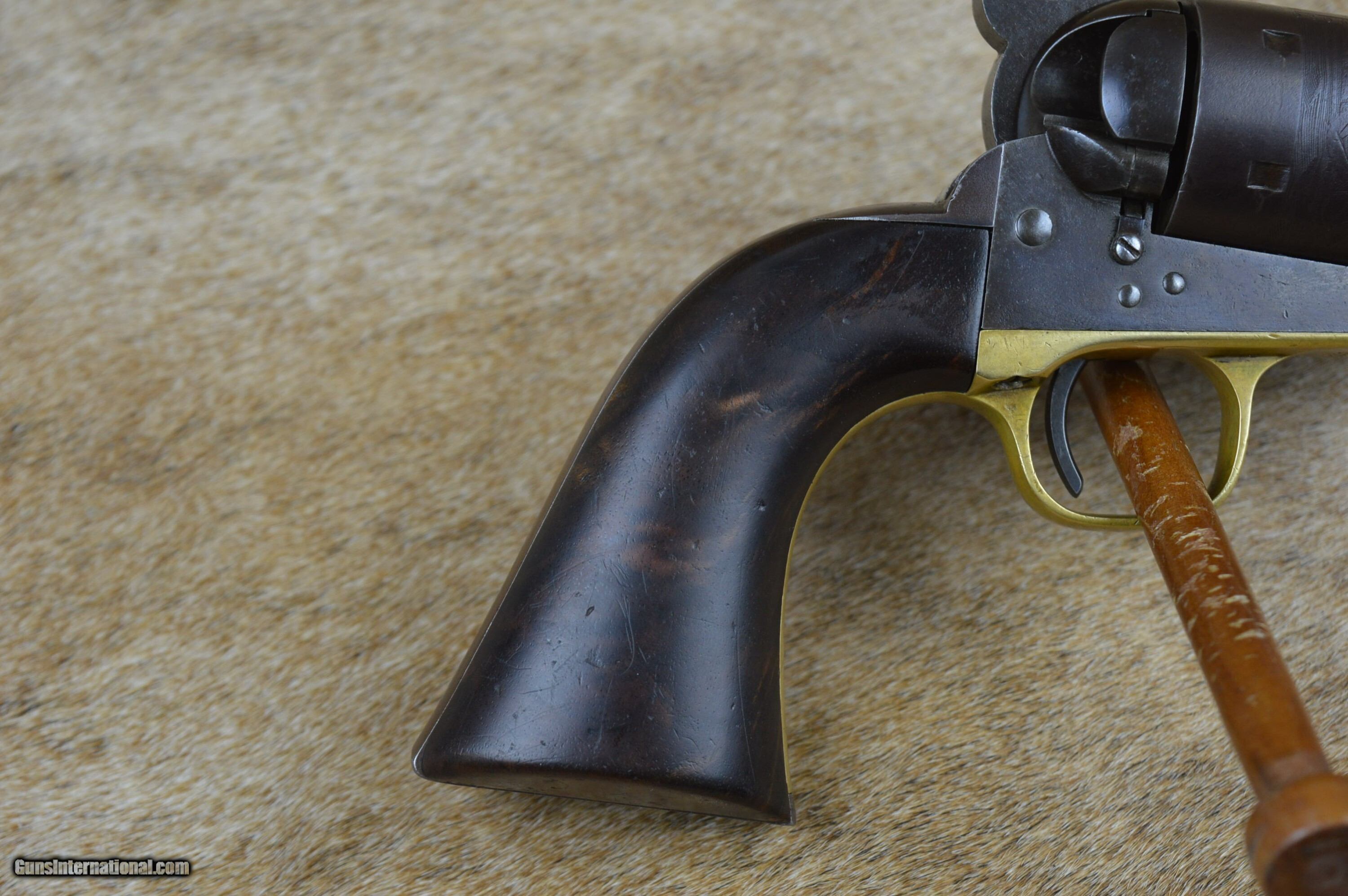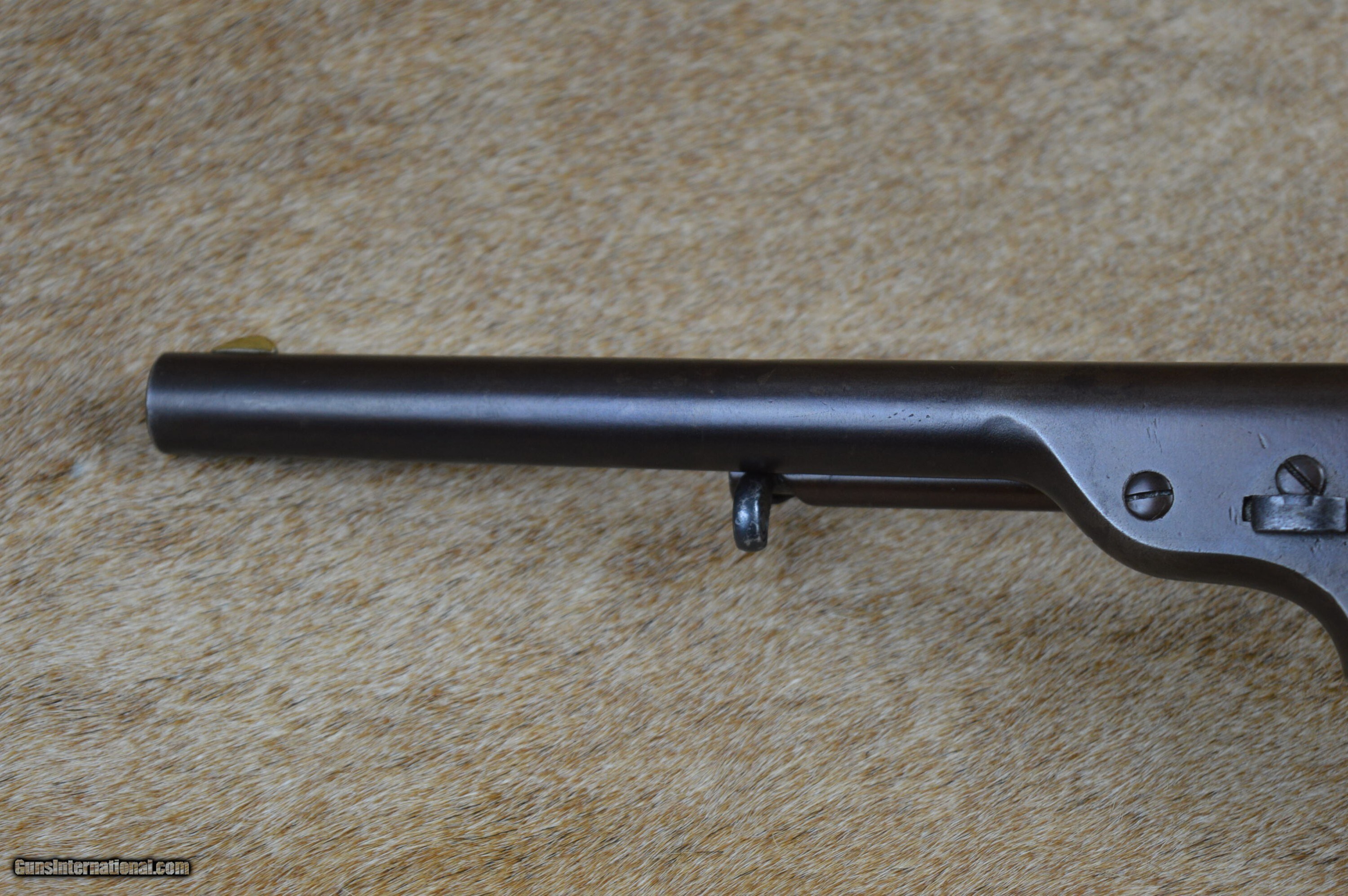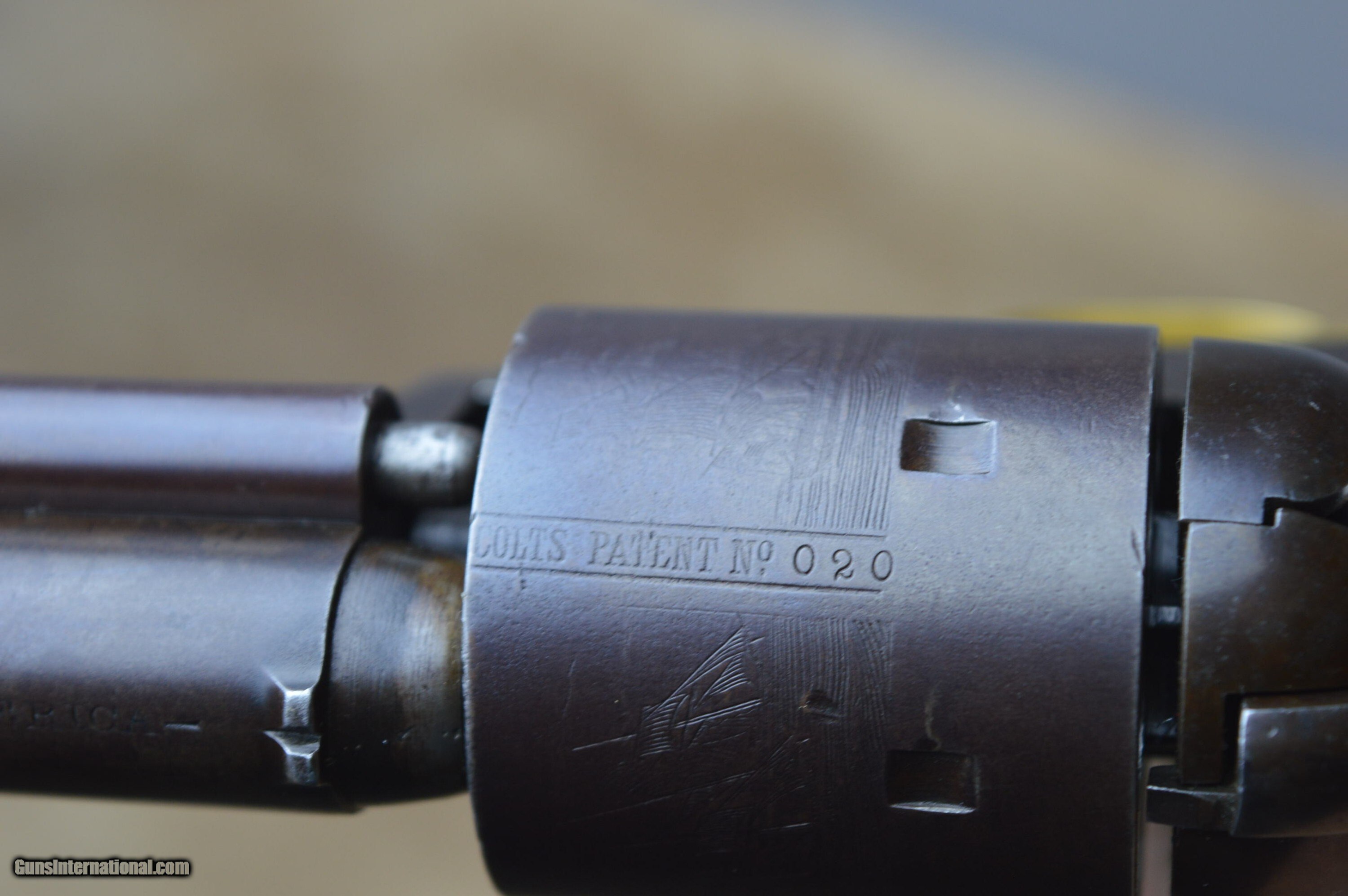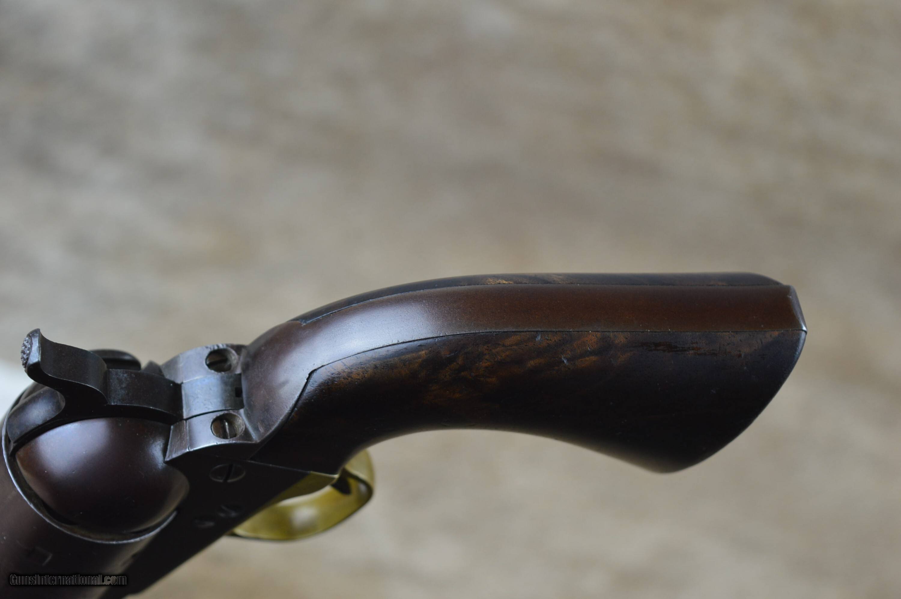 Description: Colt 1871-72 Open Top Mfg Nov 1, 1872 According to Colt Letter .44 Rimfire ( This model was made to complement the Henry Rifle so chambered in 44 Rimfire) This model was the first non-percussion model Colt made. It was short lived because the Single Action Army was introduced in 1873. Only a few thousand were built so they are very rare. Condition on this gun is very good overall, the metal is an even brownish color, the battle scene on the cylinder is very crisp. Matching serial numbers #1020 Very nice Walnut grips with nice figure Mechanically it locks up nice & tight and hammer spring is strong This is an early one,( SN 1020) with New York address and just Colt's Patent on the frame Brass Frame Colt Factory Letter included with purchase Antique: Yes Rifle Caliber: .44 Rimfire Manufacturer: Colt Model: 1871-72 Serial Number: 1020 Condition: Good Price: $12,900.00 Shipping: $125.00 Contact Seller |