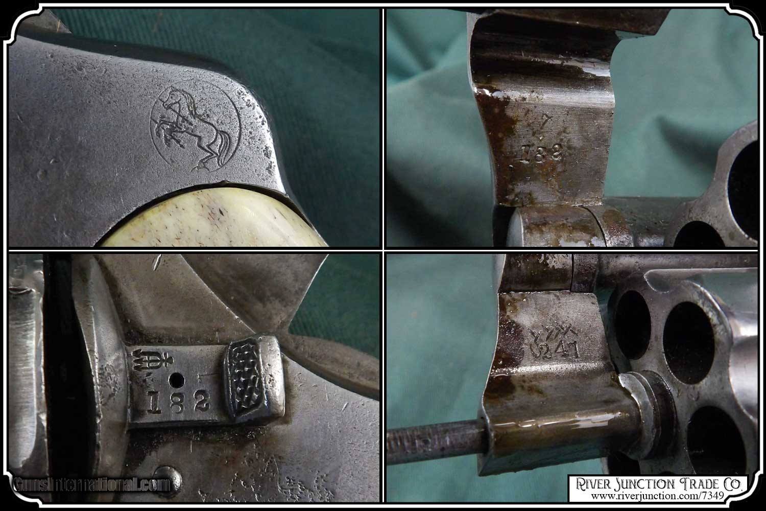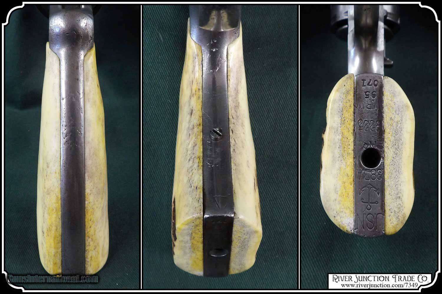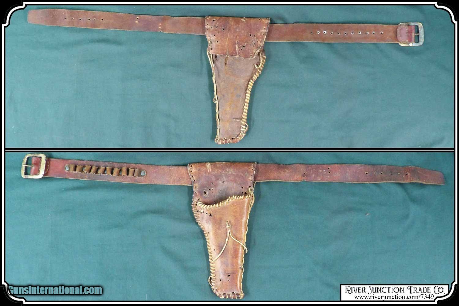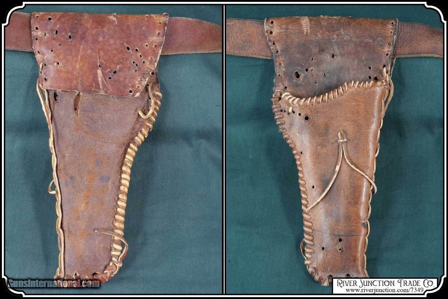 Description: Original 1895, Colt .38 Long, in a bunkhouse made Holster and belt This holster was made from an old pair of chaps. Hand cut and hand laced along the main seam. The workmanship is not that of a professional leather worker, in fact I would say it maybe the first holster this cowboy made. He mated it with a hardware store belt, bullet loops that hold .38 Long Colt cartridge and his prize possession a 1895 Colt Double Action Army with a 6 inch barrel perfectly The leather is fully alive and would give another century of service or just to display, with his Colt . The Colt has been fit perfectly with a pair of handmade stag grips. The belt measure 40 inches from the buckle to the center hole. Price: $1,295.00 Buy Now Contact Seller |