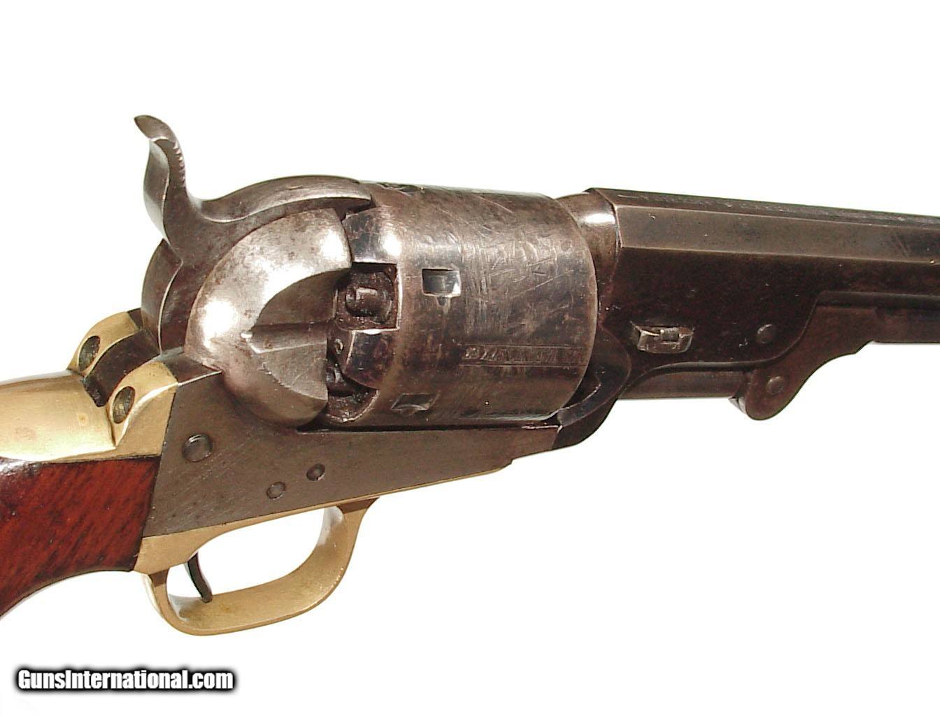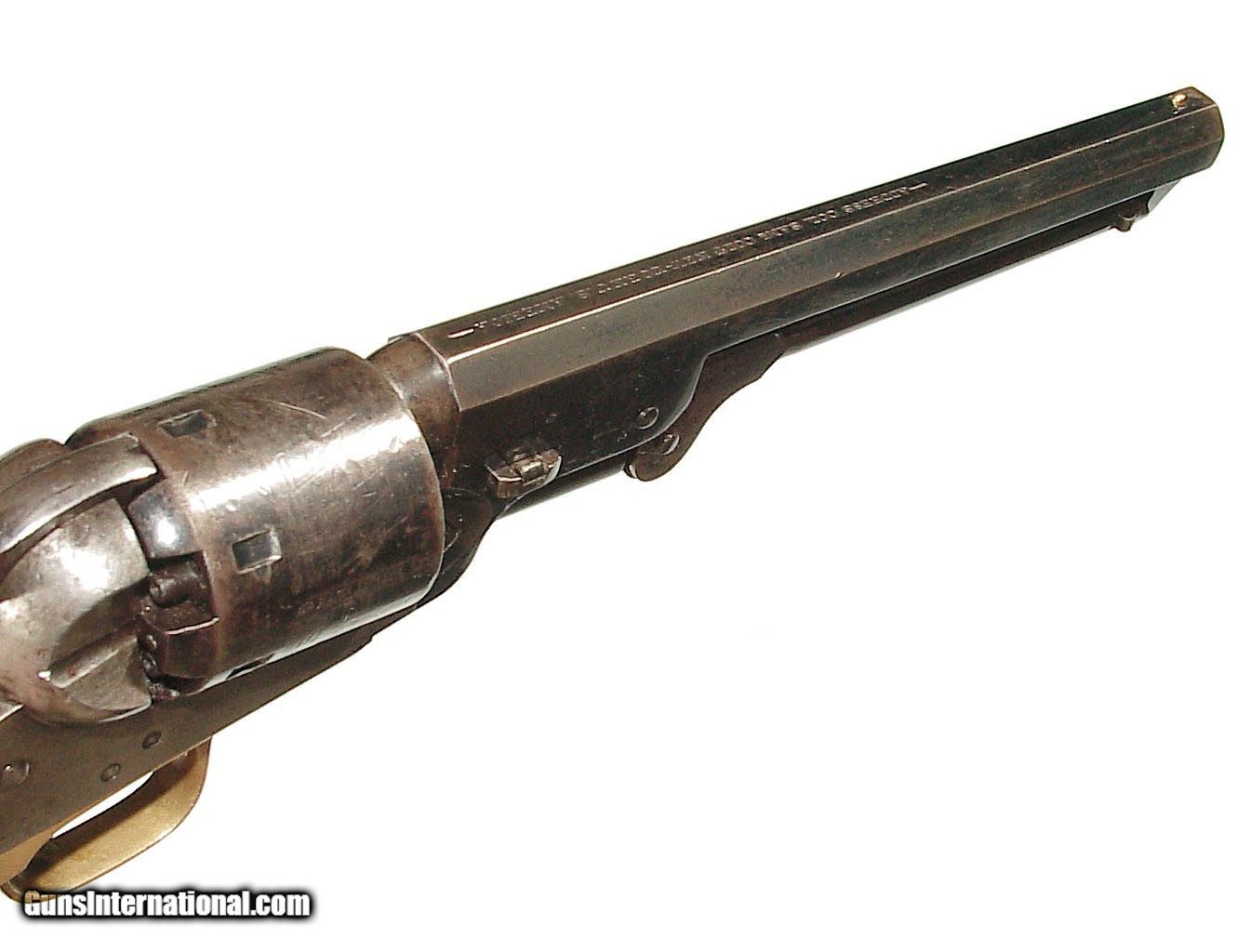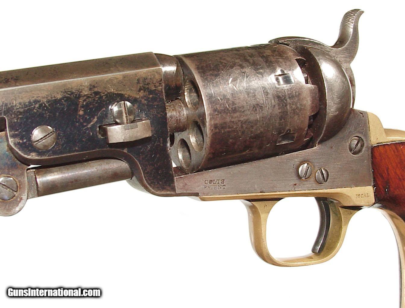 Description: .36 caliber, 7 1/2" octagon barrel with loading lever underneath. Blue and casehardened finish with varnished walnut grip. The barrel showing 75-80% original high polish blue, cylinder slightly less with a very crisp scene. The frame and loading lever retaining generous case colors. The grips showing handling marks from use. The is bright with sharp rifling and some minor dark spots can be seen. SOLD Antique: Yes |