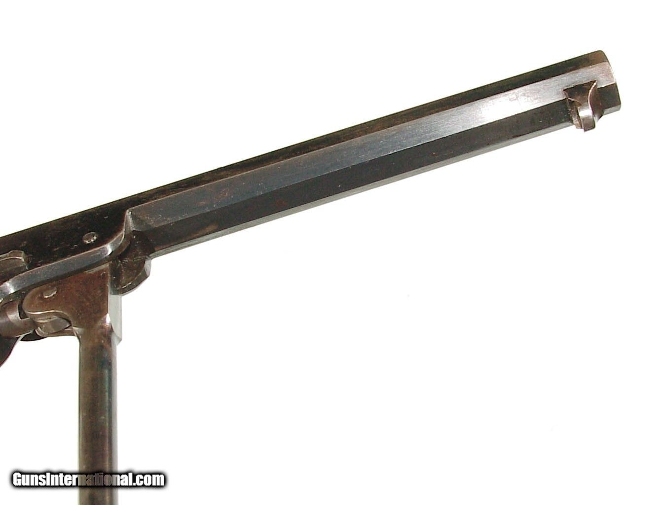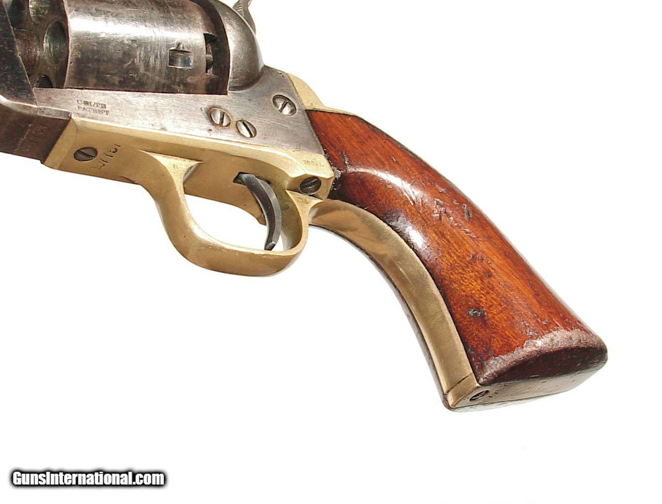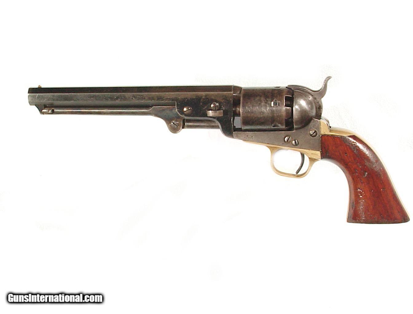 Description: .36 caliber, 7 1/2" octagon barrel with loading lever underneath. Blue and casehardened finish with varnished walnut grip. The barrel showing 75-80% original high polish blue, cylinder slightly less with a very crisp scene. The frame and loading lever retaining generous case colors. The grips showing handling marks from use. The is bright with sharp rifling and some minor dark spots can be seen. SOLD Antique: Yes |