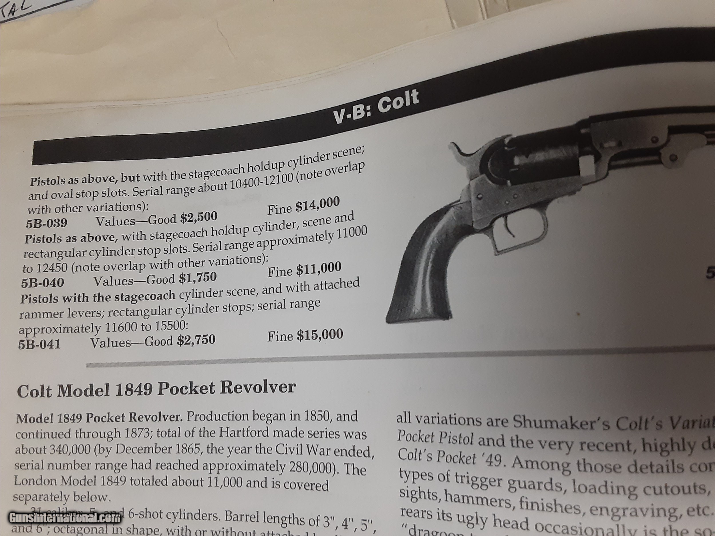 Description: ...Layaway.....Attractive late production 1850 vintage Colt Baby Dragoon .31, about FINE CONDITION!.... caliber percussion revolver exhibiting many of the features commonly associated with the 1849 pocket revolver. Blued 4" octagon barrel with 2-line New York address and loading lever. Brass post front sight and v-notch rear. 5-shot cylinder with stagecoach hold up scene and rectangle stops correct for these late Baby Dragoons. Silver plated square back trigger guard and grip straps. Grips are 1-piece smooth walnut. FLAYDERMANS PRICEGUIDE LISTS THIS GUNS VALUE AT $2750 IN GOOD, AND $15,000 IN FINE (see attached photo)! MANY WOULD GRADE THIS AS FINE, BASED ON BLUING, CYLINDER AND BORE.... CONDIITON: VG+ to FINE. Barrel retains significant portions of factory applied blued finish thinning to brown patina. Traces of case colors visible on loading lever, with balance gray patina. Frame and hammer bright gray. Cylinder scene has wear but is still largely visible. Grip straps retain majority of silver plating thinning to brass at high wear areas. Grips have only minor marks. Fine bore and mechanics. Full or partial matching numbers observed on frame, barrel assembly, loading lever, wedge, cylinder, cylinder arbor, trigger guard, and back strap. A fine example of a desirable black powder Colt. BAS Barrel Length: 4" Caliber/Bore: .31 Percussion S/H $25. 2nd firearm ships FREE with this one!......Thanks, Greg 60-63, cp SOLD Antique: Yes Handgun Caliber: .31 Manufacturer: Colt Model: Baby Dragoon Serial Number: 13859 |