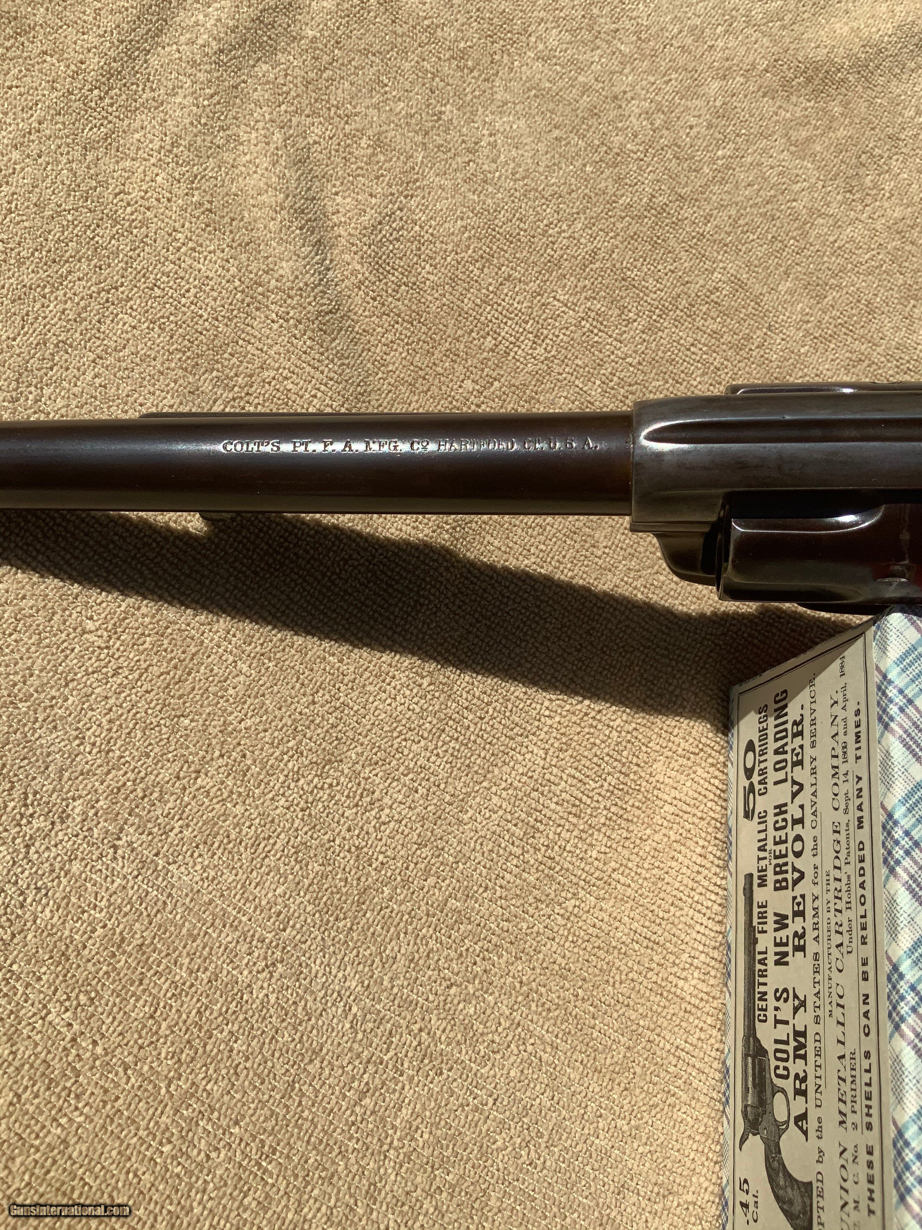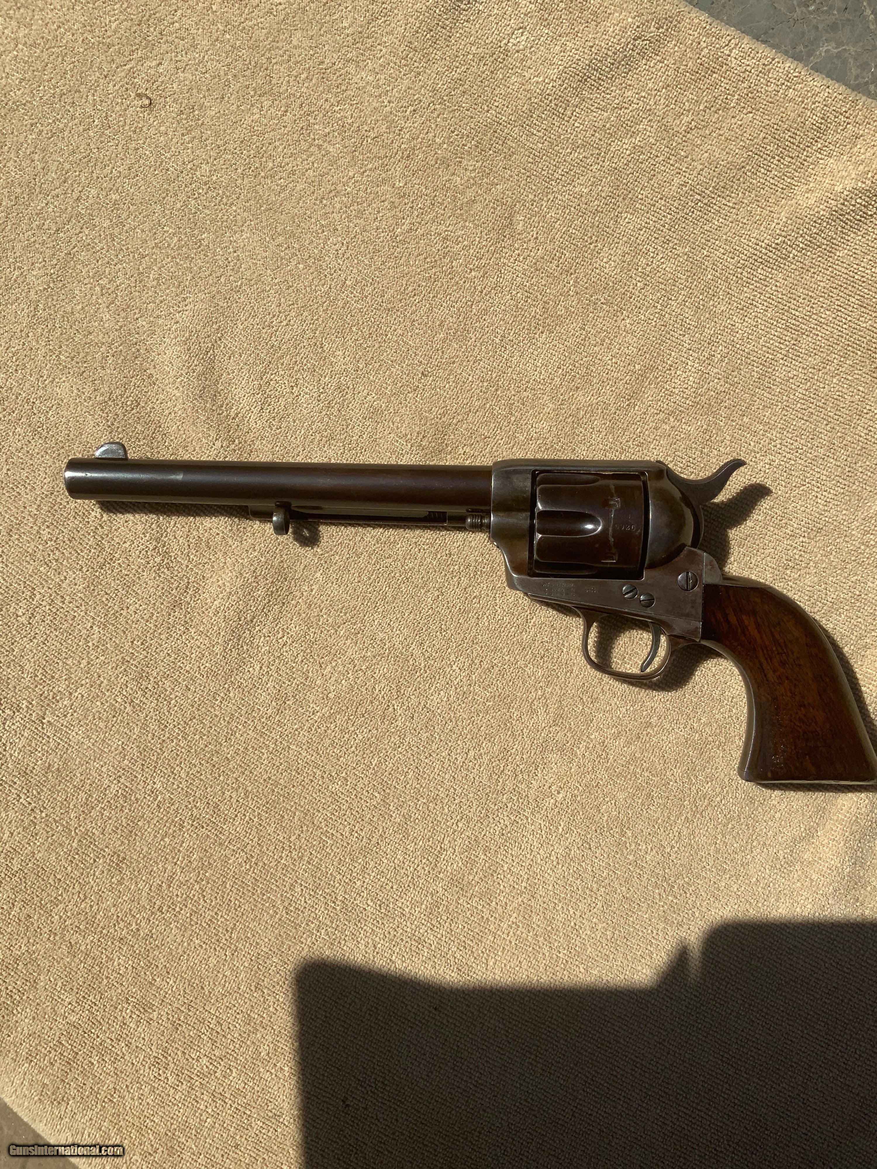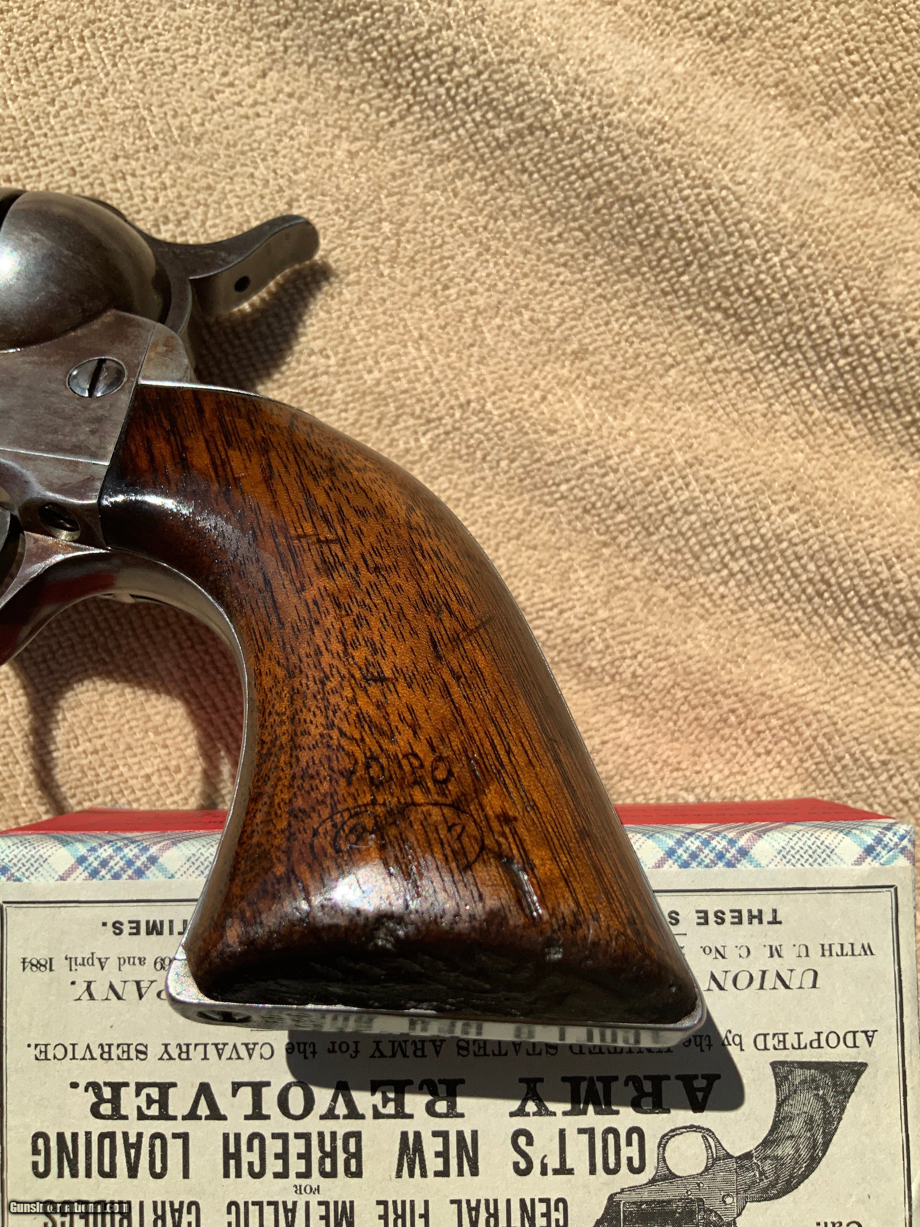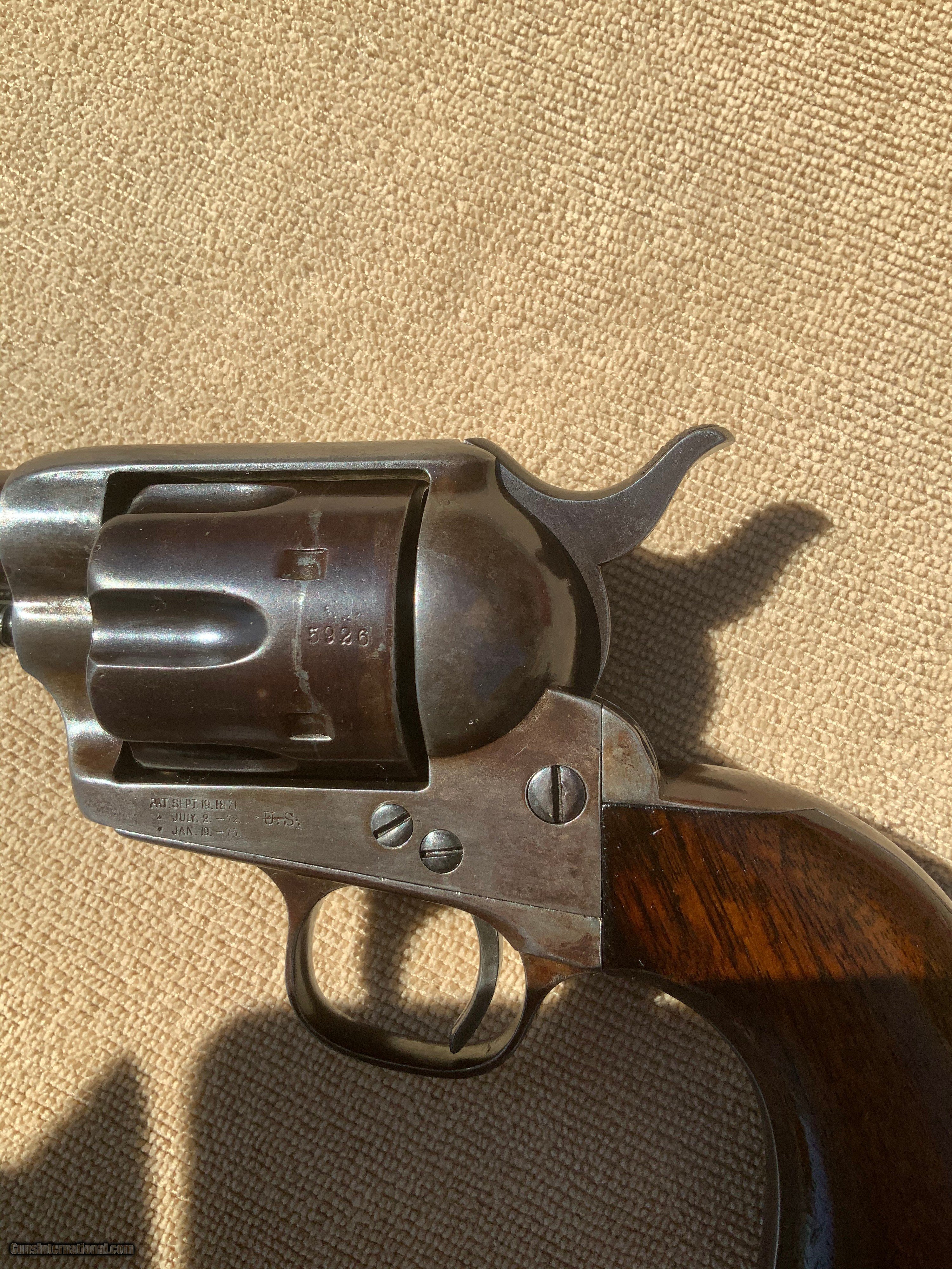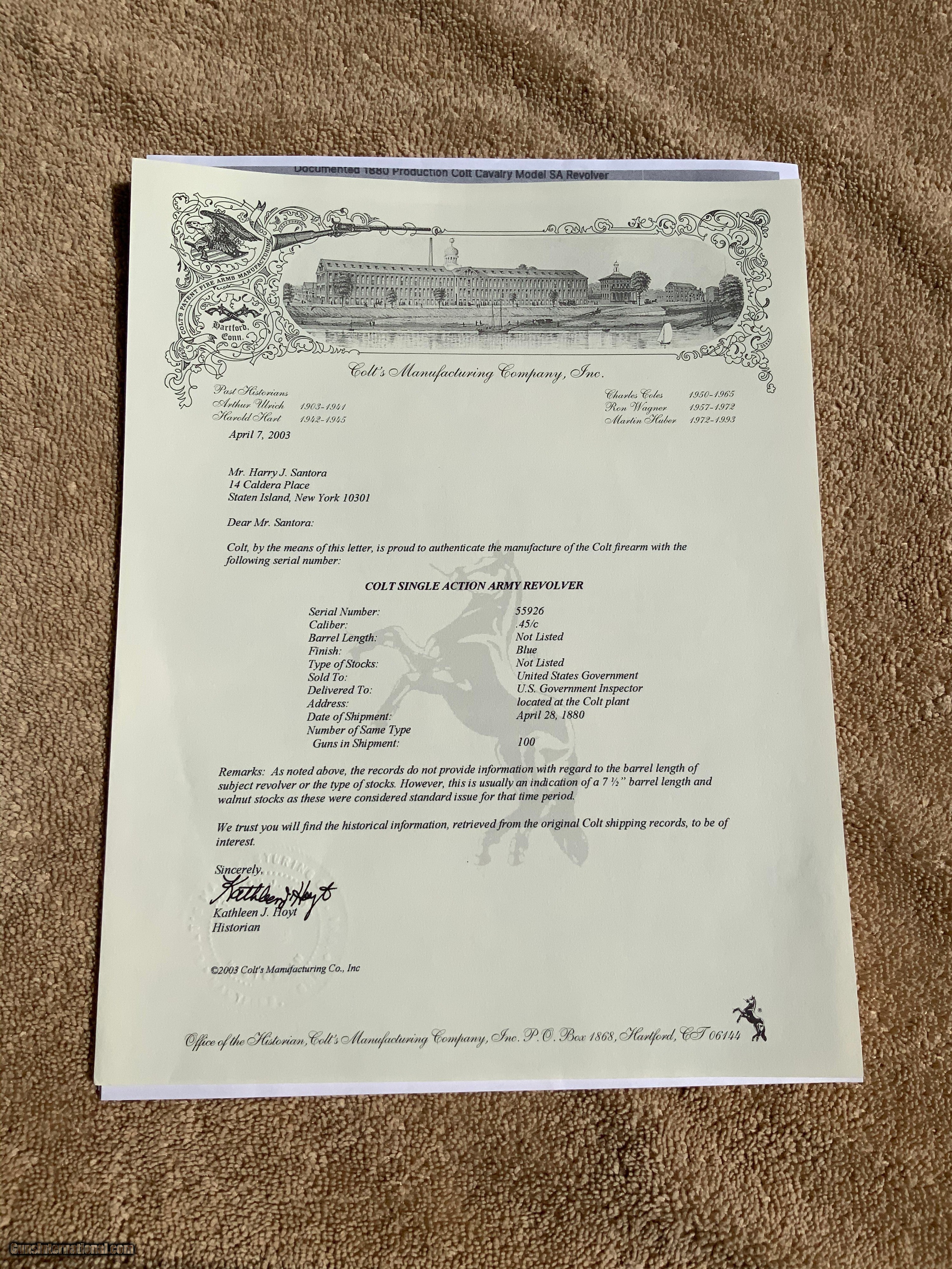 Description: HERE IS A VERY NICE COLT CAVALRY SINGLE ACTION ARMY REVOLVER SHIPPED IN 1880 PER THE ENCLOSED COLT LETTER ALL MARKINGS ON THIS GREAT COLT ARE SHARP AND CRISP, INCLUDING A VERY NICE CARTOUCHE ON THE GRIP. THE CONDITION OF THIS HANDSOME REVOLVER IS VERY GOOD AND THE GRIPS FIT NICELY. THE BORE AND RIFLING OF THE BARREL ARE VERY GOOD. THE REVOLVER HAS A NICE EVEN PATINA TO IT, VERY PRESENTABLE. ACTION IS PERFECT, NICE AND STRONG. A DECENT LETTERED EARLY U.S. MARKED SINGLE ACTION ARMY SERIAL NUMBER 55926 ALL MATCHING DFC AND PROOF ON BARREL THESE IMAGES ARE VERY DETAILED AND SHOW CONDITION ACCURATELY I AM A COLLECTOR SELLING FROM MY OWN COLLECTION. I TOOK THE PICTURES IN BRIGHT NATURAL SUNLIGHT. ANY QUESTIONS PLEASE FEEL FREE TO CONTACT ME SOLD pending payment SOLD Antique: Yes |