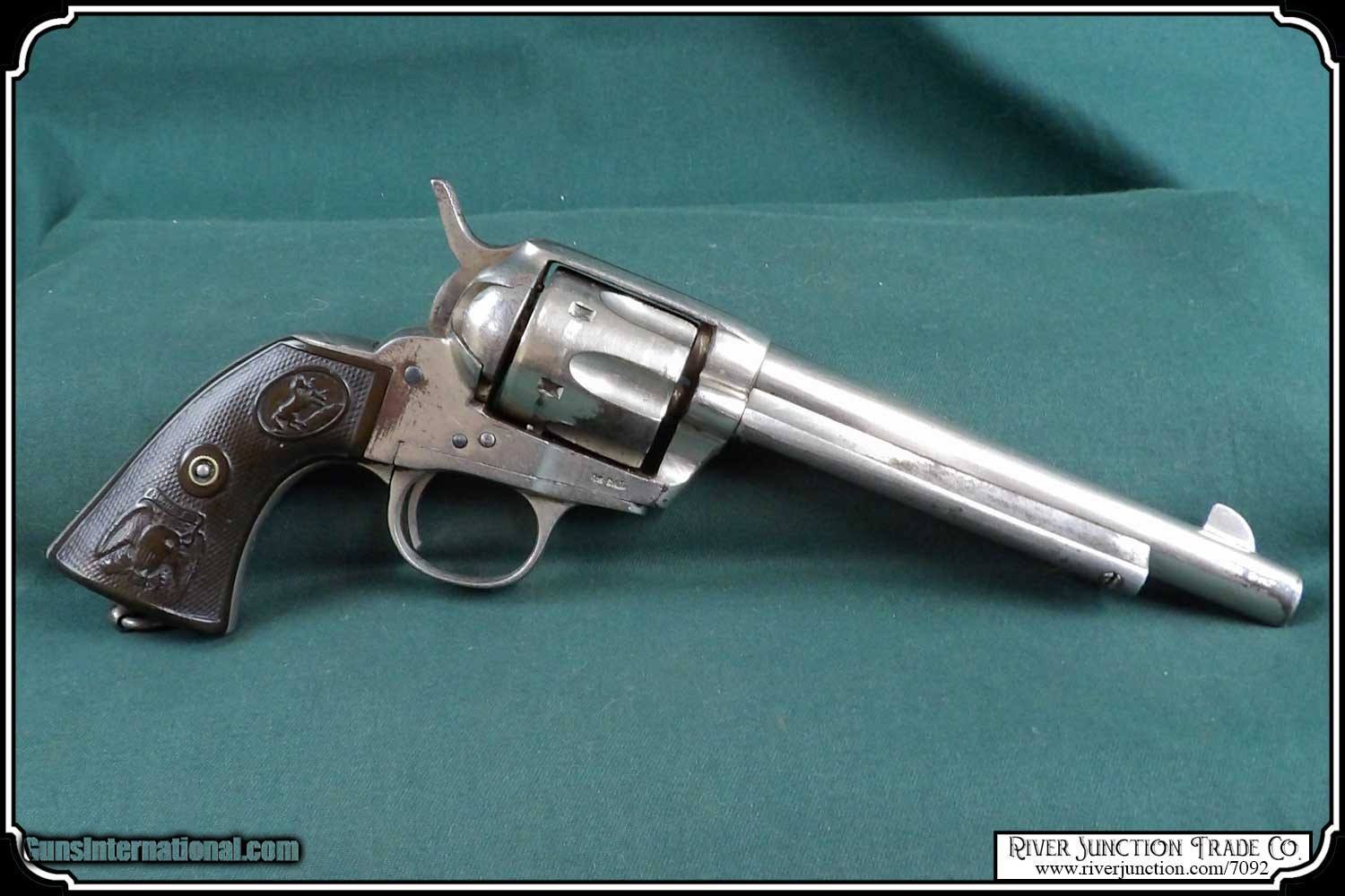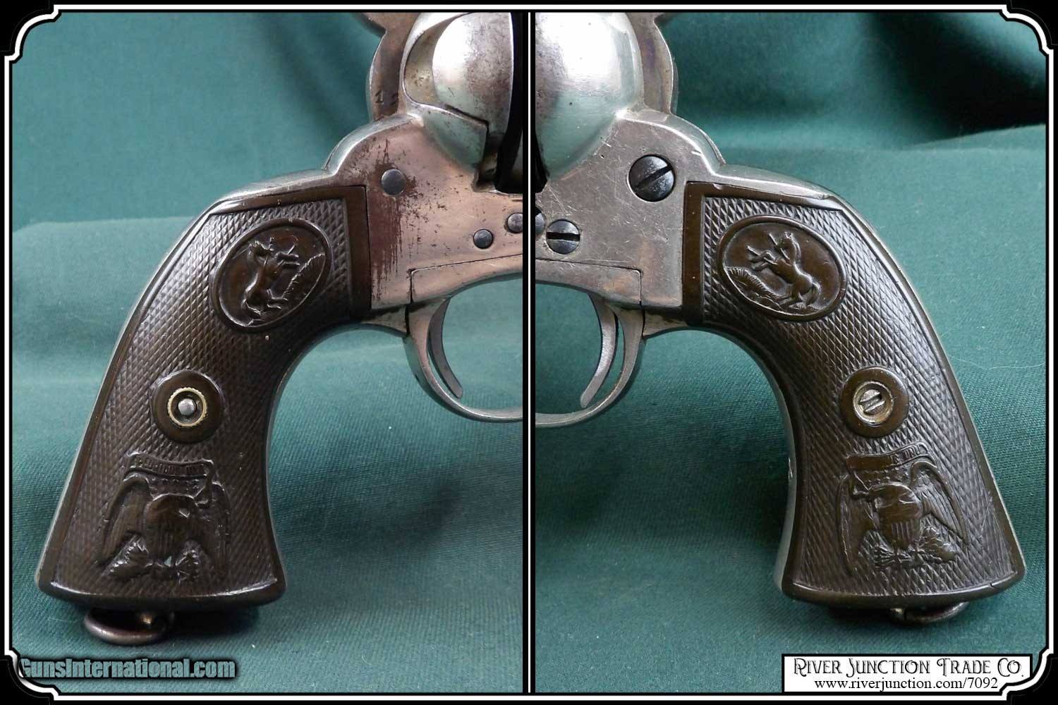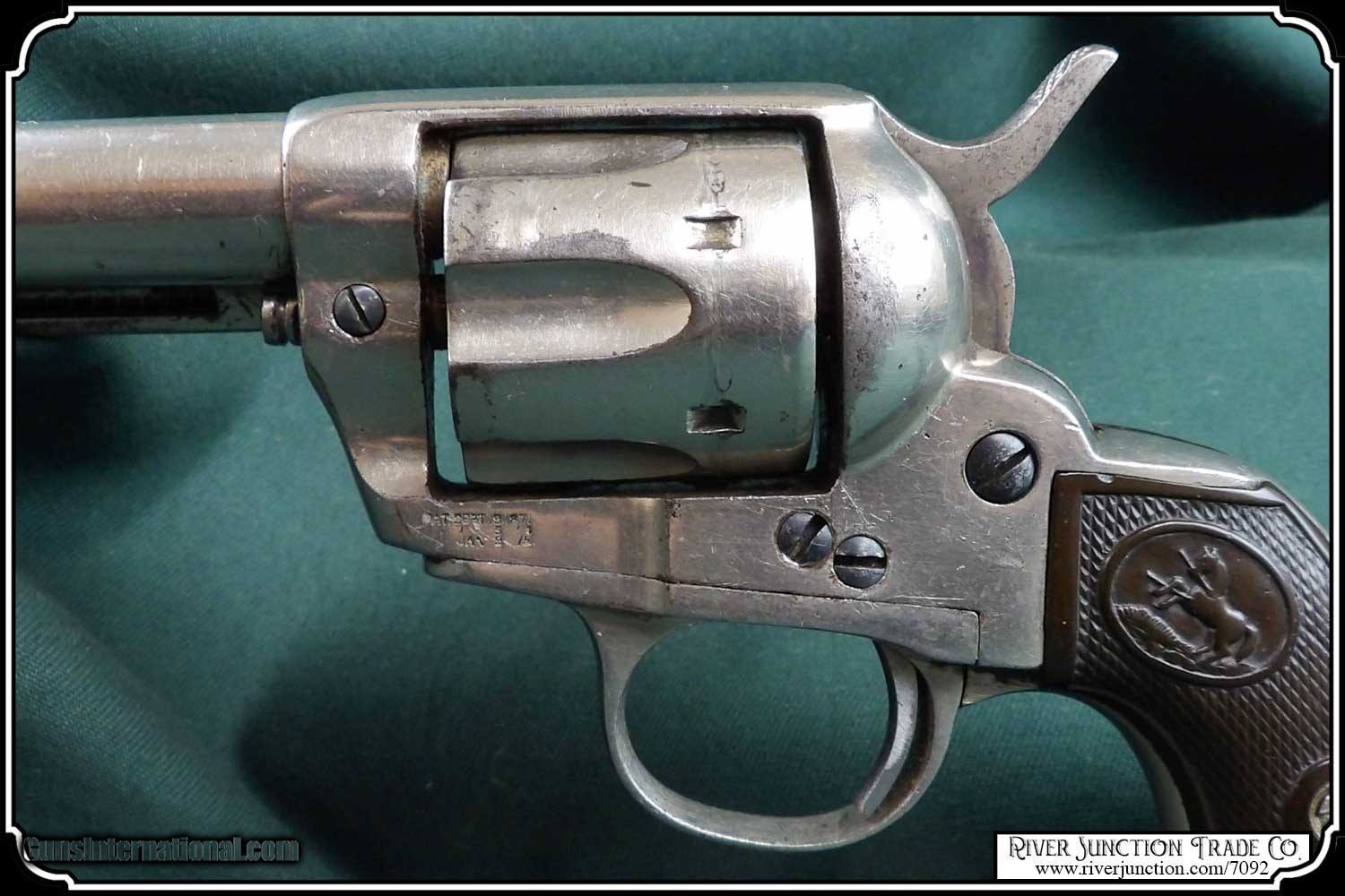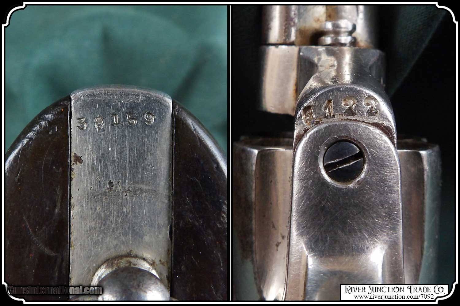 Description: There was a time when the American West was a wide and wild country, shaped not by polished treaties but by the grit of frontier justice and the cold steel of a six-shooter. This Colt Copy revolver, serial numbers 6122 & 38159, hails straight from that era—bearing the soul and substance of an age when a man’s word rode side by side with his sidearm. Chambered in .38 caliber, this single-action beauty boasts a 5 1/2 inch barrel, a standard sight setup, and the kind of clean nickel finish that only a true survivor could carry through the decades. With original Colt labeling clearly stamped, the prancing pony and eagle grip design proudly declare its pedigree. There’s no mistaking the authenticity in those deep cuts and visible checkering—the kind that’s lasted through saloon shootouts, prairie crossings, and years of respectful ownership. The original nickel finish glistens like a tin star under the desert sun, only lightly kissed by age. And though there’s a whisper of powder frosting in the bore, the rifling remains strong and ready—proof of a firearm that’s been cared for with reverence. Mechanically, it stands tall: tight lockup, perfect timing, and a hammer spring with the kind of strength frontier folk would’ve relied on. Whether you're a collector of Western heritage or a lover of classic American craftsmanship, this revolver embodies the rugged determination and artistry of yesteryear. Key Features: