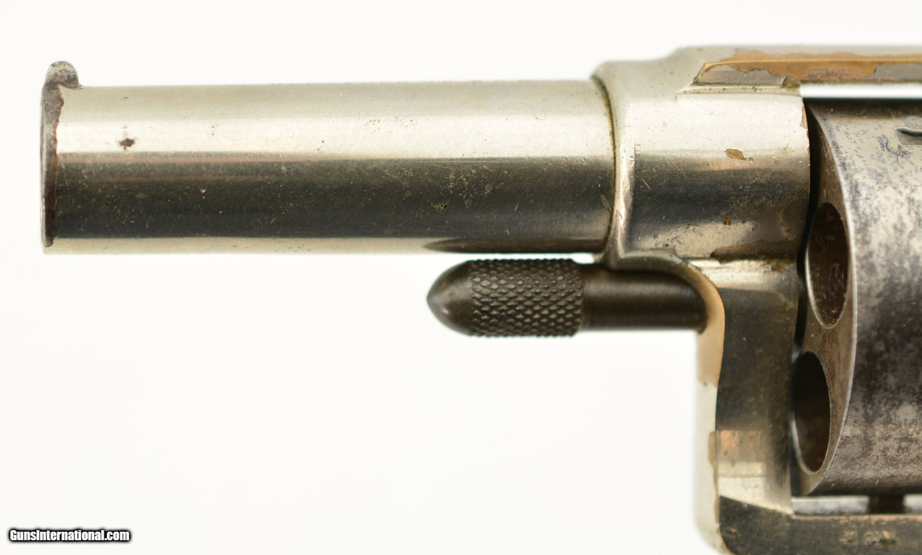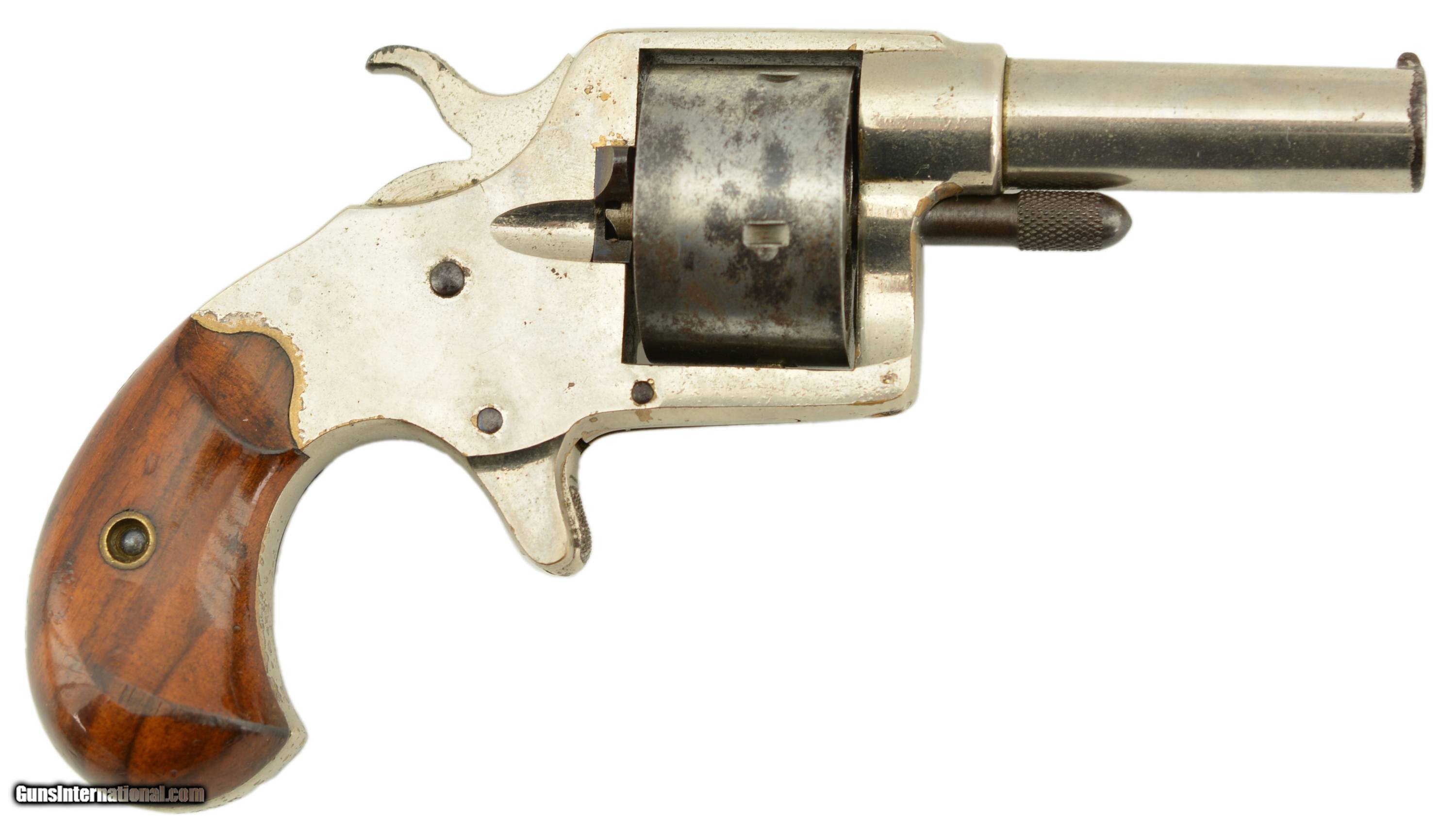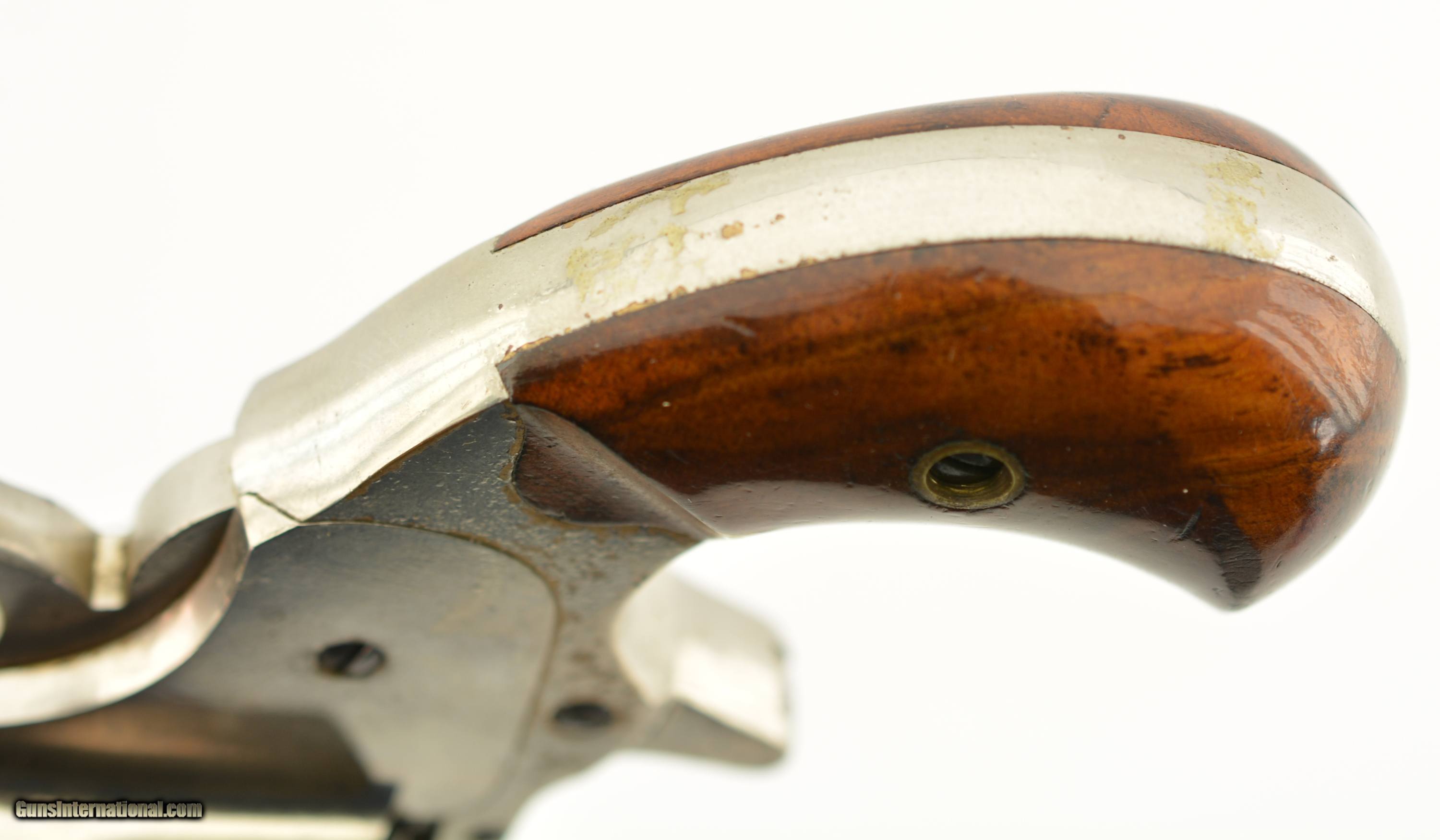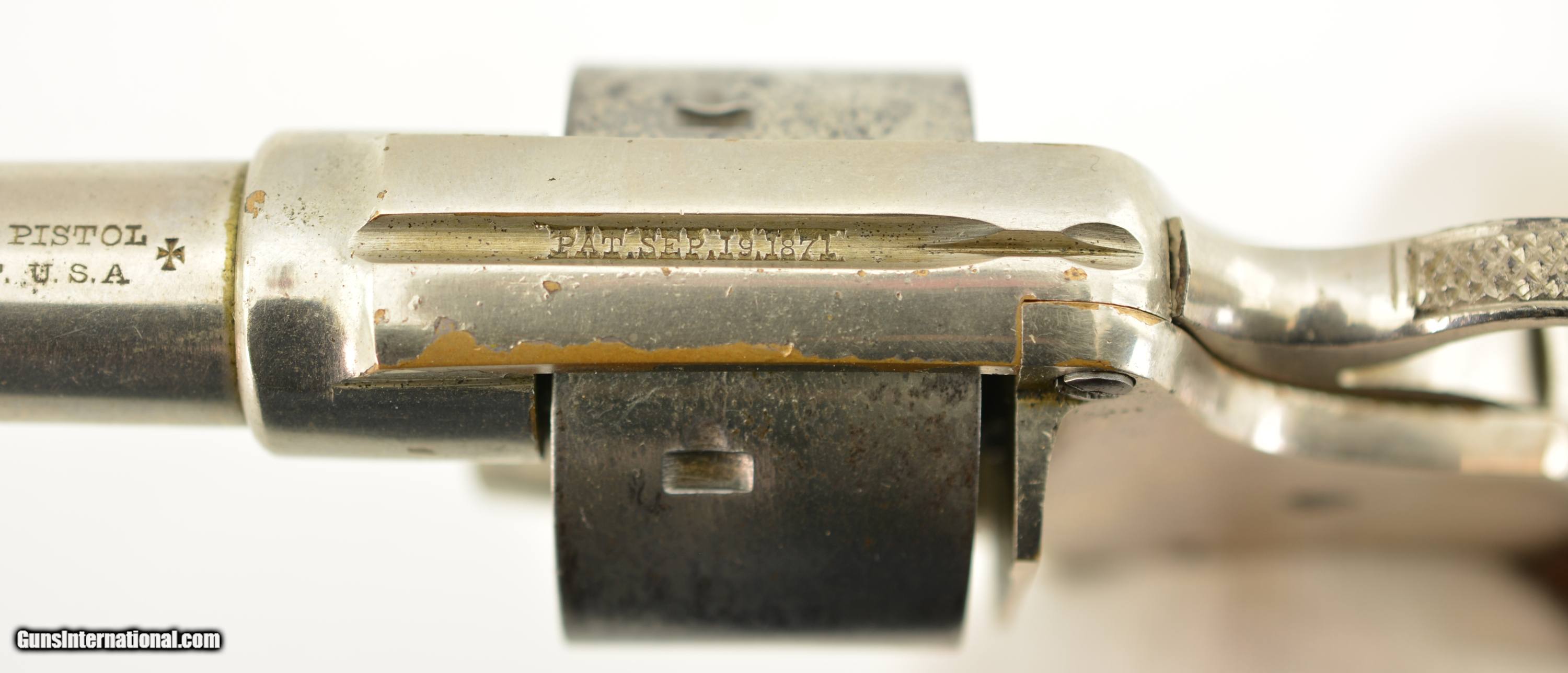 Description: Serial #9325, .41 RF, 2 1/2" barrel with a very good, bright bore that has some spots of dark freckling towards the muzzle. This is the five-shot version of the famous Colt "Cloverleaf" House Revolver, and has matching numbers on the frame and barrel (the cylinder is not numbered). The metal retains 85-90% of the original nickel finish, with some mild bubbling of the nickel along the sides of the frame, as well as some minor flaking to the underlying brass along the high and exposed edges. The cylinder has a mottled gray and plum-brown patina throughout, while the cylinder pin and separate recoil plate have traces of original blue remaining and an overall plum-brown patina. The walnut grips are numbered to the gun on the interior and are in very good-near fine condition, with small handling marks on either side, as well as some moderate wear at the butt on either side. The lock-up is tight, and the action functions flawlessly. Interestingly, the serial number stamped into the butt has a slight error: the last digit ("5") was applied upside down, however the number stamped into the barrel has the digit right-side up. This is a seldom seen five-shot House Model, in very good condition, with a neat factory stamping error, and would make a great addition to any collection. Antique SOLD Antique: Yes Manufacturer: Colt Model: House Model Serial Number: 9325 Caliber Info: .41 RF Gauge Info: .41 RF |