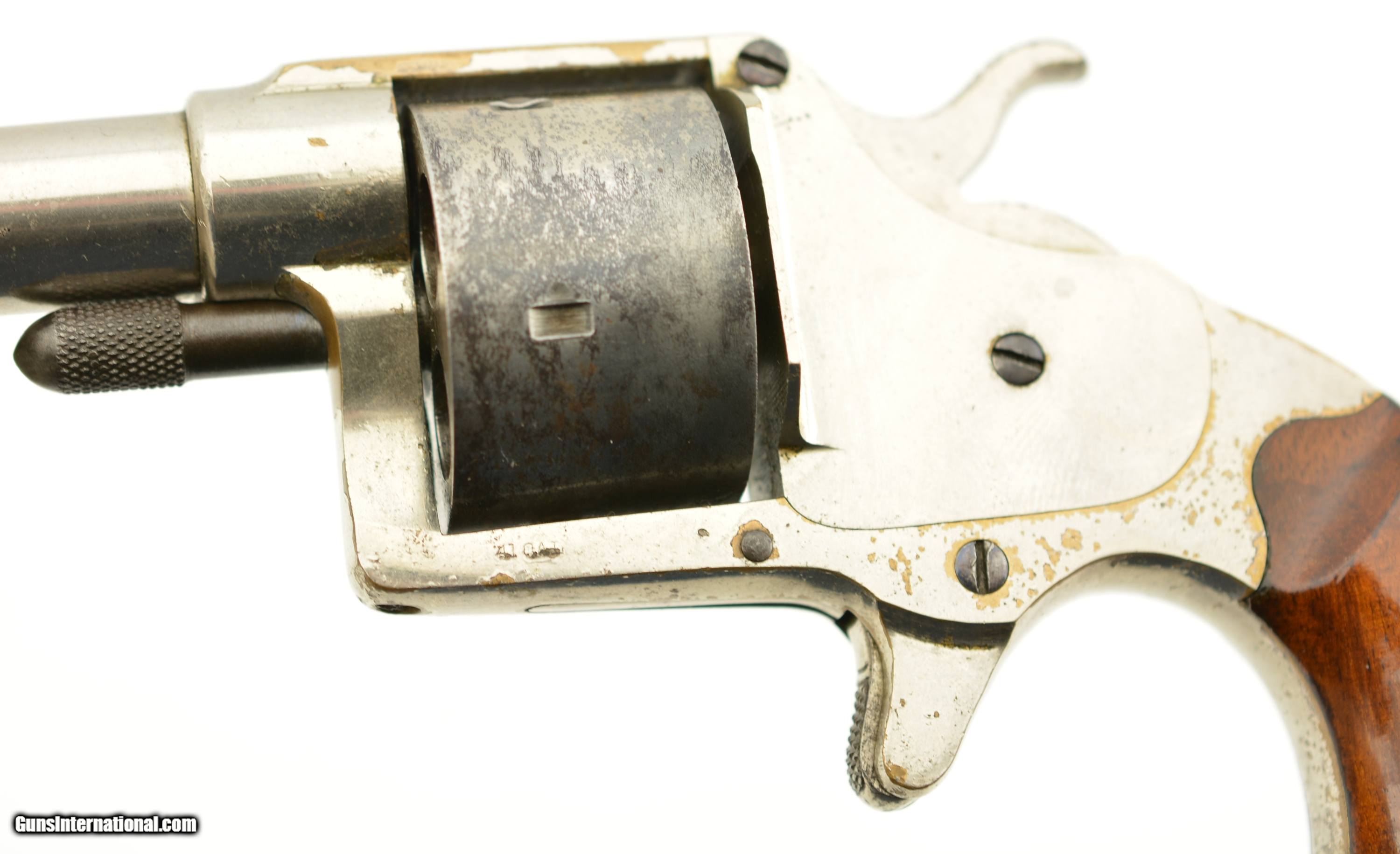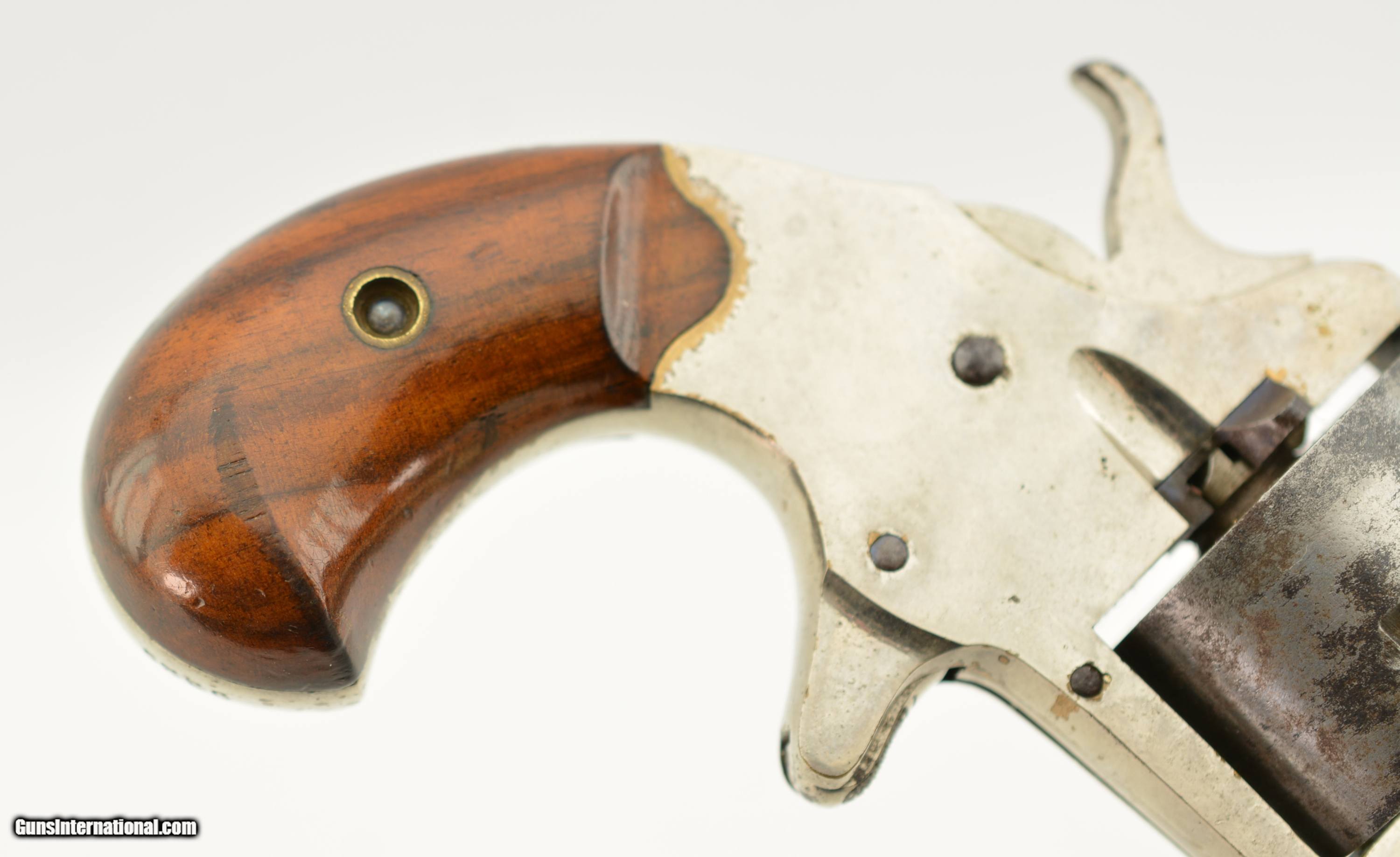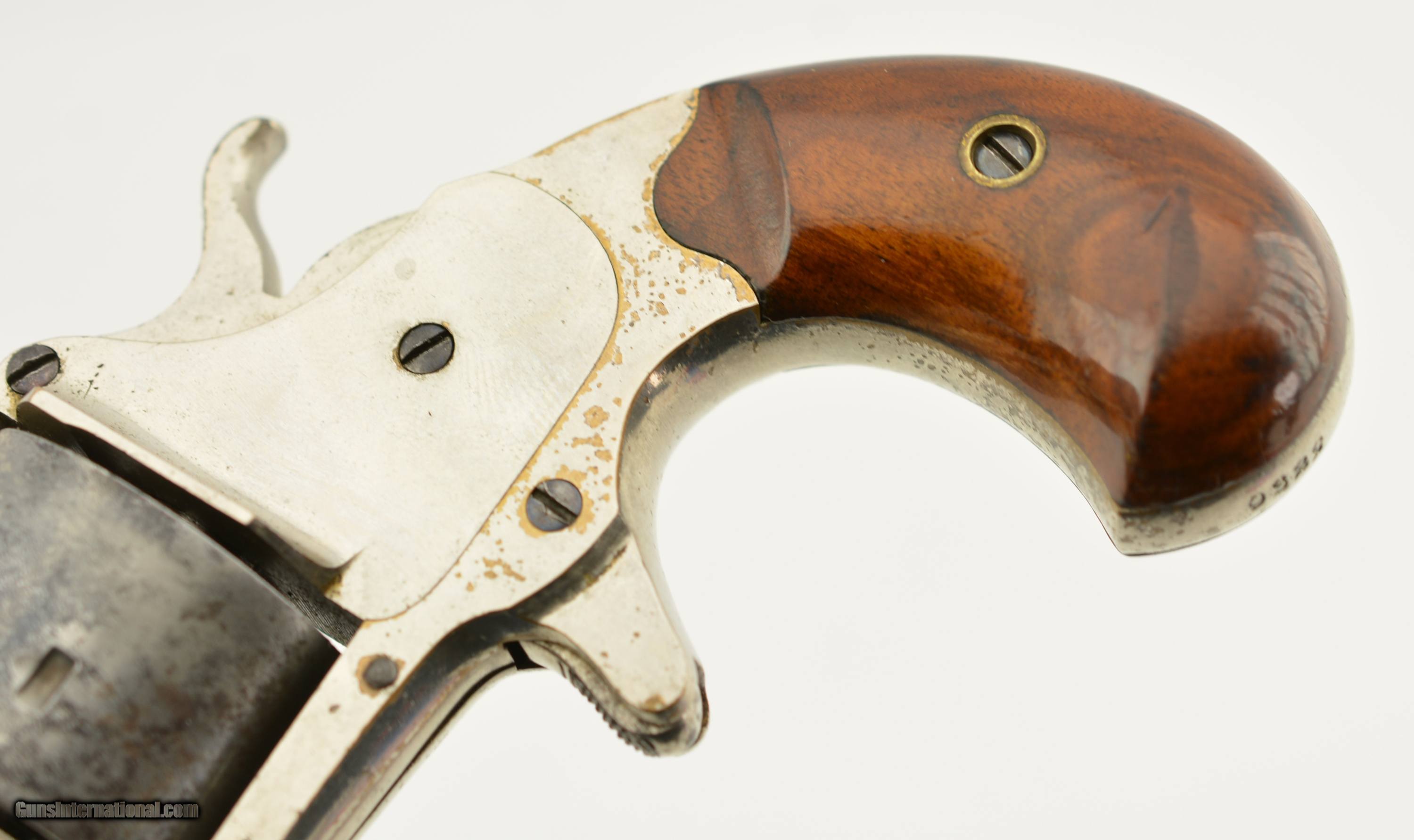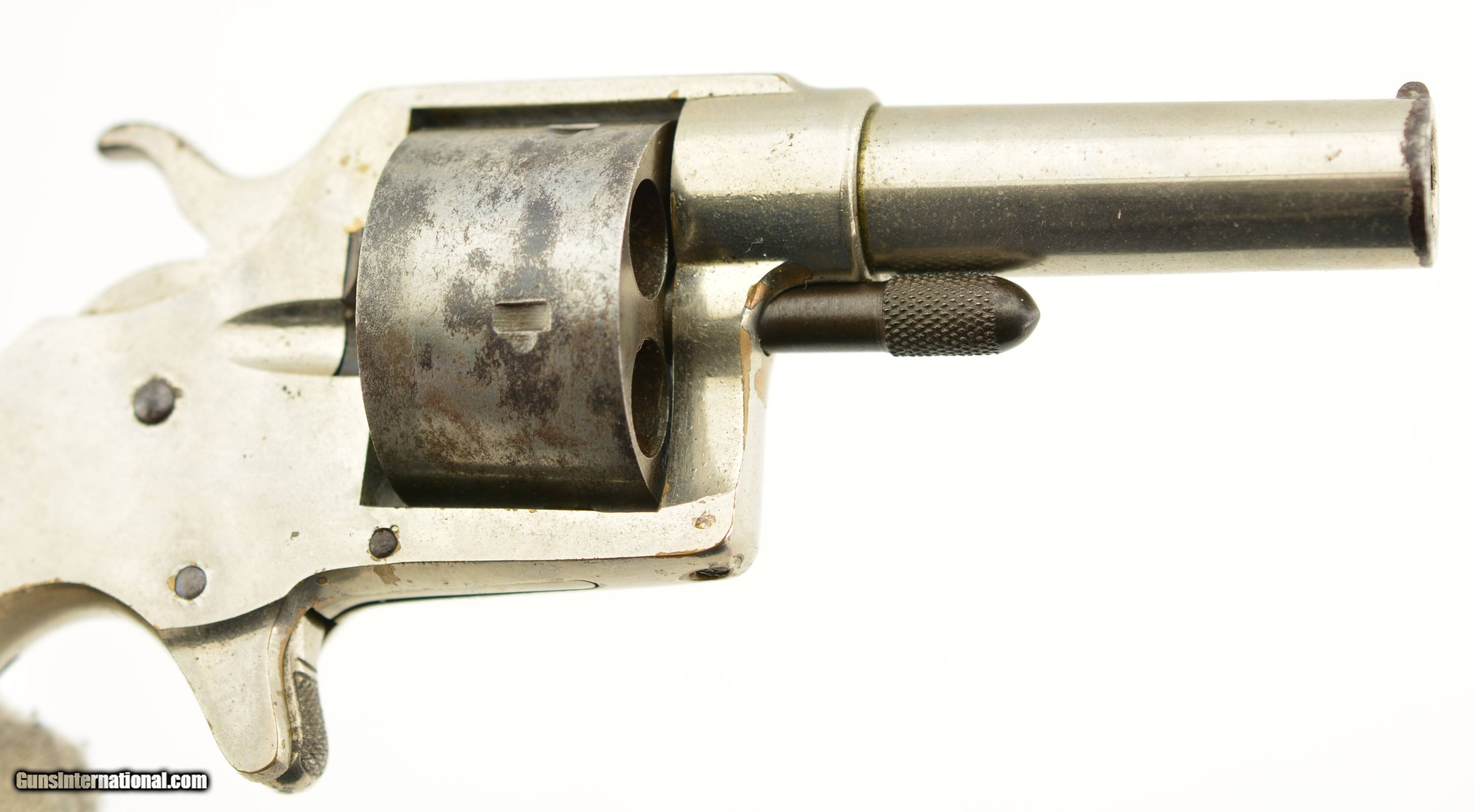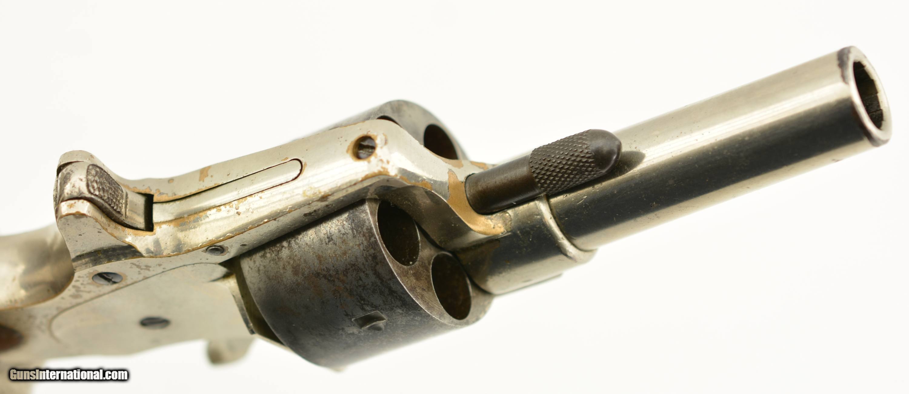 Description: Serial #9325, .41 RF, 2 1/2" barrel with a very good, bright bore that has some spots of dark freckling towards the muzzle. This is the five-shot version of the famous Colt "Cloverleaf" House Revolver, and has matching numbers on the frame and barrel (the cylinder is not numbered). The metal retains 85-90% of the original nickel finish, with some mild bubbling of the nickel along the sides of the frame, as well as some minor flaking to the underlying brass along the high and exposed edges. The cylinder has a mottled gray and plum-brown patina throughout, while the cylinder pin and separate recoil plate have traces of original blue remaining and an overall plum-brown patina. The walnut grips are numbered to the gun on the interior and are in very good-near fine condition, with small handling marks on either side, as well as some moderate wear at the butt on either side. The lock-up is tight, and the action functions flawlessly. Interestingly, the serial number stamped into the butt has a slight error: the last digit ("5") was applied upside down, however the number stamped into the barrel has the digit right-side up. This is a seldom seen five-shot House Model, in very good condition, with a neat factory stamping error, and would make a great addition to any collection. Antique SOLD Antique: Yes Manufacturer: Colt Model: House Model Serial Number: 9325 Caliber Info: .41 RF Gauge Info: .41 RF |