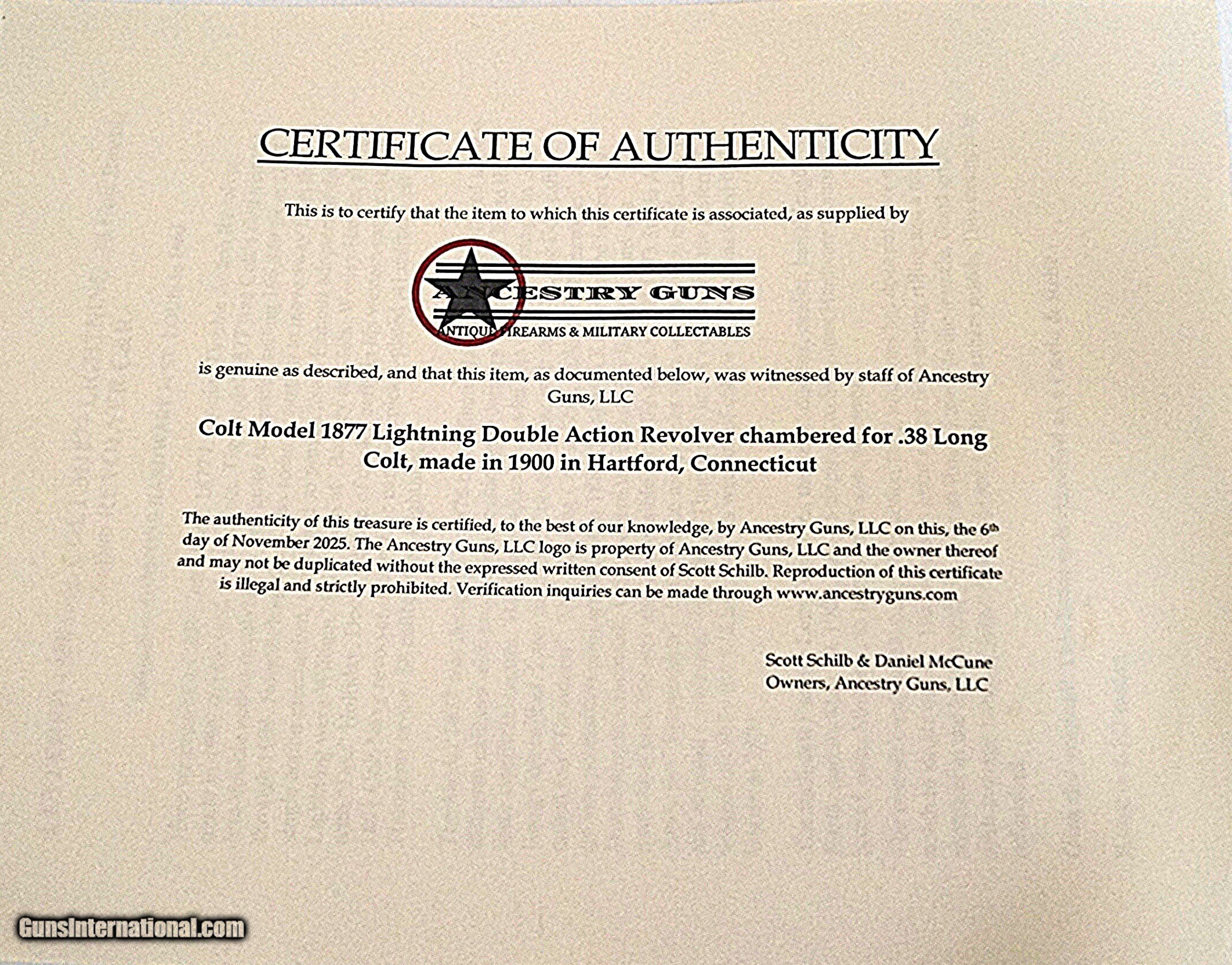 COLT LIGHTNING MODEL 1877 LIGHTNING / ANTIQUE WITH PAPERS