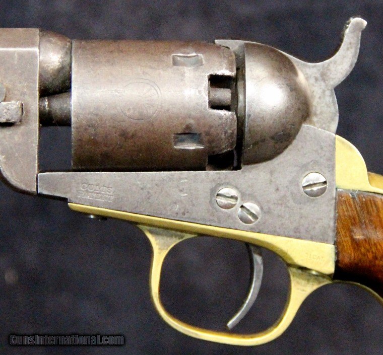 Description: .31 cal, #329668, wedge and loading lever #230, 4 inch barrel, blue and case color finish, one piece walnut grips, brass trigger guard and back strap, 1863. Condition: strong rifling with black powder oxidation, smooth silver gray iron, 10% cylinder scene, dusty gold brass with touches of silver plate, very good grips have been sanded and finish added, very good mechanically, very good marks. SOLD Antique: Yes |