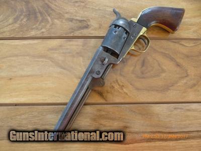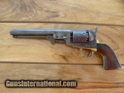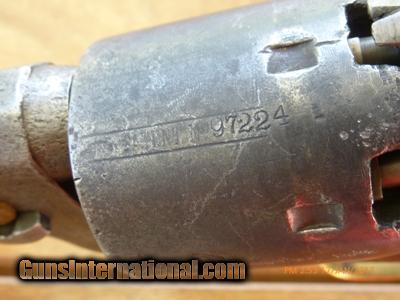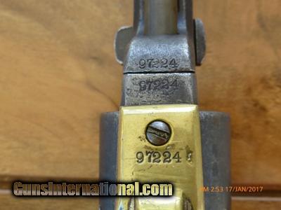 Description: Colt Model 1851 Navy Percussion Revolver 16-85 Manufactured in 1854. Octagonal barrel, stamped on top flat with Colt address with loading lever mounted below, six shot percussion cylinder and steel frame, brass triggerguard and gripstraps, walnut grips. Overall retains a gray pitted patina, most screws are marred, missing wedge screw, entire loading lever assembly is replaced along with wedge, nipples, hammer. Polished brass triggerguard and gripstraps showing heavy edge wear, grips show very heavy wear and are nearly flat on both sides with signs of use. (16-85) $1300.00 I take Visa/MasterCard, add 3%. Allow two weeks for all checks, whether bank, personal or certified to clear. It is also possible to wire funds to my account for instant credit for a $20.00 wire charge. 3 day- no questions asked return period for refund of price paid for gun. (Not including shipping or credit card charges). Call or email with any questions or for more pictures. Guns are antique and should not be fired without examination by gunsmith. $50 shipping for long guns, $30 for hand guns to lower 48 states, about $50-$75 to most European countries and $70-$80 to Australia for antique handguns, carbines $75-$125. We can generally get insurance if you want through shipper but coverage is limited. Notify me if you want it. You can send 20% down- balance in 90 days for installment payment plan. No refunds on installment plans. I have shipped to Norway (long gun w/fragile stock) see feedback, England (Winchester1876, Rem. Dbl. Derr.), Northern Ireland, France, Australia and Sweden. Email if you are not U.S. for estimated shipping costs, payment methods, etc. I am always buying and trading for antique and collectible guns, Indian items, rare ammo, etc. Email what you have got for sale or trade. SOLD Antique: Yes Serial Number: 97224 |