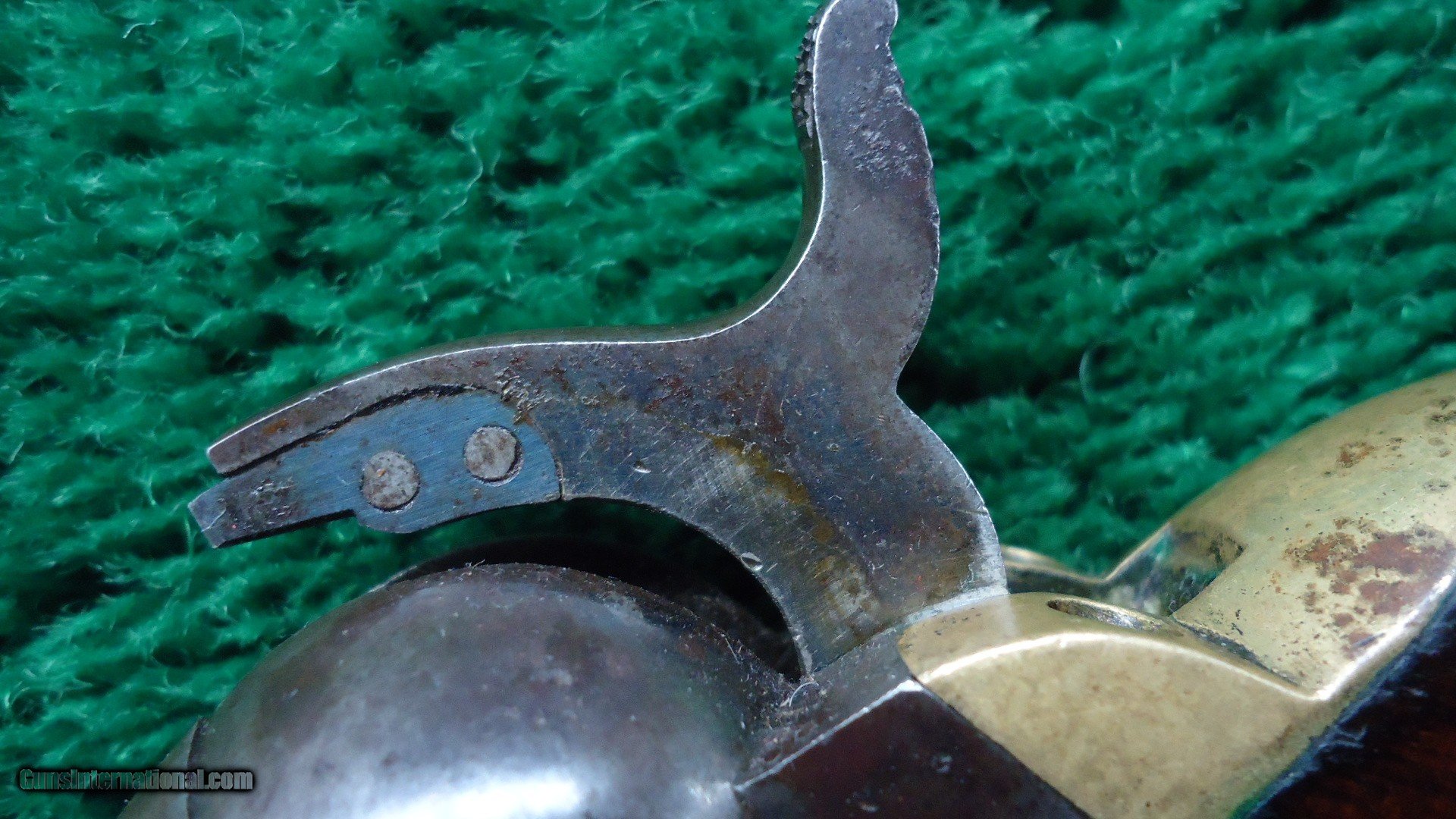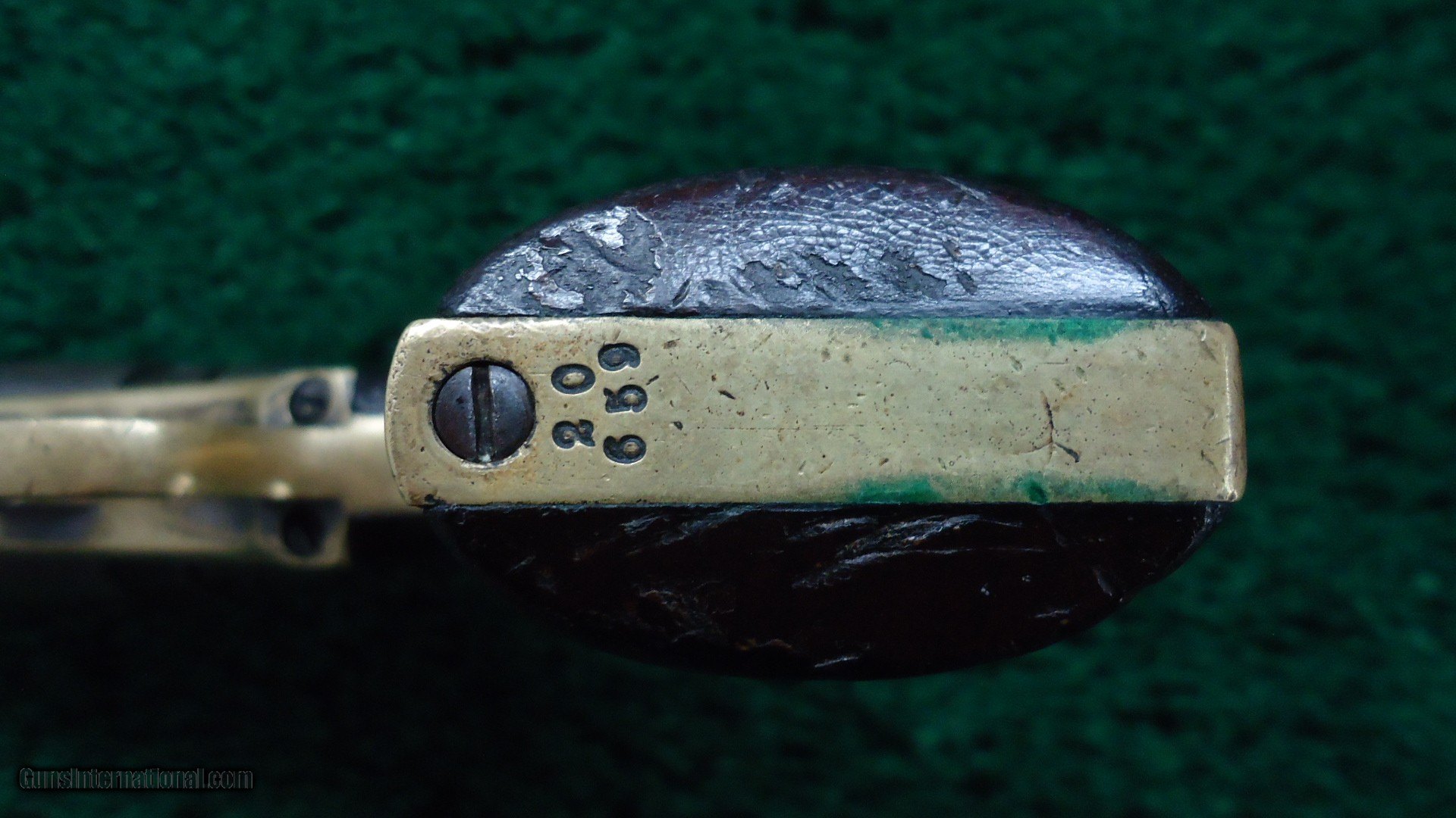 Description: Caliber 38 RF. Original 3 inch octagon barrel. Has very good markings. Retains most all cylinder scene. Complete with all matching numbers in the 20k serial range. Barrel retains 30-40% original blue with some freckling from poor storage. Starting to turn plum. VG traces of case colors on the frame. Original grips show some use but still retain 75% of original varnish. Brass trigger guard and backstrap. Clean little gun that is hard to find in a blued finish. Most of these were nickel. Leroy Merz Antique Firearms specializes in antique and vintage Winchesters and other fine American firearms. Since 1965 Mr. Merz has taken part in the world of firearms and has been a contributor to many well known reference books. We have hundreds of additional guns in every price range at our home online. Search for Merz Antiques in google. SOLD Antique: Yes |