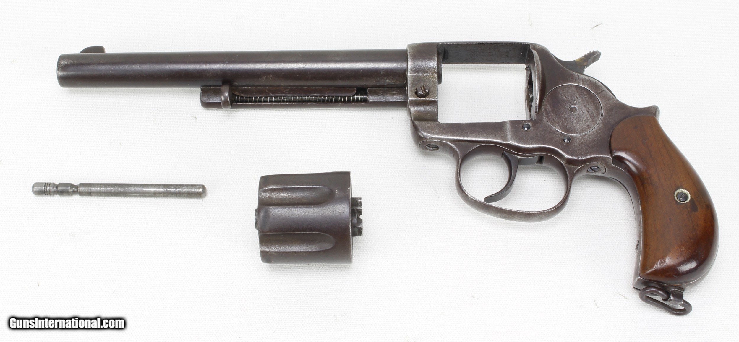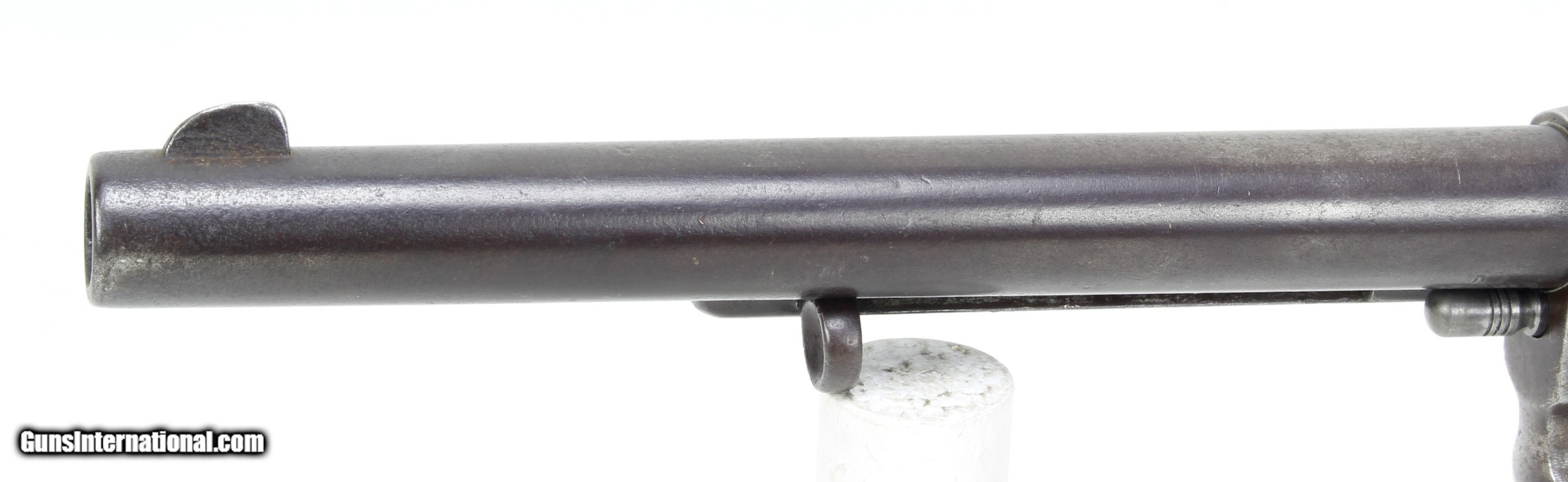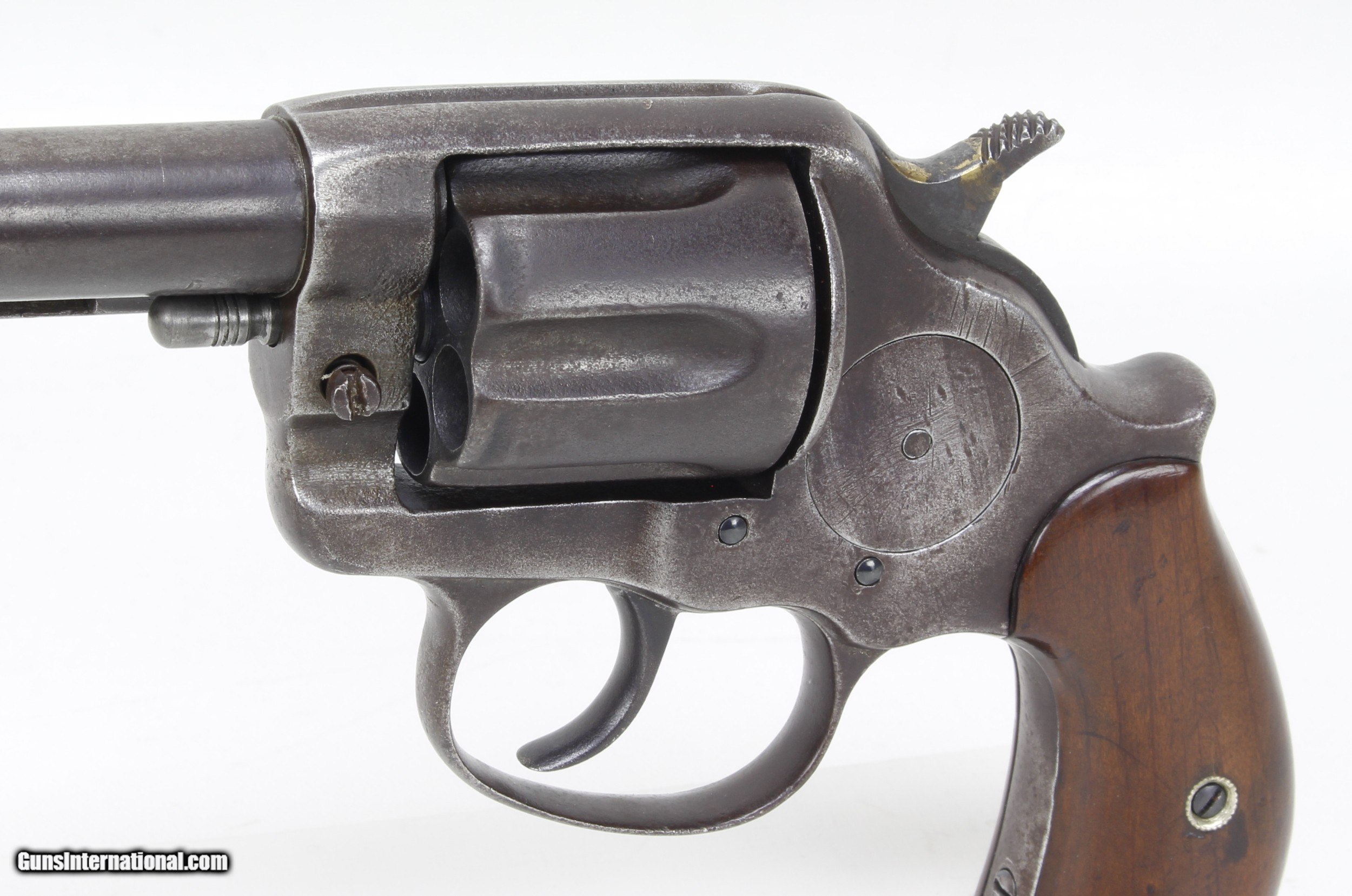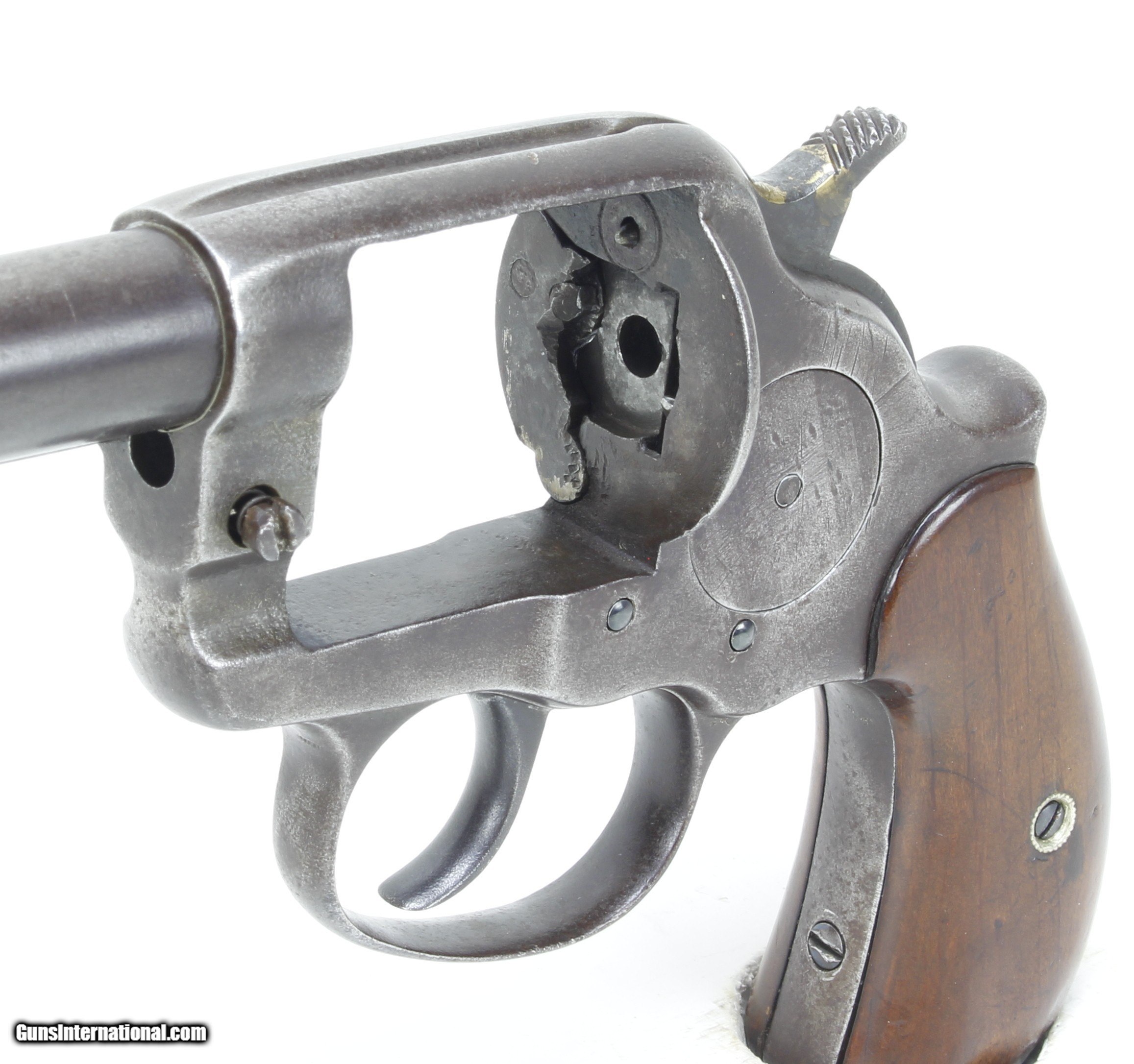 Description: Colt Model 1878 Revolver in .45 Colt. 7 1/2" barrel. Bore is good to very good for age. Slightly frosted, scattered light pitting and clear rifling. The metal finish has turned to a Patina color as not much blue remains. The wood grips are in good condition for their age, showing some handling marks and wear. Gun would require some work and replacement parts to function correctly. Such as another Cylinder Hand and Cylinder Bushing and pin has some wear effecting lock-up. This is an Antique and requires no FFl to purchase. SOLD Antique: Yes Manufacturer: Colt Model: 1878 DA Caliber Info: .45 Colt Bore: Good to VG for age Condition: Good Metal Condition: Good for age Barrels: 7 1/2 |