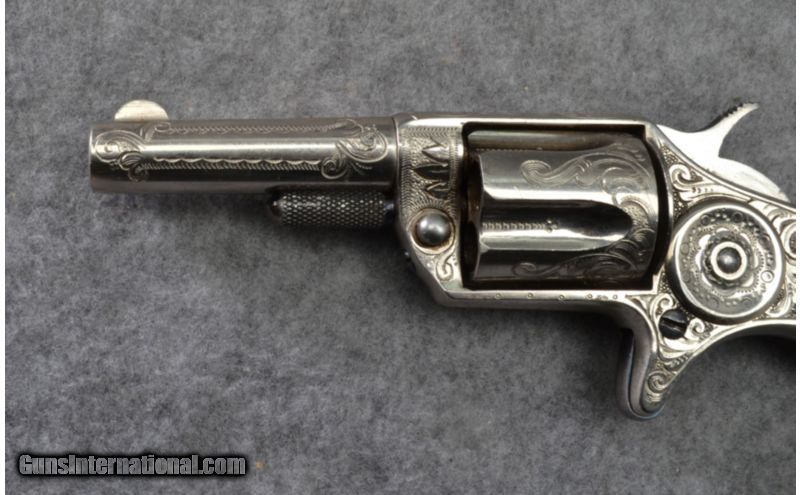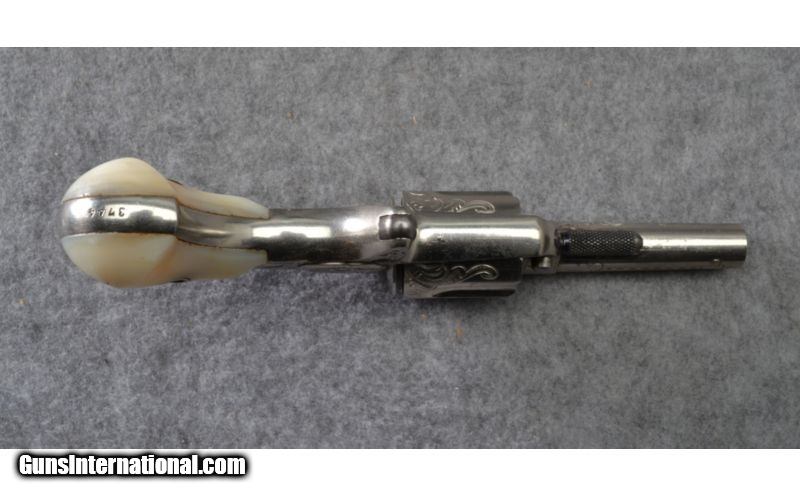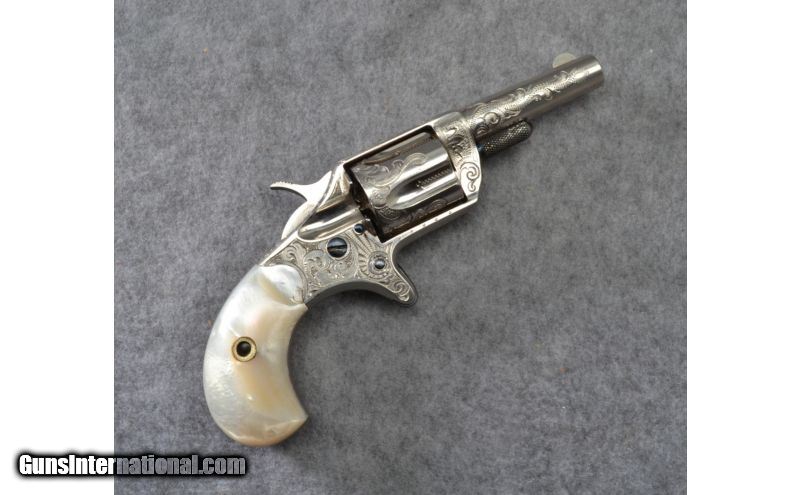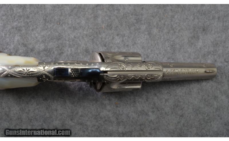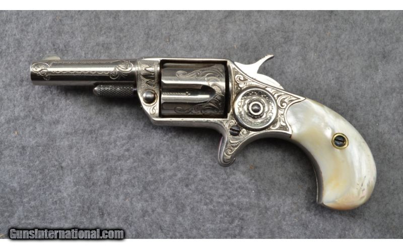 Description: A rare Colt New Line single action pocket revolver in .30 caliber rimfire. This gun features a 2 1/4 inch barrel and five shot revolving cylinder. Manufactured for three years from 1874 to 1876 only 10,946 of the .30RF pocket pistols were produced. The pistol is marked with a acid etched panel on the left side of the barrel: Colts New 30. The barrel sports Colt's address on the top. This particular gun features scroll and punch dot engraving covering the barrel, cylinder flats, top strap, frame and top back strap. The condition is very good, the nickle finish is strong with minor handling marks. The action is excellent. The smooth pearl grips are very good with light handling marks. SOLD Manufacturer: Circa 1875 Caliber Info: .30 RF Chambers: 5 shot revolver. Metal Condition: Very good with light handling marks. Wood Condition: Good grips with light handling marks. Bore Condition: Shiny and bright. Barrels: 2 1/4 inch barrel. Triggers: Single action spur trigger. Stock: Birds head shaped smooth mother of pearl grips. Weight: 8 ozs. Sights: Front post / rear grooved reciever. Item Location: Woodbury, MN |