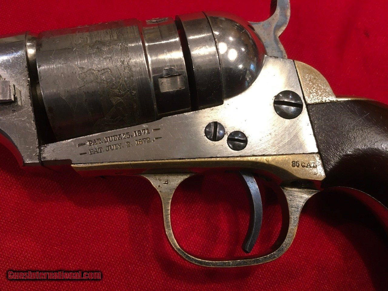 Description: Beautiful example of one of the earliest Colt cartridge revolvers. Described in the book "Variations of COLT'S" by Breslin, Pirie & Price as a Type 5 - New Model Police Breech Loading Pistol with a new 3 1/2" round, solid barrel. While the barrel was made specifically for use as a cartridge gun, the frame on this Colt was converted from percussion. The serial number is 305306 and matches on the barrel, frame, triggerguard and backstrap with the last four digits on the cylinder and last five digits on the arbor. The wedge is not matching and is marked 14101. The serial number is in the upper range of the 1849 Pocket Model frame range and has the new breech loading patent dates stamp over the remnants of "COLTS PATENT" marking. The original .31 CAL has been over stamped with .36 CAL. The factory conversion markings are all clear and sharp. Nearly all of the original nickel plating remains intact. The screws retain the majority of their fire blue finish. The hammer has vivid case colors. The action functions properly and the bore is excellent. The original wood grips fit perfectly and have nearly all of the original varnish. This example would be nearly impossible to improve on. Price includes insurance and shipping in the continental United States where legal. A three day inspection is offered with full refund if returned unfired in the same condition. Buyer to pay return shipping. Please let me know if you have any questions or need additional photos. SOLD Antique: Yes |