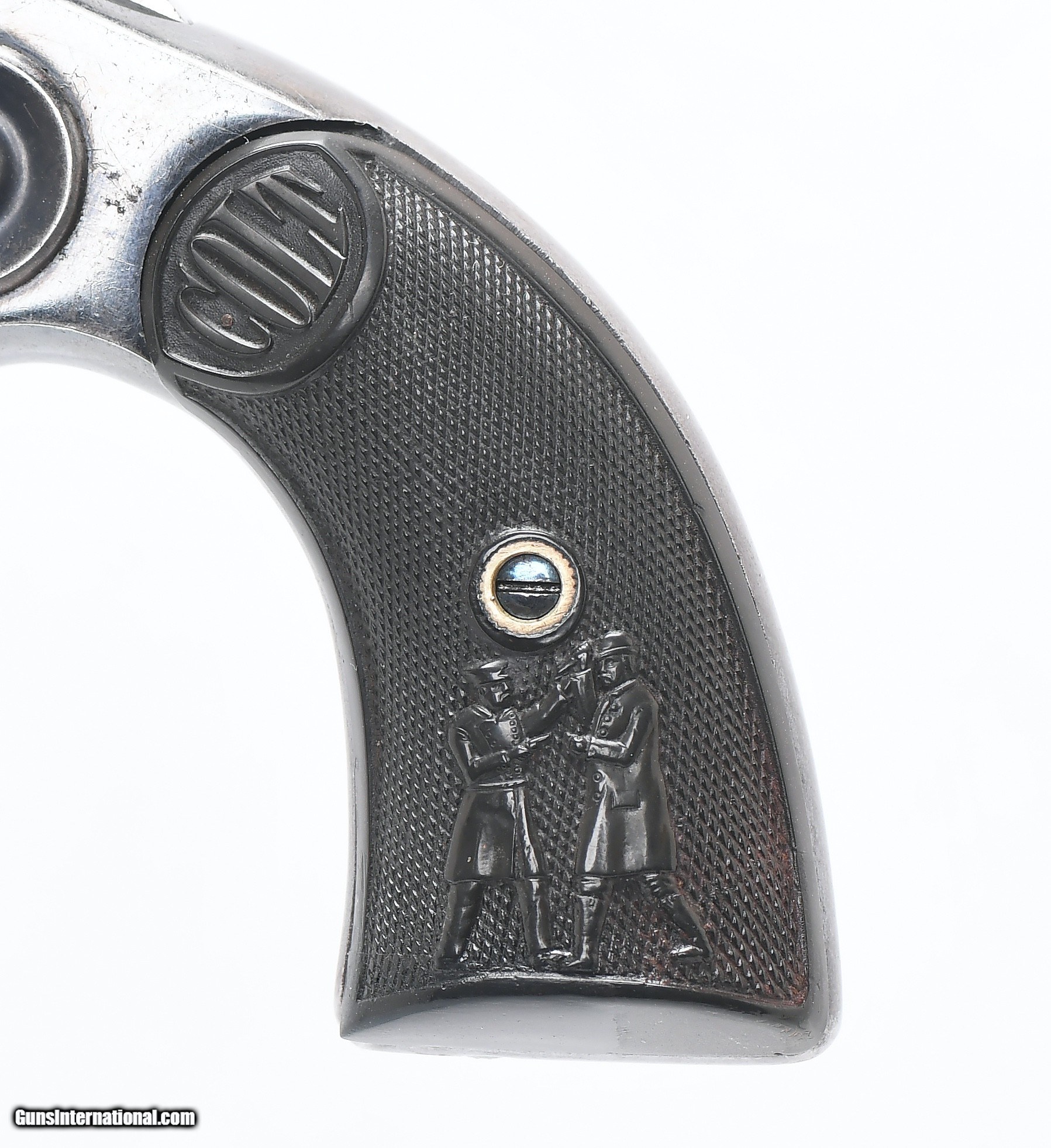 Description: SOLD Colt New Police .38 circa 1884 revolver “Cop & Thug” grips. For a gun that was made 136 years ago this cute little spur trigger revolver is in great condition. NRA Fine cosmetically and NRA excellent mechanically. The bluing on the 4 ½” barrel and on the cylinder is thinning but the frame and ejector rod housing blue is very good. The bore is strong and clean with just a few spots of light pitting visible. Screws are excellent. Either the finish on the bottom of the left grip is rubbed off or there has been a very clean, old repair done to that grip. An extreme closeup photo of that grip is included. All in all this is a very collectable Colt in great condition. SN: 18657 SOLD |