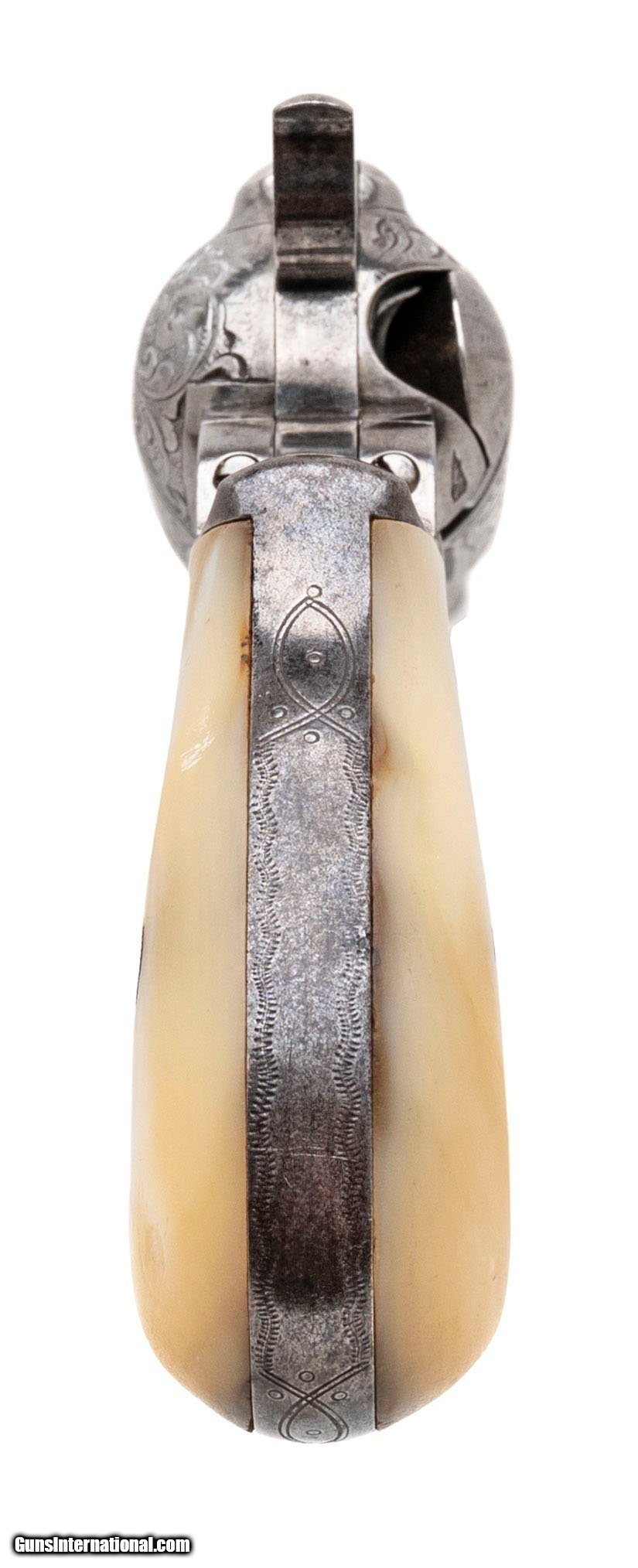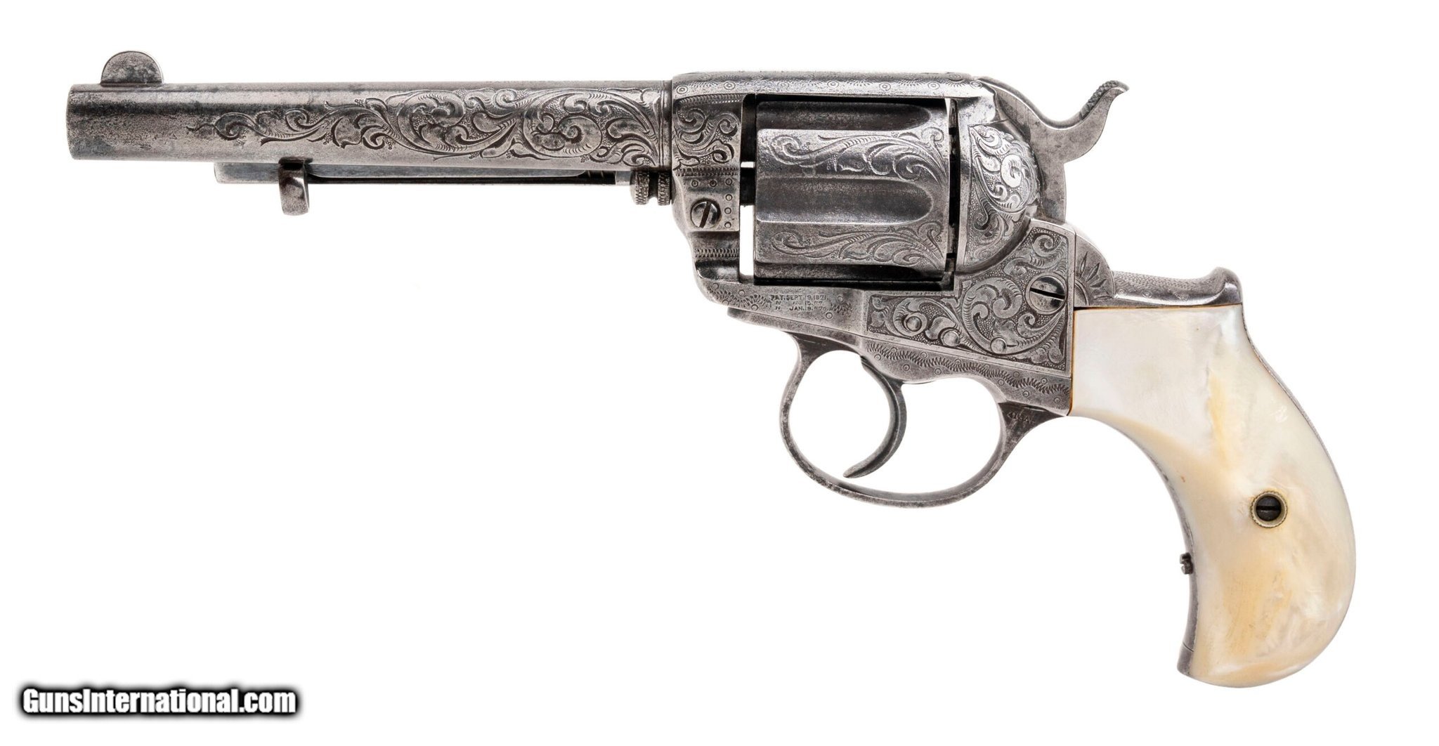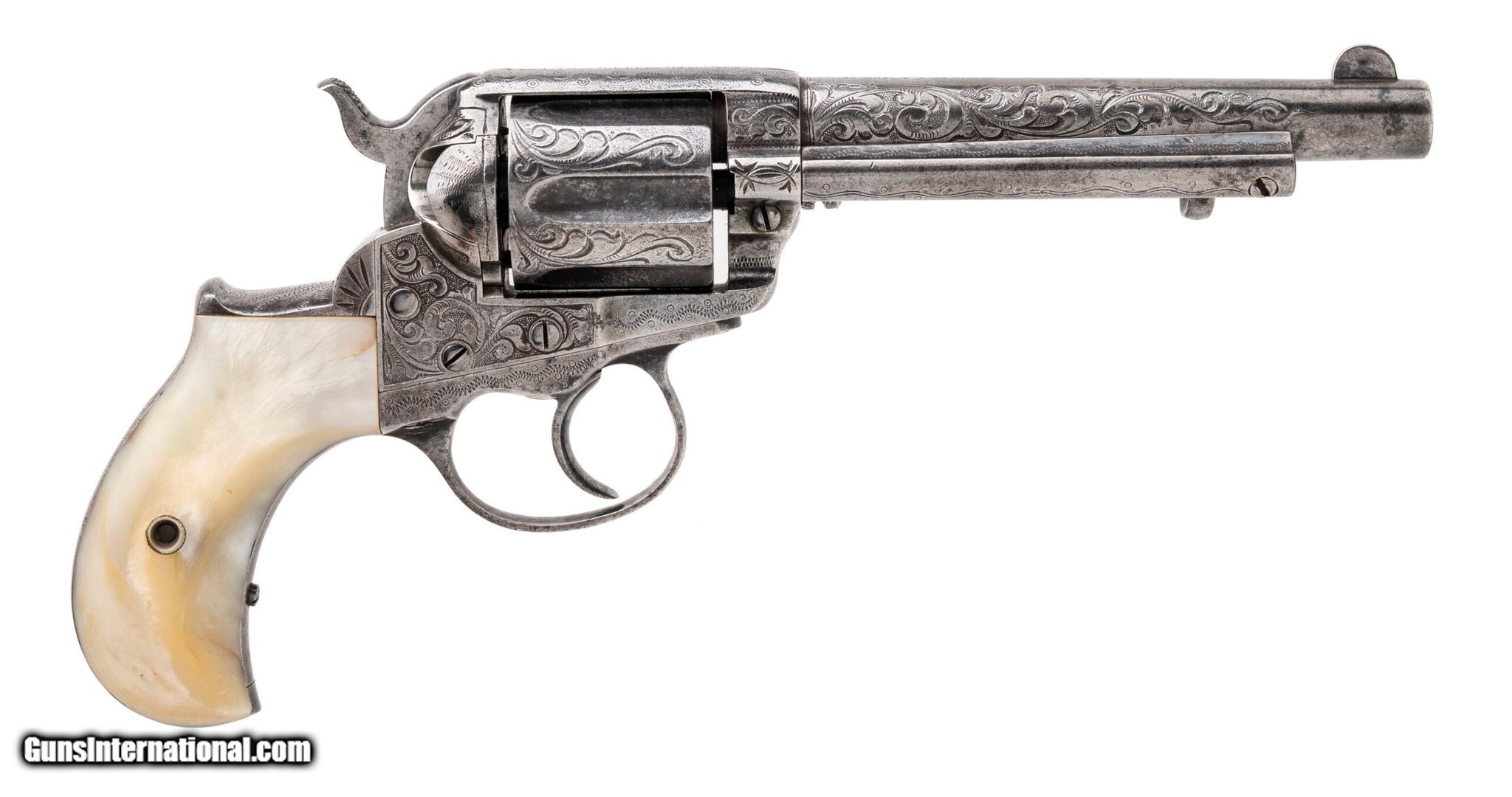 Serial number 63404. Made in 1888. 41 Colt caliber with a 5" barrel. This is a New York engraved Colt 1877 Thunderer. It was sold and shipped to Schoverling Daly & Gales. The engraving looks very similar to Hartley & Graham engraving and very well could have been completed by an engraver who worked for both firms. This gun has a dark gray patina that almost looks to be a silver plated finish. This gun was cleaned at some point long ago and does not have any of the original finish. The grips are thick two piece pearls. Accompanying this gun is a factory letter. This gun came from the Bob Green collection from Mexico City and most likely was found in Mexico. Bob Green as the former president of Tupperware in Mexico from the 1960s –1980s and amassed a gun collection in the thousands mostly of guns found in Mexico. (12315549)