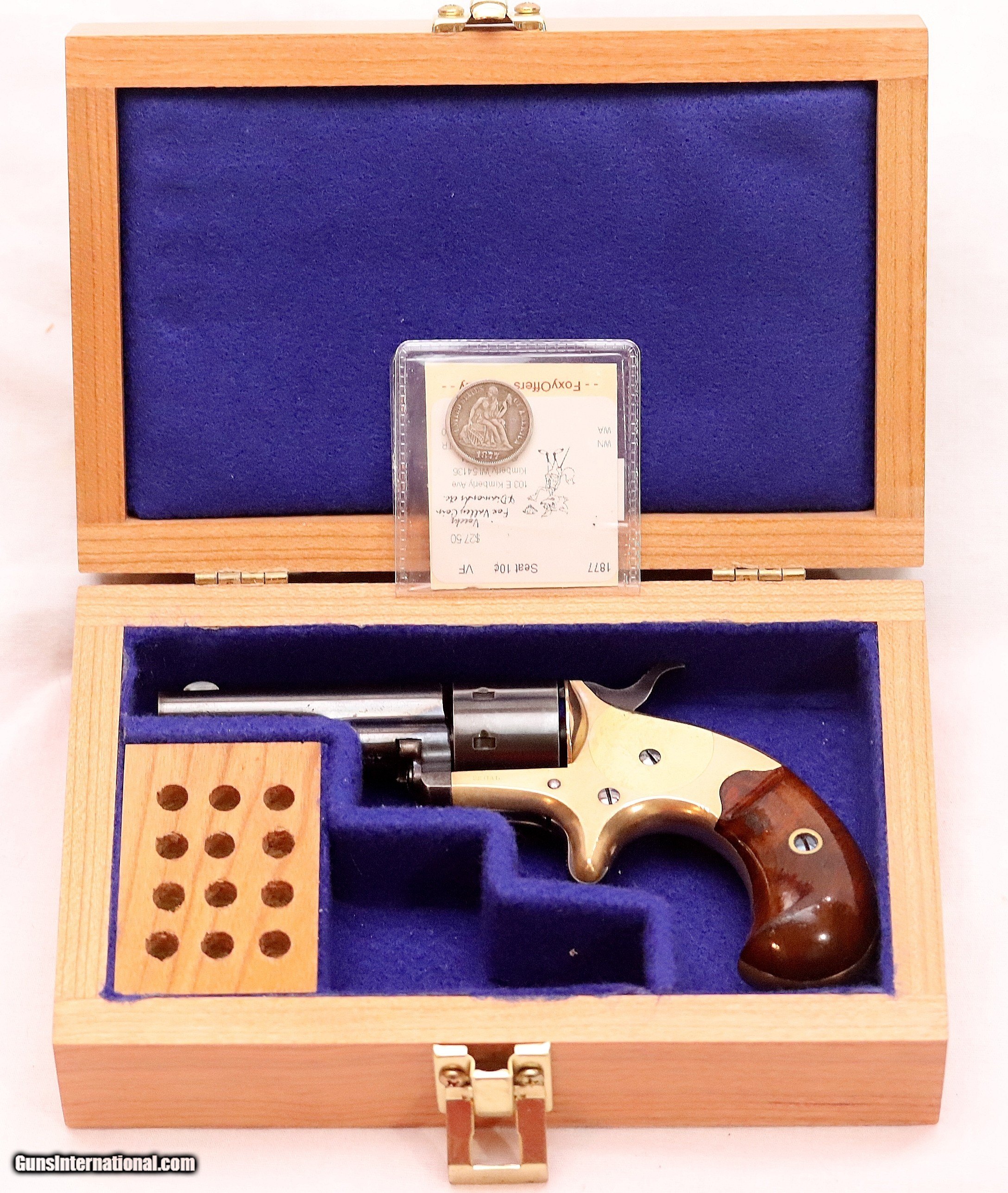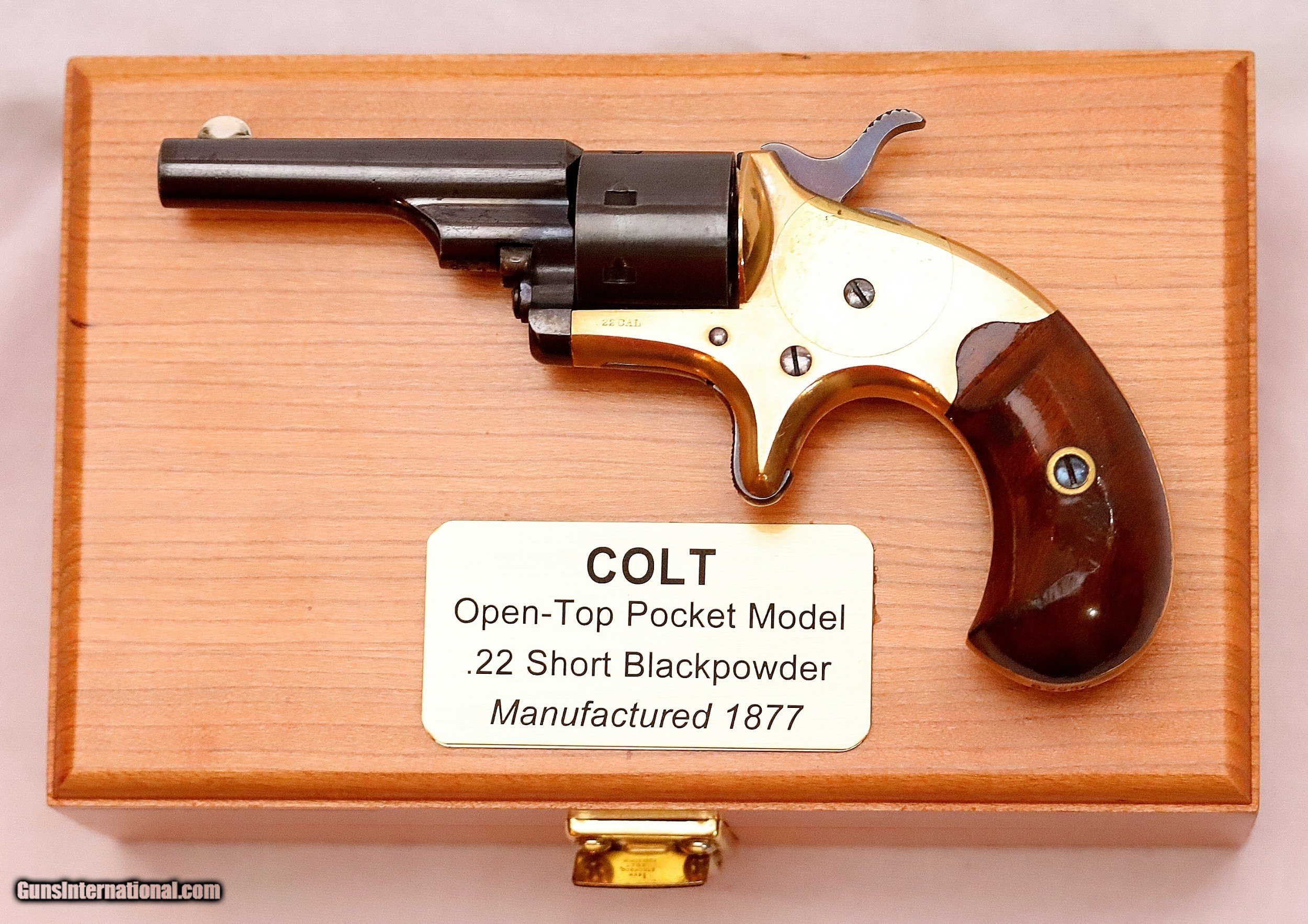 Description: This Colt Open Top Pocket Revolver left the Colt factory, on Sept. 29, 1877. The Colt History letter reports it is .22 Rimfire, blue finish with Varnished grips. It was shipped to J.P. Moores Sons, NY NY. The serial number is 69937, is matching on the barrel and grips. The grips appear to have original finish, as do the barrel and cylinder. The action works as new, and the bore is in bright excellent condition. The teeth on the back side of the cylinder show very little wear. Somehow, this little Colt survived in near new condition for 144 years, remarkable! Close examination shows some slight browning on the barrel. It has a few dings in the brass and the screw holding the pivot wedge is a bit skived. It is presented in a cherry wood case complemented with an 1877 dated Dime, (Value $27.50) a nice presentation touch. Please keep in mind that this was made in an era of low pressure rimfire cartridges. Today’s smokeless rimfire may look like the old blackpowder, but they are much higher pressure and not safe to shoot. This is an investment grade firearm and an outstanding addition to any Colt Collection. Serial number 69937. .22 Cal. with a 2 3/8” barrel. Antique Firearm. Antique firearms, pre 1899 do not require a Federal License. For purchase, a copy of a Government Issued Identification (Drivers License, Etc), showing date of birth and current address will be required. Beaver Creek Arms TERMS & CONDITIONS Objective: As a collector of 35 years and Licensed Firearms Dealer since 1989 I have a clear definition of a satisfactory transaction. I will be paid as we agreed to, and you will be satisfied with your purchase. My goal is to establish a client list of satisfied repeat customers who will recommend me to other collectors. It’s just that simple. Exiled Saudi princes with secret funds needing change from an over paid purchase need not apply. Notice: ALL Federal, State, & Local firearms laws will be followed. I will take NO shortcuts in the process of a legal sale or transfer, so please don’t ask. SHIPPING: Shipments are made via U.S.P.S. Priority Mail, Insured, with a return receipt. Packing, Shipping and Insurance cost for this Antique $40. Checks are to be made out to: Steve Clark Mailed to: 380 Beaver Creek Rd, Dillsburg PA 17019 Availability: All items are in stock and available for immediate shipment. Please call or email and an Item will be held up to a week with your Name, Address, & Phone Number. Items marked Reserved are being held for awaiting payment or on layaway. If you are interested in a reserved item, please call or E-Mail to be placed on a backup list. FIREARMS: Antique firearms, pre 1899 do not require a Federal License. For purchase, a copy of a Government Issued Identification (Drivers License, Etc), showing date of birth and current address will be required. GUARANTEE: Your complete satisfaction is assured, see objective above. If you are not satisfied, please contact me within 3 days of receipt. Please don’t fire the weapon, safety, function and accuracy are NOT Guaranteed. Any weapon offered by Beaver Creek Arms is never test fired nor is there any representation the gun is functional and safe to fire. These guns are sold for collectors and only represented as used firearms that must be checked by a competent person, observe all the necessary safety precautions prior to attempting to load and fire one of these weapons RETURNS: Returns must be made within 3 days of receipt. They must be received in exactly the same condition with no parts exchanged. If it has been altered, damaged, or fired, a refund will not be made. Packing, shipping and insurance cost will not be refunded. All layaway purchases are returnable for merchandise credit only. PAYMENT: Bank check, Personal check, and Money Orders are preferred. Visa and MasterCard are accepted with a 3% processing fee. For Visa and MasterCard orders please provide the account number, code number, expiration date, name on card, phone number and card billing address. This information can be phoned in, or E-Mailed. All orders must be paid in advance, C.O.D. orders are not accepted. Checks, both Bank and Personal must clear before the order will be shipped, usually a 2 week delay. LAYAWAYS: A 20% deposit is required. Balance is due in 60 days. Deposits are non-refundable and are forfeited after 60 days. Layaway sales are returnable for merchandise credit only. SALES TAX: Pennsylvania state sales tax is 6% for in state purchases. The payment of other states sales tax, if applicable, for shipped items is the buyers responsibility. DISCREET: Client information will remain Confidential. Your privacy is protected. SOLD Antique: Yes |
