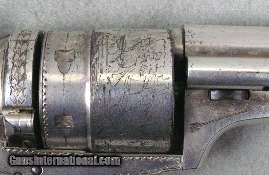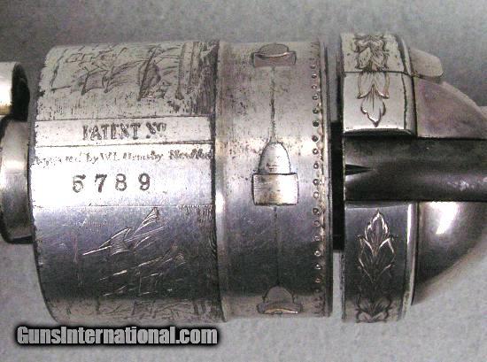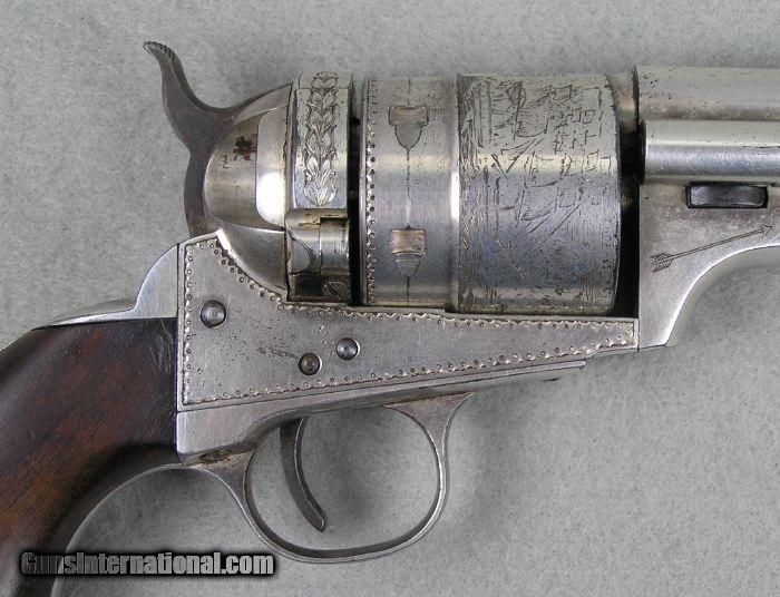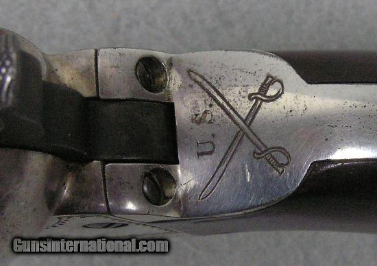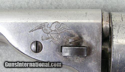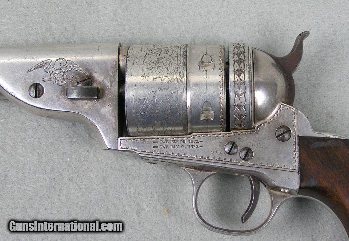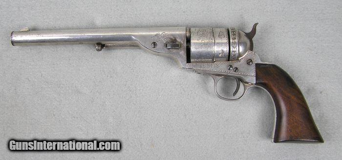 Description: #3457 Colt Richards Mason Engraved Cased 85% Finish This is a very interesting Colt Richards Mason 44 caliber single action revolver. It retains 85% silver plate and is lightly engraved. The mechanical function is excellent plus and the bore is excellent. The serial number is 5789 and is all matching numbers. The cylinder retains 99% cylinder scene. The back strap behind the hammer is engraved with a pair of Army sabers. The recoil shield and loading gate are engraved with a floral pattern. There is an American Eagle with arrows and shield on the left side above the barrel wedge. On the right side is an arrow. The frame has a punch pattern around the frame borders. The bottom of the trigger guard is lightly engraved. It comes in a nice red velvet lined case with a Colt marked screw top lubricant container. I would consider trades for pre 1899 ANTIQUE PISTOLS and rifles on any of my items.. WHAT DO YOU HAVE TO TRADE? Ask about our 30-90 day lay-away program. We accept Bank Check, Money order, Personal checks or wire transfer. SOLD Antique: Yes |