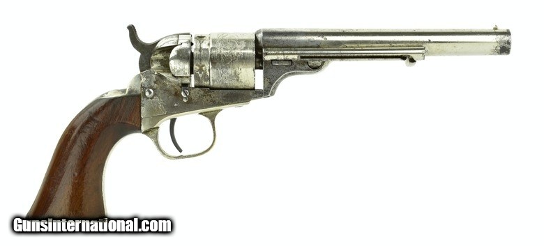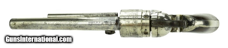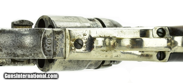 Description: Colt Round Barrel Pocket Navy Conversion. Colt Round Barrel Pocket Navy Conversion with ejector and “S” curve barrel lug. Numbers are matching. Bore is excellent. Action works perfectly. Grips are very good plus with 98% original varnish. Barrel length 5 ½”. The nickel has flaked in places but the revolver has an overall nice nickel appearance. Cylinder scene is excellent.