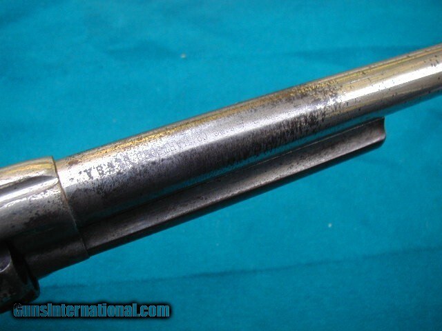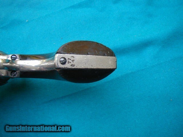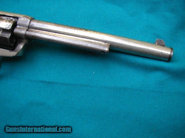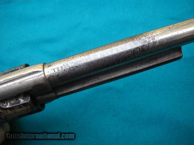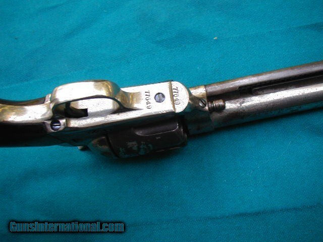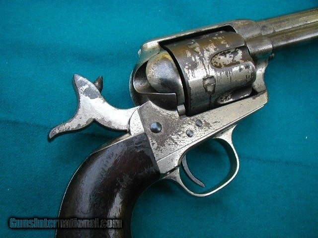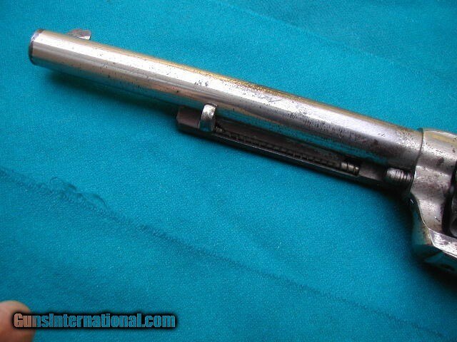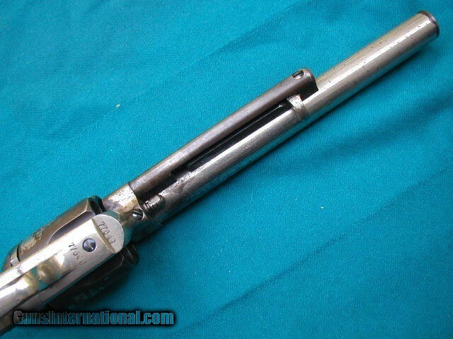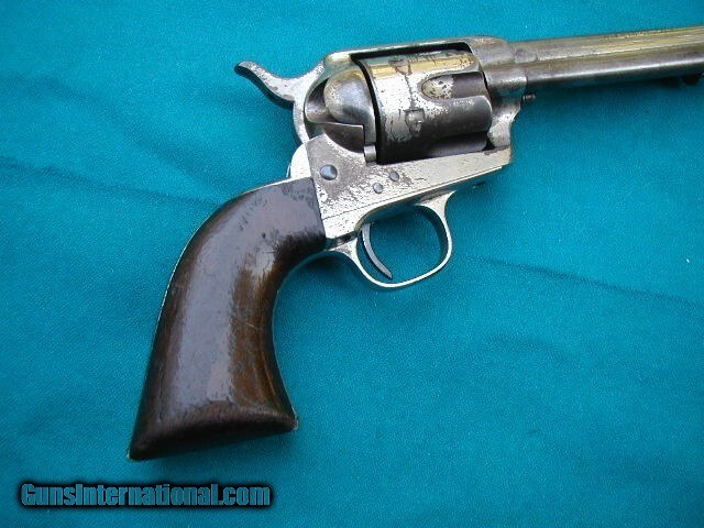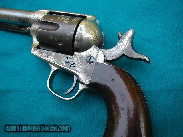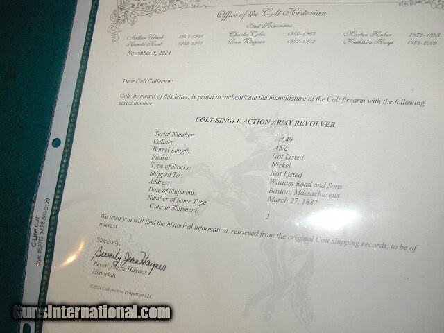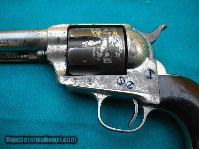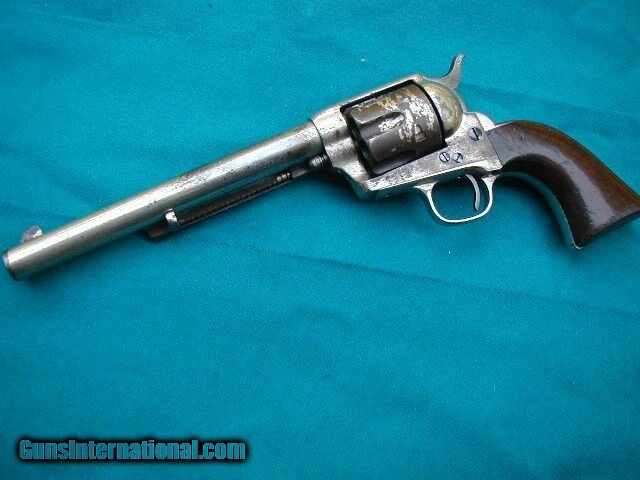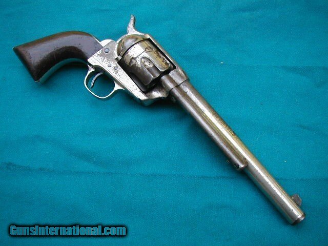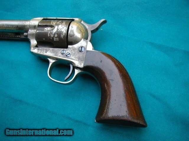 THIS IS A VERY NICE ORIGINAL COLT SAA, MADE IN 1882. IT IS IN IT'S ORIGINAL NICKEL FINISH, .45 CAL, AND COMES WITH A FACTORY LETTER. THE BORE IS EXCELLENT AND THE ACTION IS TIGHT AND WORKS PERFECTLY ON ALL FOUR CLICKS. NICE ORIGINAL GRIPS WITH MUCH OF THE FACTORY VARNISH REMAINING. THE BARREL RETIANS APPROX. 80% ORIGINAL NICKEL, THE TRIGGER GUARD / GRIP STRAP 95%, THE CYLINDER AND BACK STRAP ABOUT 40%. SCREWS AND TRIGGER HAVE A FAIR AMOUNT OF FIRE BLUE LEFT ON THEM. ALL MARKINGS ARE CRISP AND LEGIBLE, A BIT LIGHT ON THE BARREL ADDRESS BUT WELL VISIBLE. A VERY ATTRACTIVE UN FOOLED WITH OLD ANTIQUE COLT.