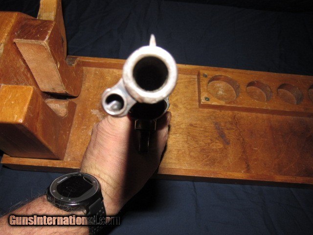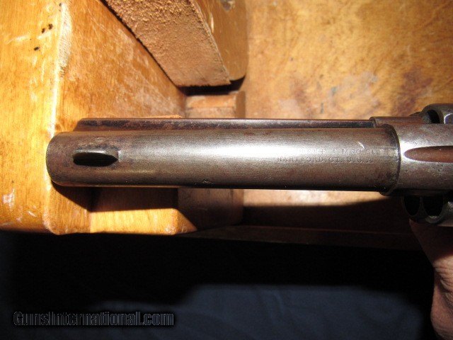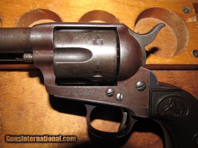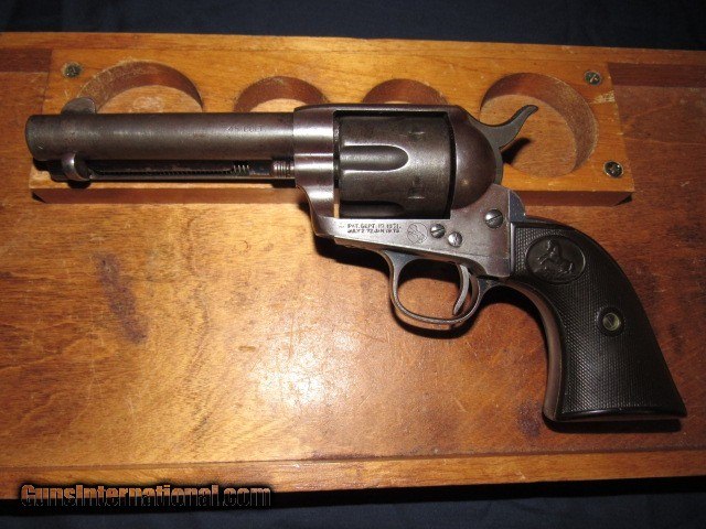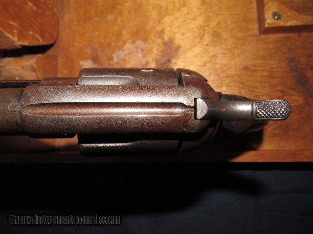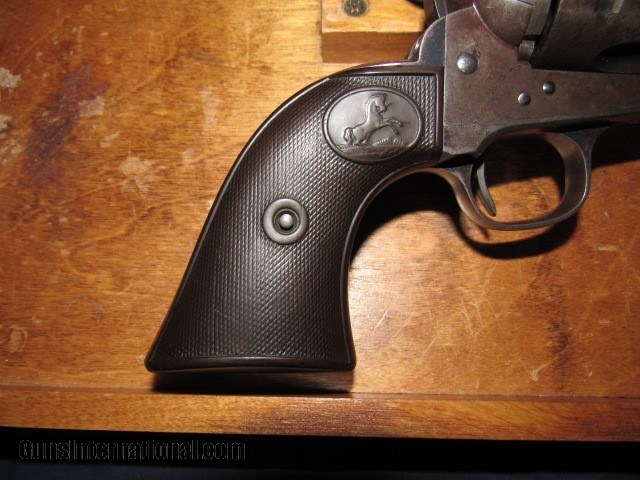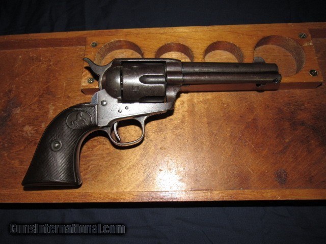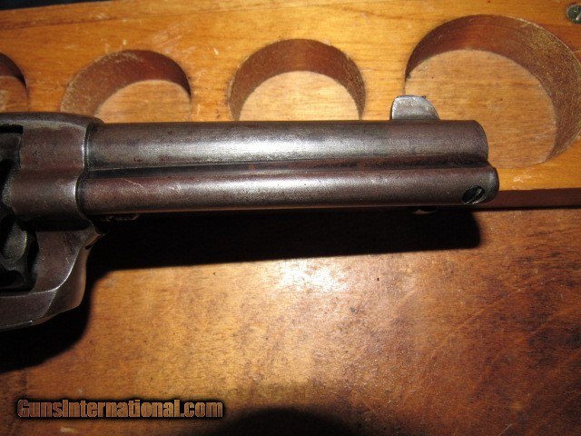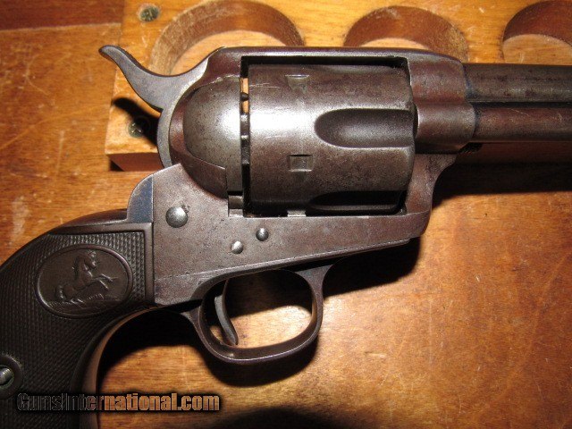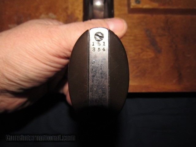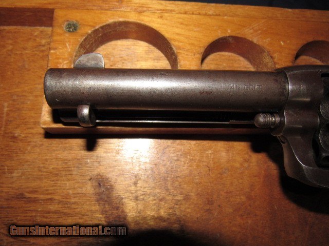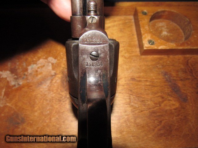Description: ********* SALE PENDING JIM Y. ********* Selling on consignment for a long-time customer who is open to reasonable offers. This Colt SAA is all matching, serial number 151354, made 1893, caliber 45 Colt, 4 3/4" barrel, hard rubber checkered grips with only the Rampant Colt, no Eagles, correct for this period of issue, half moon ejector head, blued and case hardened finish, assembly number 761 on loading gate. Basically an even patina finish with some deep original blue in the protected areas of the frame, by the trigger guard and on the ejector housing, with hints of smoky case colors on the frame. Correct two-line patents and Rampant Colt on the left side of the frame. Correct two-line address on top of barrel reads "COLTS F.A. MFG. Co. HARTFORD. CT. U.S.A" with dashes before and after. Strong action with all four very positive clicks, locks up tight as a drum and indexes perfectly, no front-to-rear cylinder drift. Left side of barrel marked "45 COLT" and there is an "O" or "0" in the upper frame groove visible when the hammer is cocked. Screw heads are excellent with no wear or damage. Bore retains sharp rifling with some very light black powder fouling that may clean out, no deep pits, no rings, no bulges, no craters, should spin a bullet just fine. Note the Colt Archives were contacted but no record for this serial number remains. Overall grades NRA Antique Very Good and will make a nice addition to your Colt collection. No international sales. No sales to Alaska and Hawaii. I am registered with the California DOJ so CA buyers are welcome. Considered antique so no FFL required, can ship directly to you assuming your local laws allow it, just need copy of driver's license as proof of age (NO SALES TO NEW YORK STATE BUYERS OR ANYWHERE ELSE THIS TYPE OF FIREARM IS RESTRICTED BY LOCAL LAW). Payment by personal check, bank check or postal money order (sorry no credit cards). 3-day, non-firing inspection. Buyer pays return shipping. Should be checked by a qualified gunsmith before firing! Packed with care and shipped USPS Priority Mail with tracking for a flat $25 fee. SOLD Antique: Yes Handgun Caliber: .45 Colt Manufacturer: Colt Model: SAA Serial Number: 151354 Barrel Length: 4 3/4 Condition: Very good Metal Condition: Very good Bore Condition: Very Good Action: Single Action Revolver Triggers: Standard/plain Stock: Hard Rubber Manufacture Date: 1893 |