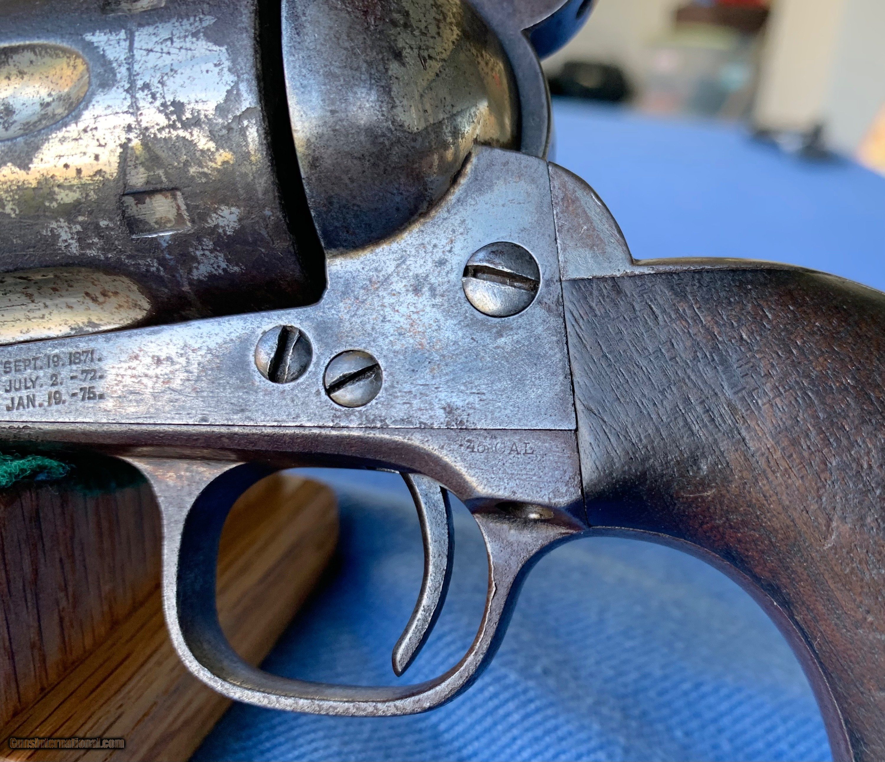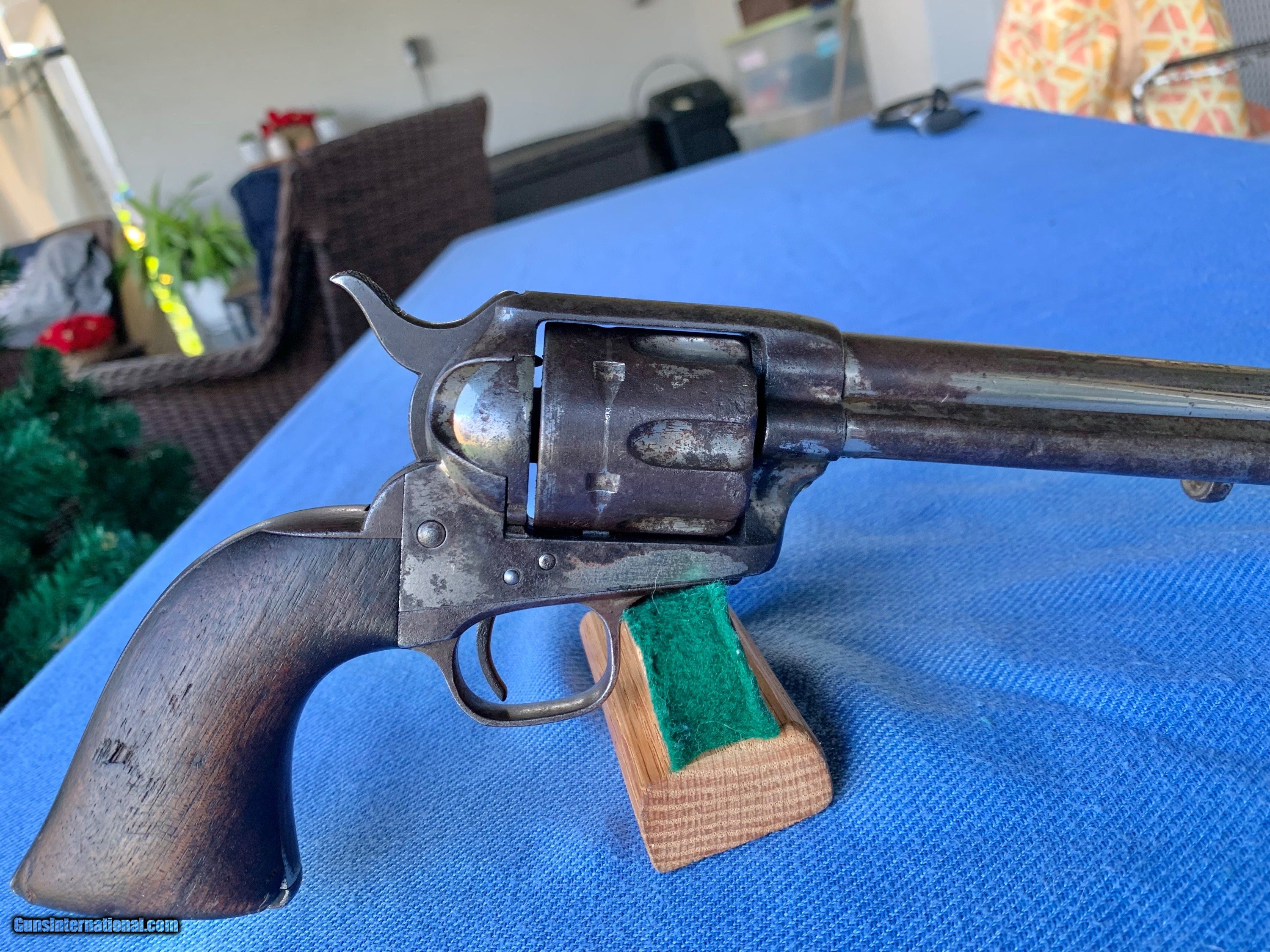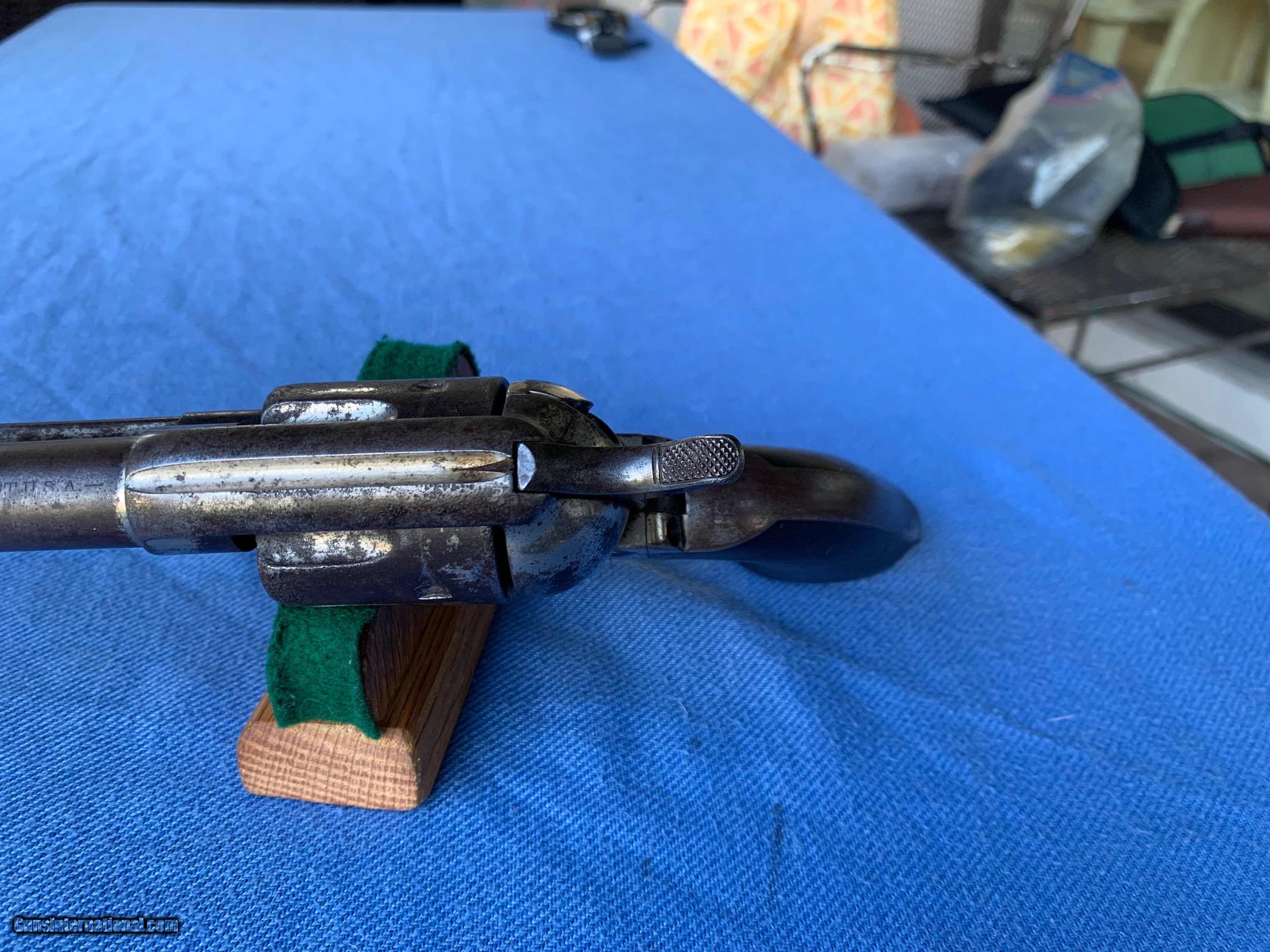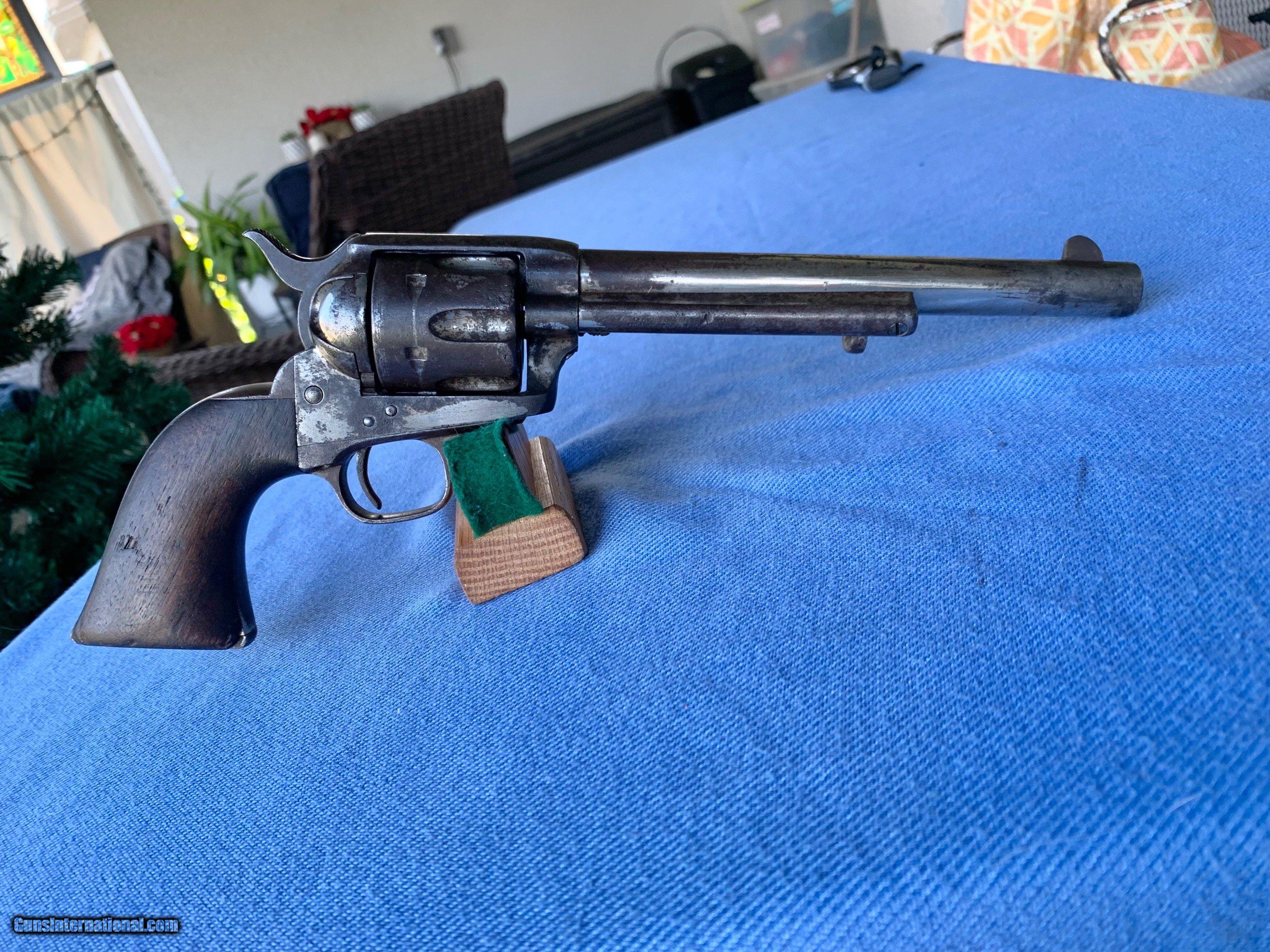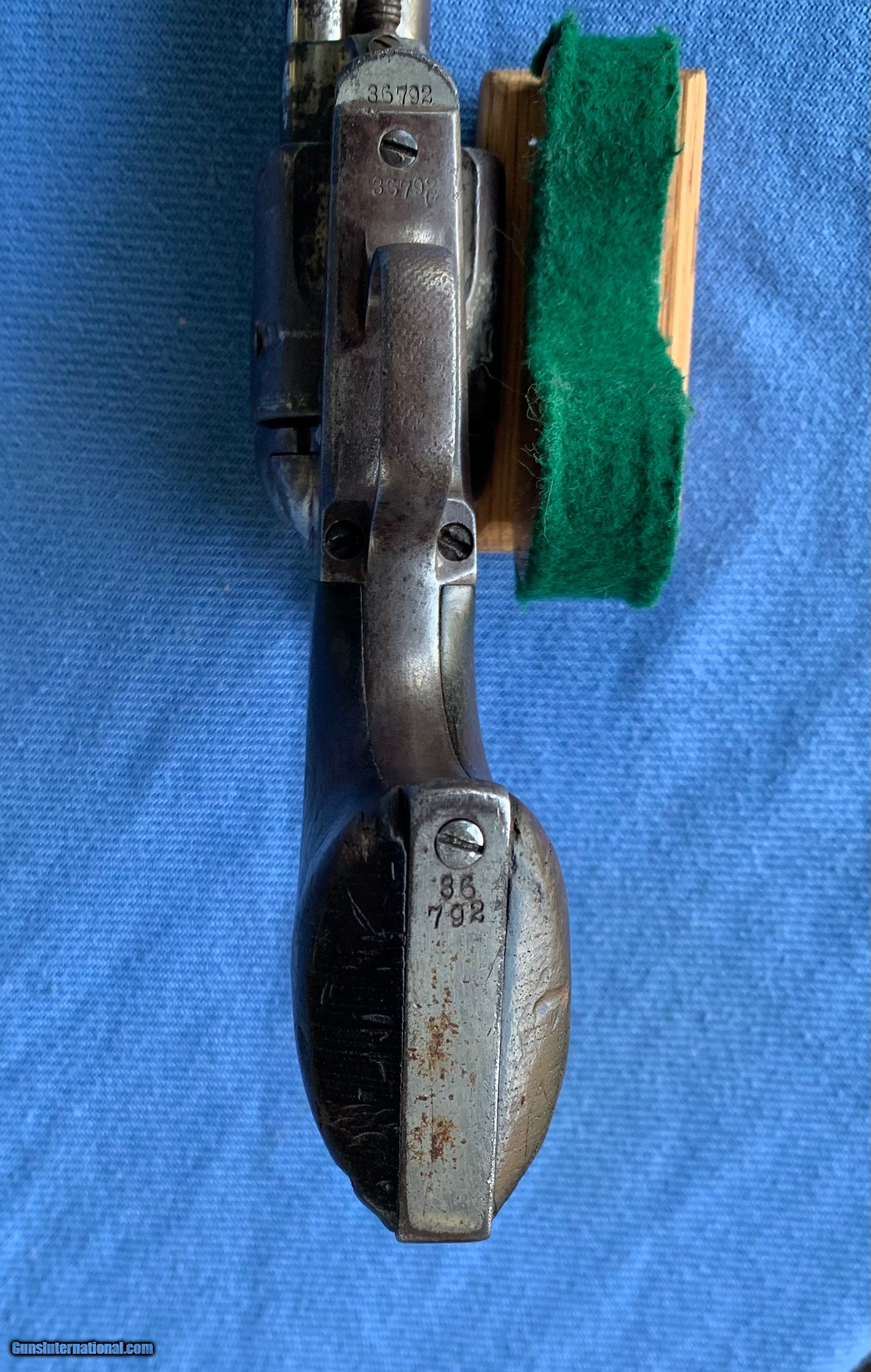 Description: Here's a Excellent Example of a Colt SAA U.S. Calvary gun that was Sold to the American Public after the war ! See Kopecs Book for reference ! Serial number 86,792 . 7 1/2" barrel . 45 caliber. Colt Factory Nickel . Original wood grips ! This Gun was issued to and used by the U.S. Cavalry during the Indian Wars ! After the war the government sent them back to Colt and Colt refurbished them with nickel finish and sold them to the public ! Gun went through the late 1800's . When America was growing into a Civilized World ! Cool Cowboy Gun ! Gun has some of the nickel finish still remaining .markings are sharp .,wood grips are worn ! Bore and mechanics are very good ! Gun locks up tight ! Gun has all the proper clicks . Excellent working condition! Above average Colt SAA That's seen some American History in its day ! Please review my photos and please email me with any questions ? 3 day inspection as allways! Thank you for looking, Little Jo SOLD Antique: Yes Handgun Caliber: .45 Colt Manufacturer: Colt Model: SAA Serial Number: 86,792 Condition: Very good |