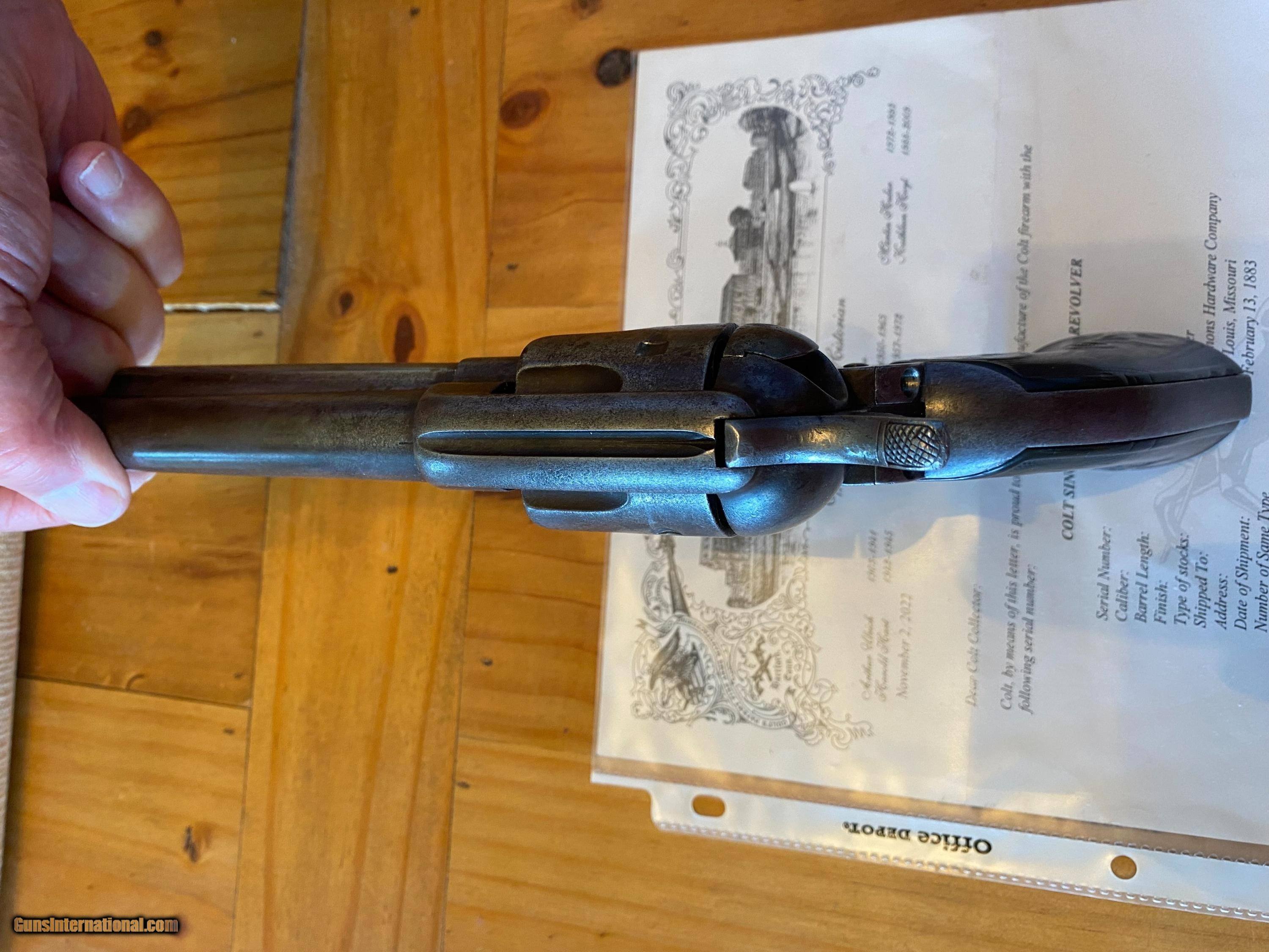 Description: Rare colt frontier six shooter. Shipped 1883 Serial number on barrel, cylinder,frame, trigger guard, and buttstrap. Good 2 piece eagle gripps with normal wear. 4 clicks and tight lock up. Typical black powder bore. Gray patina with pretty good panel. Rare as they only made 2095 black powder 51/2's as to 20154 71/2's. Colt letter with gun. Call Ernie with any questions. 806 290 1532 SOLD Antique: Yes |