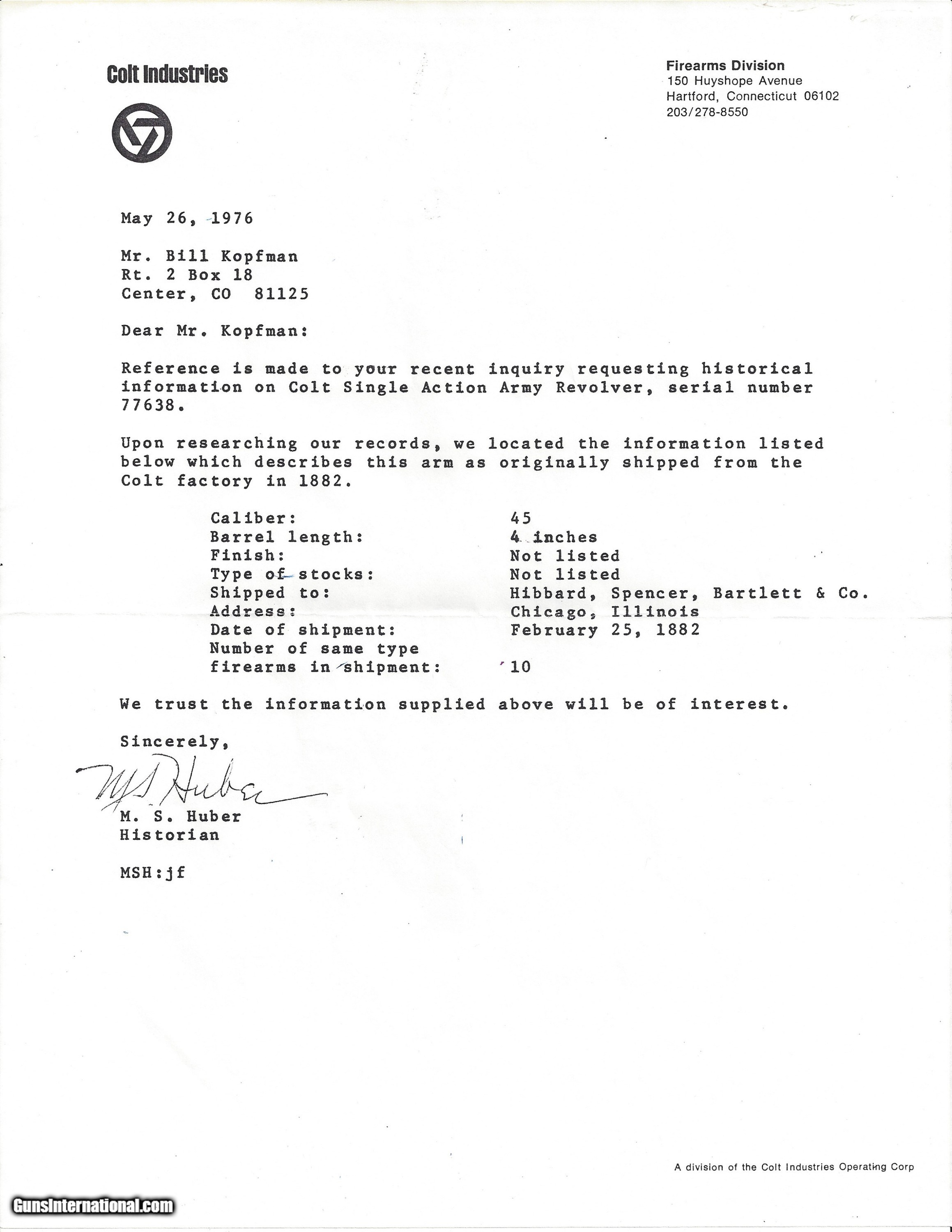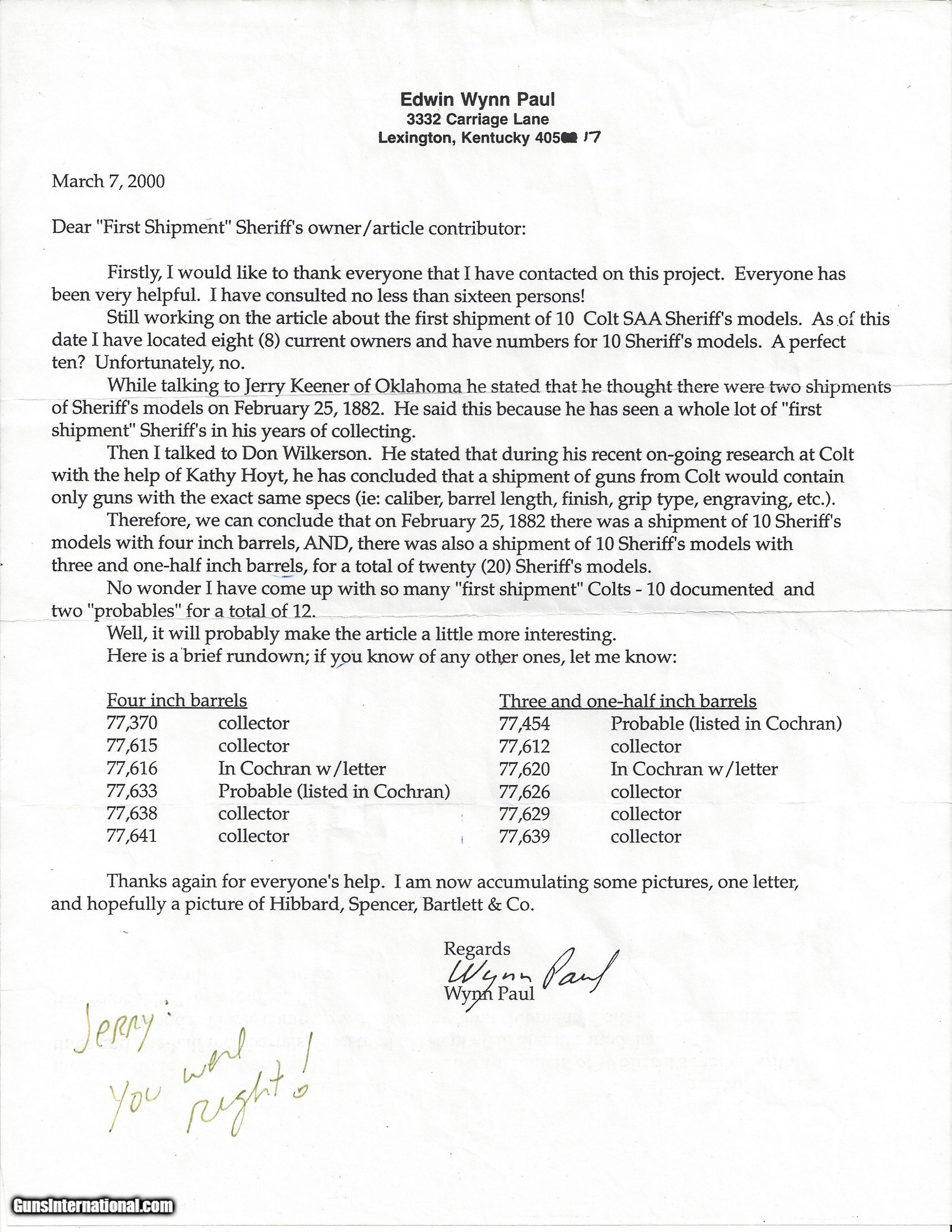 Colt, SAA Sheriff’s Model, SN: 77638, c.1882, Among 1st Ten Shipped, Colt & Research letters.