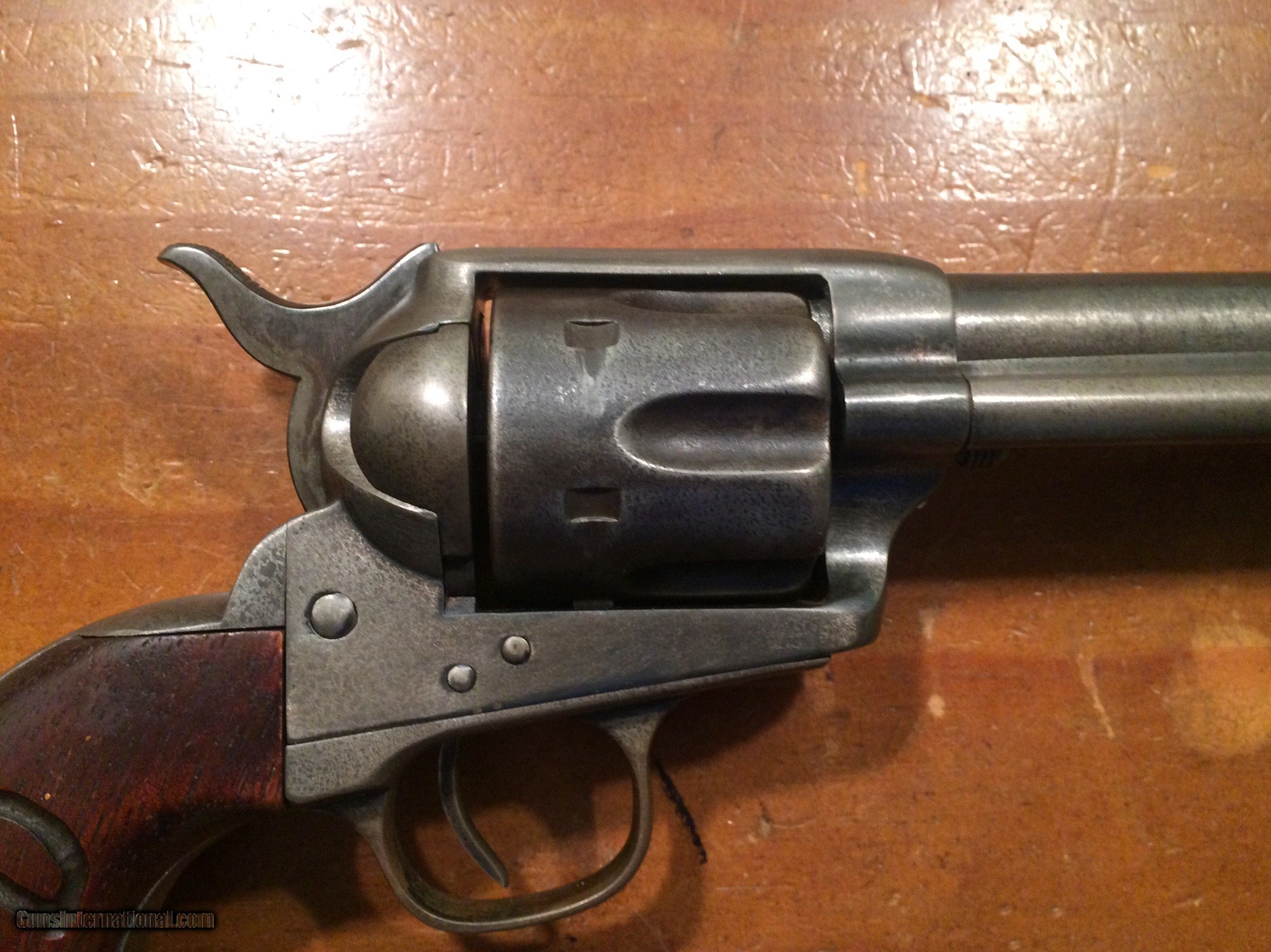 Description: Colt SAA single action 44-40 Frontier Six Shooter. Has very desirable 4 3/4 barrel with two line barrel address with one piece walnuts. Etched panel gun that is very visible. Mottled grey patina with an old cowboy’s name nicely carved in the grips. Some might not like that but it’s part of the gun’s history. I’ll discount the gun if your name is Ned. Action is tight with four clicks. Overall a very nice old cowboy gun. Antique 1884 gun ships direct. I’ve got another short barrel .45 same year that I’ll be selling if someone has interest. shipping is $38.00 SOLD Antique: Yes |