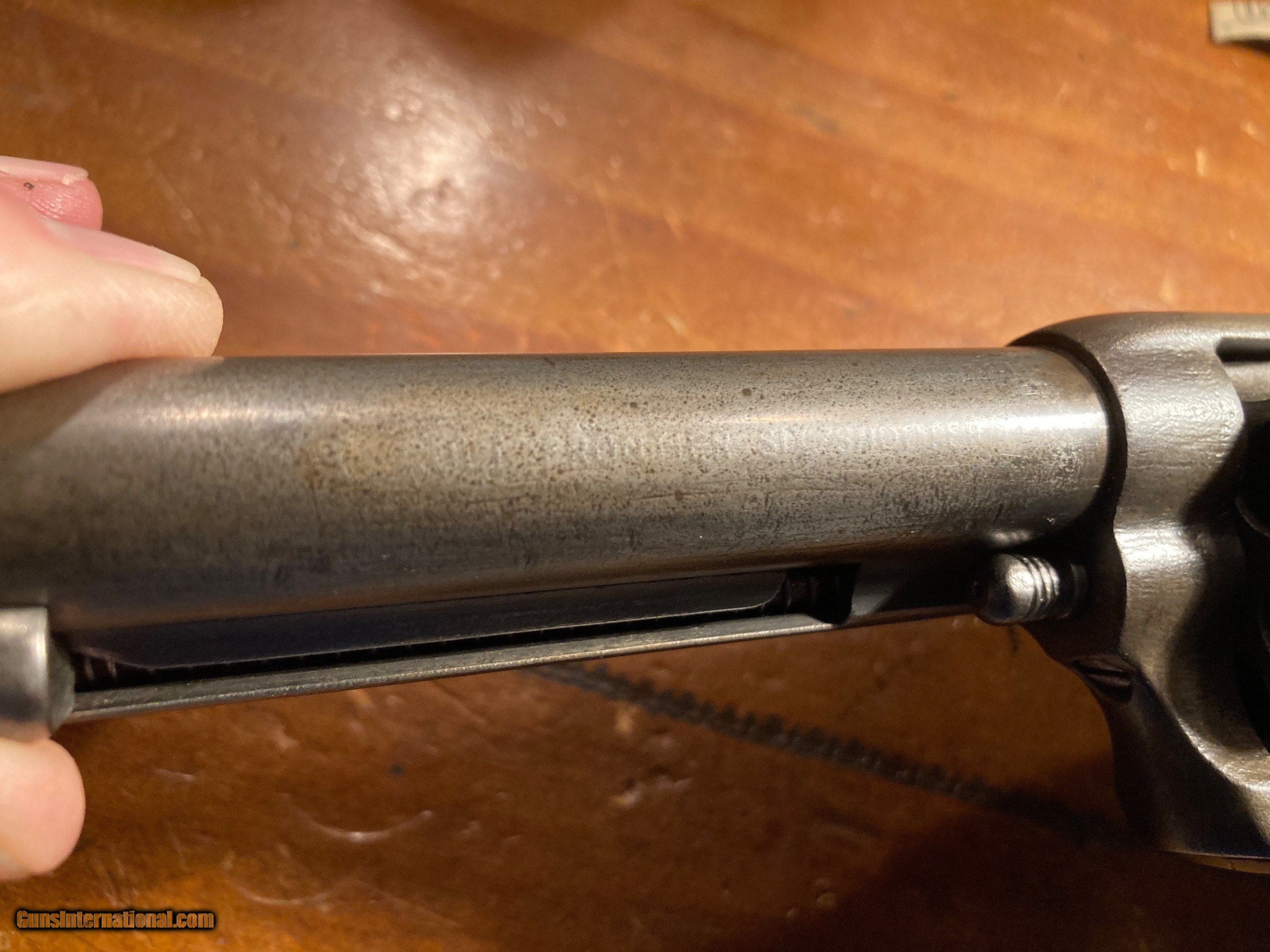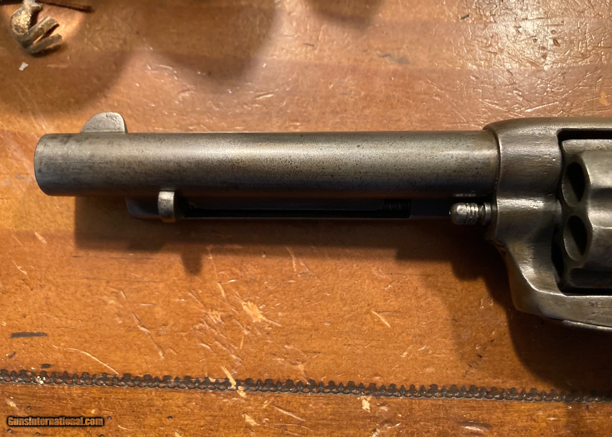 Description: Colt single action frontier six shooter with etched panel. This is a scarce early 5 1/2 barrel with one piece walnut grips. The gun comes with a Colt letter verifying the configuration is as it left the factory in 1882. All matching gun. You can see the etched panel well but is hard to photograph. The gun shows wear, scuffs and scratches from 140 years of use. A past owner suggested from the markings on the gun it may have been Indian used. Who knows. Barrel address is soft in places. Bore is very good for a black powder gun. See photos as part of the description. Email or call with questions. Matt 214-957-7574 Antique ships direct for $38 SOLD Antique: Yes Manufacturer: Colt Model: Frontier Six Shooter |