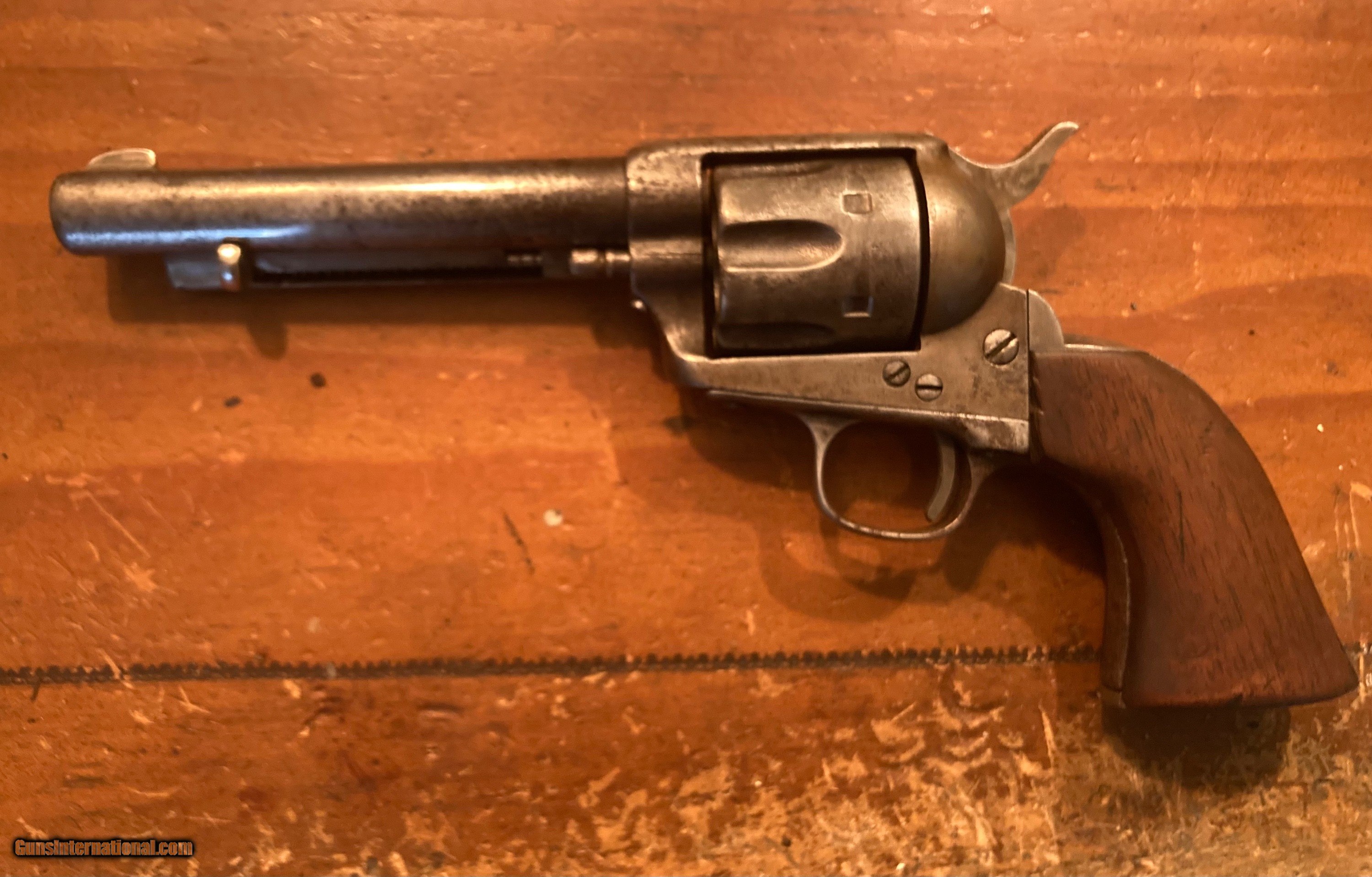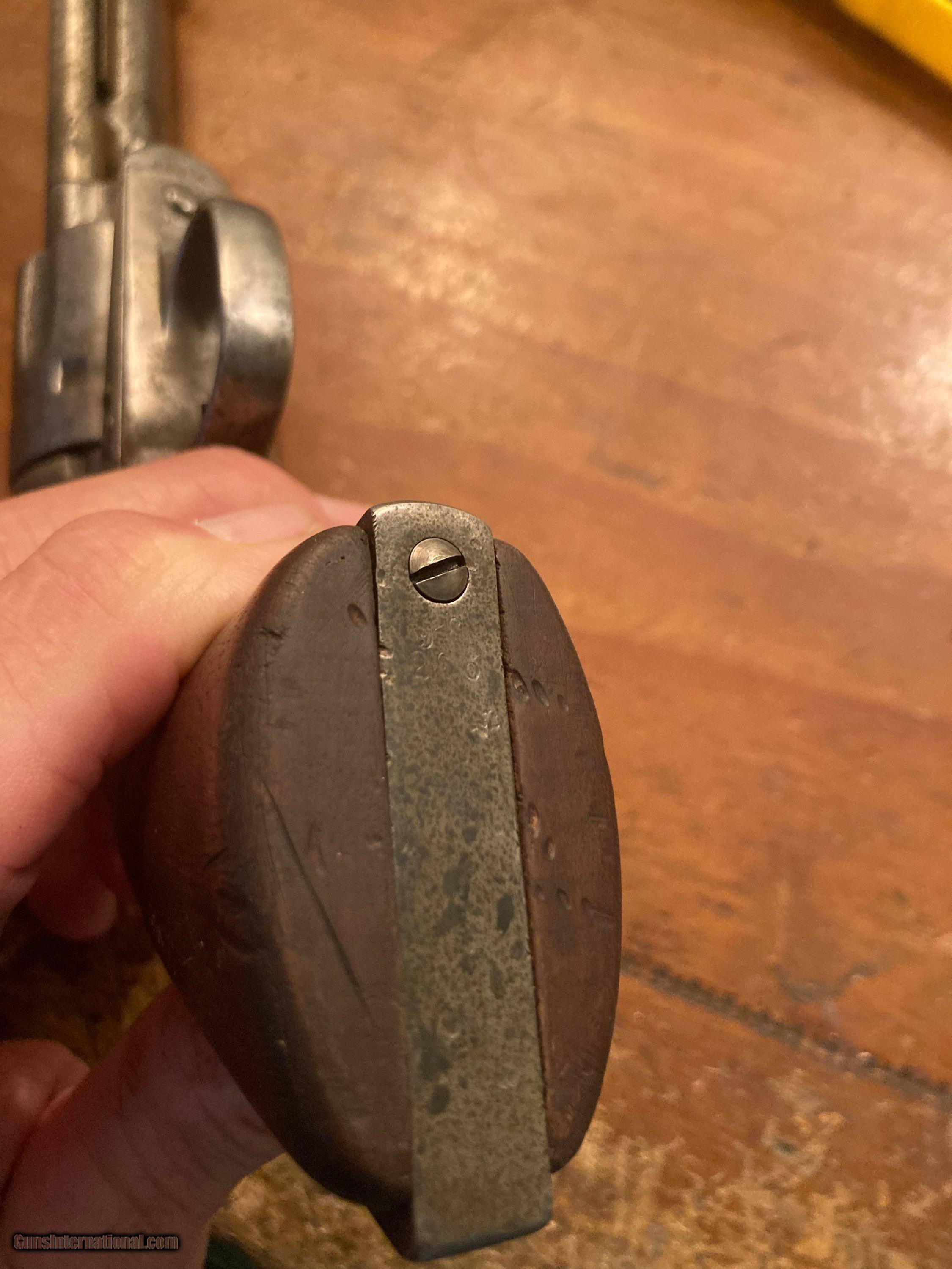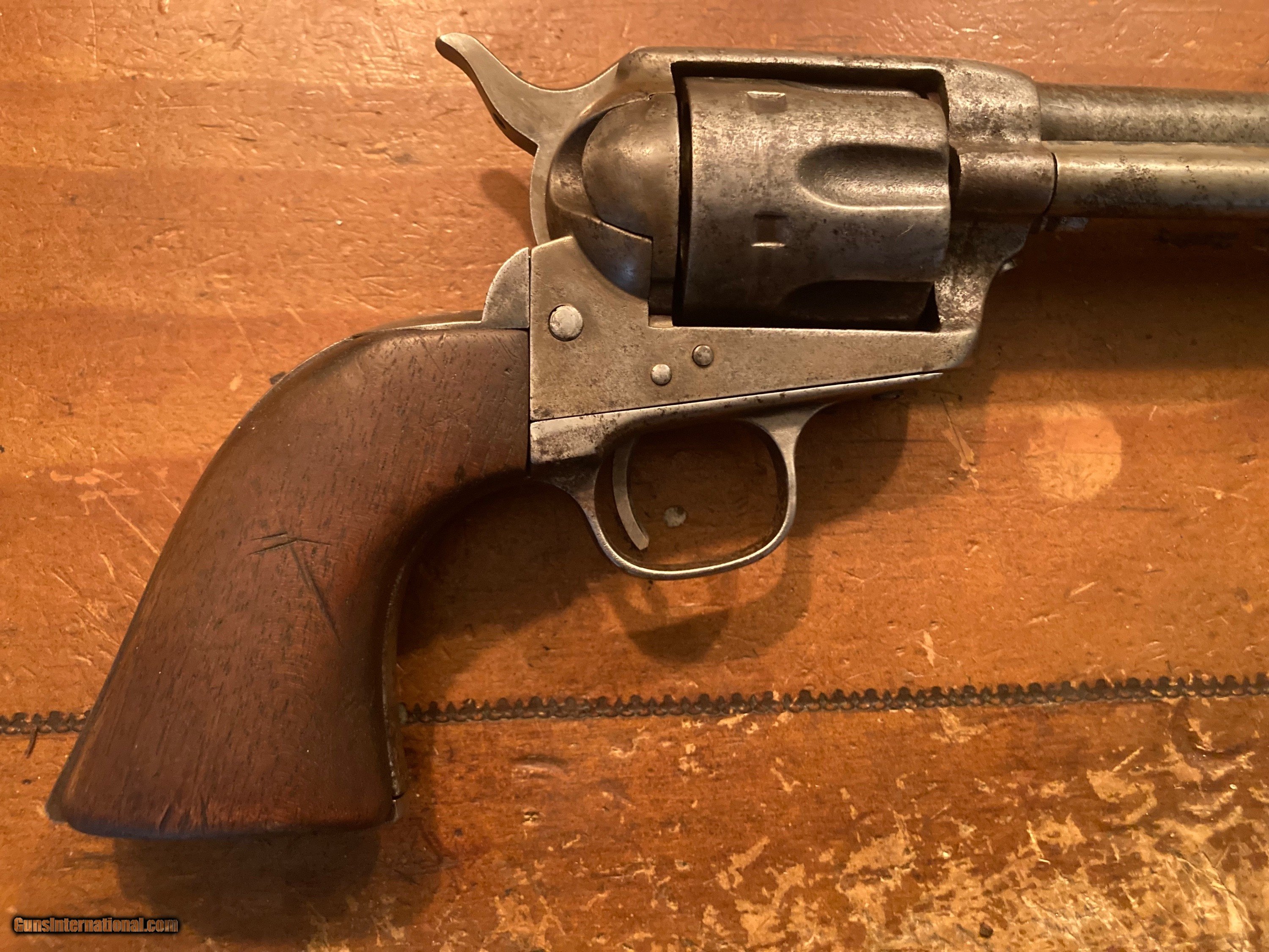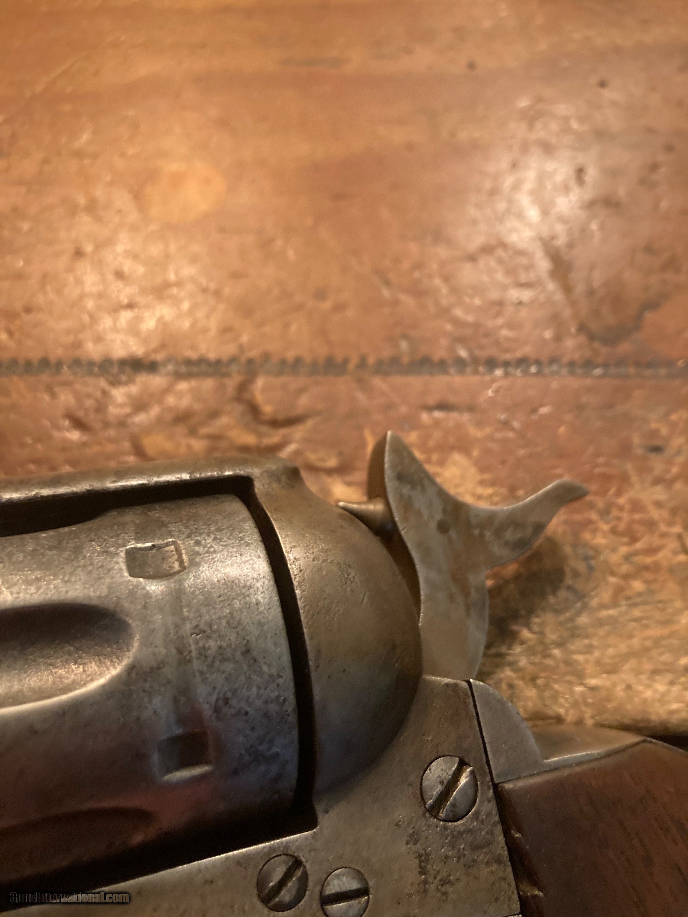 Description: Colt SAA single action .45 made in 1883. Old example of an original well used cowboy gun that has been there. All matching serial numbers including barrel. Cylinder is marked but can't read it due to use and wear. Barrel is now 5 1/2 with soft barrel address. Action remarkably has a four clicks but I would not shoot this one unless my wife shot it first. Main spring is a later variation. My guess to soften the action. Patched up to stay in a working man's holster. The action works well but occasionally gets sticky but works. I just don't want to take apart an old gun like this to see. Bore is typical black powder. See photos for condition, wear and use. Not a condition gun but not priced as one. A neat wall hanger or display piece. At this price this one is sold as is. This is an antique and ships direct for $35. Email or call with questions. Matt 214-957-7574 SOLD Antique: Yes Manufacturer: Colt Model: Single Action |