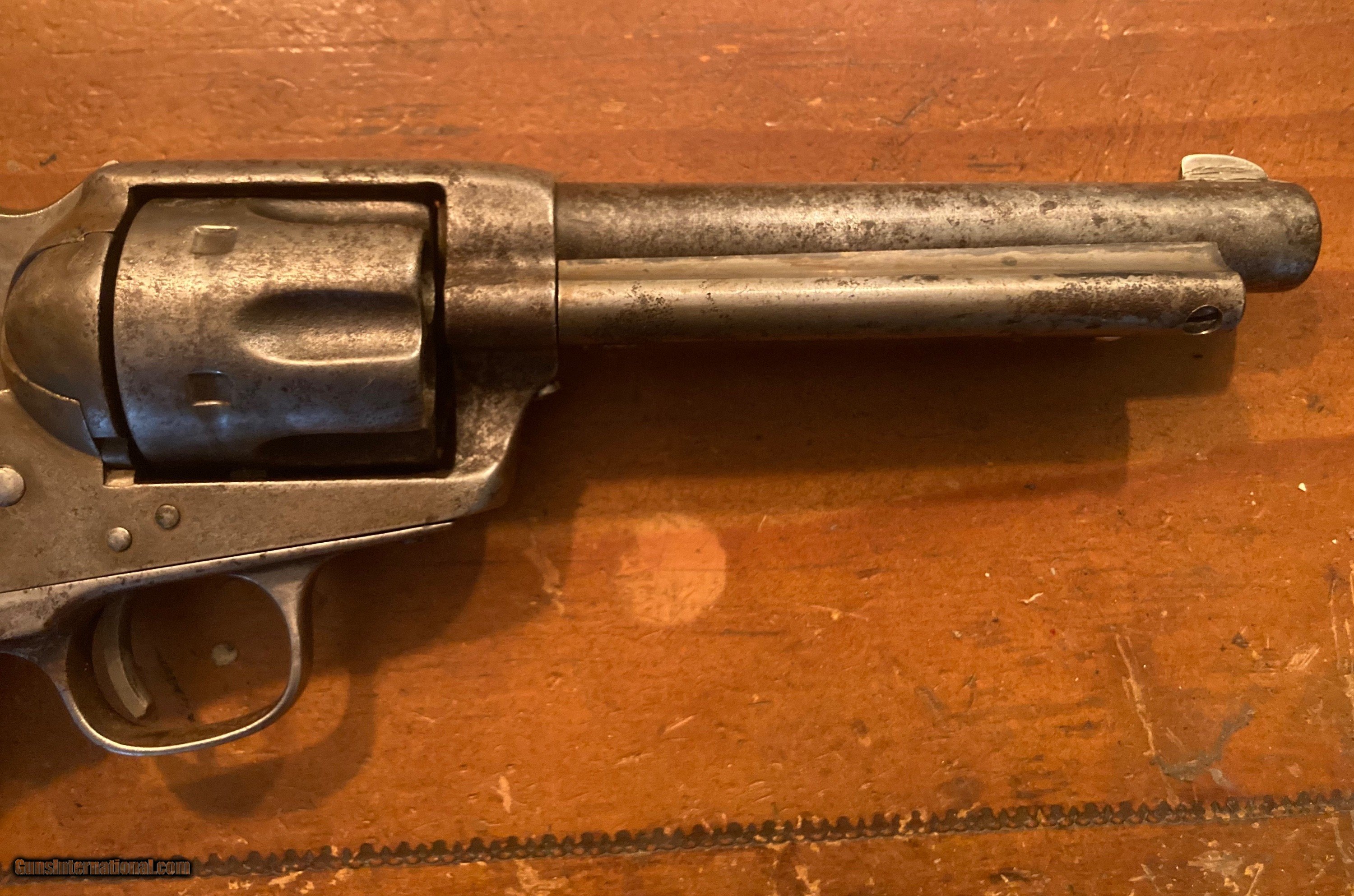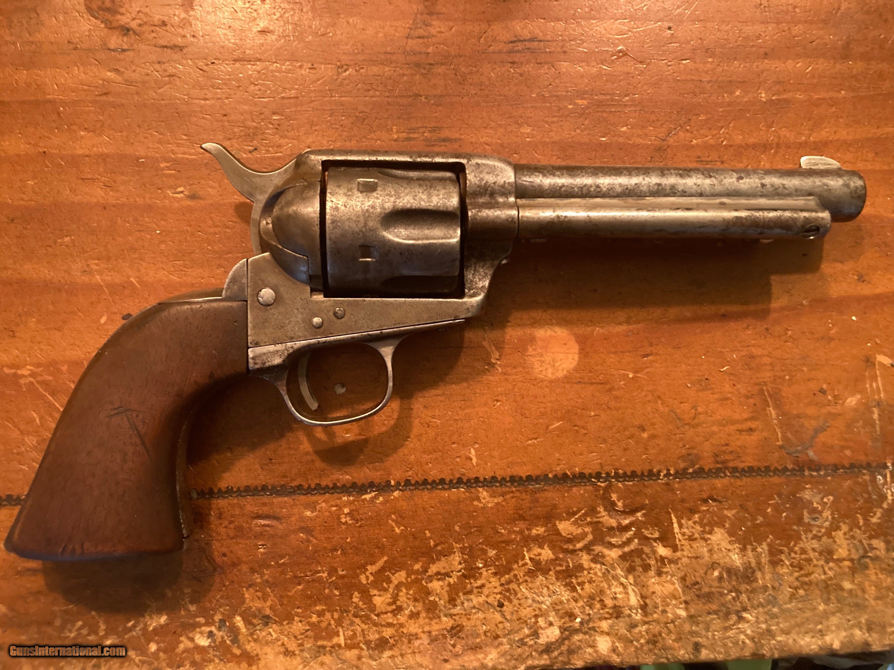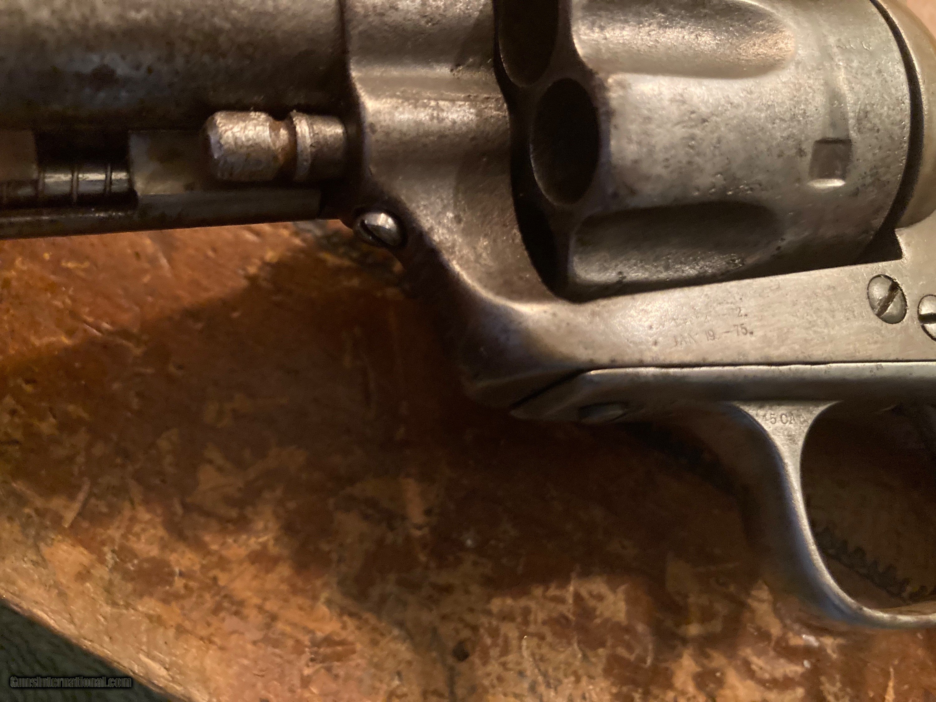 Description: Colt SAA single action .45 made in 1883. Old example of an original well used cowboy gun that has been there. All matching serial numbers including barrel. Cylinder is marked but can't read it due to use and wear. Barrel is now 5 1/2 with soft barrel address. Action remarkably has a four clicks but I would not shoot this one unless my wife shot it first. Main spring is a later variation. My guess to soften the action. Patched up to stay in a working man's holster. The action works well but occasionally gets sticky but works. I just don't want to take apart an old gun like this to see. Bore is typical black powder. See photos for condition, wear and use. Not a condition gun but not priced as one. A neat wall hanger or display piece. At this price this one is sold as is. This is an antique and ships direct for $35. Email or call with questions. Matt 214-957-7574 SOLD Antique: Yes Manufacturer: Colt Model: Single Action |