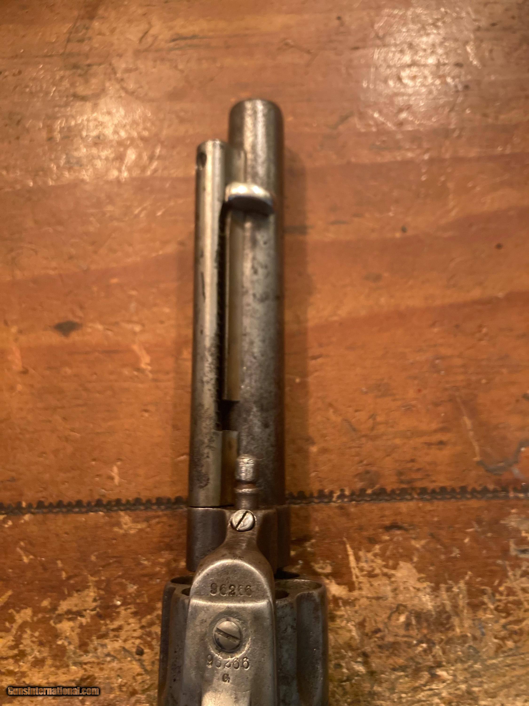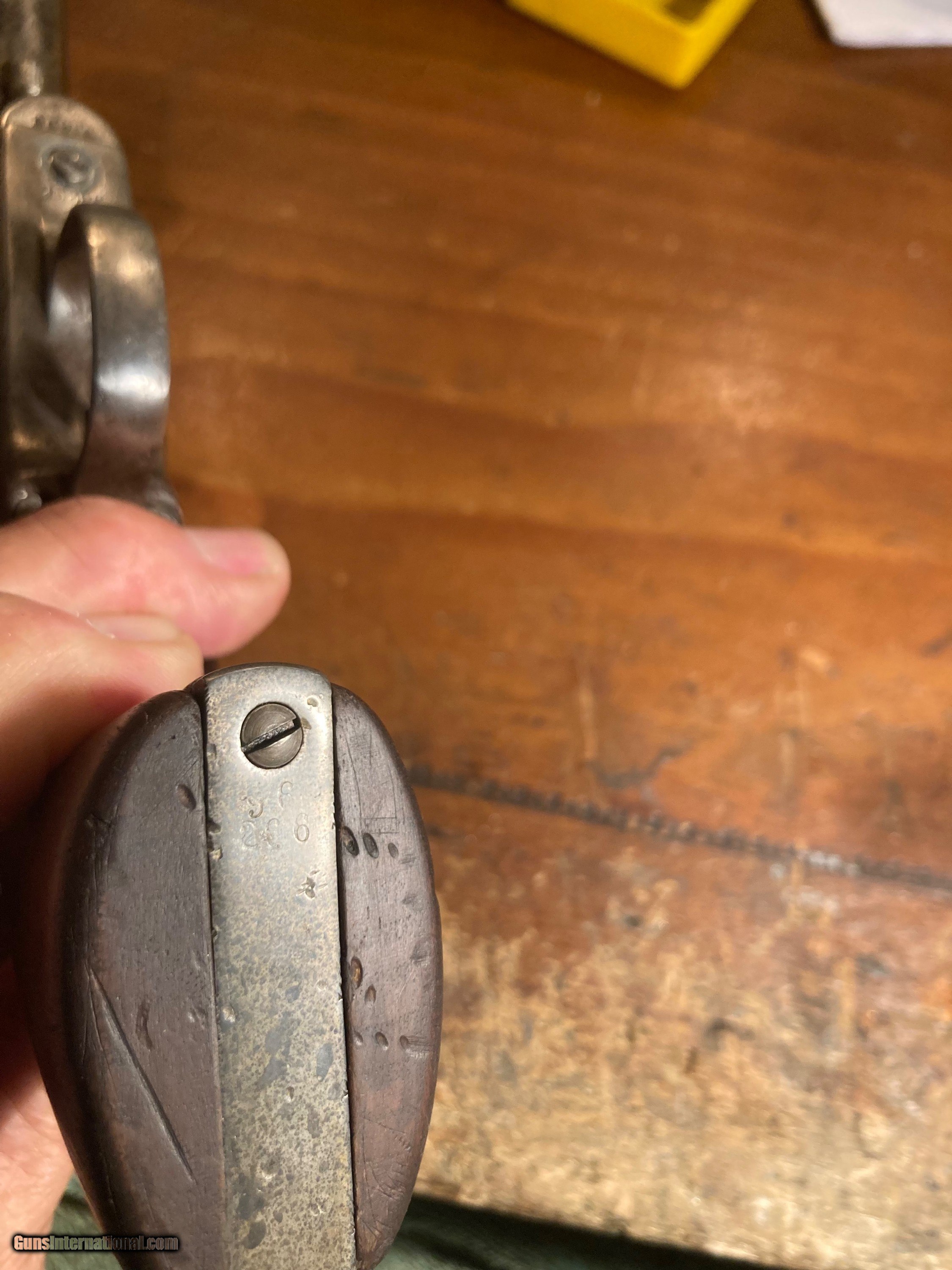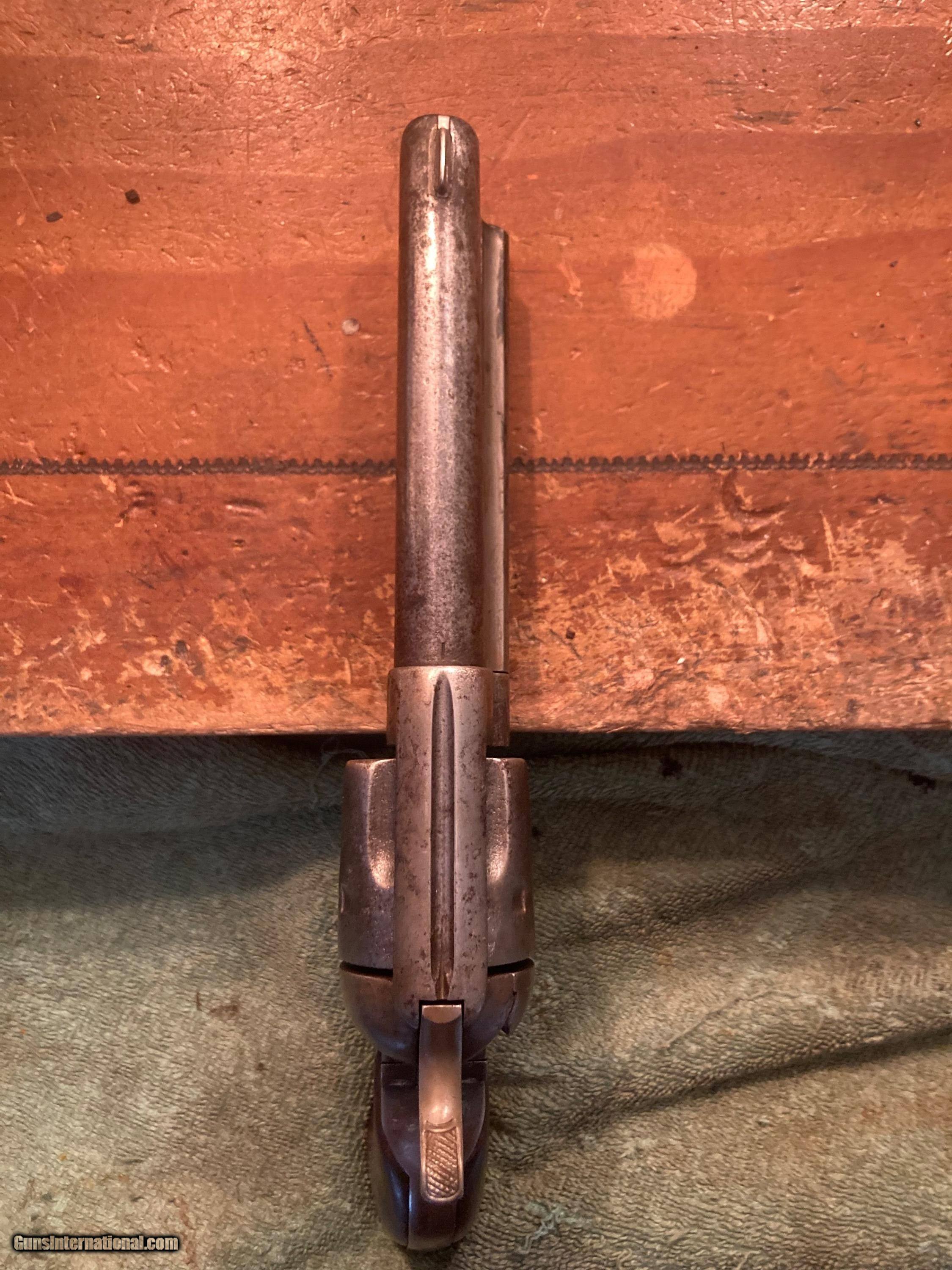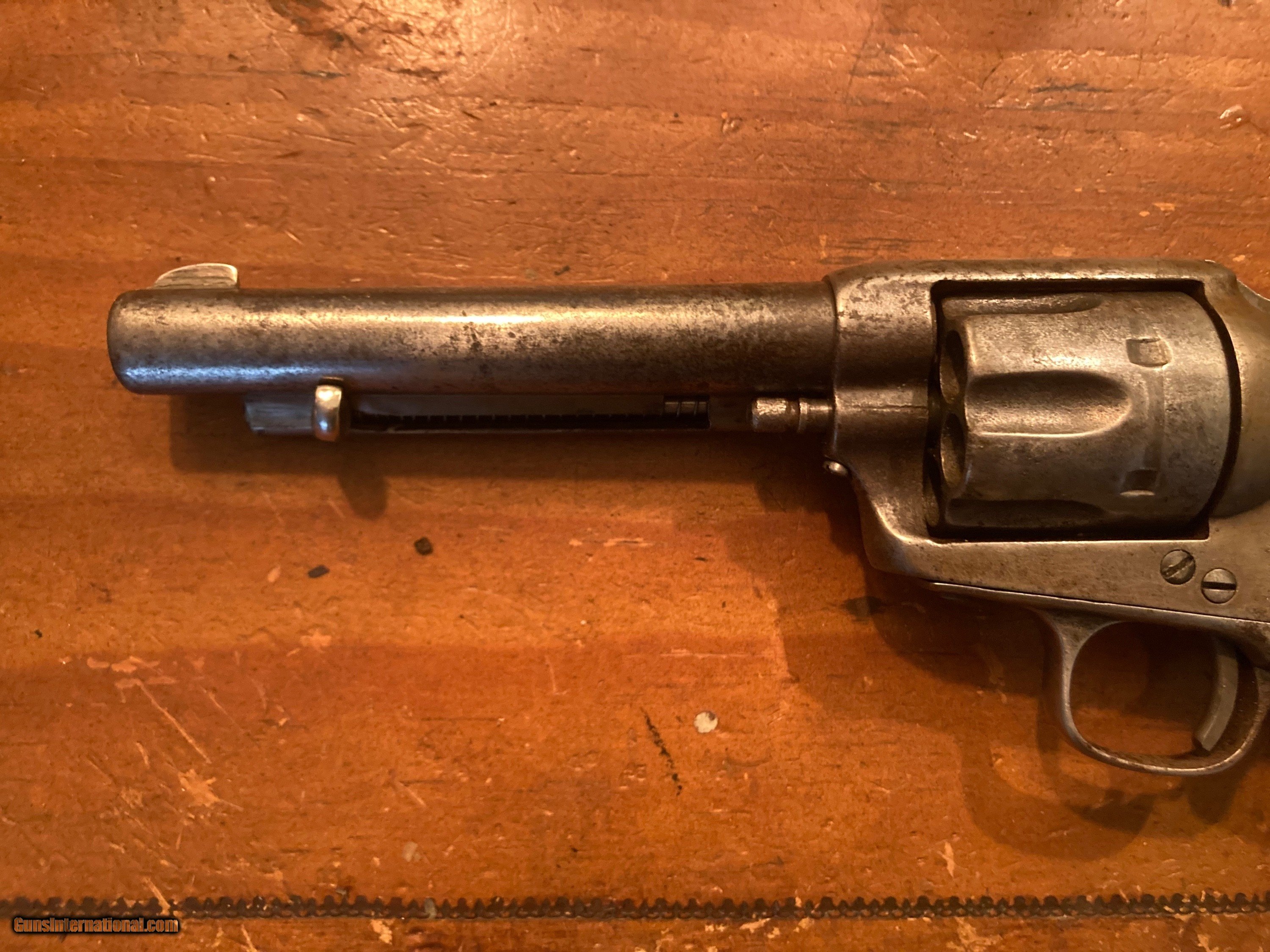 Description: Colt SAA single action .45 made in 1883. Old example of an original well used cowboy gun that has been there. All matching serial numbers including barrel. Cylinder is marked but can't read it due to use and wear. Barrel is now 5 1/2 with soft barrel address. Action remarkably has a four clicks but I would not shoot this one unless my wife shot it first. Main spring is a later variation. My guess to soften the action. Patched up to stay in a working man's holster. The action works well but occasionally gets sticky but works. I just don't want to take apart an old gun like this to see. Bore is typical black powder. See photos for condition, wear and use. Not a condition gun but not priced as one. A neat wall hanger or display piece. At this price this one is sold as is. This is an antique and ships direct for $35. Email or call with questions. Matt 214-957-7574 SOLD Antique: Yes Manufacturer: Colt Model: Single Action |