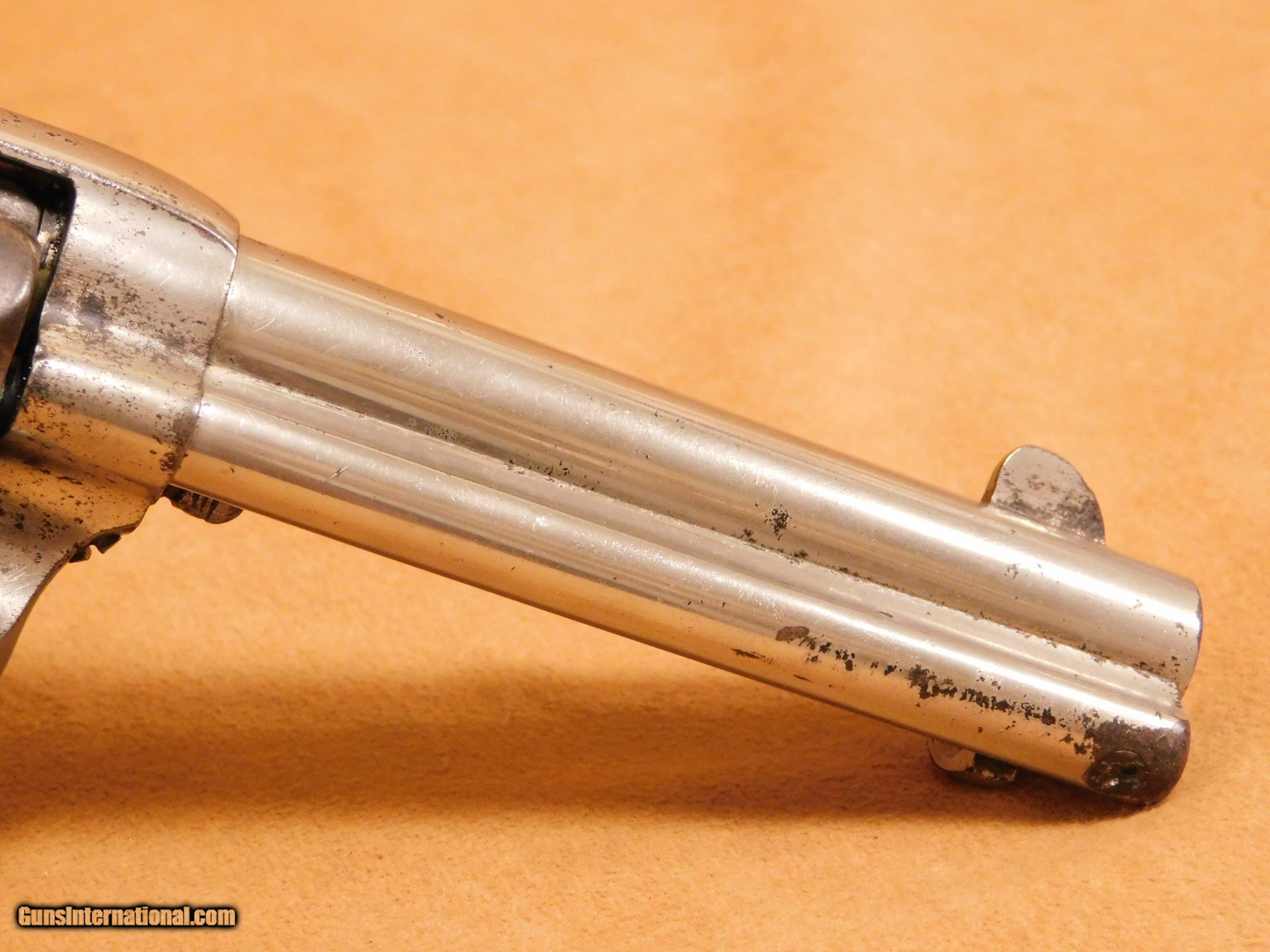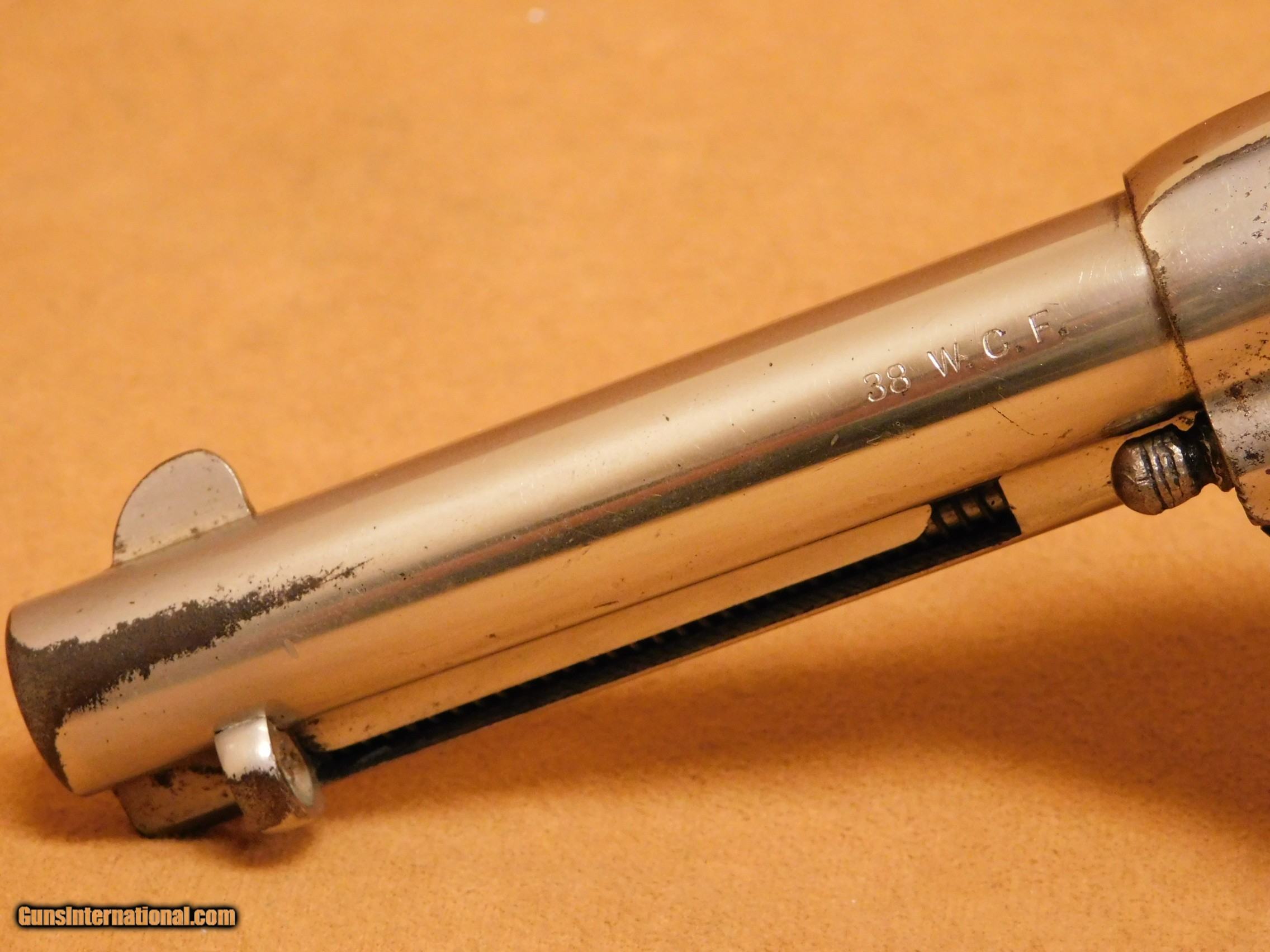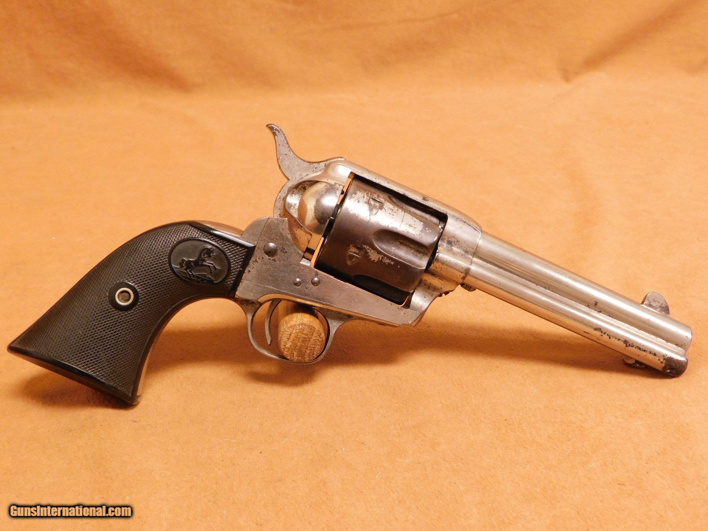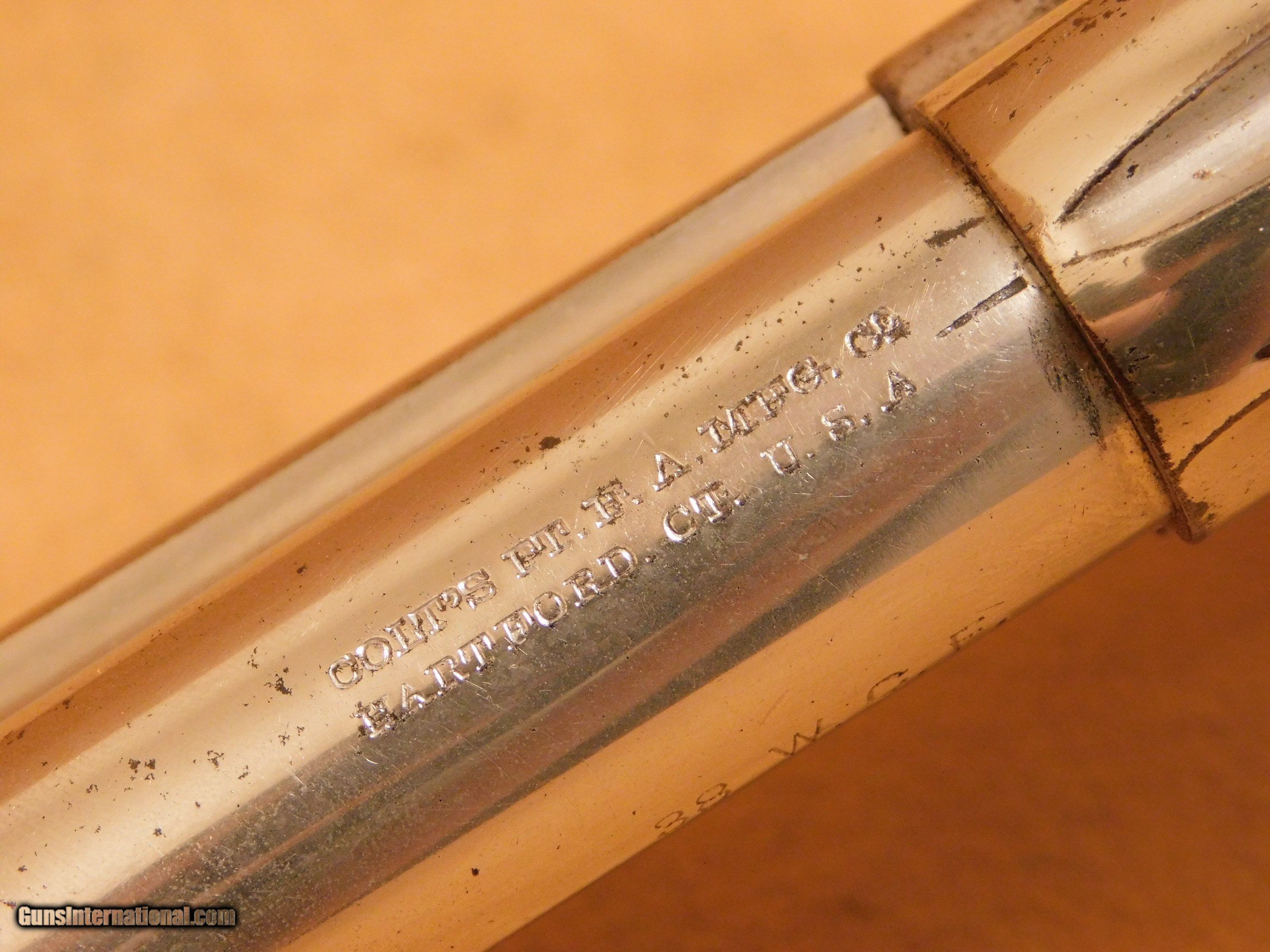 Description: This is a fine example of an antique nickel Colt Single Action Army revolver that was manufactured in 1895. The top of the barrel is marked with the two line address, the left side is marked "38 W.C.F.", and the left side of the frame is marked with the two line, three patent dates followed by the circled Rampant Colt. The underside of the barrel has the factory caliber designation: "41" (38-40 WCF and .41 Long Colt shared the same bore diameter). The bore is in good condition, with light to moderate pitting throughout. The revolver retains approximately 80% of its original nickel finish, with the majority of the loss being confined to the cylinder, muzzle and recoil shield. The screws are un-molested and retain much of their nitre blue. The black gutta percha grips match the condition of the gun and their fitment is perfect. This gun comes with its factory Colt letter, verifying its original configuration. All items are also available for sale in our brick & mortar store and are subject to prior sale. Think long, think wrong. Payment On firearms, we typically only accept credit cards or money orders/cashier's checks.
