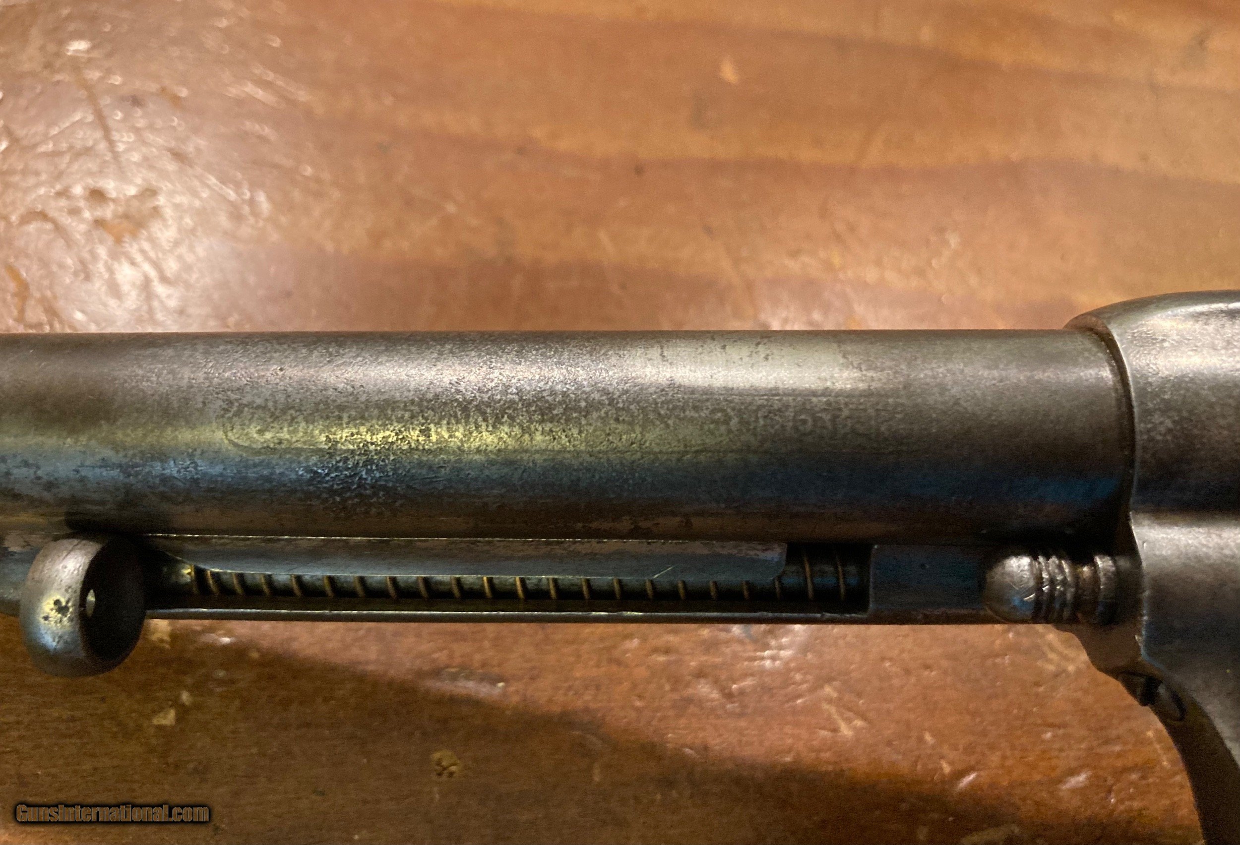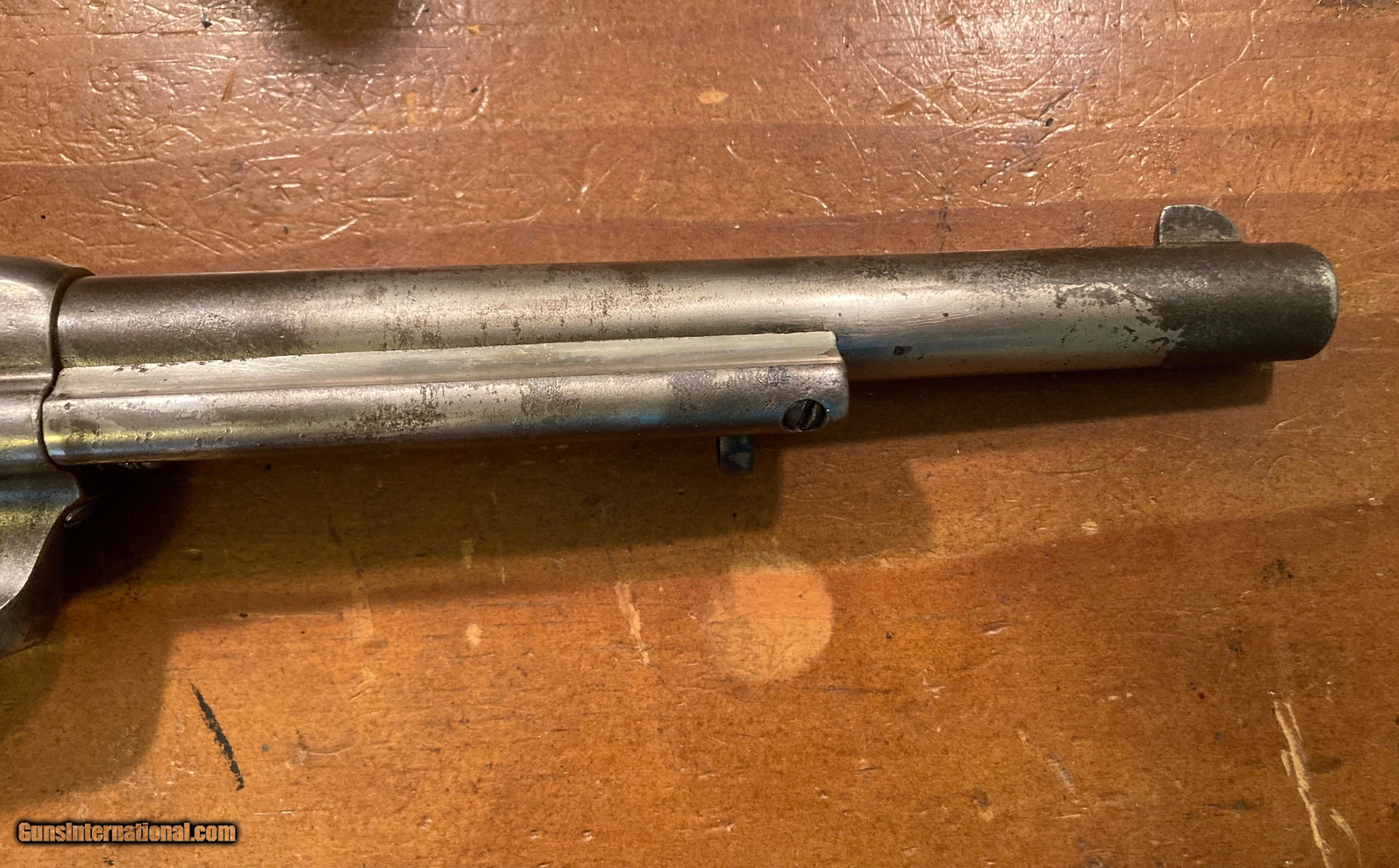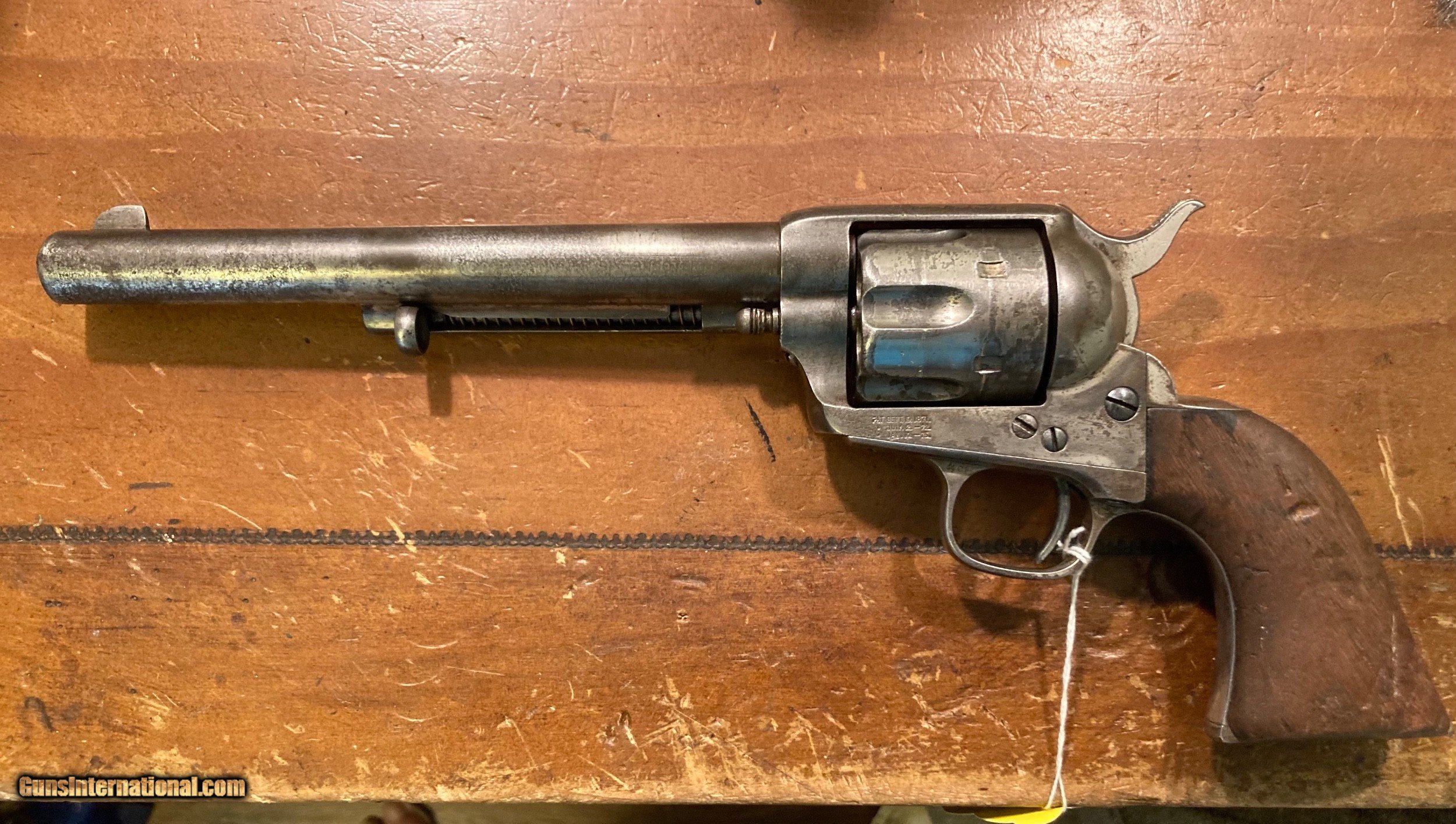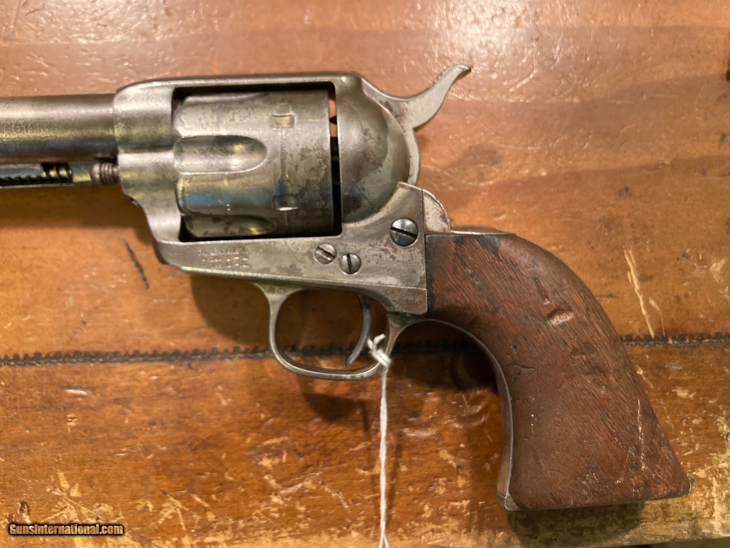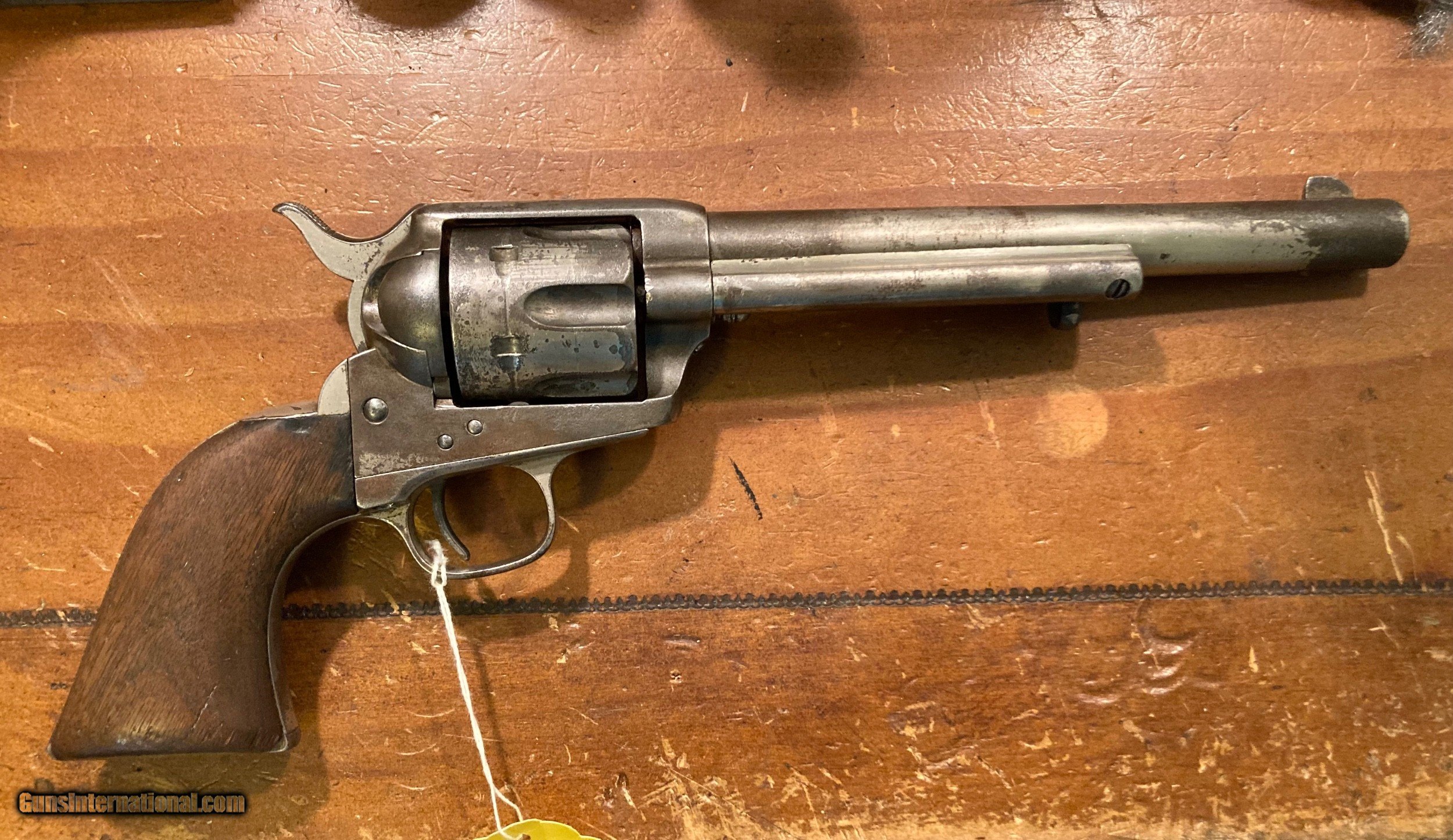 Description: Colt SAA single action 44-40 Frontier Six Shooter with etched panel with Colt letter shipped to Hartley and Graham. Nickel gun that matches configuration with original Colt letter. Dirty nickel finish with very visible etched paneling remaining. Etched panel is hard to photograph but actually looks better in person than I could photograph. All serial numbers match. Typical black powder bore. Action is strong with 4 clicks. See photos as part of the description. Antique gun ships direct for $34.00 Feel free to call or email with questions. Matt 214-957-7574 SOLD Antique: Yes Manufacturer: Cokt Model: Single action |