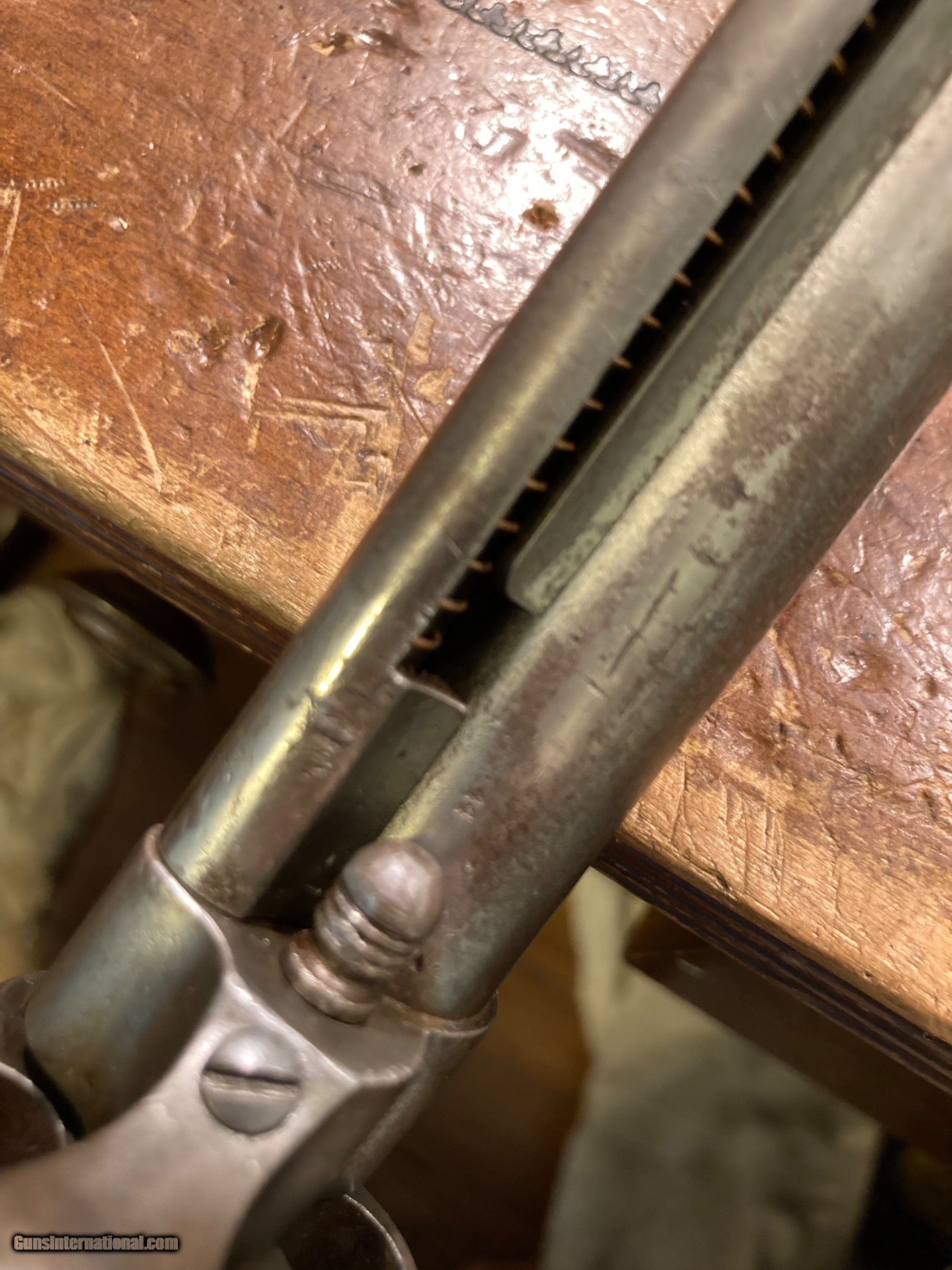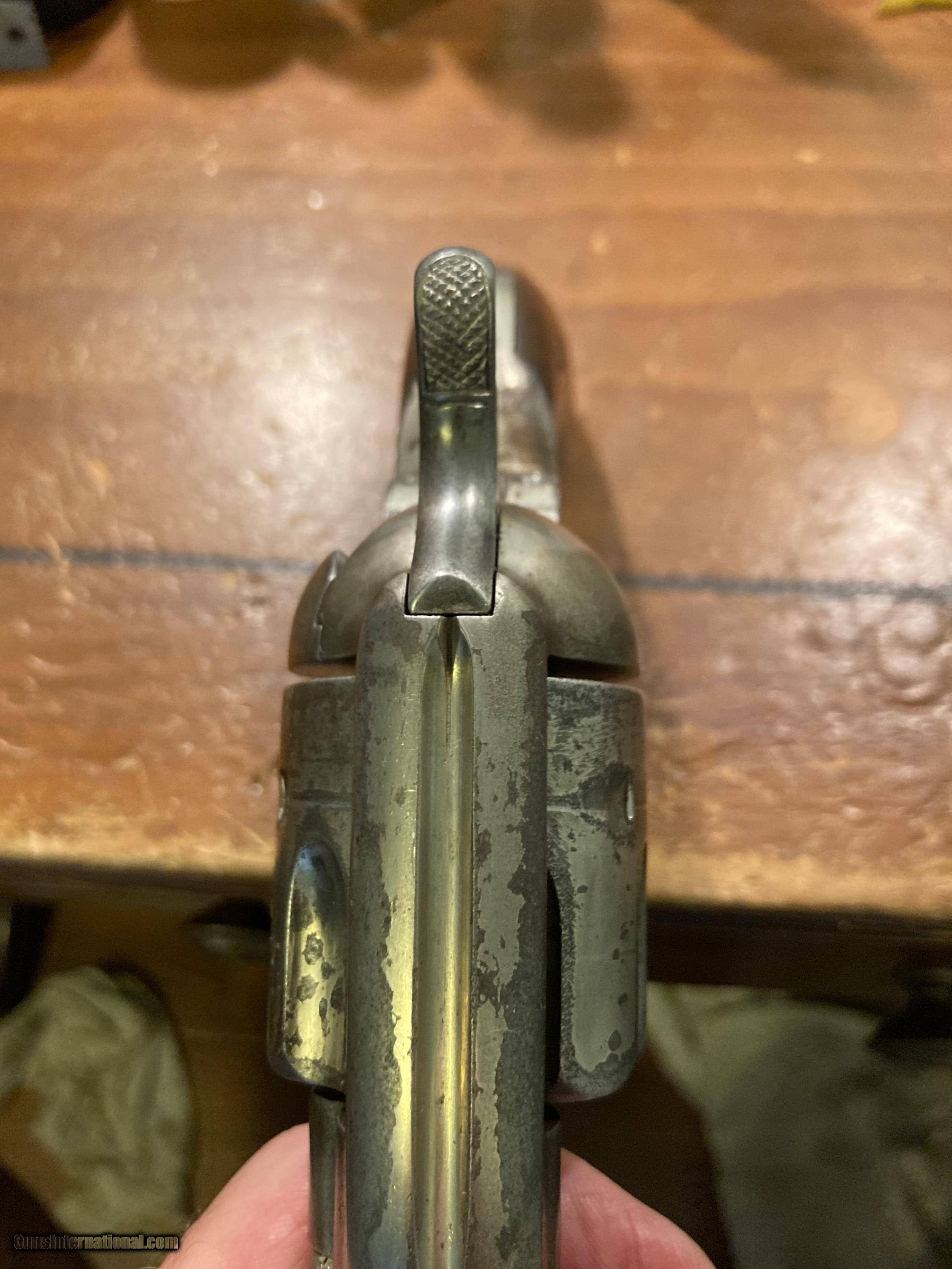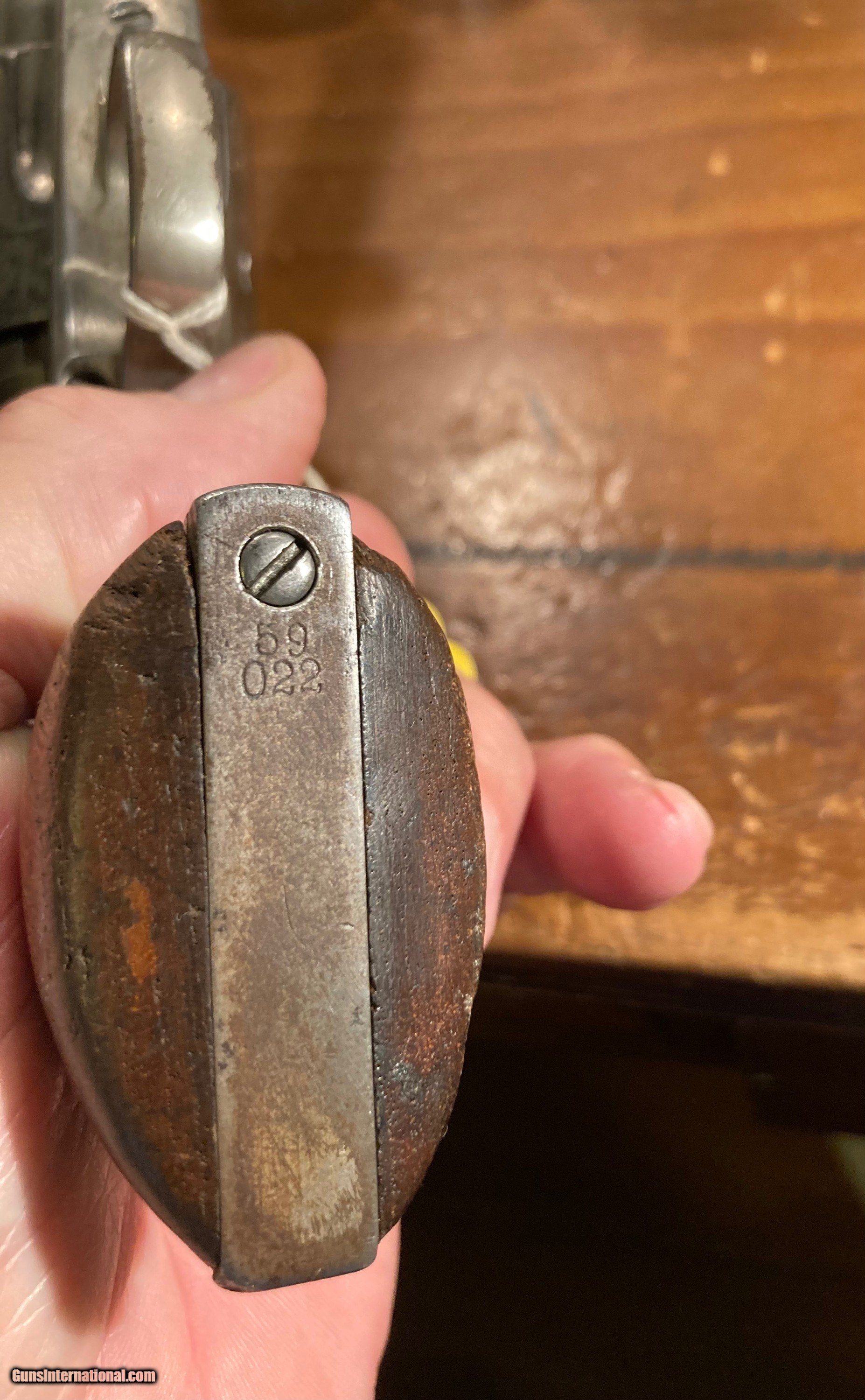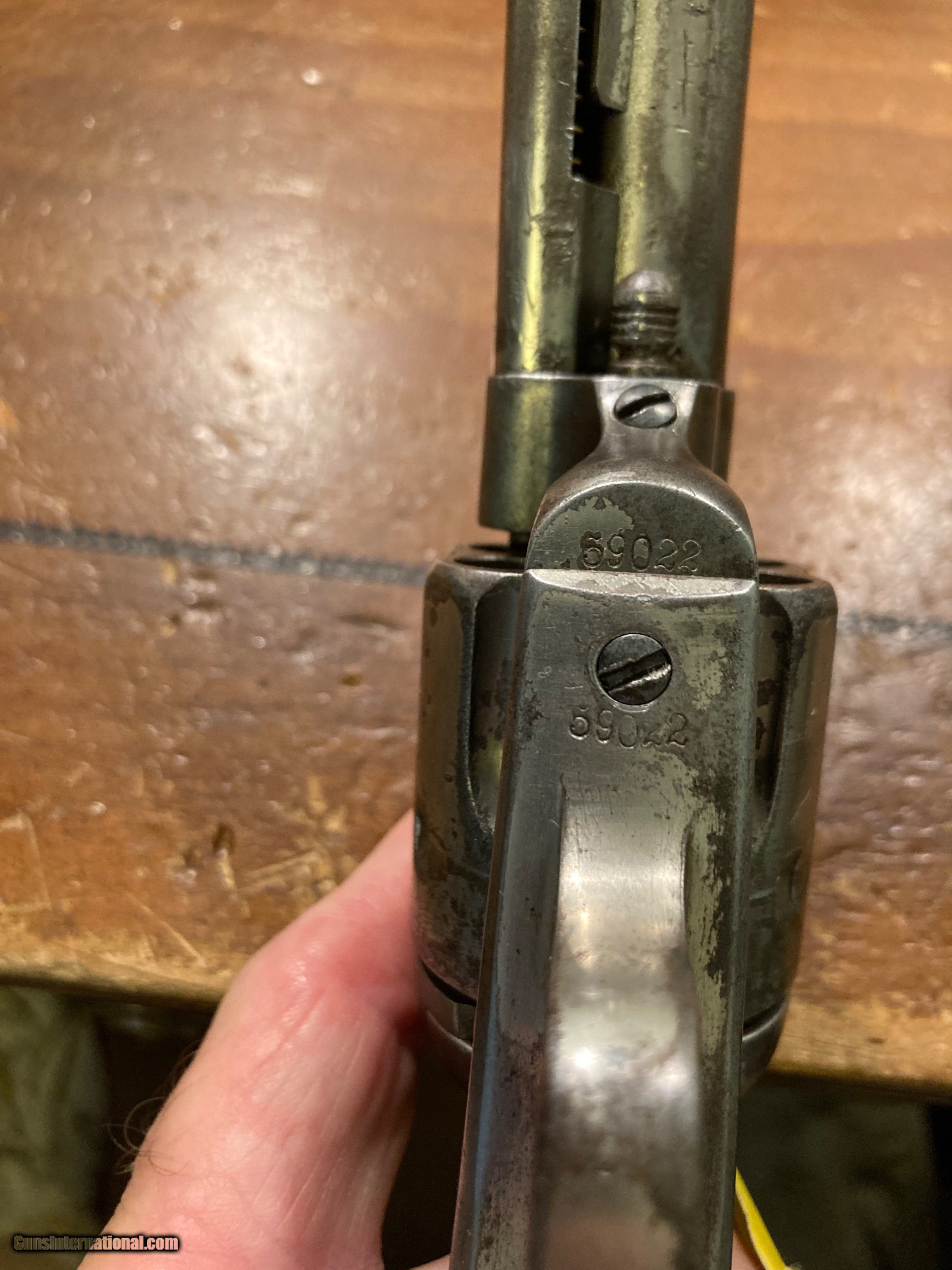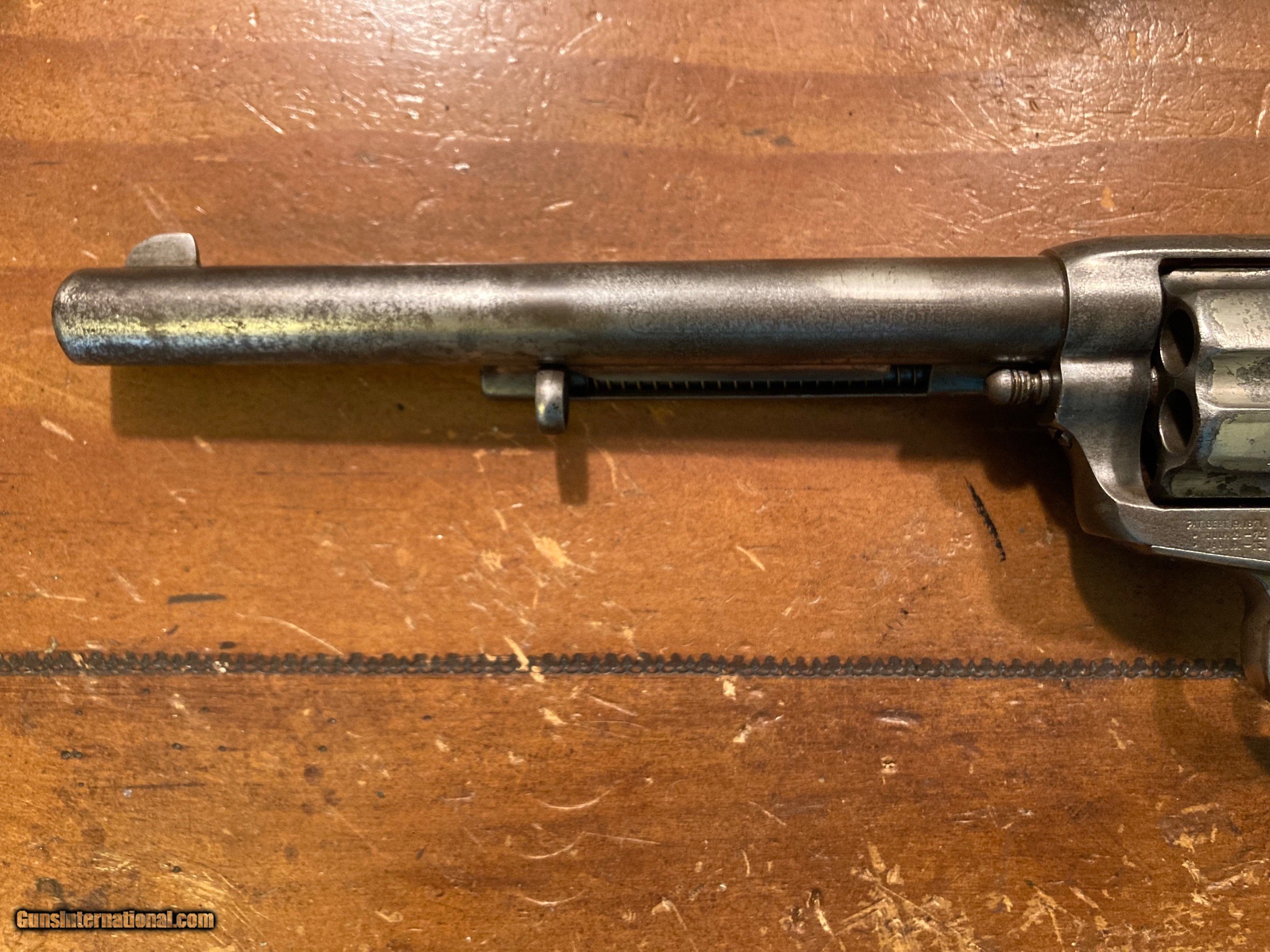Description: Colt SAA single action 44-40 Frontier Six Shooter with etched panel with Colt letter shipped to Hartley and Graham. Nickel gun that matches configuration with original Colt letter. Dirty nickel finish with very visible etched paneling remaining. Etched panel is hard to photograph but actually looks better in person than I could photograph. All serial numbers match. Typical black powder bore. Action is strong with 4 clicks. See photos as part of the description. Antique gun ships direct for $34.00 Feel free to call or email with questions. Matt 214-957-7574 SOLD Antique: Yes Manufacturer: Cokt Model: Single action |