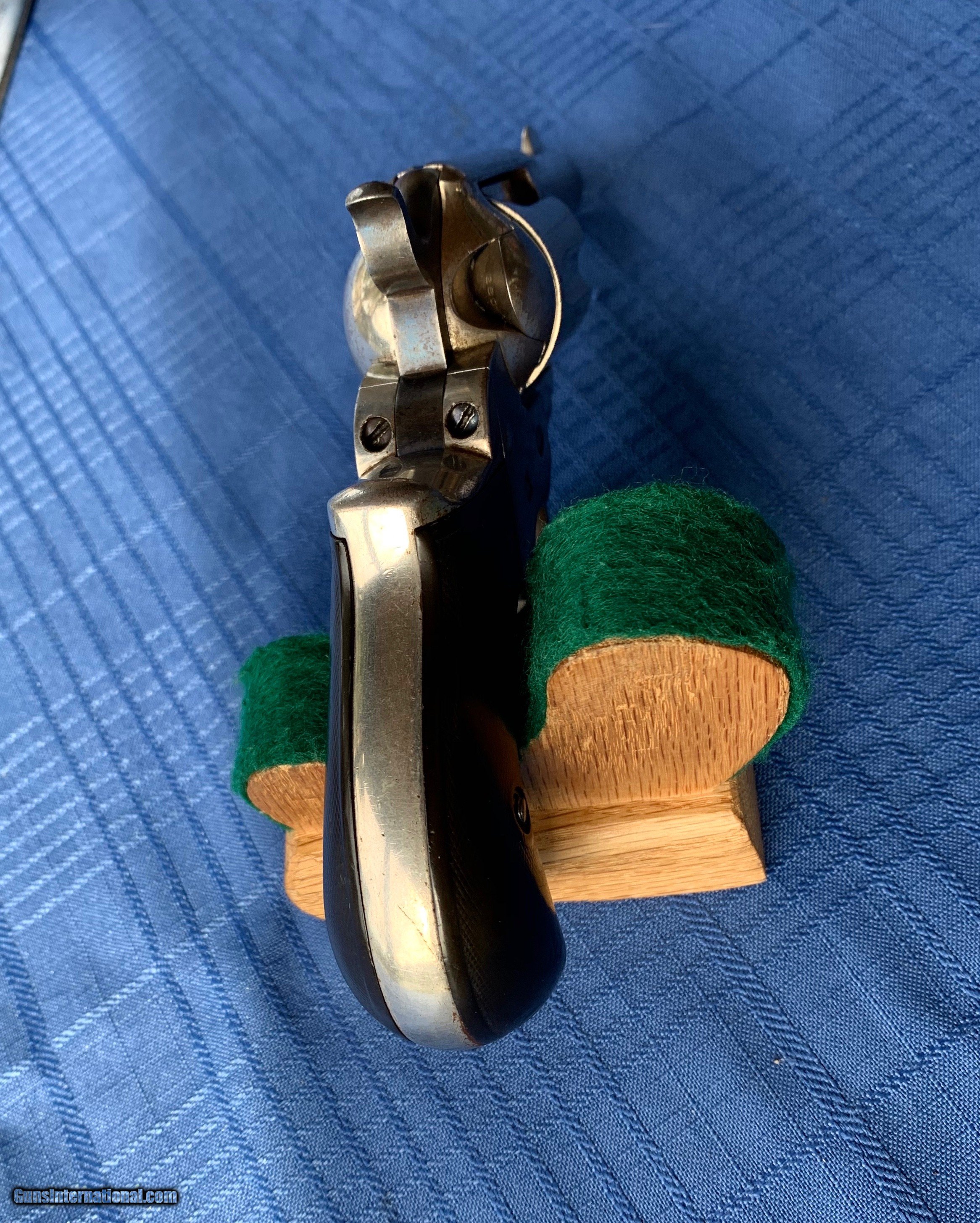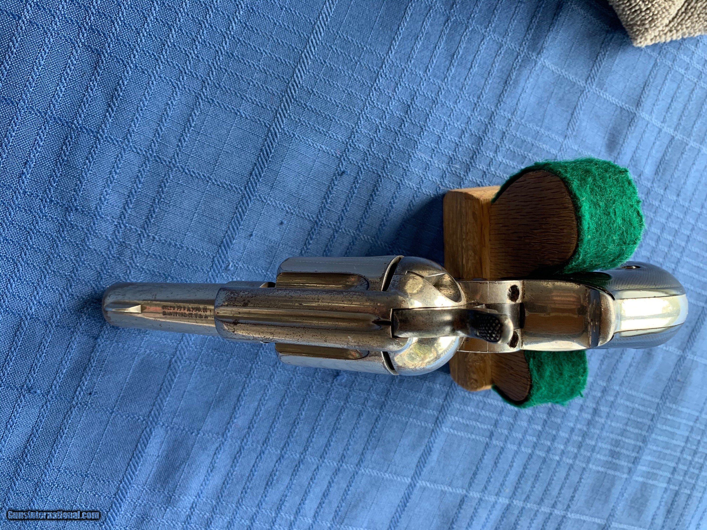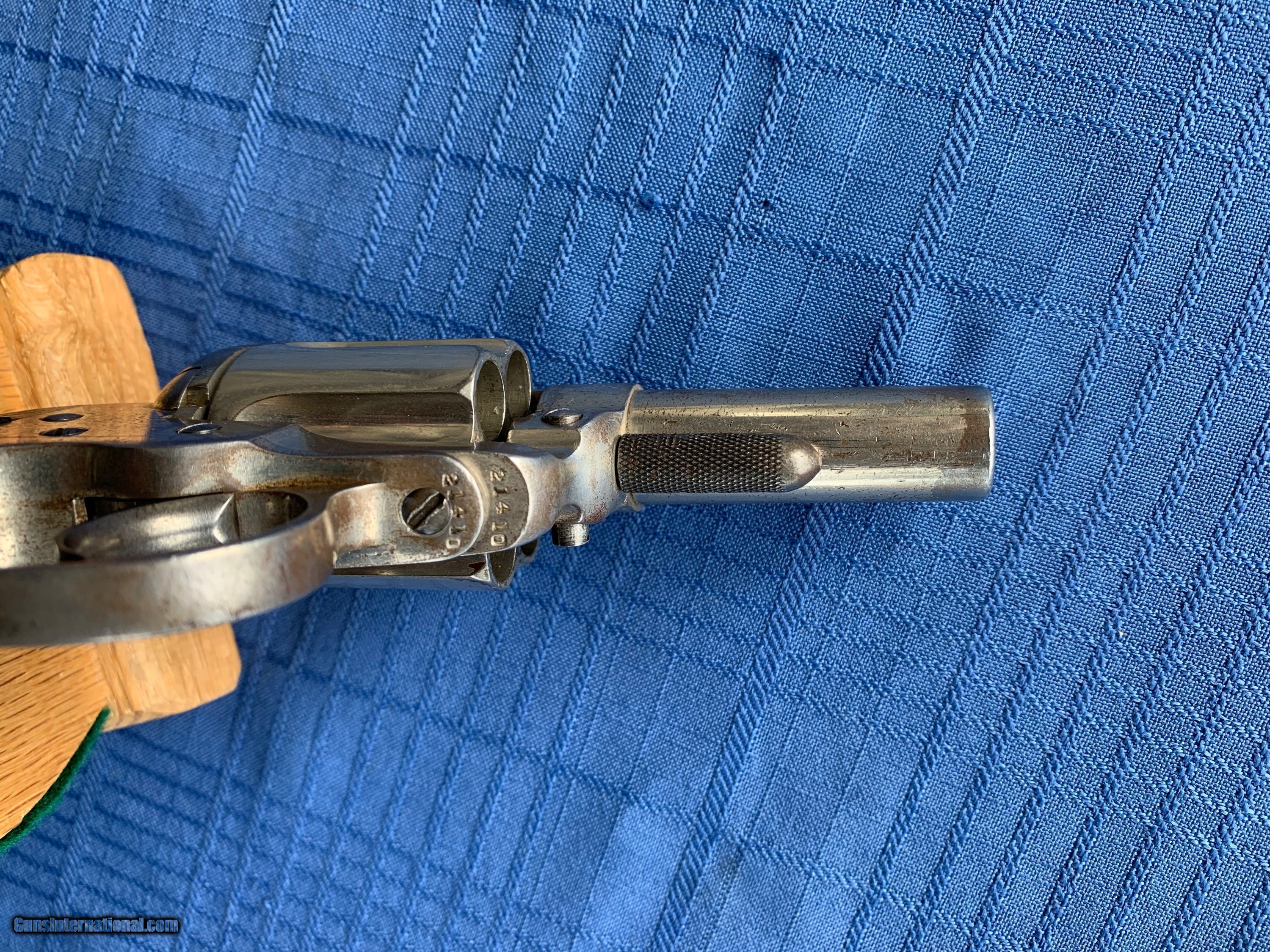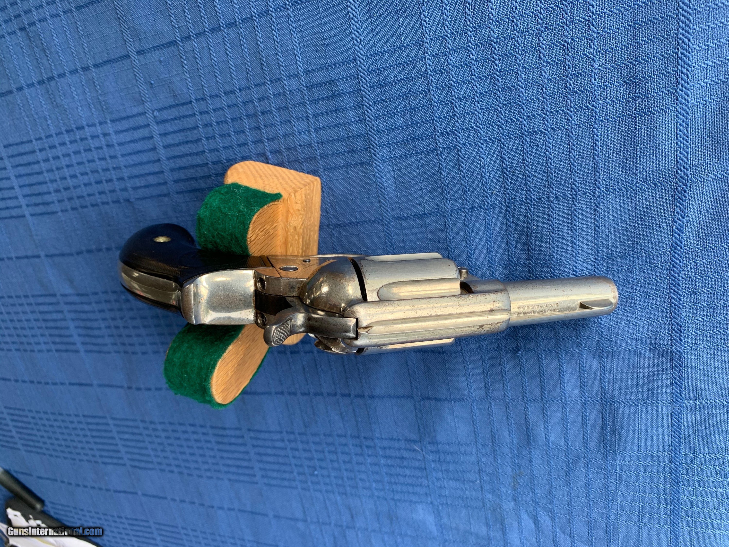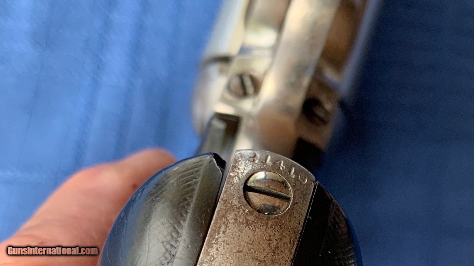 Description: Heres a Excellent Plus Example of a Rare Colt Revolver called The Store Keeper . Colt Factory Original Nickel Finish. Etched Panel on Barrel 41 DA . Super nice Example ! Most all of its Original Nickel finish Still Remaining. Factory original Sights . Factory original grips. Bore and mechanics are excellent plus condition. Gun is in very good working order. This gun was not shot much . Mostly holster wear . Serial number 21410. Guns Antique . Please review my photos and email me with any questions ? 3 day inspection as allways. Thank you for looking Little Jo SOLD Antique: Yes Manufacturer: Colt Model: Store Keeper Serial Number: 21410 Condition: Excellent plus Metal Condition: Factory Nickel |