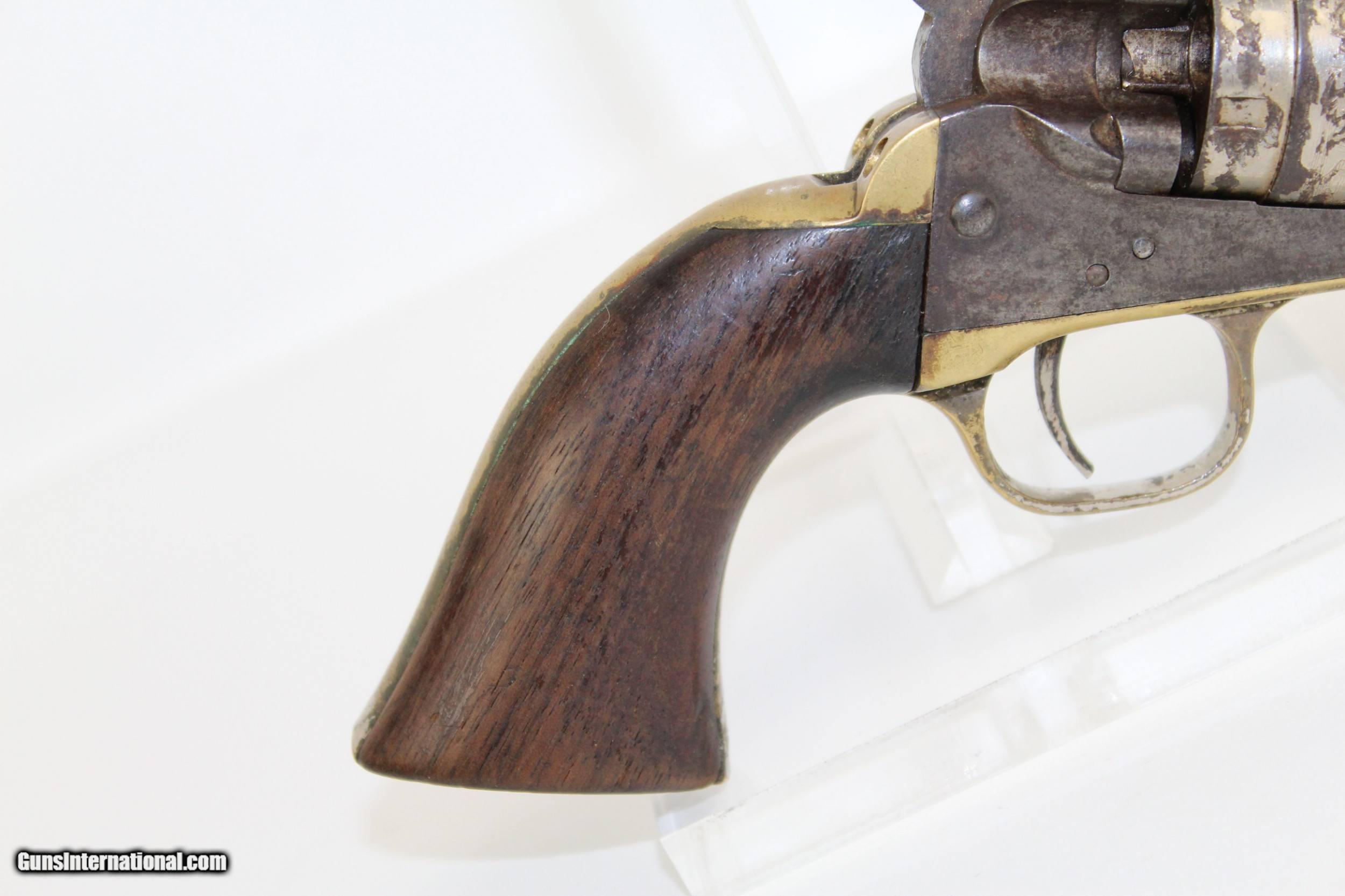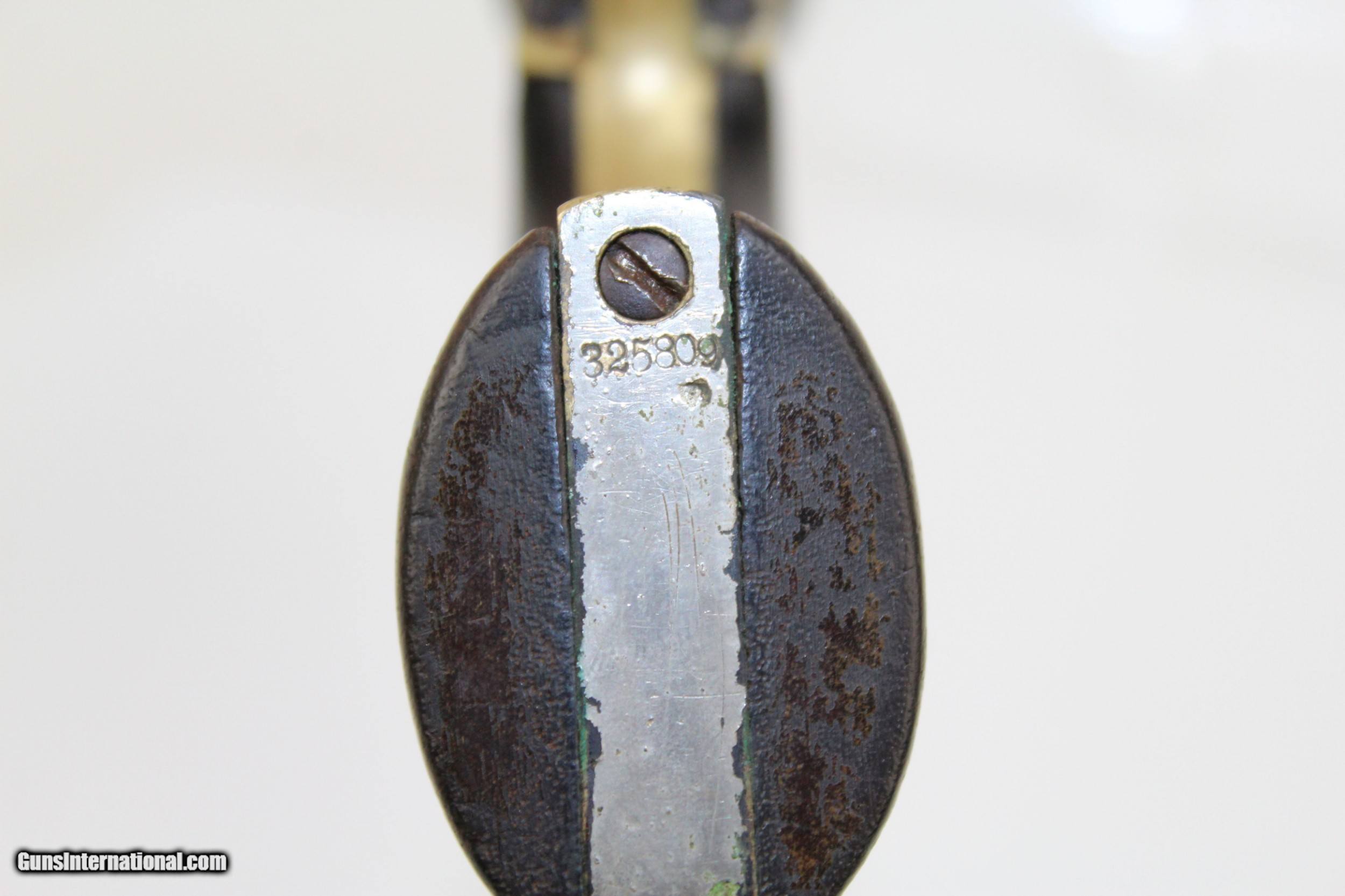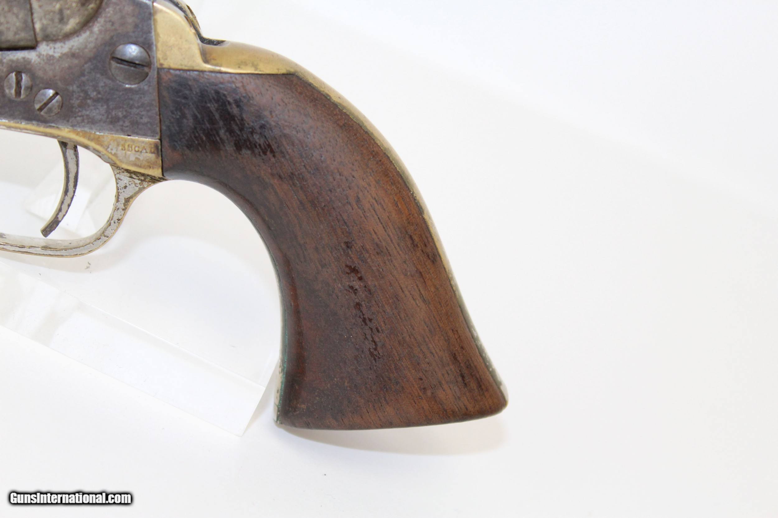 Description: EARLY 1869 Antique COLT Pocket CARTRIDGE Revolver Made in 1869 Out of 1849 Pocket Parts Here we present an antique Colt Cartridge Pocket Revolver, made in 1869 in Hartford, Connecticut. About 10,000 were produced altogether. These were made from new-old stock Colt 1849 Pocket Revolver parts. Though metallic cartridge revolvers had been invented in the late-1850s, Smith & Wesson owned the Rollin White Patent and had a virtual monopoly on the “modern” revolver. The patent finally ended in 1869 enabling other companies such as Colt to begin designing their own cartridge revolvers. The Colt 1849 Pocket was extremely popular and a logical choice for an early cartridge revolver given all the new-old stock parts available. This allowed Colt to get a toehold back in the market while they spent the next several years developing what would become a legend, the Single Action Army. This little revolver did a fine job as a self-defense handgun for the average citizen in 19th Century America. This small revolver carried 5 shots of .38 caliber centerfire ammunition. The cylinder bears the same roll-marked scene as the 1849 Pocket. It depicts a violent stage coach robbery complete with armed desperados, rearing horses and armed good guys protecting a woman framed in the doorway of the coach. The left side of the frame is marked with patent dates 1871 and 1872. The frame is also marked “.38 CAL”. The overall condition is very good. The metal surfaces have a flaking nickel finish with a dark gray patina elsewhere. The markings are legible. The serial numbers match. The walnut grips are in great shape. The bore is dark with good rifling. The action on this revolver is excellent. Own the original! This is a legitimate antique and not a reproduction. Barrel is 3-1/2 inches. Caliber: .38 Centerfire Overall condition as seen in photos. Very Fast. Very Safe. FREE SHIPPING WORLDWIDE. Delivered directly to your door by express mail! Guaranteed AUTHENTIC & Includes CERTIFICATE OF AUTHENTICITY. ancestryguns $1600 #7221 SOLD Antique: Yes |