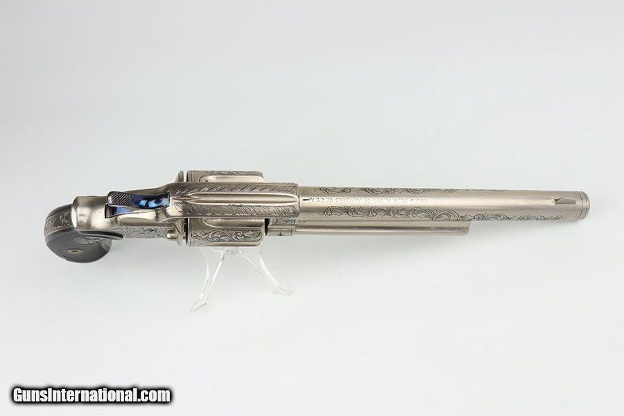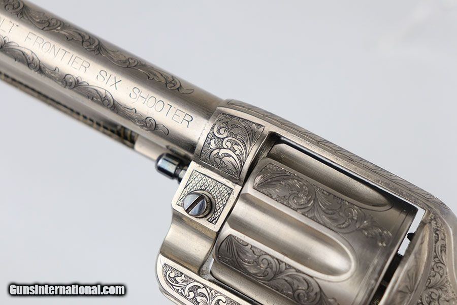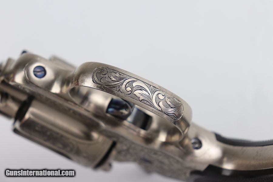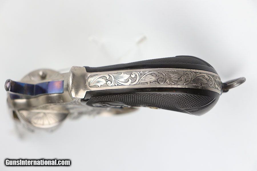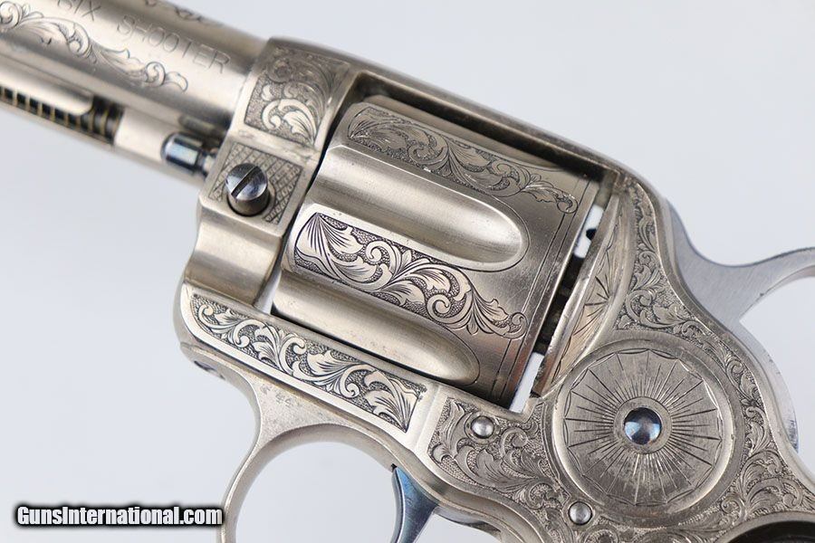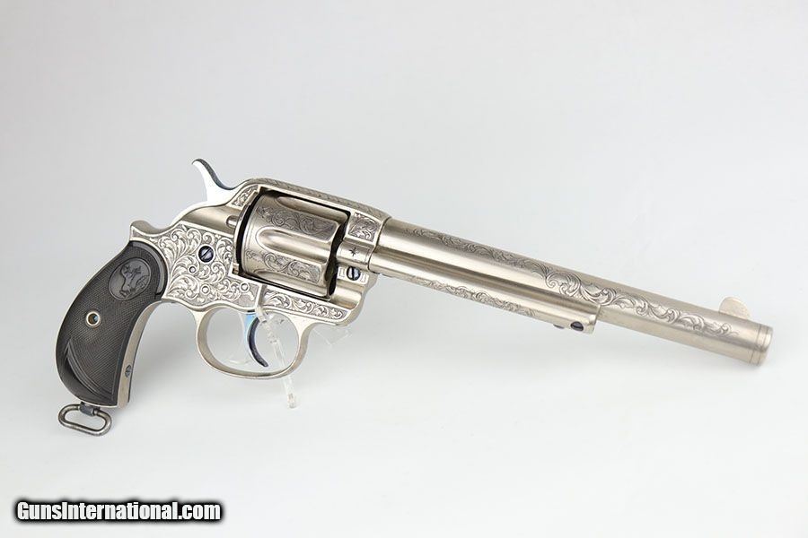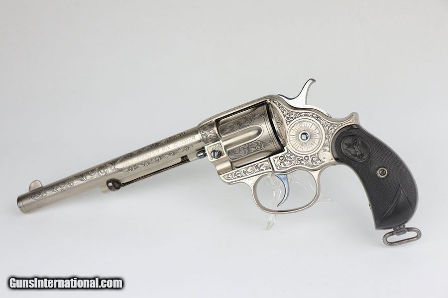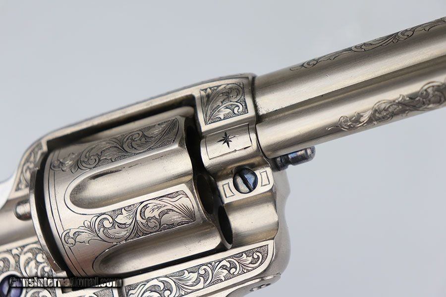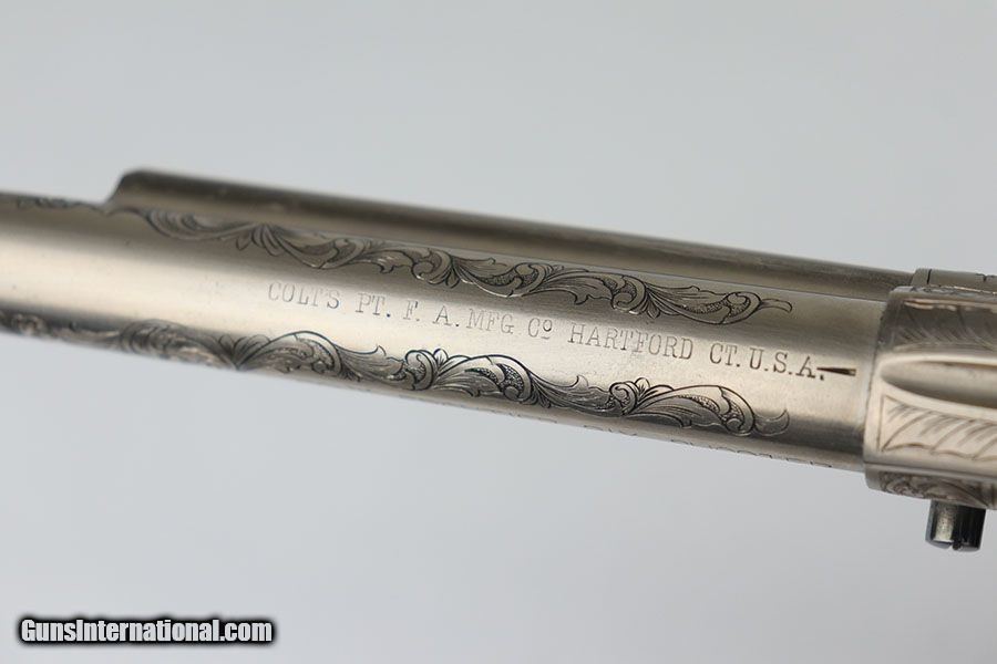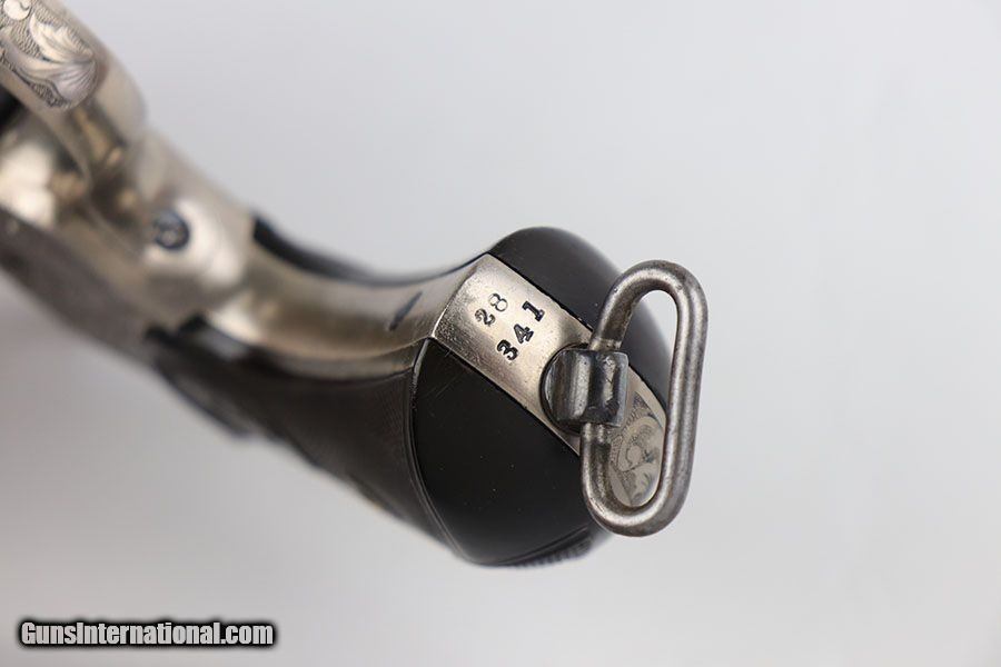 Description: This is a beautifully engraved and hard to find Colt Model 1878 Fronter Six Shooter. The gun was likely custom engraved by a well trained professional based off the quality of the work. A Colt factory letter has been ordered that states it was shipped to Colt's agency in San Francisco in June of 1891, and that it originally had a blued finish. It has a 7.5 in barrel and is chambered for .44 - 40 Colt. Excellent finish with just a bit of freckling on the barrel. Excellent Colt grips made of hard rubber. Bore has strong rifling but pitting in the grooves. The gun is an antique but appears to function correctly. Note the beautiful fire blue pins and hammer. Nickel finish is excellent with no flaking , rust or pitting. Great presentation piece. SOLD Antique: Yes Handgun Caliber: .44-40 Winchester (.44 WCF) Manufacturer: Colt Model: Model 1878 Condition: Excellent Bore Condition: 5/10 Manufacture Date: 1891 |