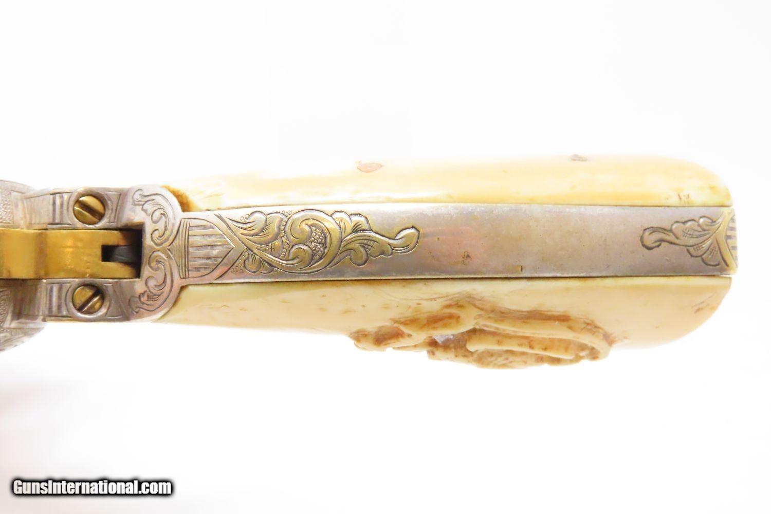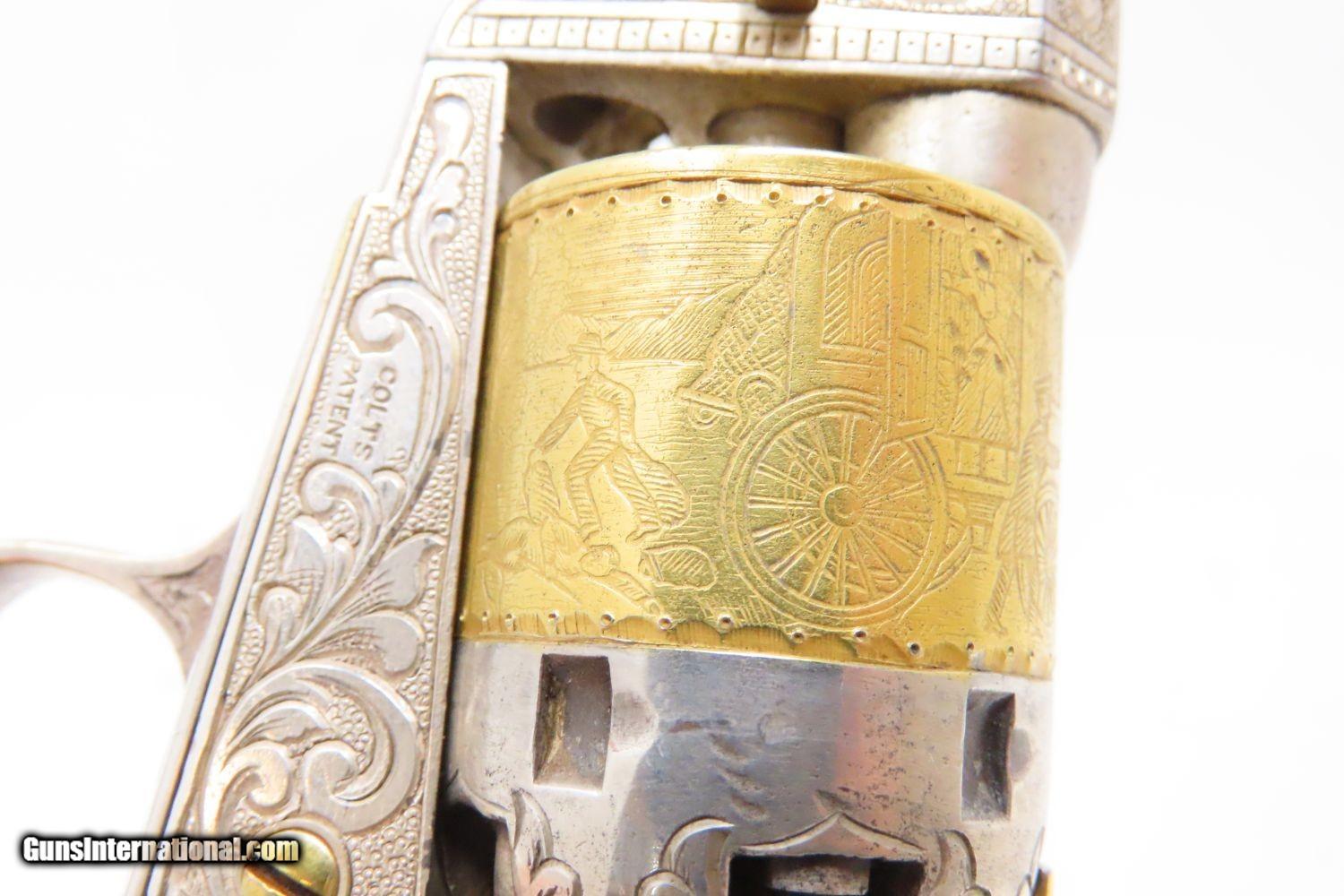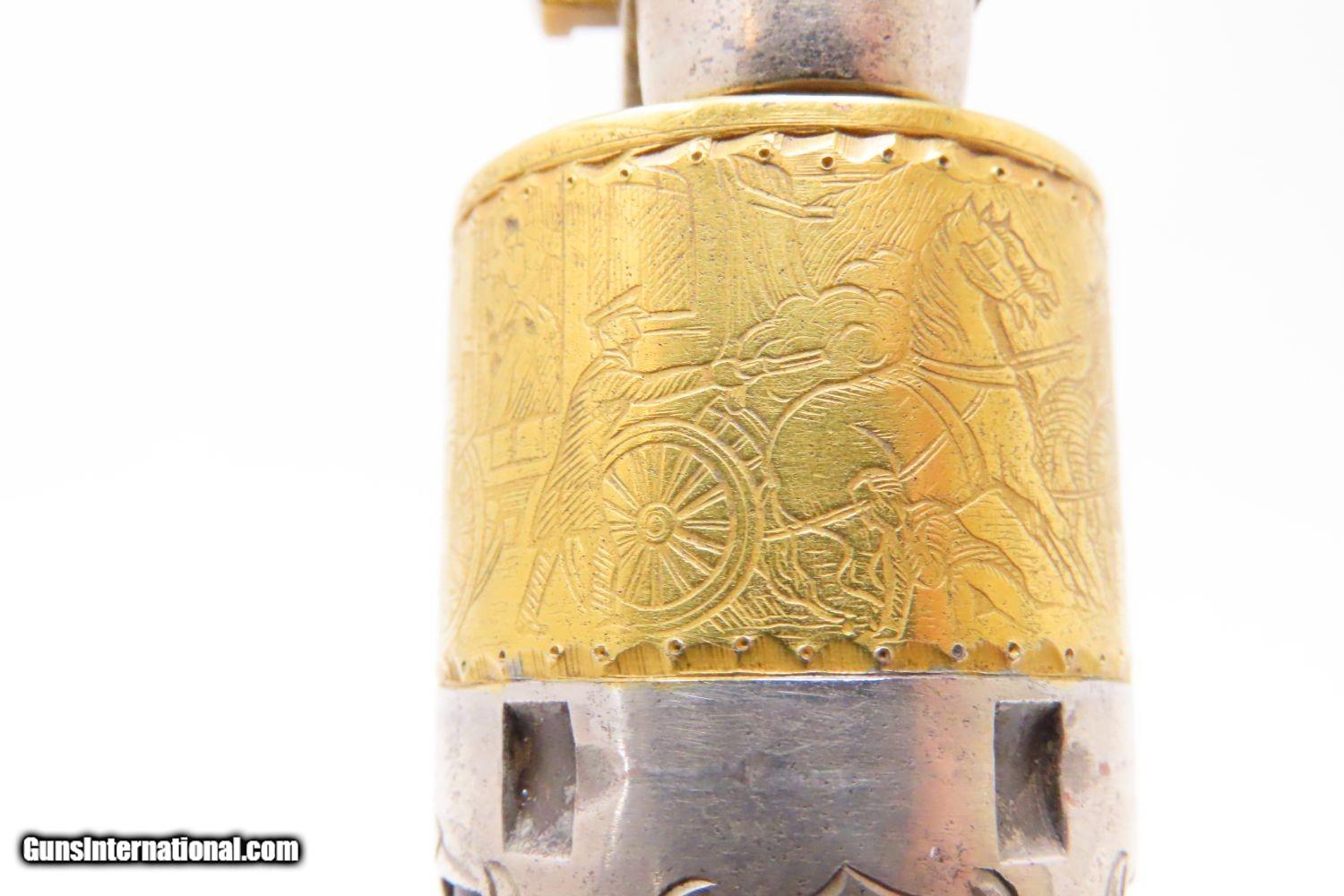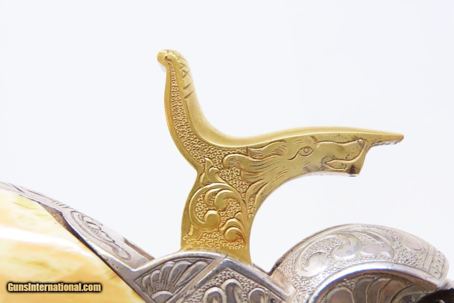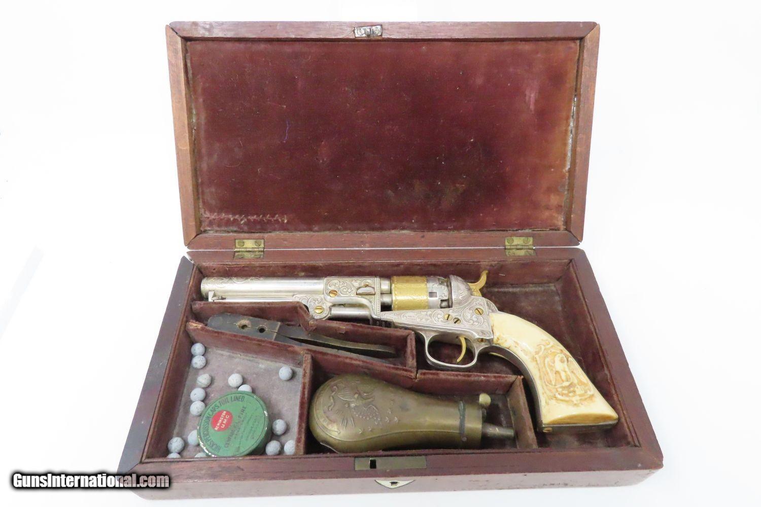 Description: Engraved SILVER/GOLD/NICKEL/IVORY Antique COLT Model 1849 POCKET Revolver Originally Made in 1852; With Carved Eagle/Snake Grip Here we present an antique Colt Model 1849 Pocket Revolver that has been beautifully engraved and stocked with carved ivory at some point. This revolver was originally made in 1852 in Hartford, Connecticut. It features a barrel treatment that makes it resemble the much larger Dragoon, with the multi-faceted breech-end and transition to round. The stagecoach cylinder scene has been engraved. The frame, grip frame, barrel, and hammer have Germanic floral scroll with a punch-dot background. There are linear border transitions around the recoil shield, breech-end of the barrel, and the muzzle. The hammer is engraved with a Gustave Young-inspired wolf’s head. A federal US shield motif was employed at the top of the grip frame. It is stocked with carved ivory grips with the very popular “Mexican” eagle/snake motif. Hammer, trigger, screws, and the scene portion of the cylinder have been gold-plated, the trigger guard and grip frame silver-plated, and the rest nickel-plated. There is a possible clue as to the engraver of this piece just ahead of the barrel address, which looks like a set of initials or signature mark. The overall condition is very fine. Old but virtually complete silver (grip frame & trigger guard), gold, and nickel re-finish. Excellent action. Nice bore with good rifling. The entire piece is almost covered in clear floral scroll engravings. Numbers match. Solid ivory grips in fine condition. The case and the accoutrements are in good condition. The case has some separation at the top left corner and the latch on the lid is slightly off from the latch on the bottom. A visually stunning firearm. Own the original! This is a legitimate antique and not a reproduction. Barrel is 5 inches. Caliber: .31 Percussion Overall condition as seen in photos. Very Fast. Very Safe. FREE SHIPPING WORLDWIDE. Delivered directly to your door by express mail! Guaranteed AUTHENTIC & Includes CERTIFICATE OF AUTHENTICITY. ancestryguns $11,250 #215047 SOLD Antique: Yes |