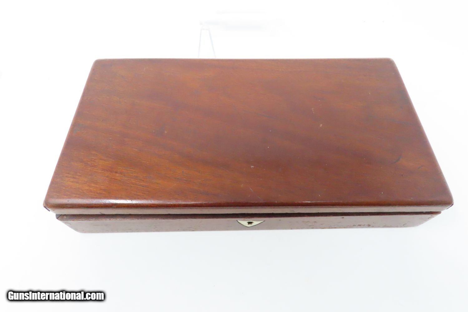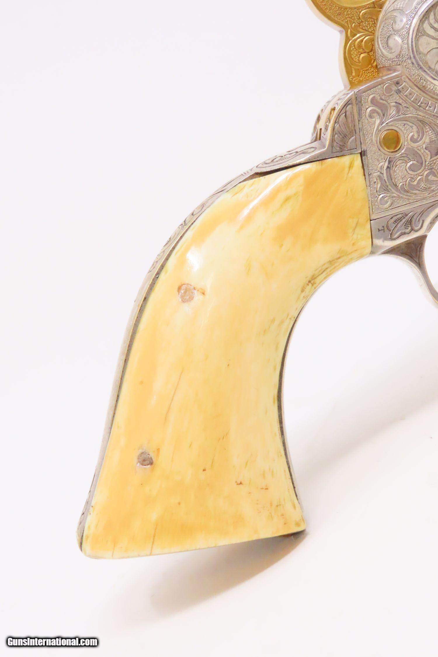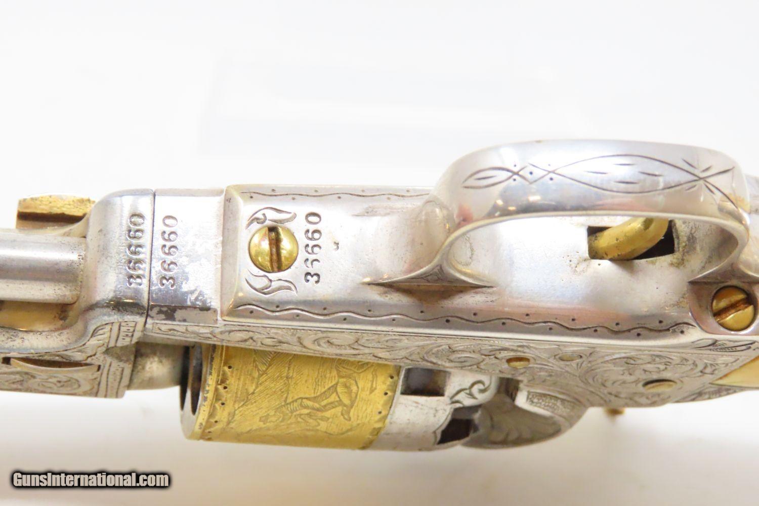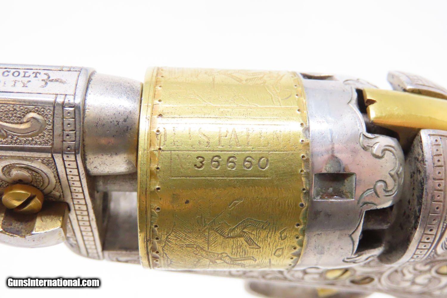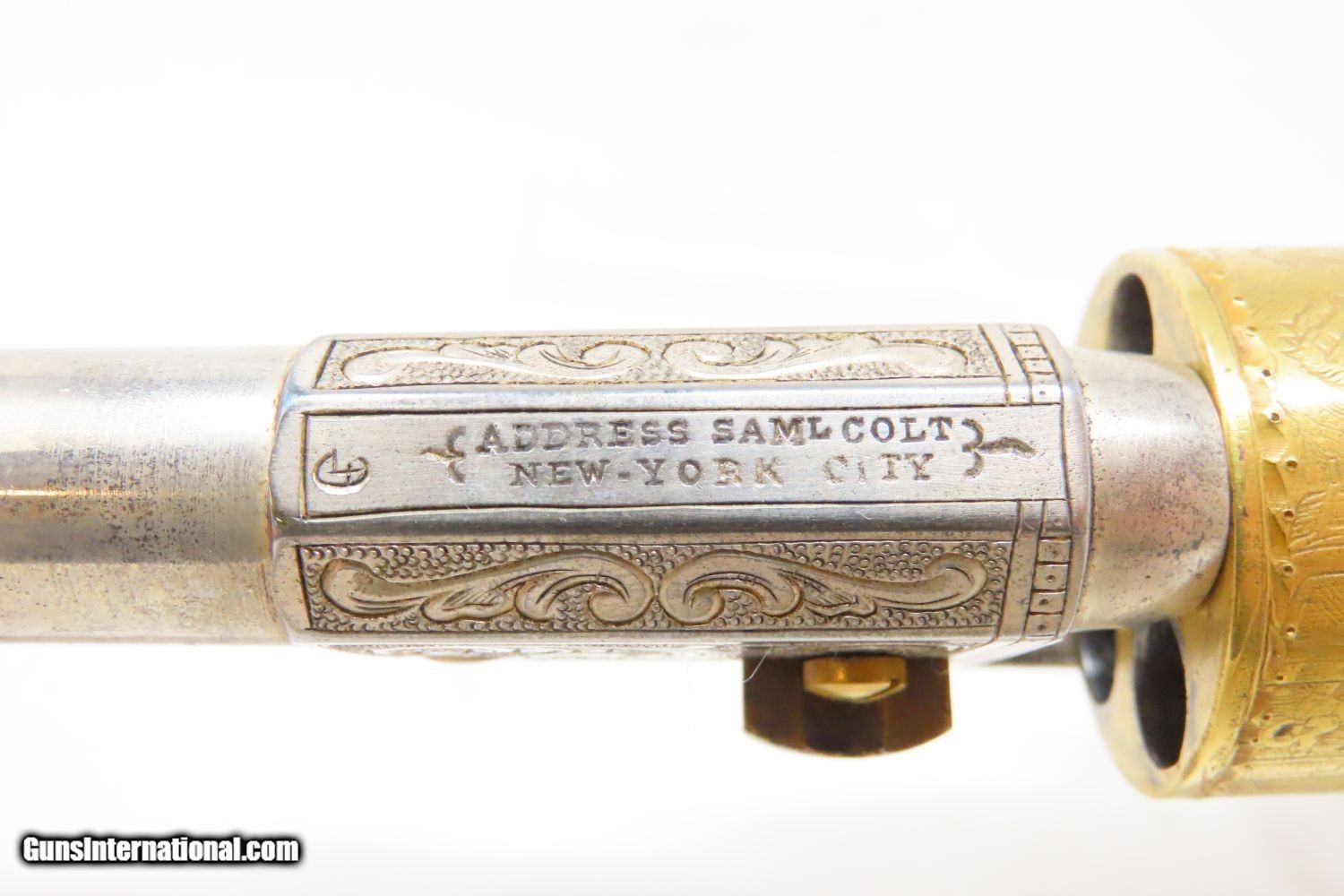Description: Engraved SILVER/GOLD/NICKEL/IVORY Antique COLT Model 1849 POCKET Revolver Originally Made in 1852; With Carved Eagle/Snake Grip Here we present an antique Colt Model 1849 Pocket Revolver that has been beautifully engraved and stocked with carved ivory at some point. This revolver was originally made in 1852 in Hartford, Connecticut. It features a barrel treatment that makes it resemble the much larger Dragoon, with the multi-faceted breech-end and transition to round. The stagecoach cylinder scene has been engraved. The frame, grip frame, barrel, and hammer have Germanic floral scroll with a punch-dot background. There are linear border transitions around the recoil shield, breech-end of the barrel, and the muzzle. The hammer is engraved with a Gustave Young-inspired wolf’s head. A federal US shield motif was employed at the top of the grip frame. It is stocked with carved ivory grips with the very popular “Mexican” eagle/snake motif. Hammer, trigger, screws, and the scene portion of the cylinder have been gold-plated, the trigger guard and grip frame silver-plated, and the rest nickel-plated. There is a possible clue as to the engraver of this piece just ahead of the barrel address, which looks like a set of initials or signature mark. The overall condition is very fine. Old but virtually complete silver (grip frame & trigger guard), gold, and nickel re-finish. Excellent action. Nice bore with good rifling. The entire piece is almost covered in clear floral scroll engravings. Numbers match. Solid ivory grips in fine condition. The case and the accoutrements are in good condition. The case has some separation at the top left corner and the latch on the lid is slightly off from the latch on the bottom. A visually stunning firearm. Own the original! This is a legitimate antique and not a reproduction. Barrel is 5 inches. Caliber: .31 Percussion Overall condition as seen in photos. Very Fast. Very Safe. FREE SHIPPING WORLDWIDE. Delivered directly to your door by express mail! Guaranteed AUTHENTIC & Includes CERTIFICATE OF AUTHENTICITY. ancestryguns $11,250 #215047 SOLD Antique: Yes |
