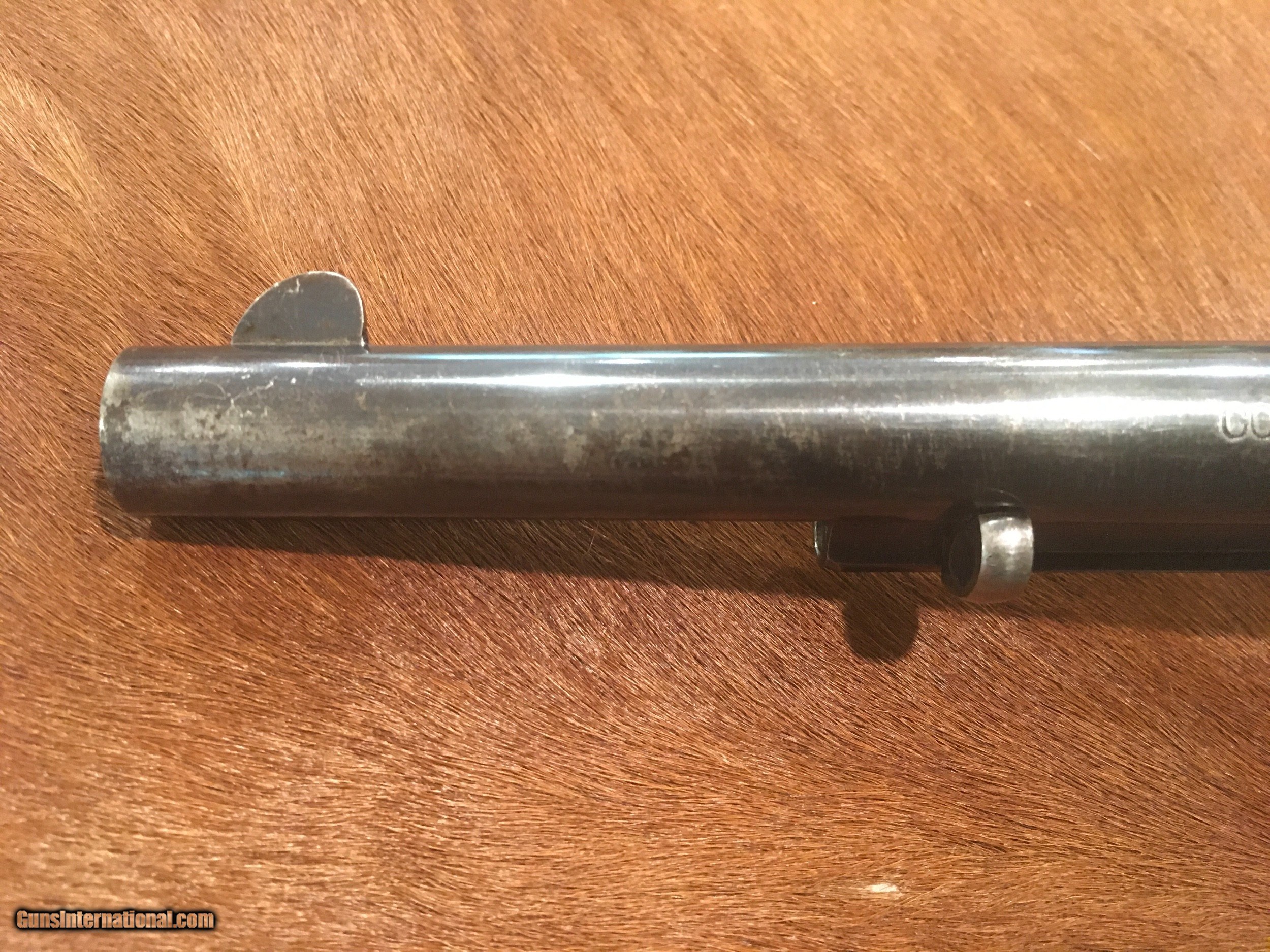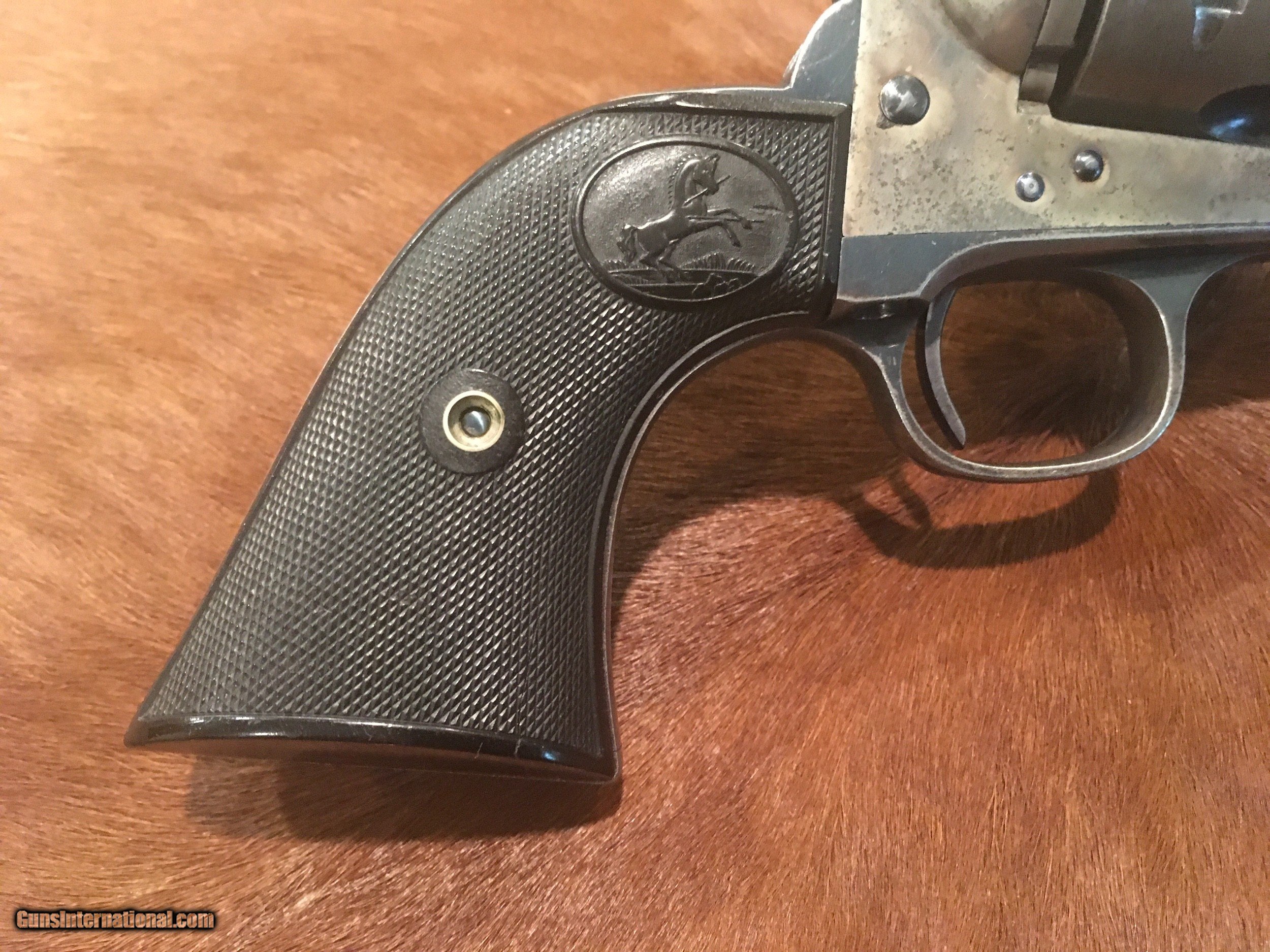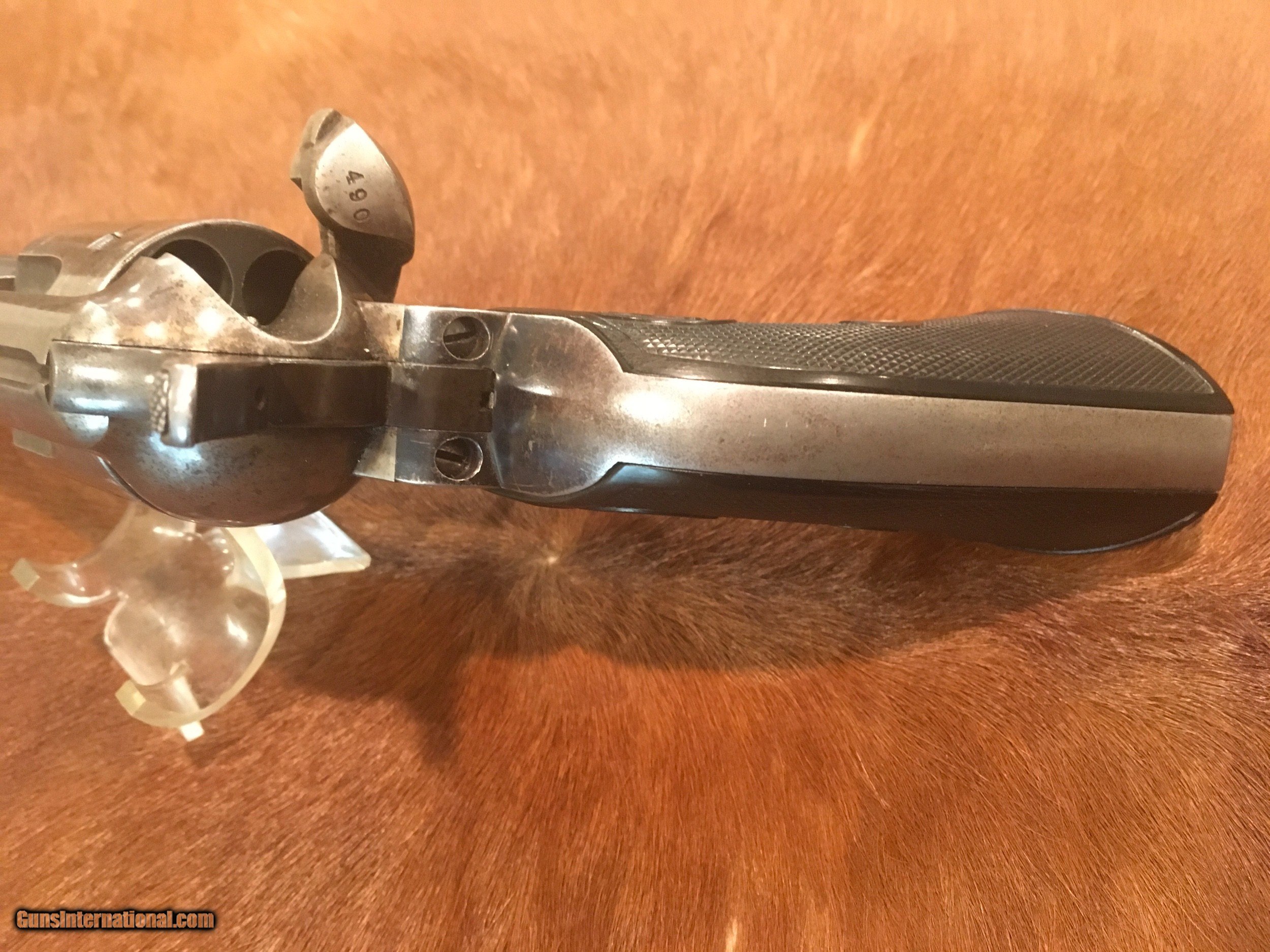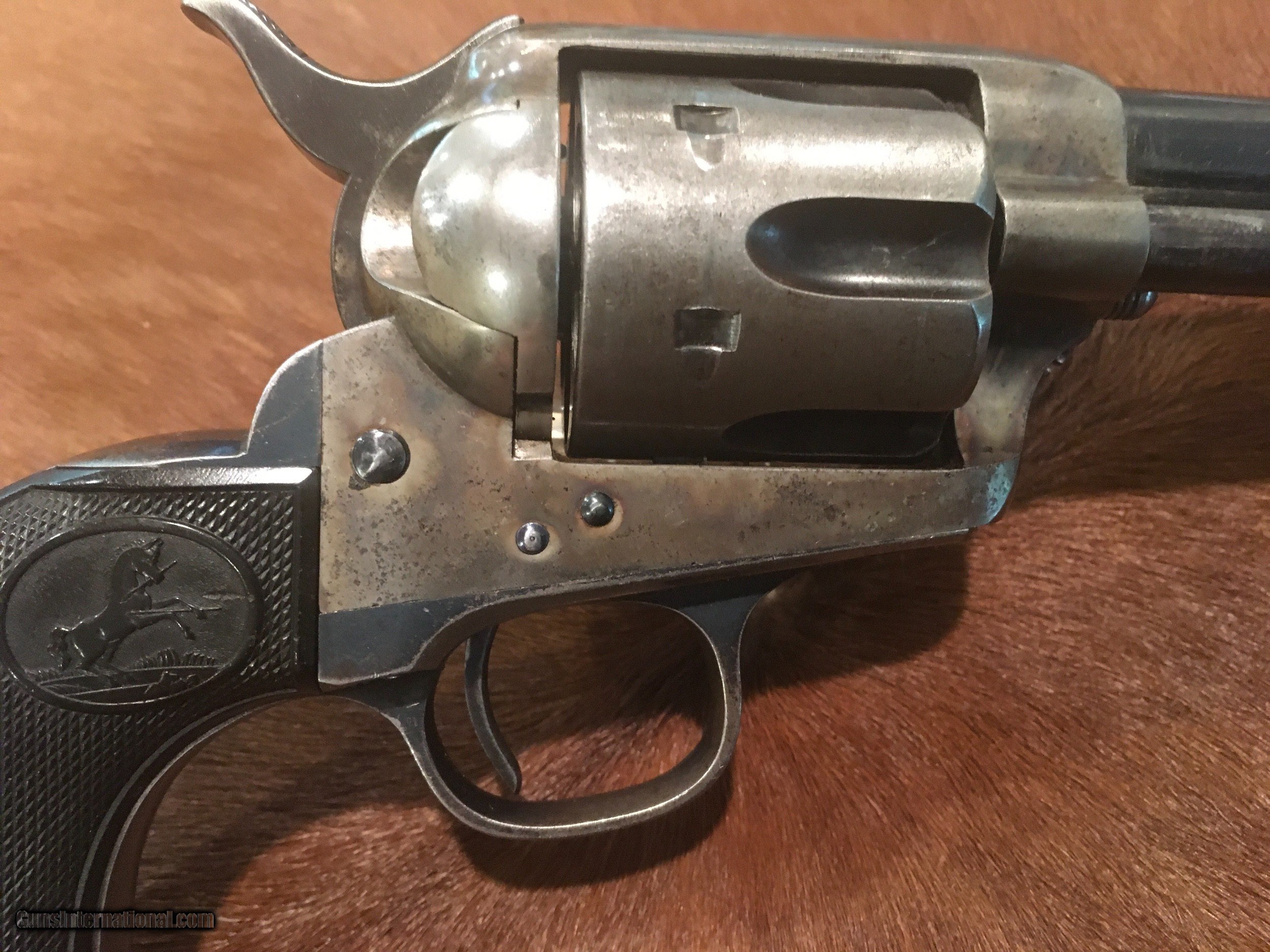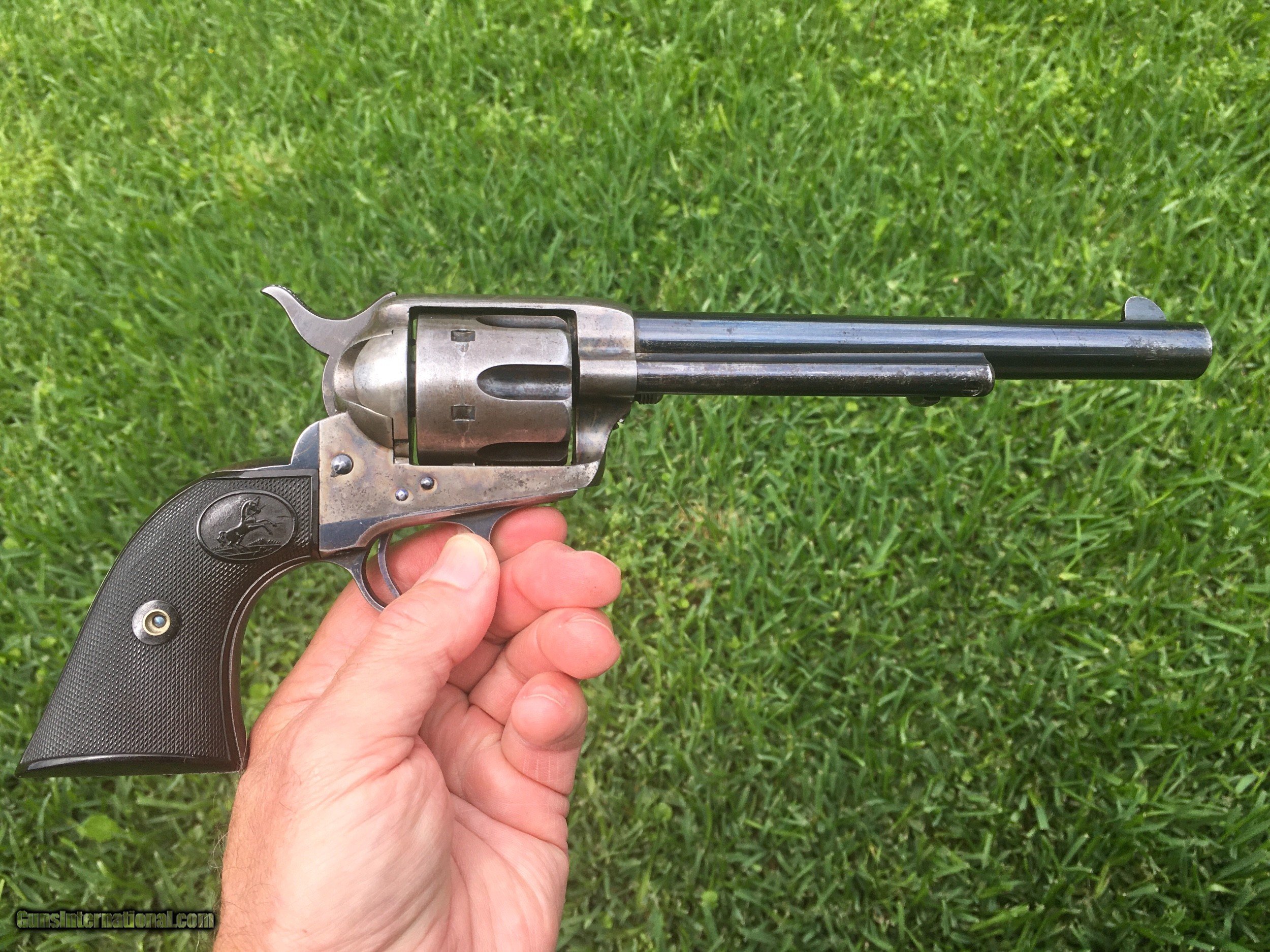 Description: Beautiful Colt Single Action Army revolver made in 1895. The serial number 160610 matches on the frame, triggerguard and backstrap. The accompanying Colt Archive letter confirms it as a .44/40 with a 7 1/2" barrel, blue finish and rubber stocks shipped to Colt's San Francisco Agency on May 15, 1895 in a 10 gun shipment. All of the factory applied markings are clear and crisp. The action functions perfectly and the bore is excellent. The rubber grips fit well and are correct to the period, replacement grips that are slightly undersized. There is a very high percentage of original blue finish remaining on the barrel and ejector housing with generous amounts remaining on the trigger guard, back strap and cylinder flutes. There are bright, vivid case colors showing on both sides of the frame. The screws are very good with most of the factory fire blue and the front sight is full. Price includes insurance and shipping direct to the buyer in the continental United States where legal. A three day inspection is offered with full refund if returned unfired in the same condition. Buyer to pay return shipping. Please let me know if you have any questions or need additional photos. SOLD Antique: Yes |